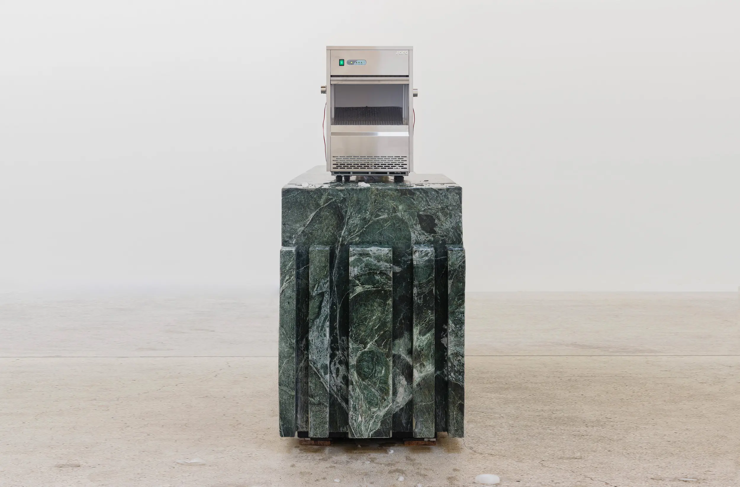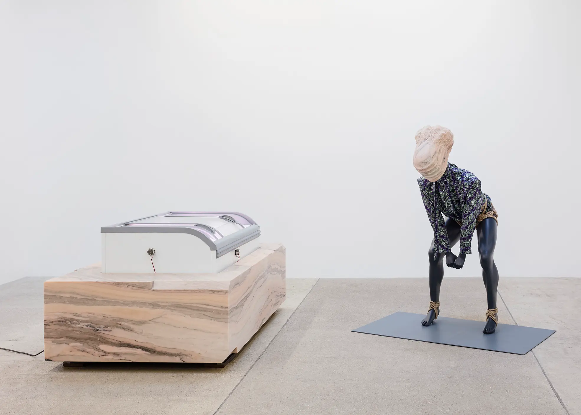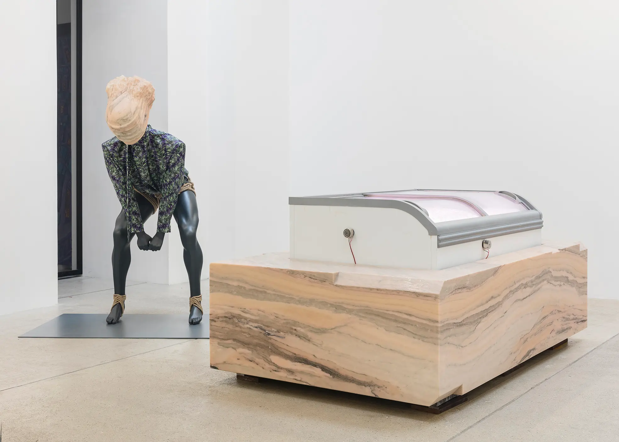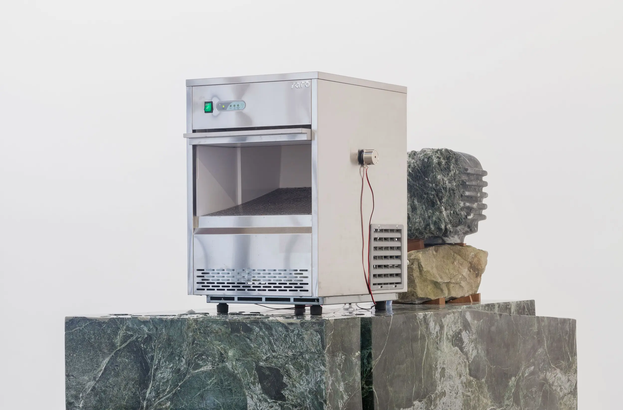 Bojan Šarčević works in sculpture and film, with materials mined for their specificities: wax, onyx, human hair, raw meat and hollowed watermelons are just several examples of his chosen constituents. His works involve sculptural interventions into the gallery space in order to recreate fragmented and abstracted experiences of bodily encounters that are at once familiar and uncanny: such moments might include browsing a lyrical supermarket aisle; snagging on a tree branch, or edging around a seemingly discarded plastic bag containing jerky. Though they may hint at broader movements and historical events, including Modernism, Constructivism, Retrofuturism, and thesocialist states transtion to capitalism and its consequences, the precise meanings of Šarčević’s works are left indeterminate. His installations arise from a research-based practice rooted in philosophical and scientific inquiry and permeated with ideas of aspiration and nostalgia. For his 2018 exhibition at Modern Art, Sentimentality is the Core, he installed a series of commercial freezers containing transducer speakers, which transmitted fragmented 1980s pop songs by George Michael and Sade through the farmed ice crystals that lined their interiors. This work, like almost all Šarčević’s works, traces its beginnings back through specific histories and narratives – in this case the political legacies of the 1980s both in the Soviet Union and in the USA and UK – while connecting personal sentiment with collective experience.