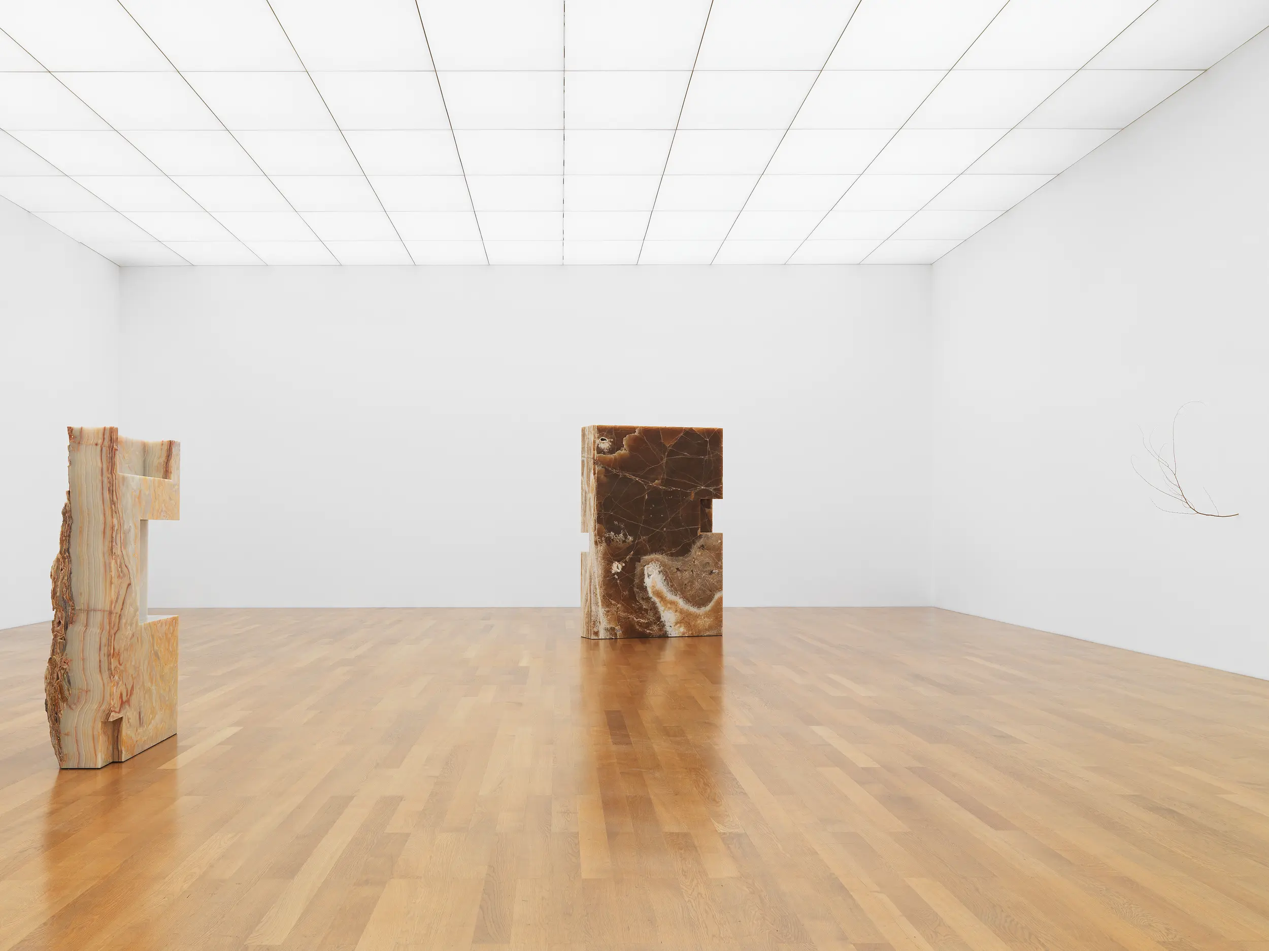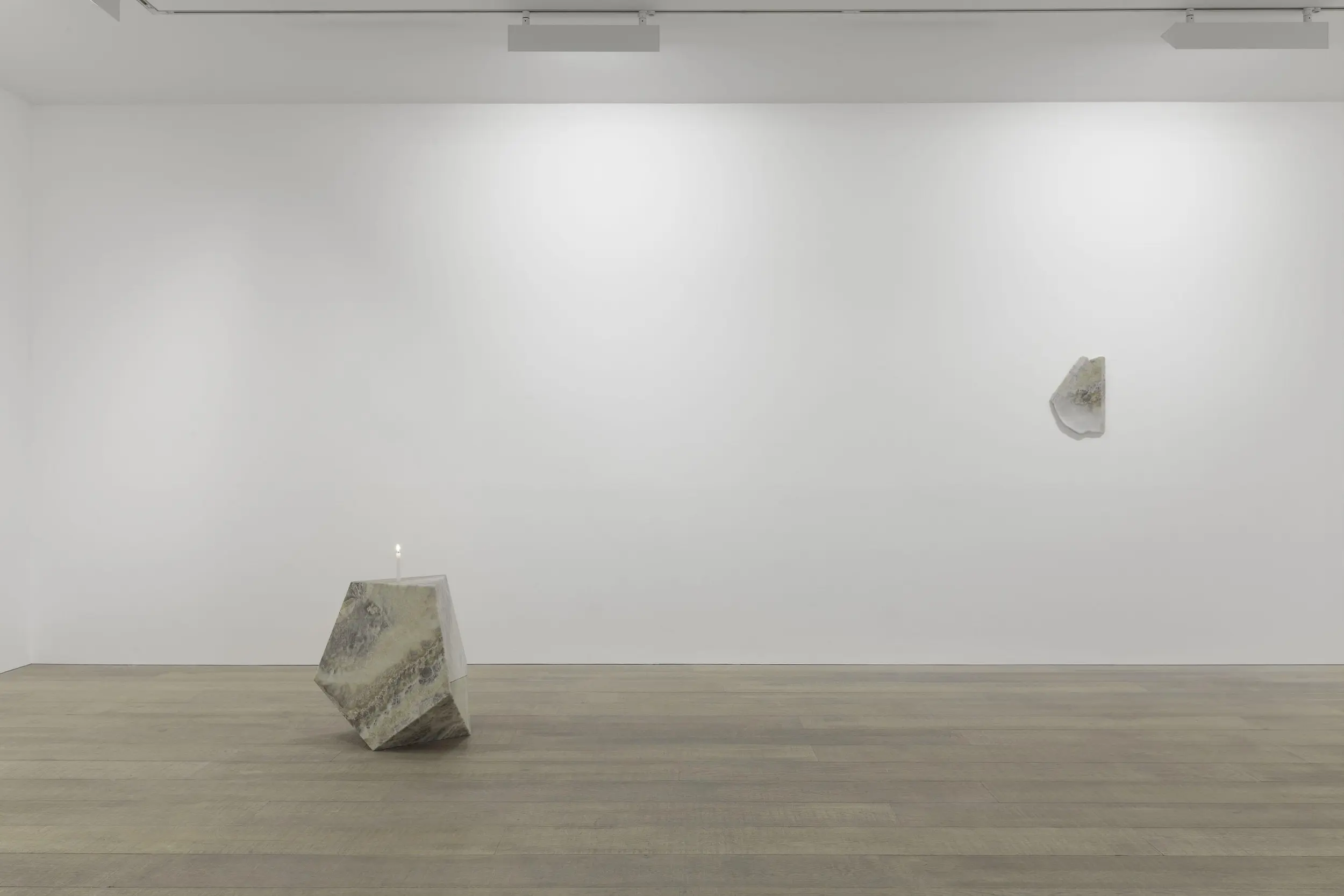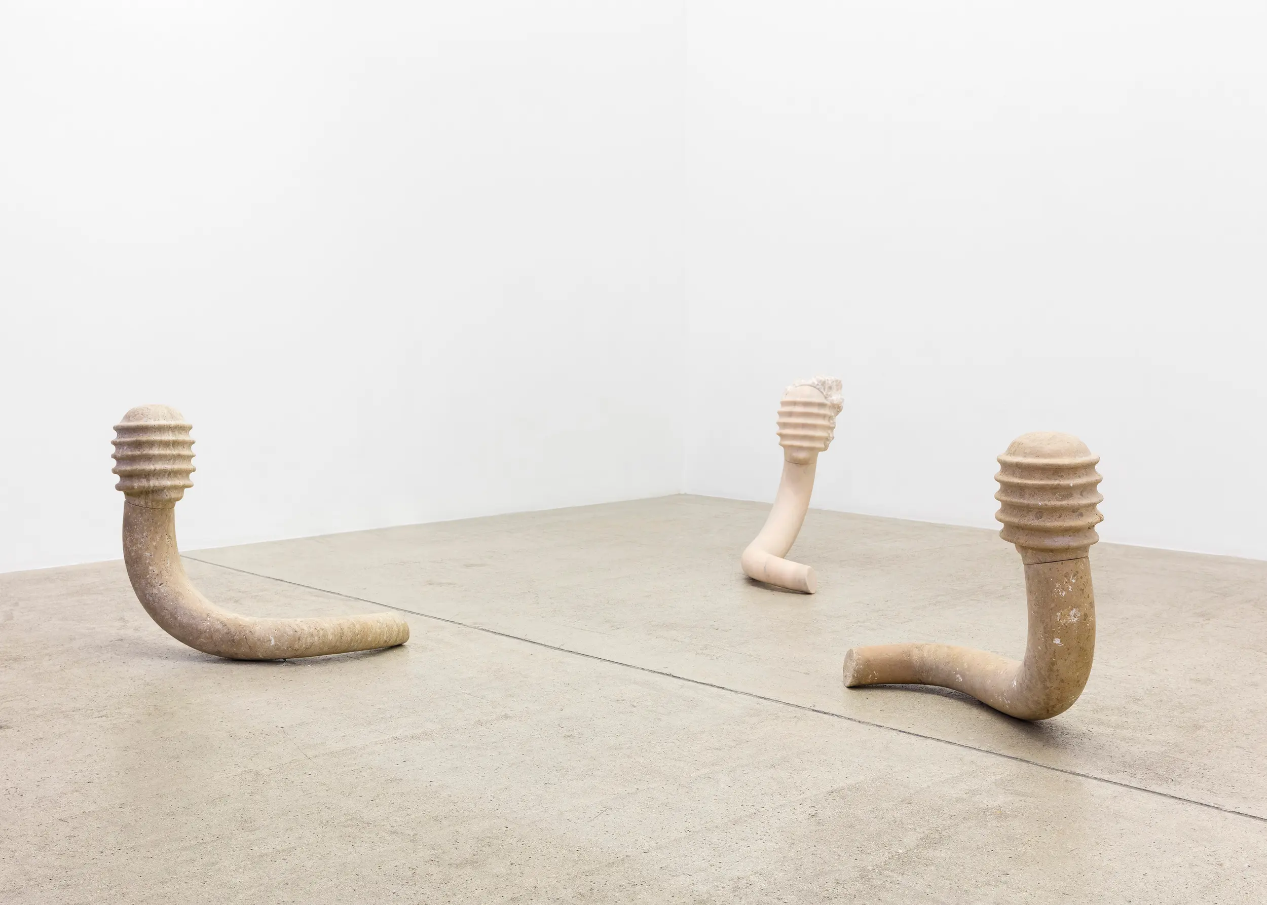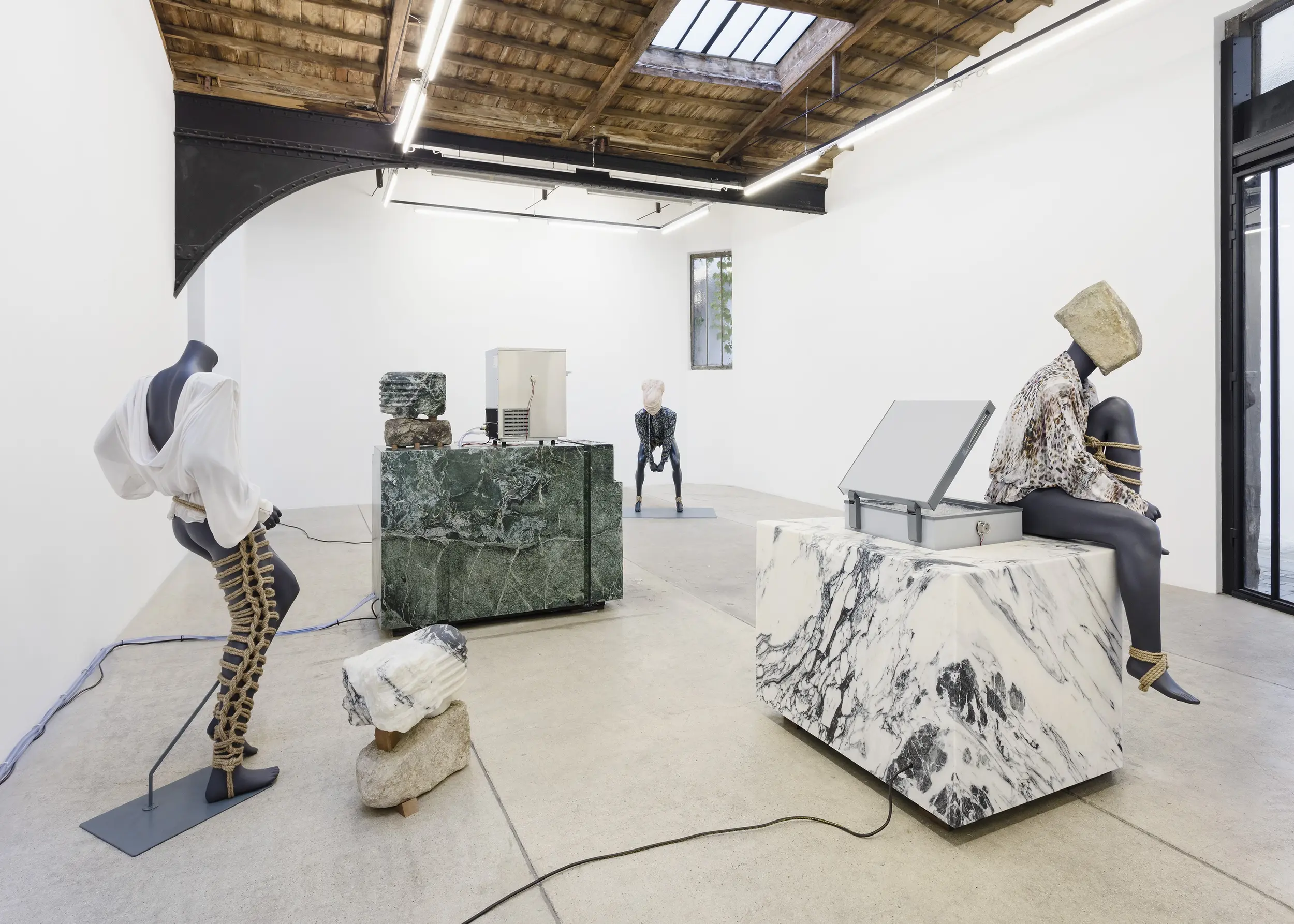 Bojan Šarčević works in sculpture and film, with materials mined for their specificities: wax, onyx, human hair, raw meat and hollowed watermelons are just several examples of his chosen constituents. His works involve sculptural interventions into the gallery space in order to recreate fragmented and abstracted experiences of bodily encounters that are at once familiar and uncanny: such moments might include browsing a lyrical supermarket aisle; snagging on a tree branch, or edging around a seemingly discarded plastic bag containing jerky. Though they may hint at broader movements and historical events, including Modernism, Constructivism, Retrofuturism, and thesocialist states transtion to capitalism and its consequences, the precise meanings of Šarčević’s works are left indeterminate. His installations arise from a research-based practice rooted in philosophical and scientific inquiry and permeated with ideas of aspiration and nostalgia. For his 2018 exhibition at Modern Art, Sentimentality is the Core, he installed a series of commercial freezers containing transducer speakers, which transmitted fragmented 1980s pop songs by George Michael and Sade through the farmed ice crystals that lined their interiors. This work, like almost all Šarčević’s works, traces its beginnings back through specific histories and narratives – in this case the political legacies of the 1980s both in the Soviet Union and in the USA and UK – while connecting personal sentiment with collective experience.