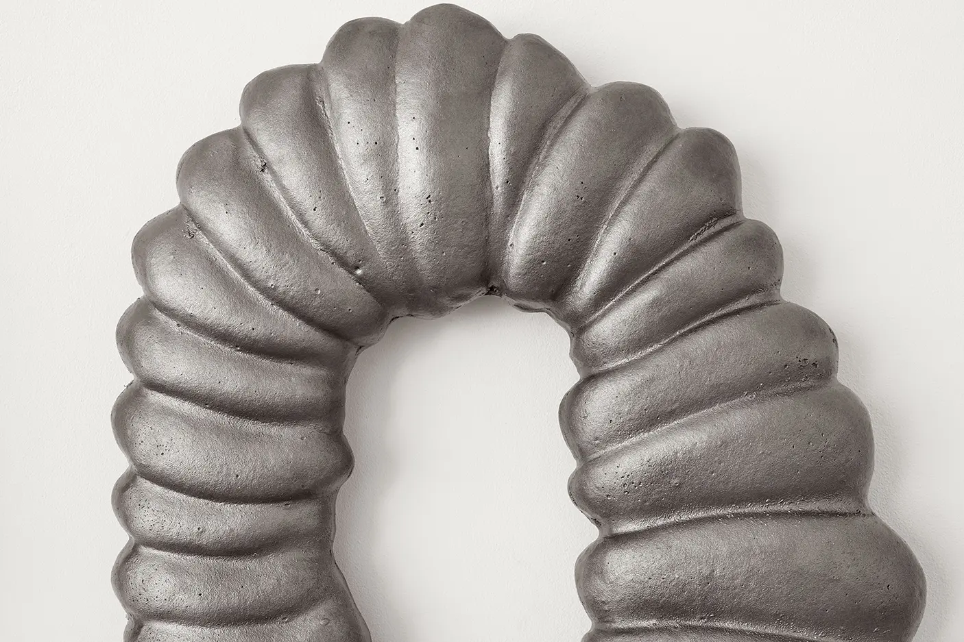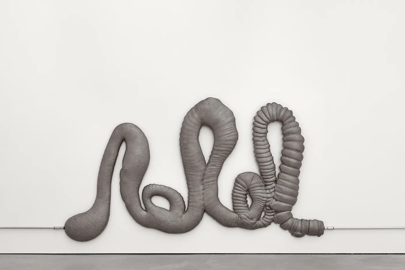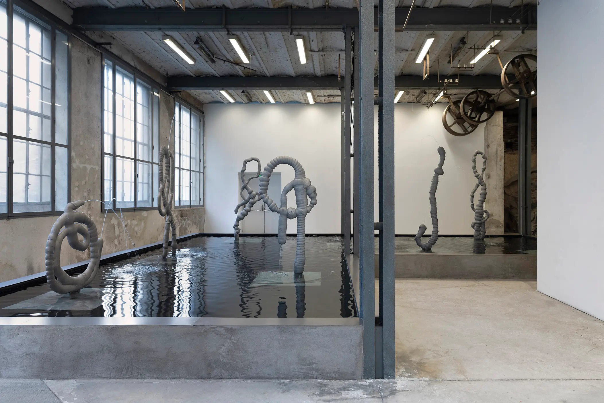Nicolas Deshayes works in sculpture to explore the form and materiality of bodies and what happens below their surfaces. Process, or processing, is the impetus for Deshayes’ sculptures, which manage to convey states of liquid, hardness, hot, cold, and mechanically produced objects and systems. Vital processes of ingestion, and circulation, are evoked by elegantly utilitarian forms. Deshayes’ surfaces are consistently impermeable – recalling the architecture of public amenities. Using predominantly casting methods with bronze, iron, or earthenware, Deshayes tends to seek out artisans and factories who specialise in techniques of production; their historical lineages and geographical particularities converging within his conceptualisation of the work as it develops. Extreme heat is used in these casting processes commonly and the materials rely on changes in temperature in order to come alive. But molten metal rapidly hardens into a solid form, its movement as if suspended in time. Deshayes has recently rendered some of these sculptures functional again, plumbing hot water around a room, or pumping water into public ponds. In his 2016 installation Thames Water, he recast the gallery as an organism by installing a series of interconnected radiators, in doing so concretising an analogy of the body and its systems to the plumbed and networked city. It is in these works that we are reminded of how their organic forms are not only reminiscent of the bodies of humans, but also of domestic, civic and biological circulatory systems.