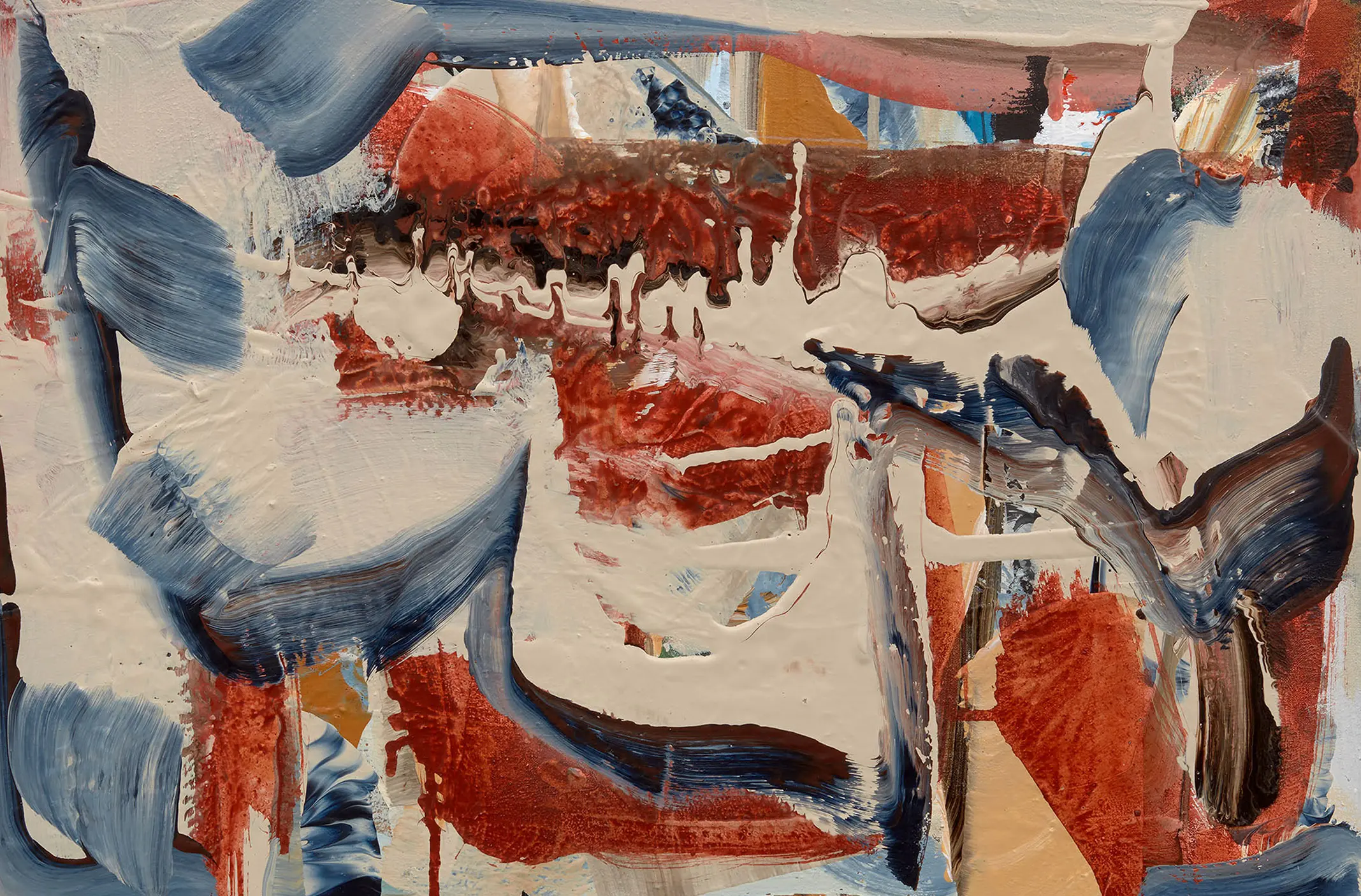 Her distinctive palette of understated tones is present in several works, while their neighbours radiate with fierce oranges and reds. Paint builds up into rough, gritty sections, or slides smoothly across a plane; sometimes both actions being present in a single work. In others still, pictorial surfaces are delineated to suggest perspectival space, paint is applied in ways that evoke photographic images, and colours come together to conjure bodies of water and landscapes.