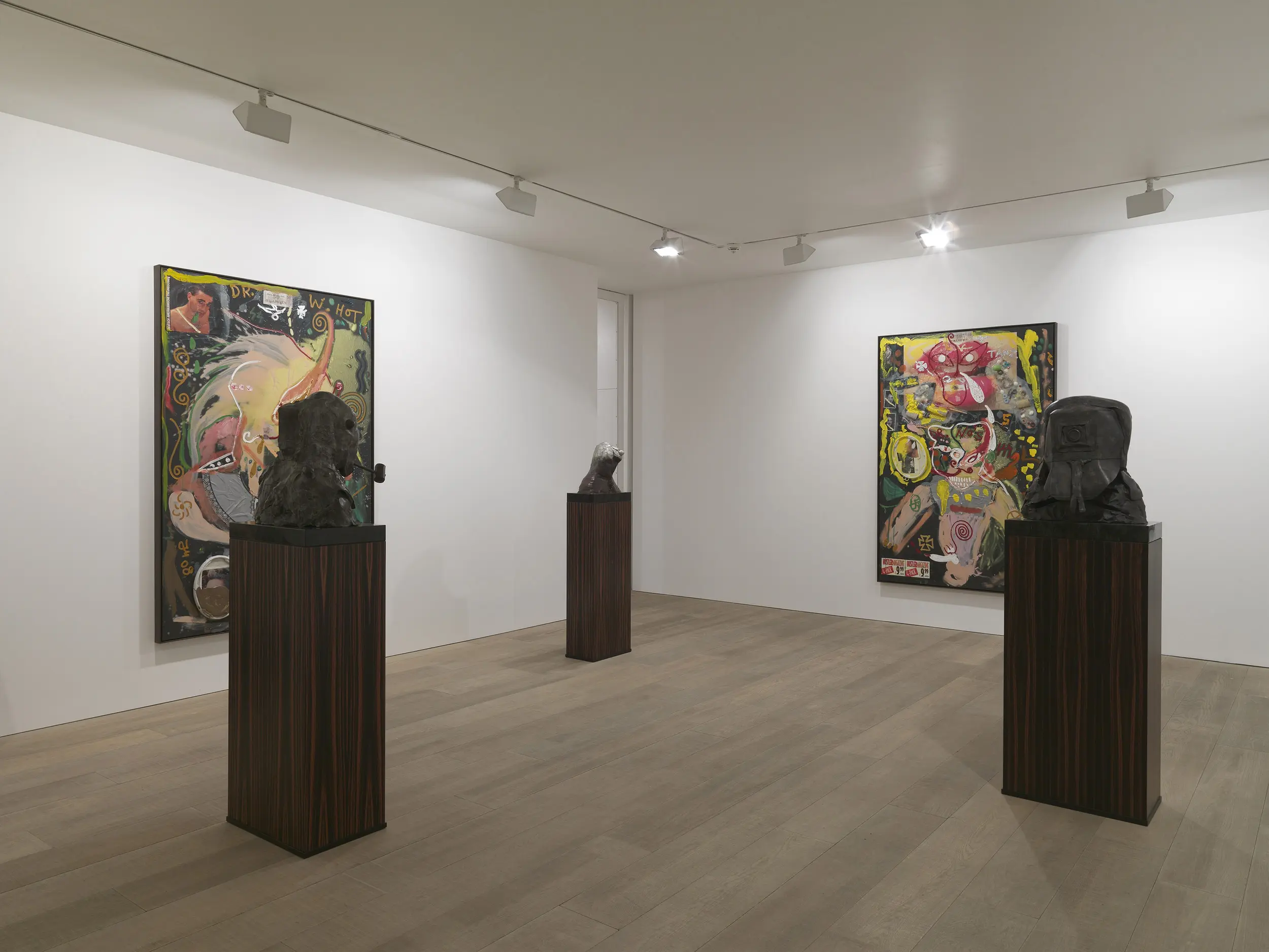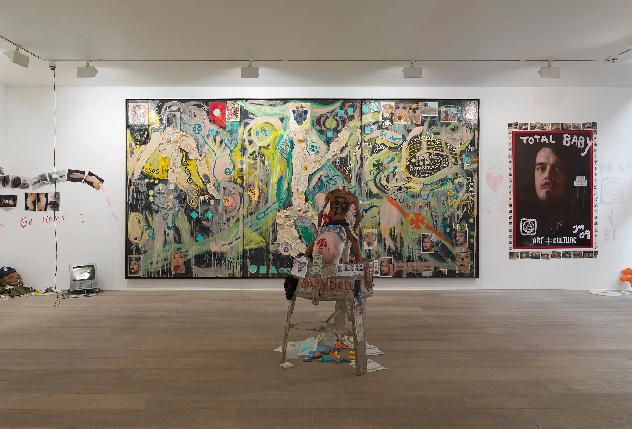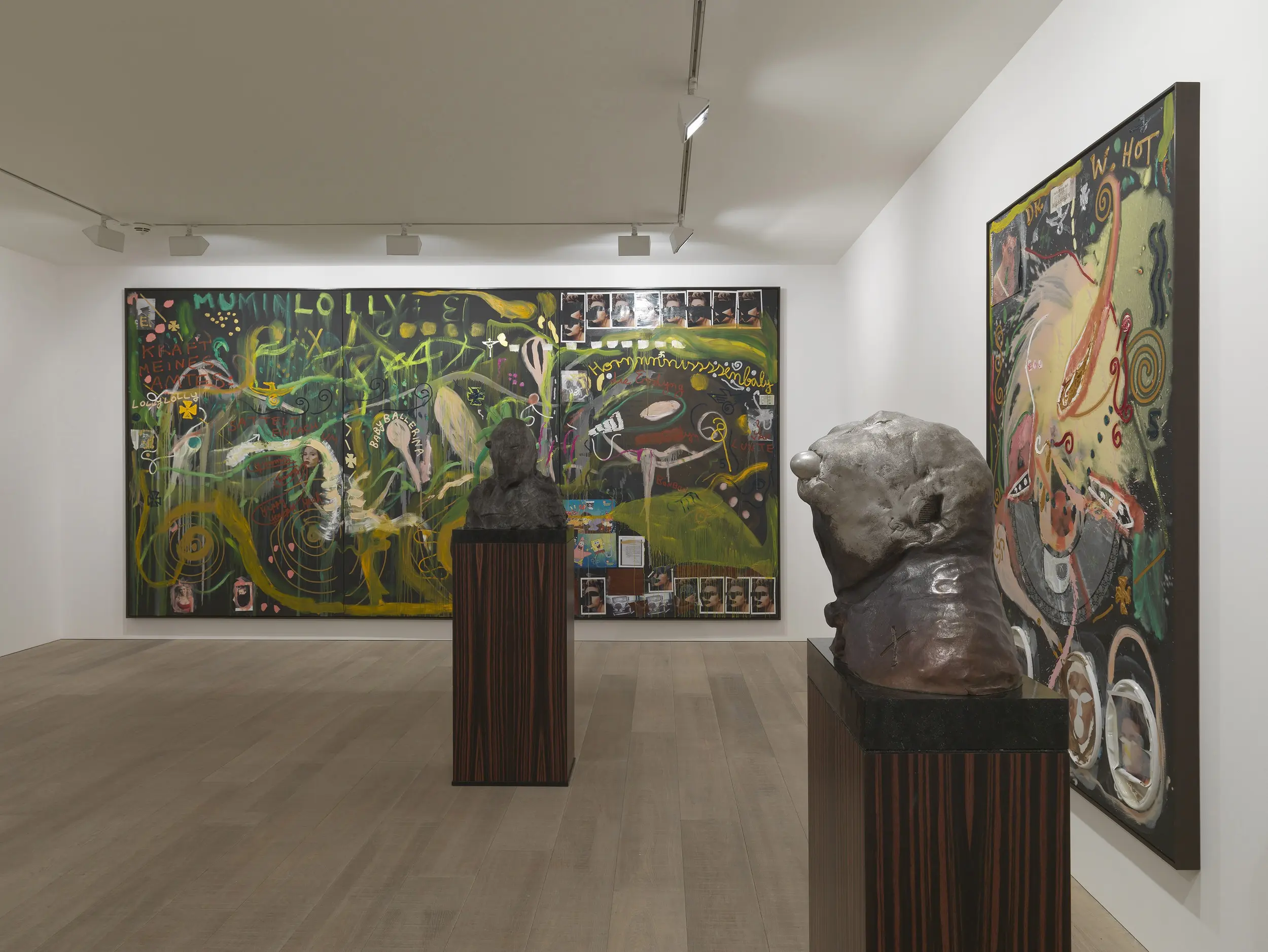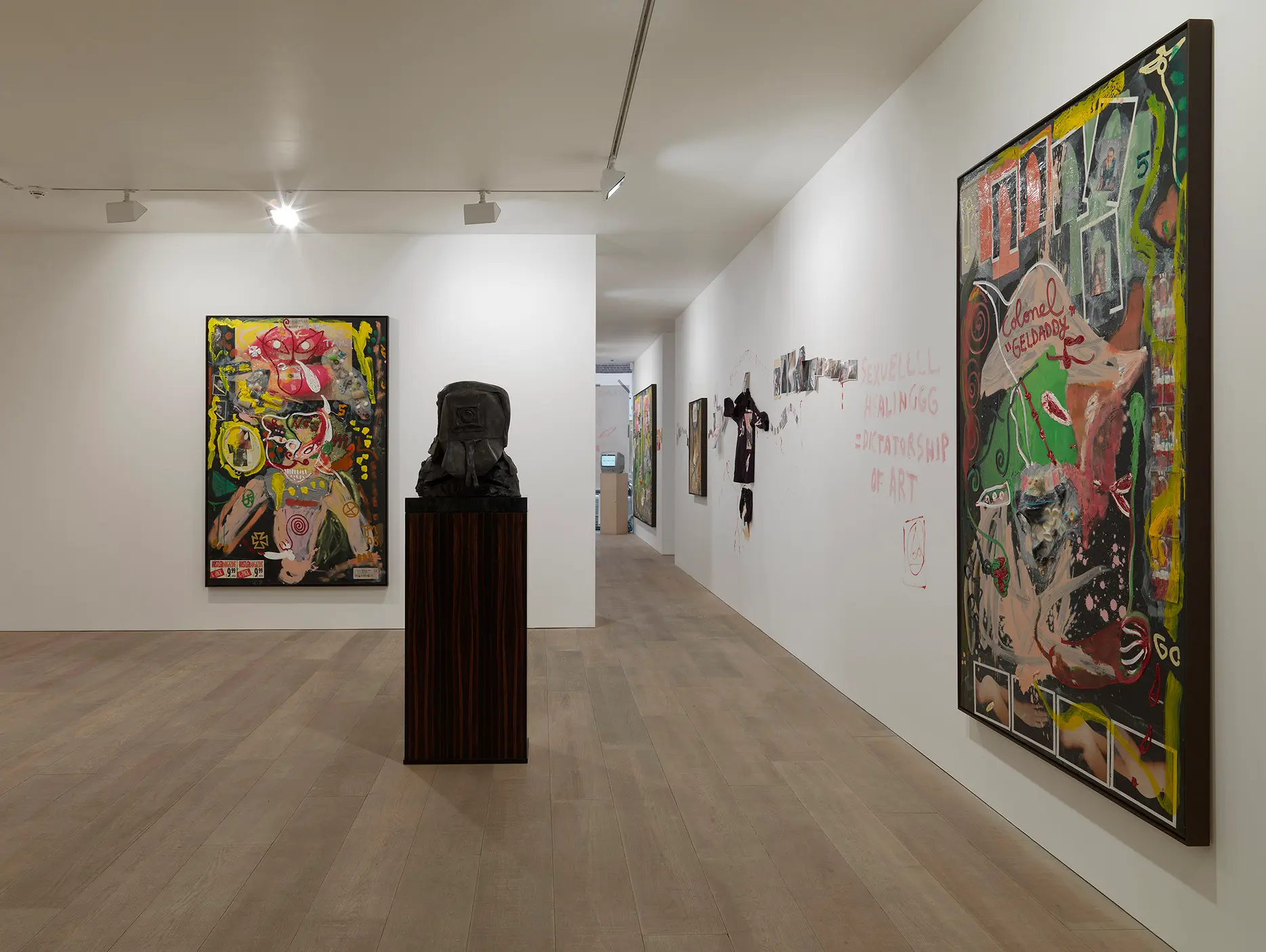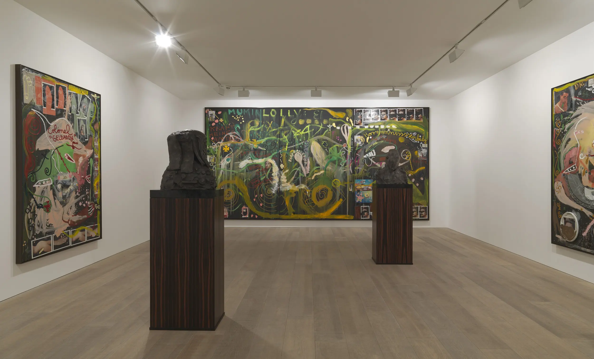 The show features a unique new body of work, including large-scale paintings on black canvas and a series of bronze sculpture. Giant triptychs represent Meese’s current fascinations: ripped up sex dolls, original German banknotes from the recession of the 1930’s, magazine images of Johansson, motifs of the Iron Cross, soft toys and underwear. These are held down by swathes of transparent acrylic that give the work a moving, fluid notion.