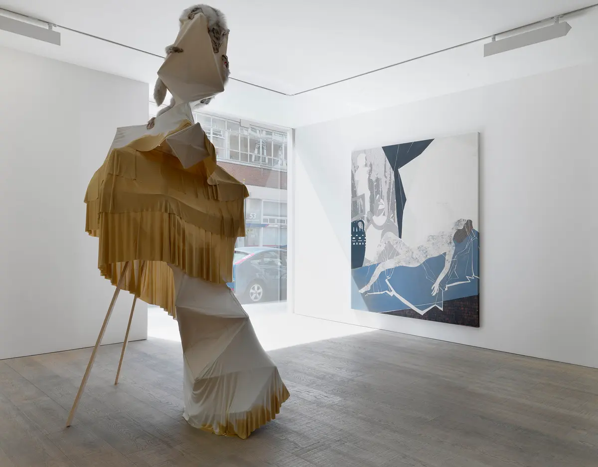 Schnitger’s pictorial sensibility is sexually charged, yet underpinned by a feminist perspective that intuitively embraces the visual symbolism of seduction and themes of desire, while voicing an ambivalent position on the manner and root of that representation. Each painting composes a planar theatrical scene animated by the artist’s romantic excitement about storytelling and ornament. The patterns of her chosen fabrics nod to a style, era or mood – their formal repetitive structure counterpoised with bleach, lace patterns, and dramatic shifts in texture. The sculptures inhabiting the gallery space are no less present, their figuration stripped back to an almost playful take on the functional structure of furniture. The sculptures’ disquieting presence differently effects the sensation of character and display of material property, bringing the physicality of Schnitger’s making to the fore. Schnitger’s paintings and sculptures are populated by a patchwork of ideas, materials and shapes that bring to life a collection of mostly female and sometimes ambiguously gendered characters – human, animal, and suggested states of metamorphosis between the two. In this new body of work her characters take on increasingly leading roles, and come together in the expression of a thematic narrative.
