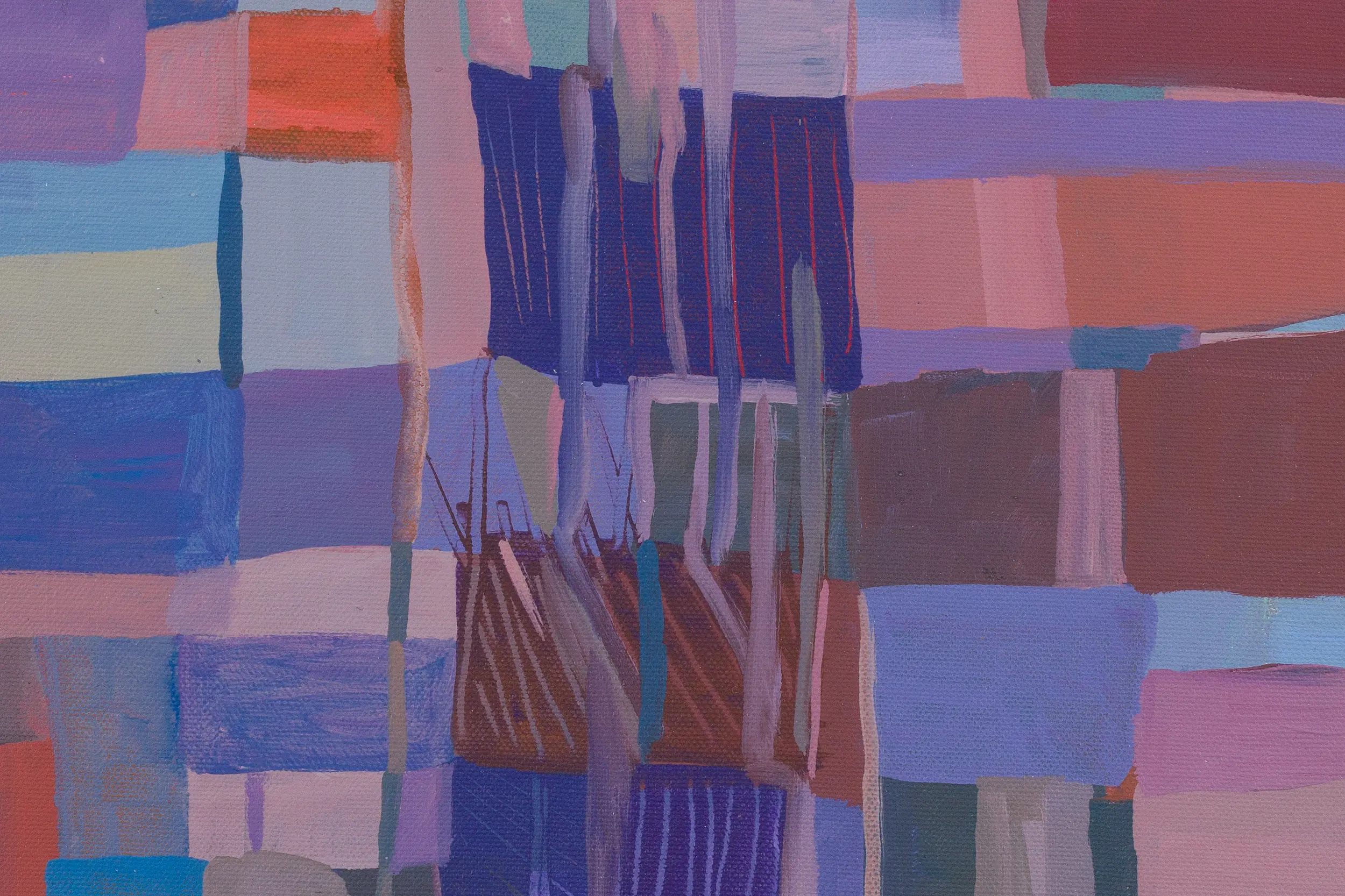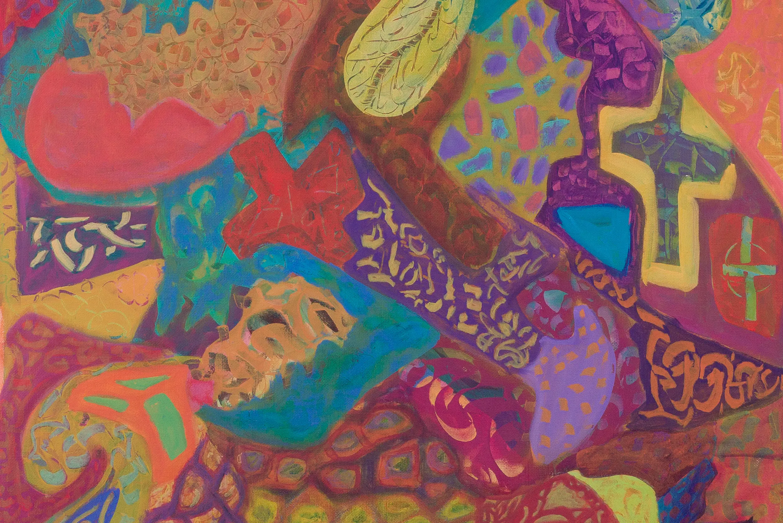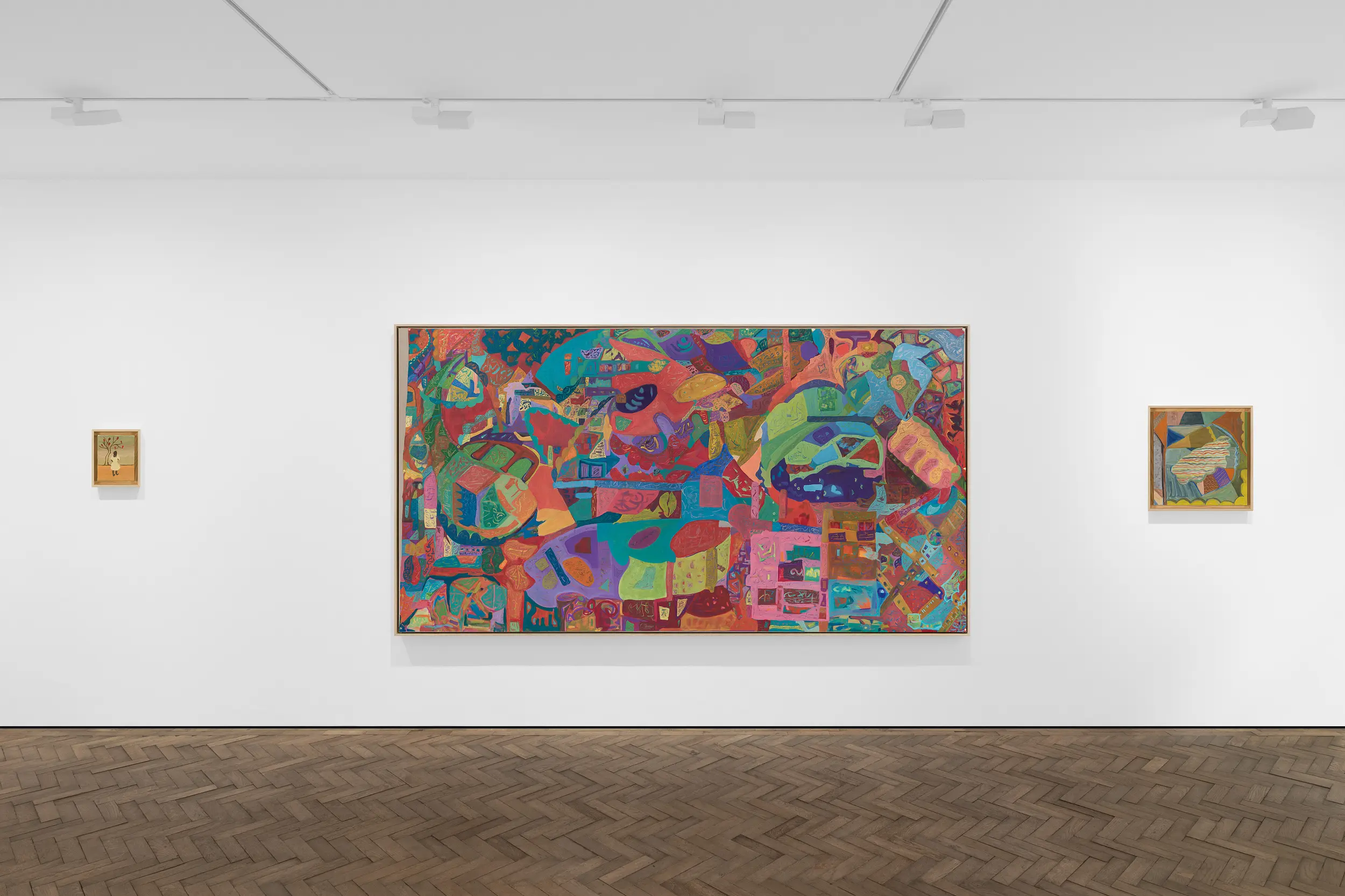 Like a reoccurring dream that sears the mind of its dreamer, motifs and compositions are repeated throughout Ghebreyesus’s painting oeuvre. Often, bright landscapes or seascapes emerge from an otherwise abstract set of forms on the canvas. On occasion we encounter views of travellers confronting the natural world. In one work, a little girl walks towards a brightly coloured apple tree in an otherwise abstracted landscape. In another, a mountain range dimly lit by moonlight looms above what is perhaps an ethereal couple taking rest for the night. Abstraction prevails in other paintings that are similar in theme, and the greens, browns and blues of the oceans and deserts summoned by the mind are stacked impenetrably like sheets or panels. A different reoccurring motif is that of a musician playing a string instrument, sitting, full of energy and vitality, housed in a warm interior; a loving portrayal of the feeling of home, or perhaps a yearning for one. In the largest painting, ‘Map/Quilt’ from 1999, what could be a kaleidoscopic topography simultaneously evokes the patterns and colours of Eritrean textiles. Indeed many of Ghebreyesus’s paintings are deeply multifarious and unruly. Often in these works, fragments of figures – human and nonhuman – crowd and jostle around the canvas, as though flashes of memories of people, creatures, textures, sounds and smells. These paintings are crammed with life. And while Ghebreyesus’s paintings depict an array of feeling - from longing and yearning, to dynamism, spirituality, connection and very frequently, joy - they are never simply representational. His curiosity about process, his experimentation with colour, and his unique formal vocabulary convey the depth of his investment in his medium and in the historical tensions between abstraction and representation as they have evolved over the 20th century.