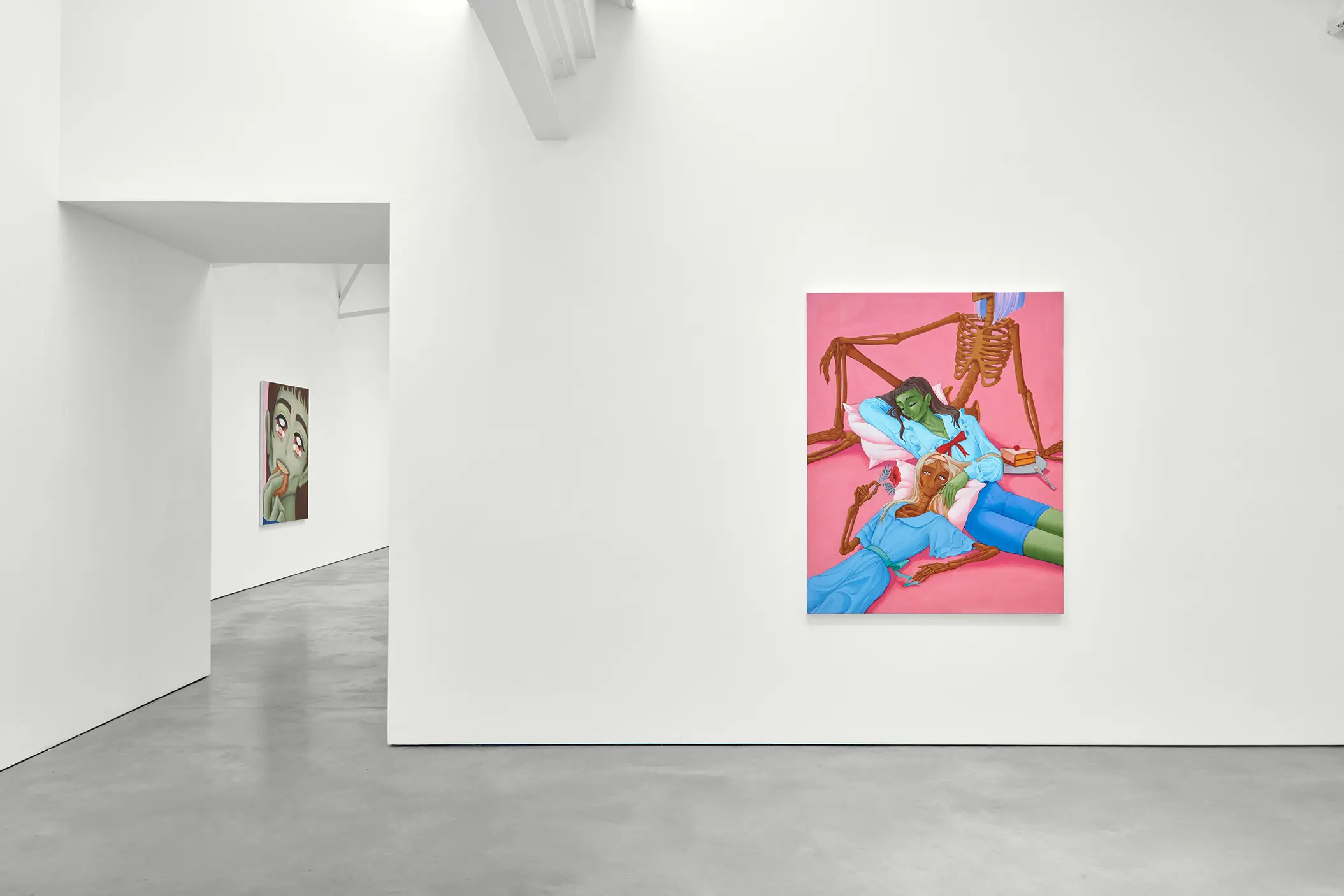 Working in painting, sculpture, and comic books, Julien Ceccaldi explores a set of archetypal characters that morph and develop in different iterations of themselves. Influenced by the Shōjo manga genre - which focuses on romantic relationships and heightened emotions, Ceccaldi portrays characters as yearning or aspiring in some form or another: for love, sex or success. Attention or affirmation is sought through different means, and Ceccaldi’s world tends to be split into two polarised types of being: hulking, muscular, glowing bodies – aloof targets of sexual and romantic desire – and the unnoticed, exhausted other in this unrequited dyad. Through compositions framing the gaunt, almost repulsive, figure as a lead protagonist, the artist hints at the grace and nobility lying underneath their off-putting traits.
