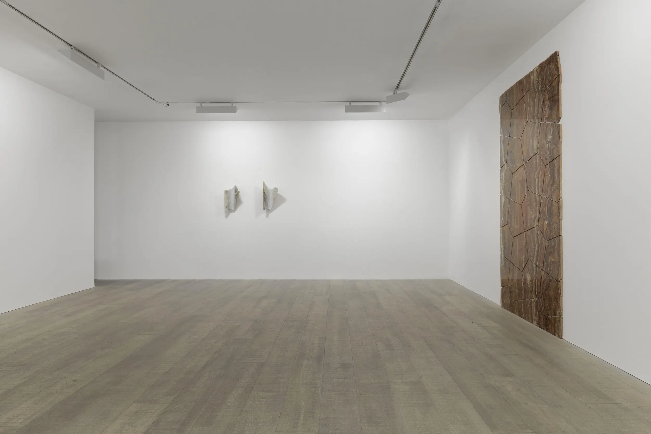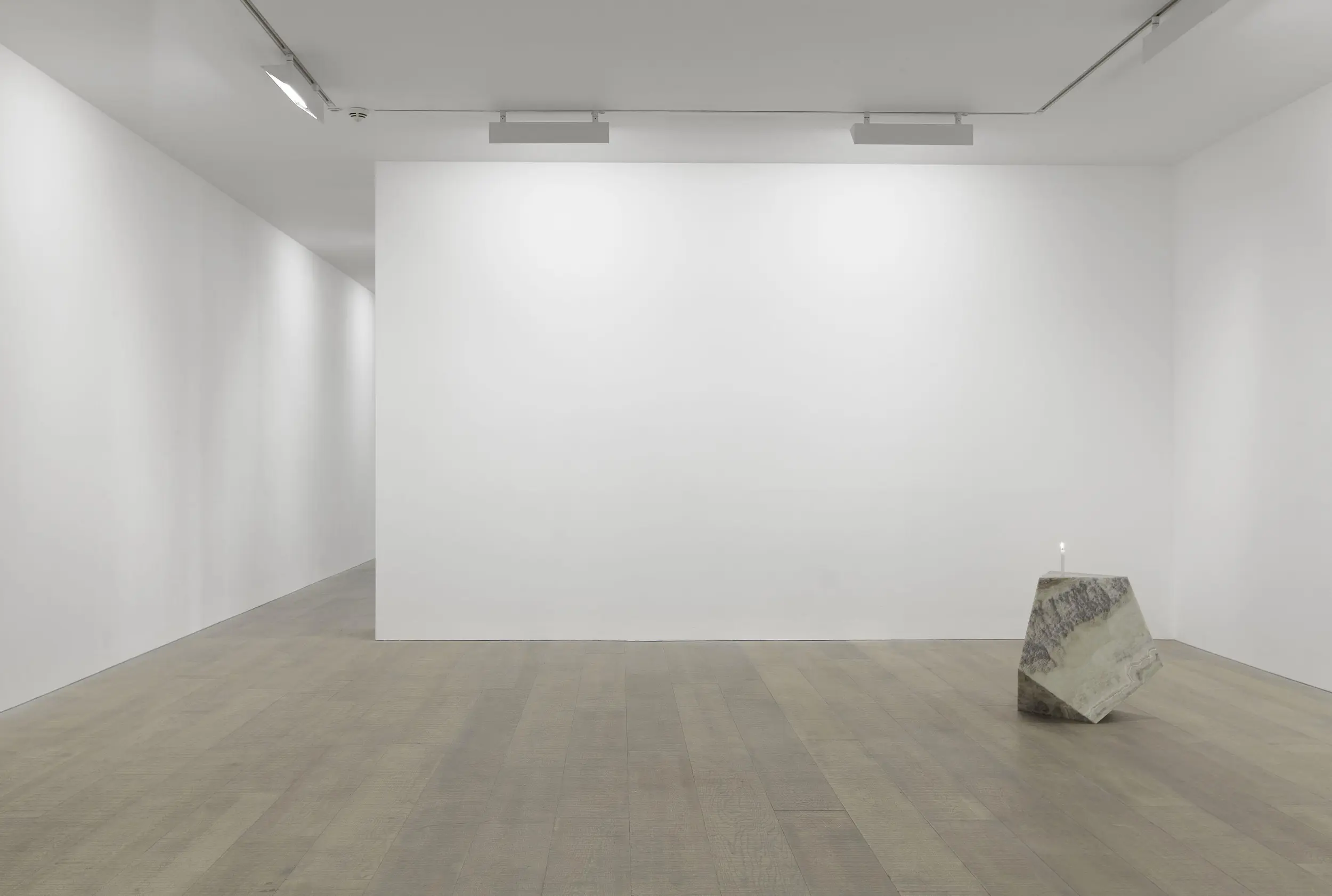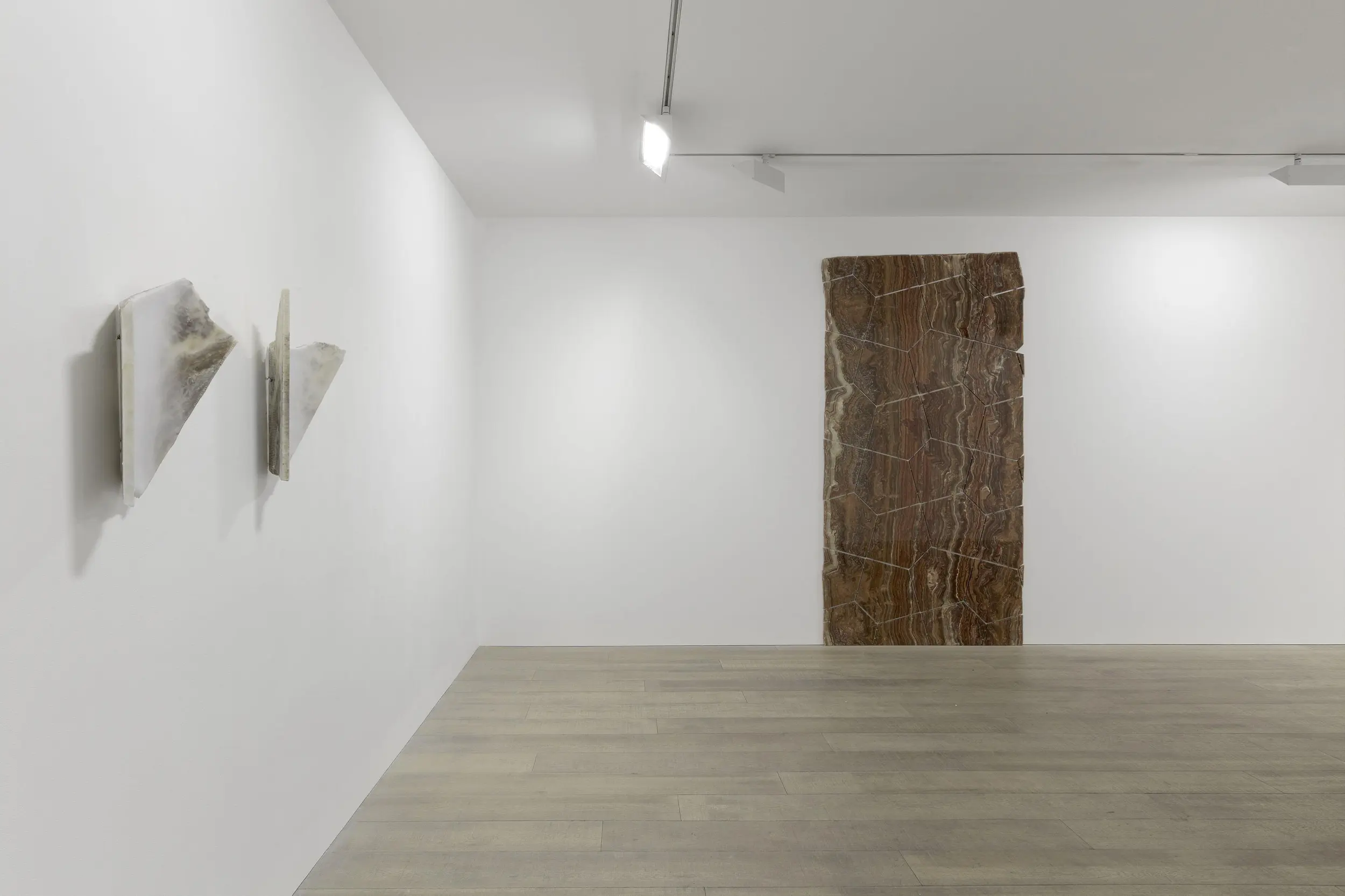 In this exhibition at Modern Art, Šarčević presents works made from elemental and evocative sculptural materials - onyx, wax, and fire - that realise beautiful expressions of abstract and mathematical geometric form. On the floor of one room rests a candle burning atop an onyx polyhedron that has been made from a flat sheet of stone as if folded according to the rules of a particular subset of polyhedra known in geometry as ‘Johnson Solids’ (convex polyhedra whose faces are formed from regular, but non-uniform polygons). On the walls, the hard and heavy fragments of this same stone hang with their mineral surfaces partially occluded with an uneven surface of poured white wax. In another room, a large and flat slab of polished onyx has been cut and reassembled from tessellating pentagonal pieces according to a pattern known as ‘Cairo’, after the ancient paving pattern found on that city’s streets.