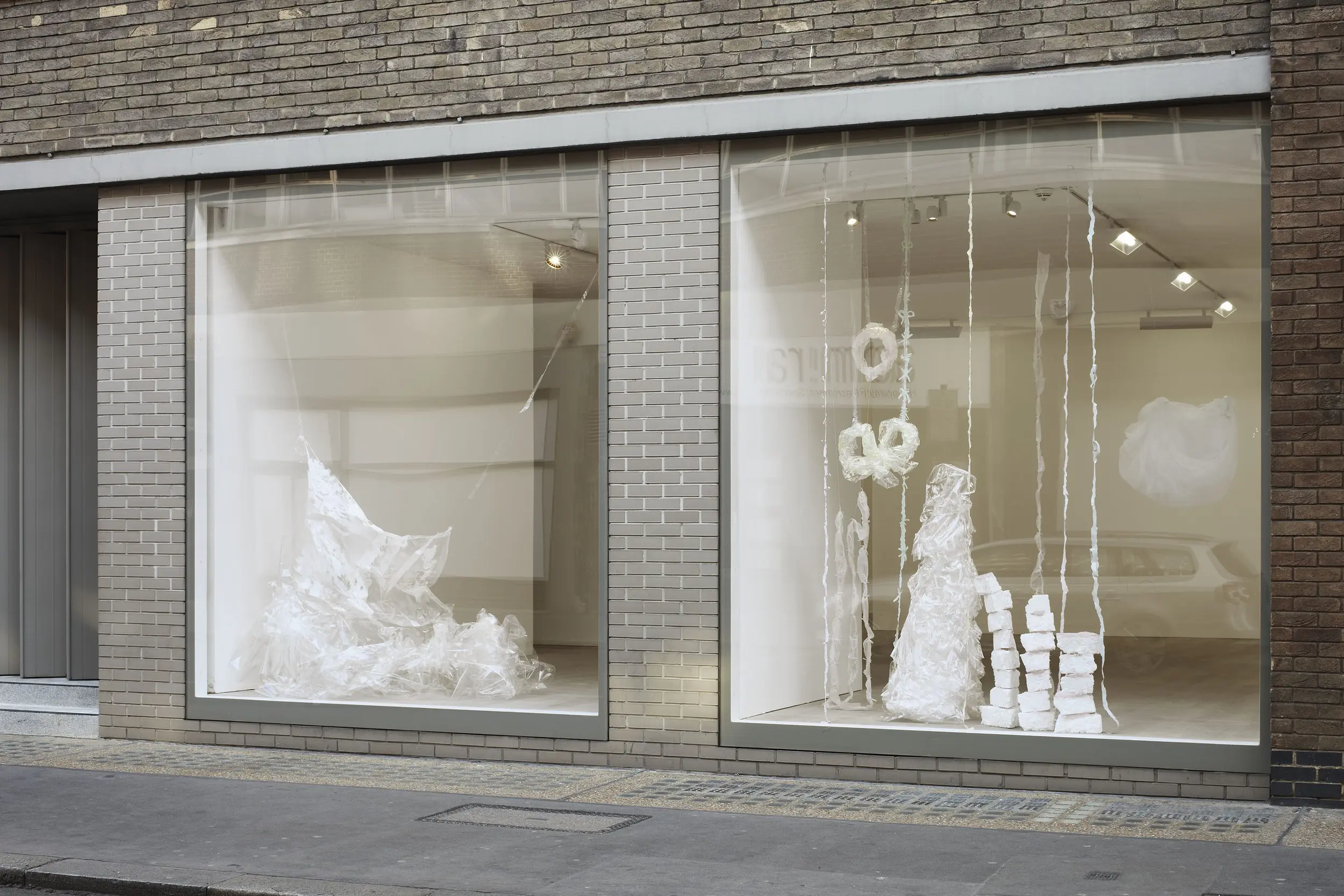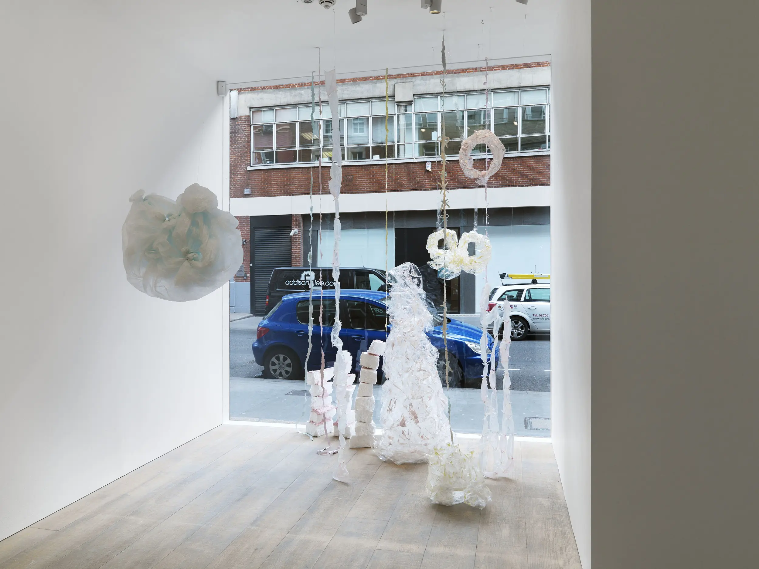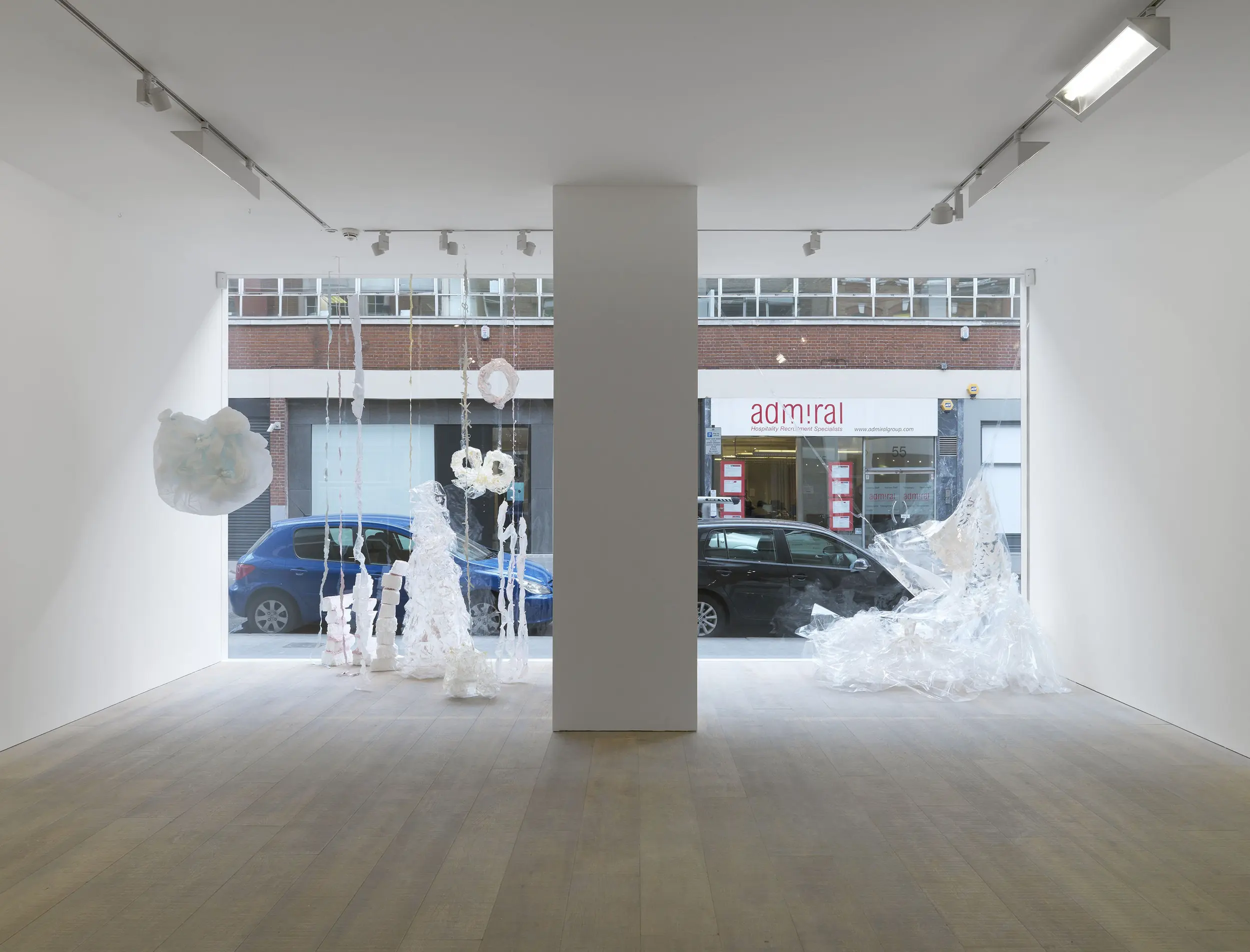This exhibition at Modern Art comprises a suite of sculptures that occupy the gallery’s three exhibition spaces. Black’s new works utilise characteristically light and delicate feeling forms that, as always, embody the difficulty and chaos of the creative moment, in challenging scales and positions throughout the overall rhythm of the exhibition. The new sculptures are made predominantly from loosely painted cellophane and dusted polythene.
