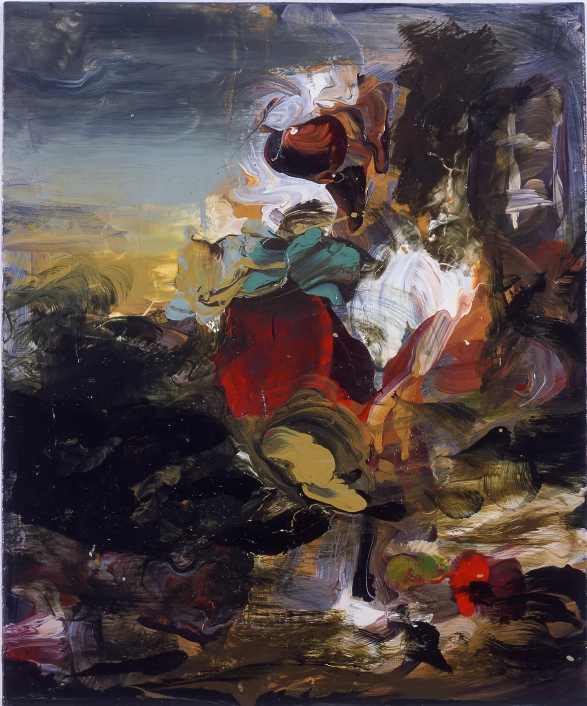 Often working several times from the same image, Moran returns, searching and re-exploring each composition until a final narrative unfolds. Beneath the varnished exterior of the paintings’ surface, thickly applied acrylic paint is moved with the fluidity of oil. Backgrounds often suggest rural or domestic settings, which, alongside the muted, natural tones of Moran’s palette – evoke the feeling of Romanticist portraiture. The figured subjects that foreground Moran’s compositions however, are abstract in their renderings, showing themselves only in the slight insinuation of limbs or gestures.