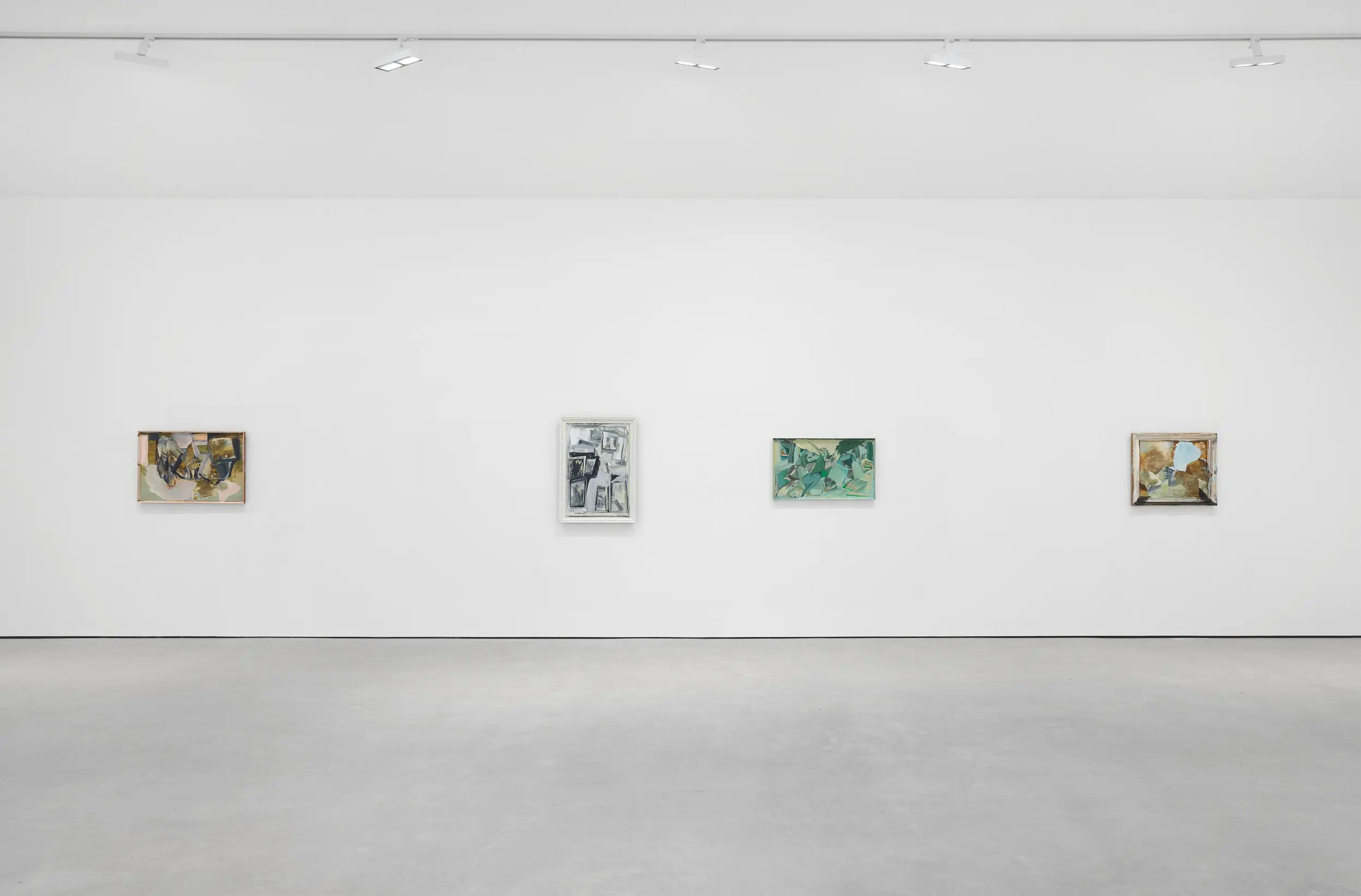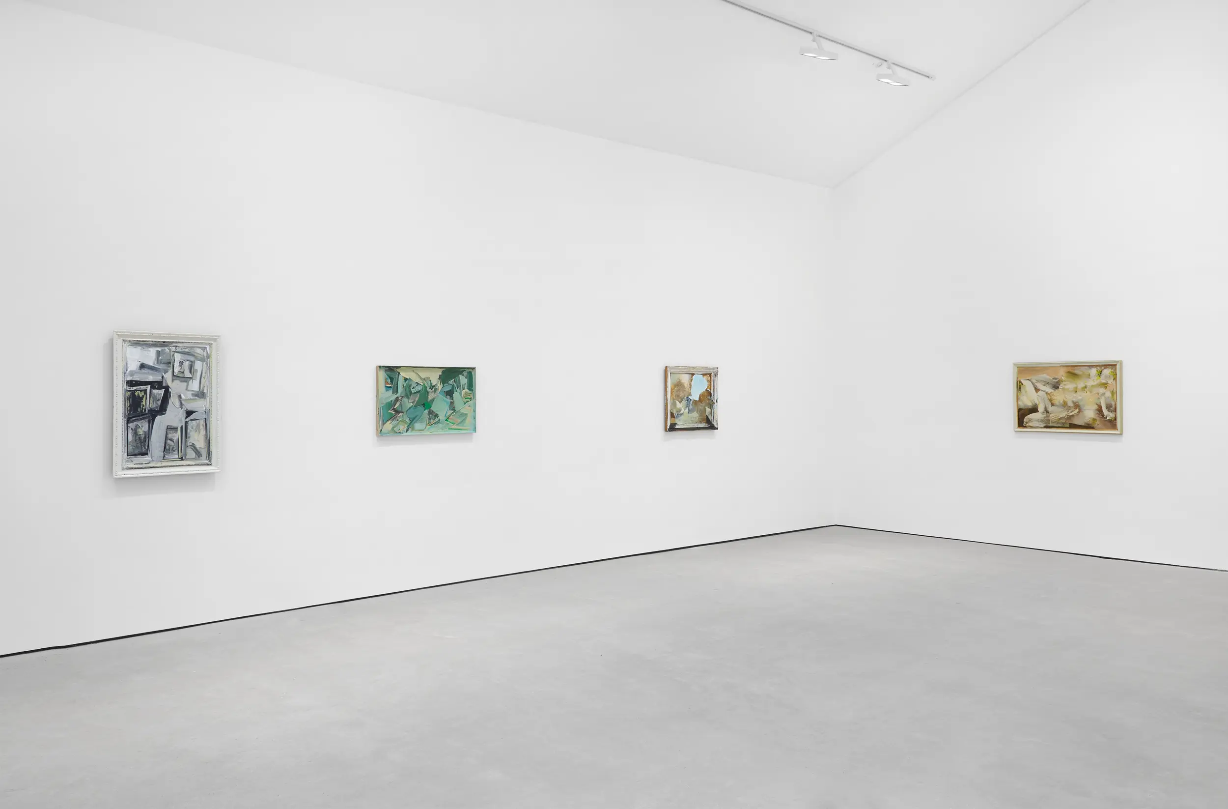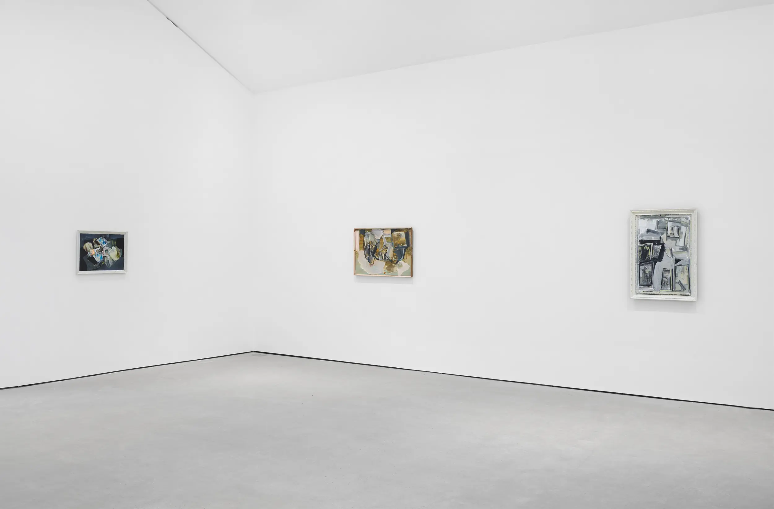 Recently described as an “abstract painter of figurative mood”, Moran enlists a wide scope of mark-making to conjure different atmospheres in each painting. In this latest body of work, every chosen surface is readymade including found framed paintings. She works her own brushstrokes over these supports, sometimes leaving fragments of the original layer to show through, at other times obscuring it entirely. As Moran produced this body of work over the course of the last year following a move to the countryside, the paintings too seem to move with the seasons. Abstract marks begin to take on pictorial elements of still-life arrangements or landscapes, and the colour palette, dominated by earthy greys and piercing blues, registers the seasonal changes.