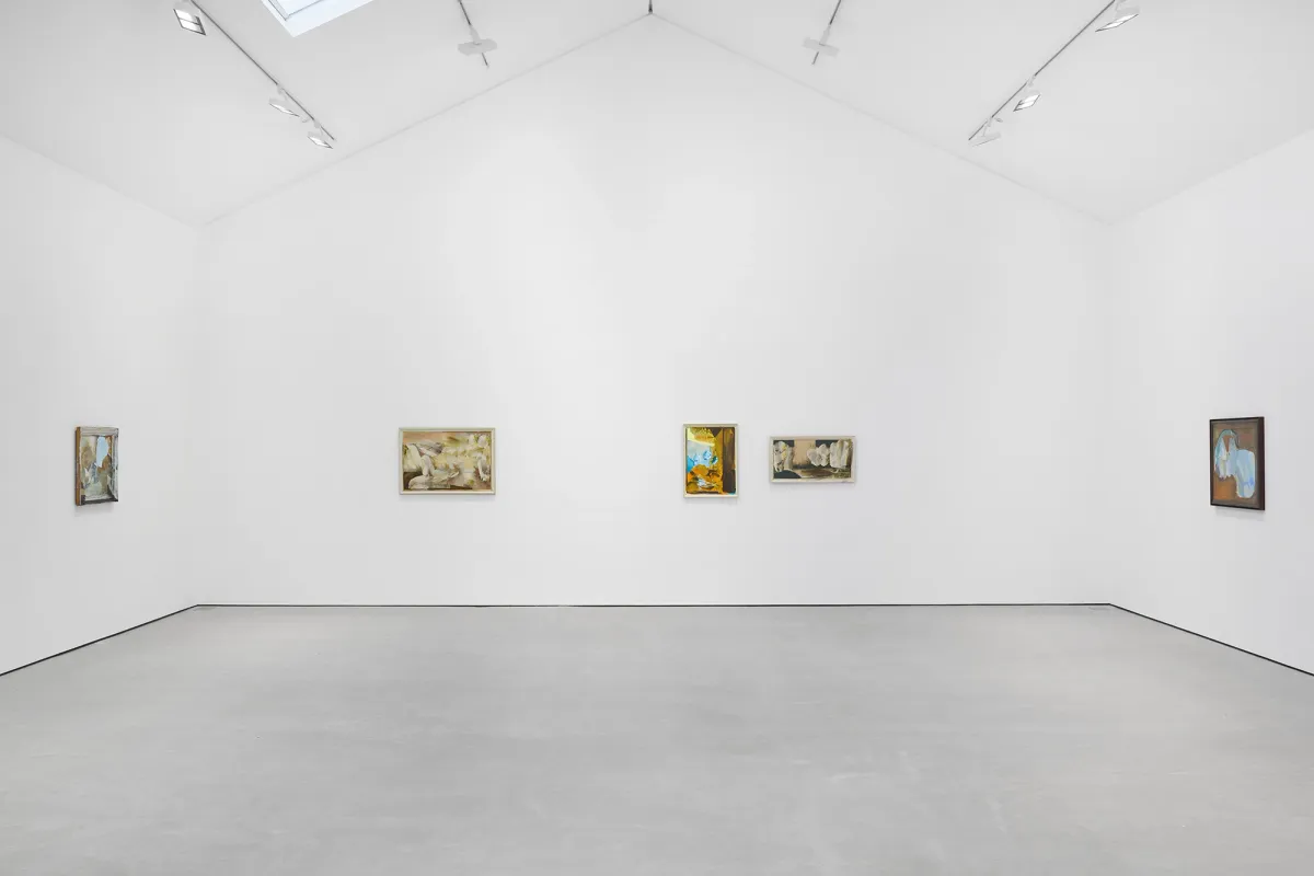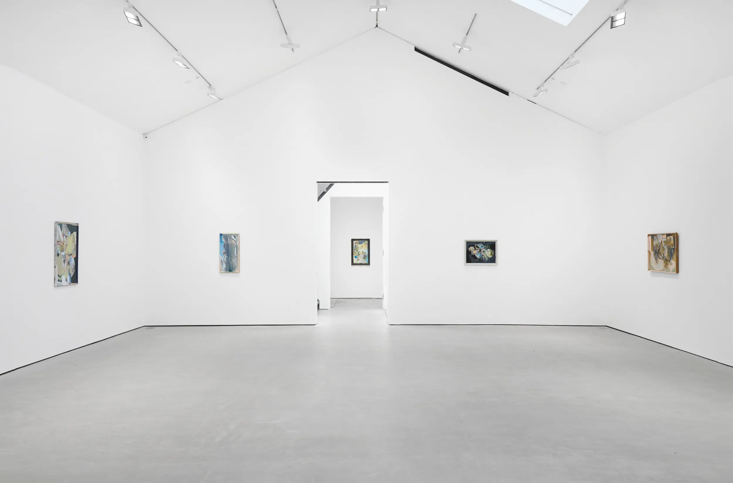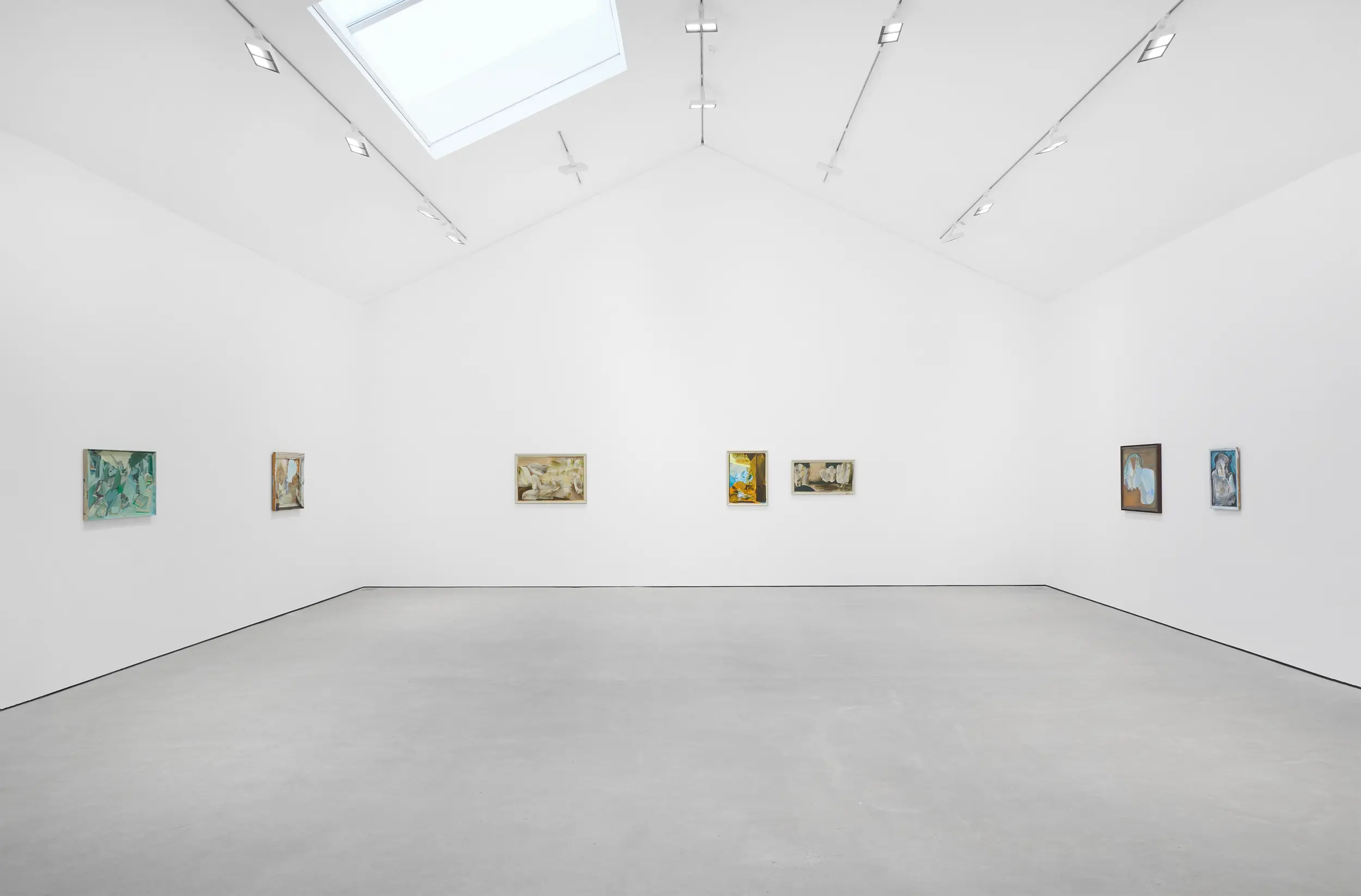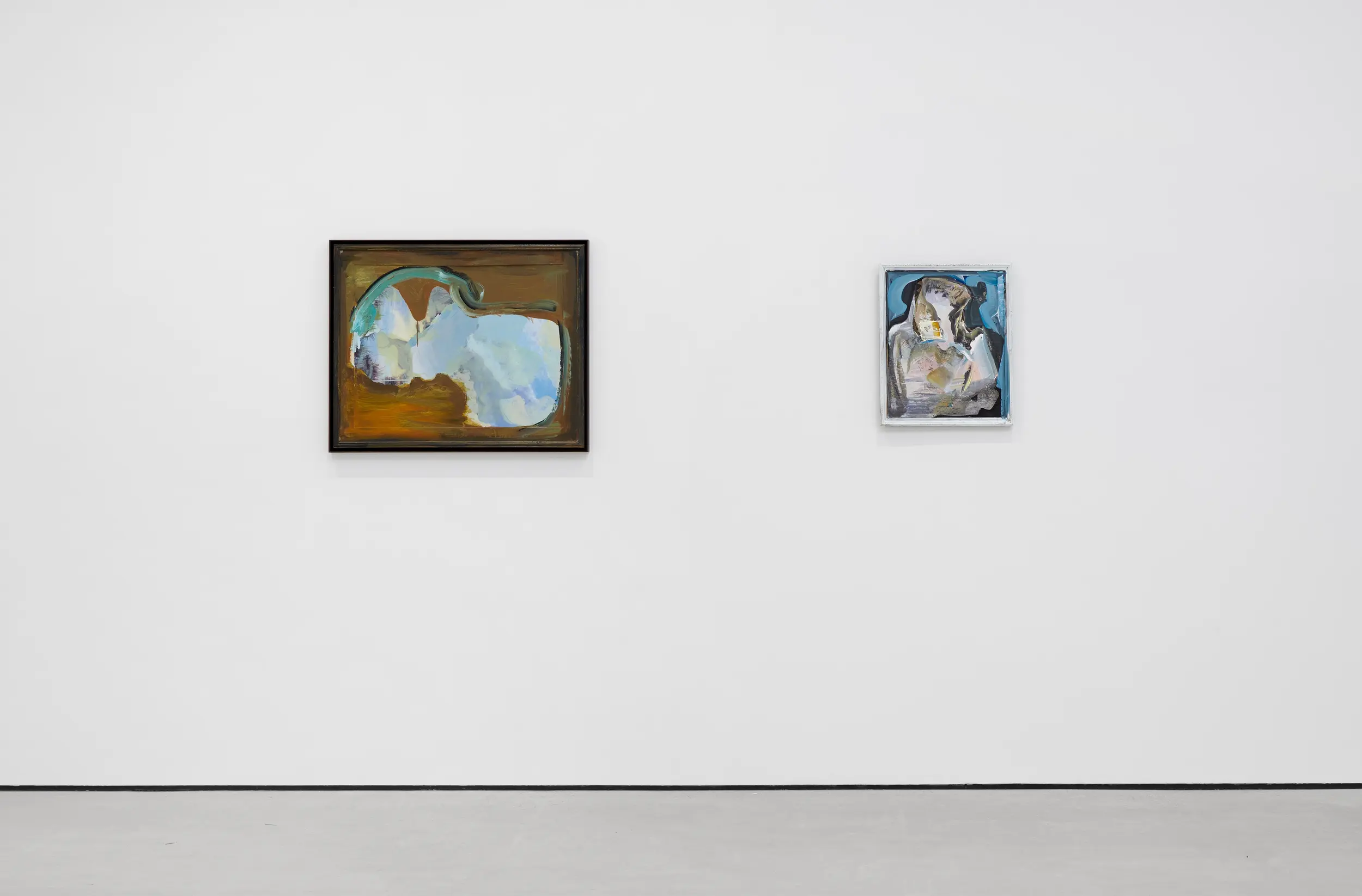 Recently described as an “abstract painter of figurative mood”, Moran enlists a wide scope of mark-making to conjure different atmospheres in each painting. In this latest body of work, every chosen surface is readymade including found framed paintings. She works her own brushstrokes over these supports, sometimes leaving fragments of the original layer to show through, at other times obscuring it entirely. As Moran produced this body of work over the course of the last year following a move to the countryside, the paintings too seem to move with the seasons. Abstract marks begin to take on pictorial elements of still-life arrangements or landscapes, and the colour palette, dominated by earthy greys and piercing blues, registers the seasonal changes.