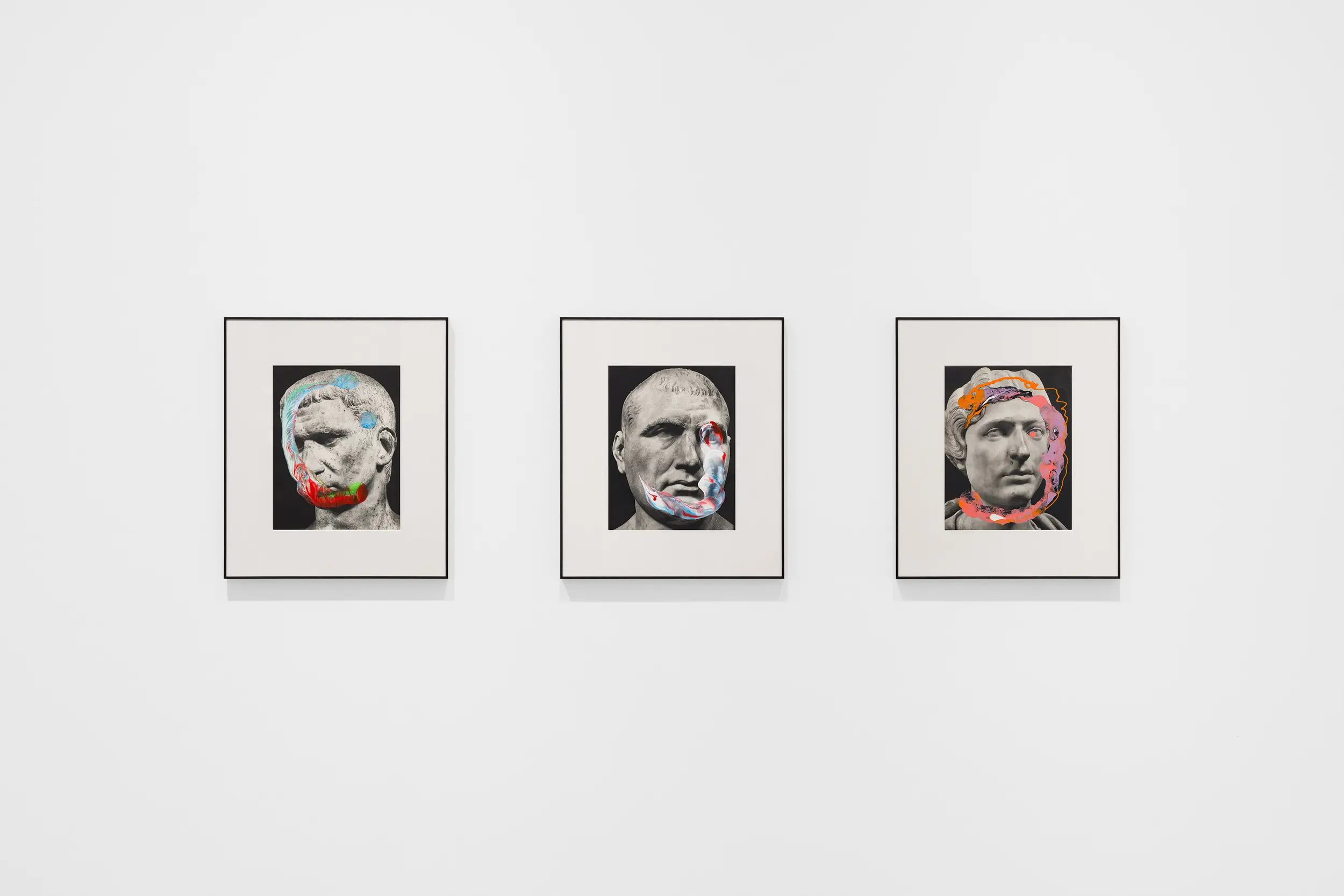 In another group of works images of Ancient Greek statues and busts are juxtaposed with 20th century domestic objects, bringing the mythological into the everyday, a recurring trope throughout her career. In other examples Linder obfuscates the faces of classical statues with enamel paint, their familiar gazes awakened from centuries of fixity.