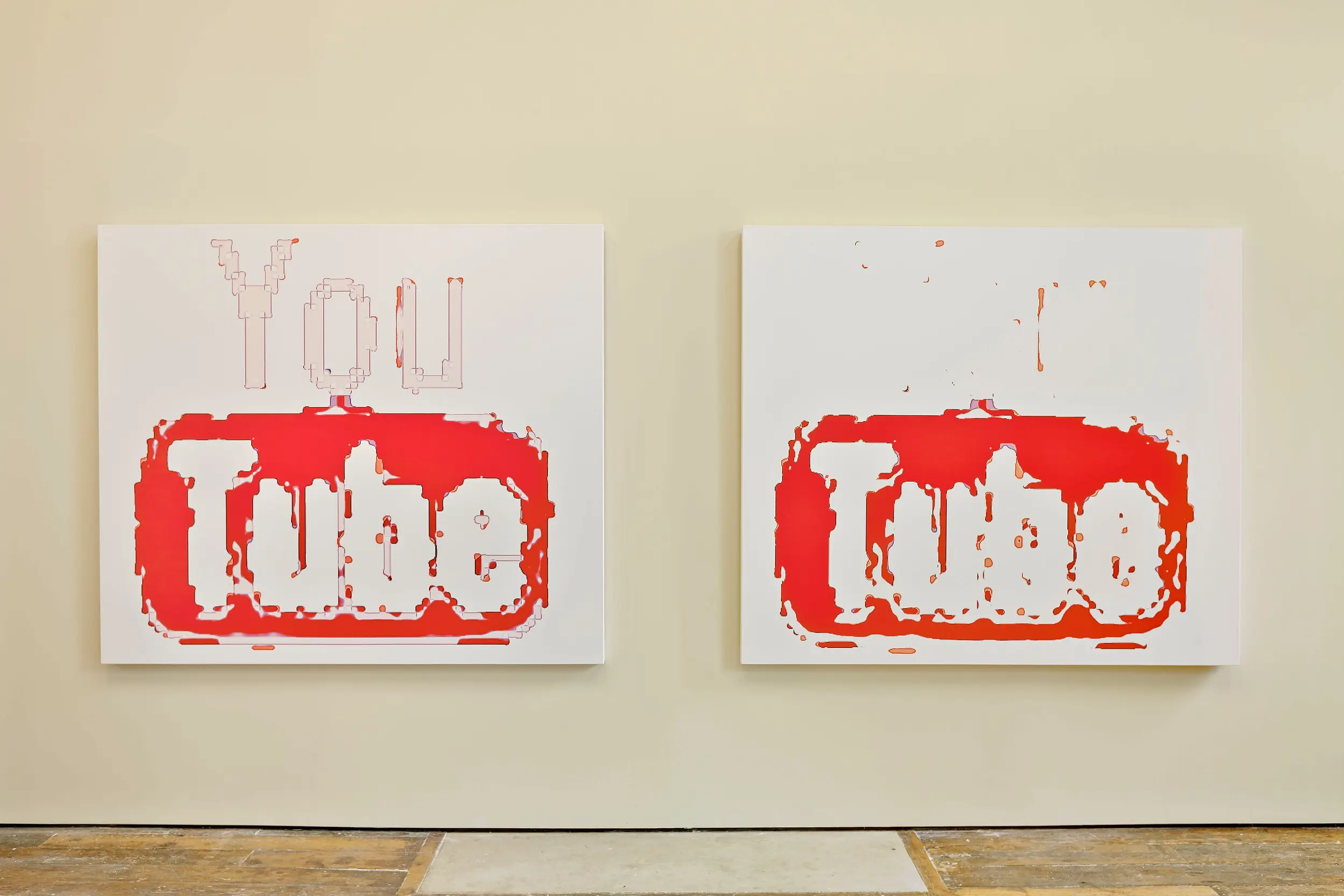 Over recent years, Mark Flood's influence has increasingly been felt in the work of younger generations of American artists. His current practice's most recognisable work is that of ongoing series’ of paintings. Since 2000 he has produced a body of 'lace paintings' – wilfully beautiful canvases luridly coloured and richly patterned with impressions of decorative lace. His text paintings on monochrome canvases or found panels overspray lettering in missives urging the exploration of sexuality, the committing of suicide, or deadpan self-description. Most recently, a new series of paintings lift corporate logos from websites in low resolution and blow them up on canvas into a degraded image of massive pixels.