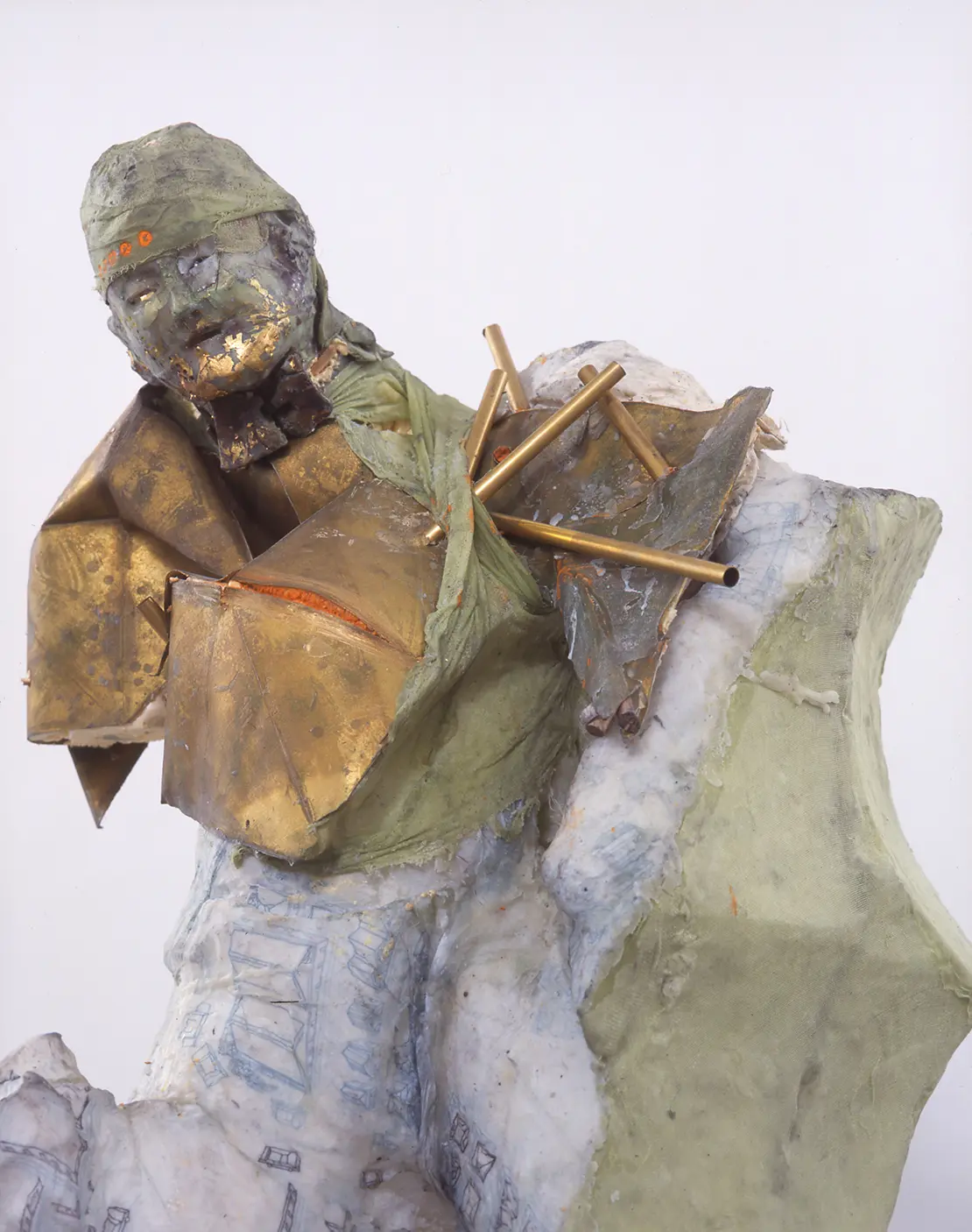 The disparate figures that form Monahan’s sculpted legion are constructed from materials that take no initial anthropomorphic form. Glued, cut, pulled, nailed, burned or moulded into shape from raw building materials, the figures take on their final body with an energy of resistance. Made as intricate composites from the tropes and stereotypes of early figurative sculpture, Monahan adopts the sensibilities of Mary Shelley’s Frankenstein; ‘cobbling’1 together creatures that are the artist's deliberately contorted reflection of such art historical burden.!