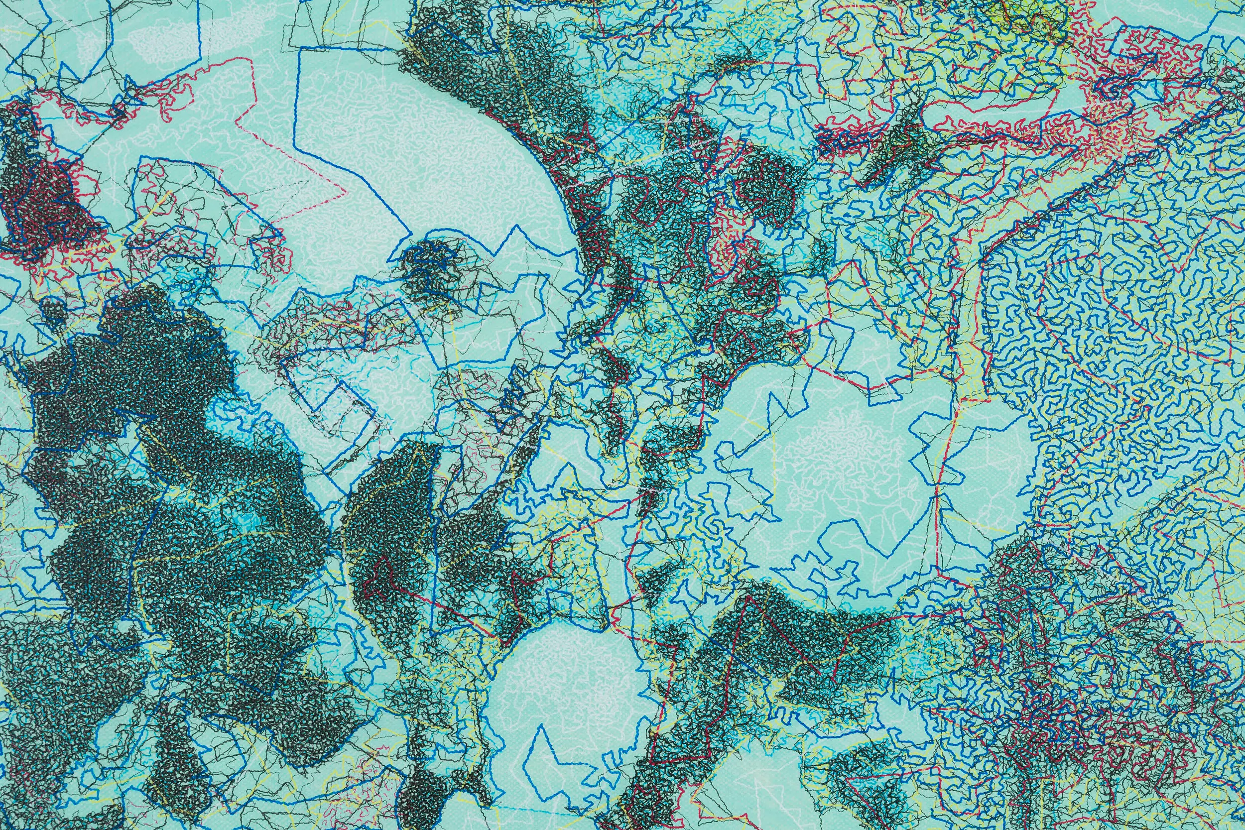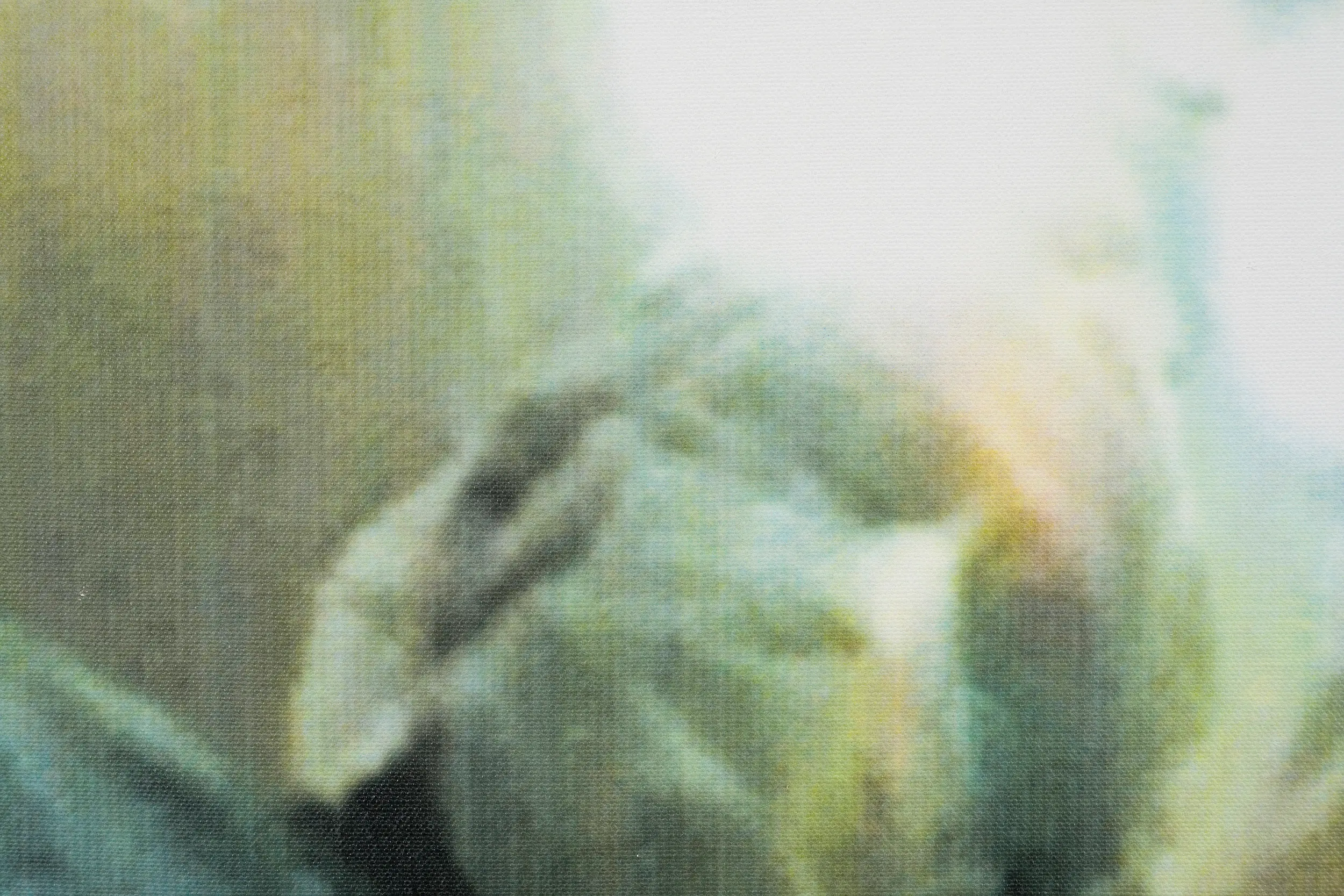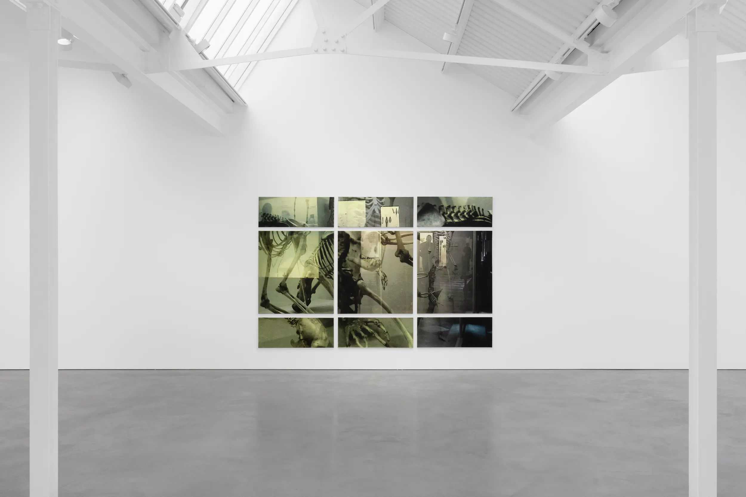 The exhibition features examples of Groebel’s early television paintings, a selection that reflects on the variations of painterly marks the machine produced at first. In the 2000’s when television companies introduced subscription models, Groebel started using his own imagery for source material. Included in the exhibition are two multi panel paintings, Collective Memories and Virgins – both deriving from his own imagery. Also included are new paintings made with a new machine, here Groebel’s own photography is rendered with a pen connected to a machine, which uses the travelling salesman algorithm, where the drawn line never goes over itself as it creates the image incrementally. The film work Skull Hop features two animated skeletons caught in a dance macabre, and a soundtrack produced by musicians Matthias Mainz and Alexander Peterhaensel.