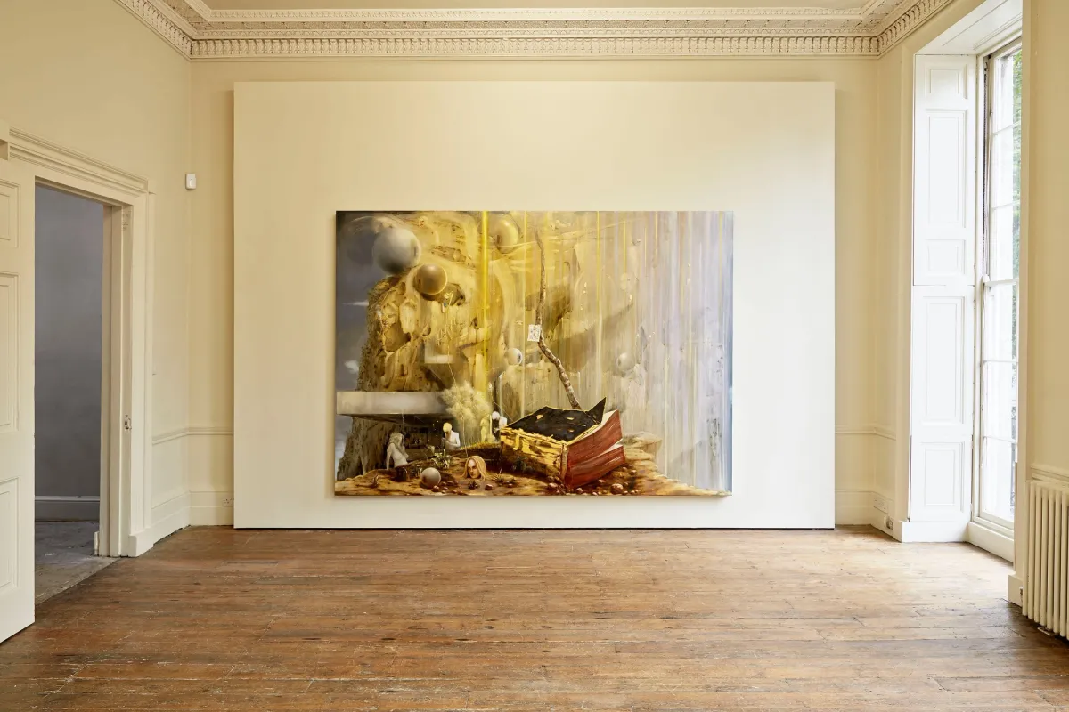 Cooke’s new paintings create layered images of atmospheric landscapes with suggestions of architecture, vegetation and abstract shapes, inhabited by ghostly figures and closely painted objects that include books, watches, eyeballs, and decaying fruit. Cooke’s paintings use techniques and motifs that often articulate references to painters and painting’s history. Throughout his work, Cooke depicts an open narrative of intellectual pursuit, creative endeavour, and human folly.