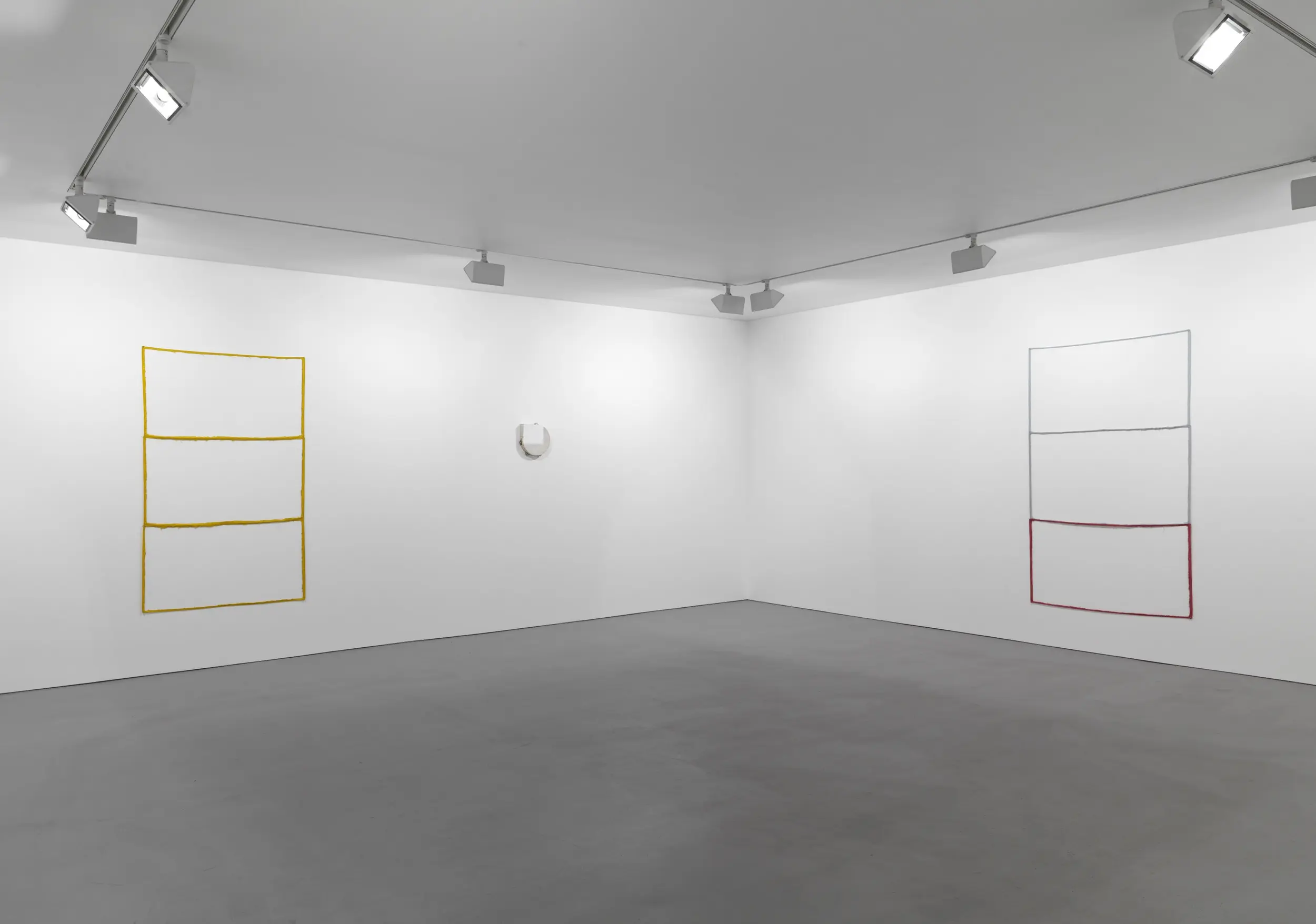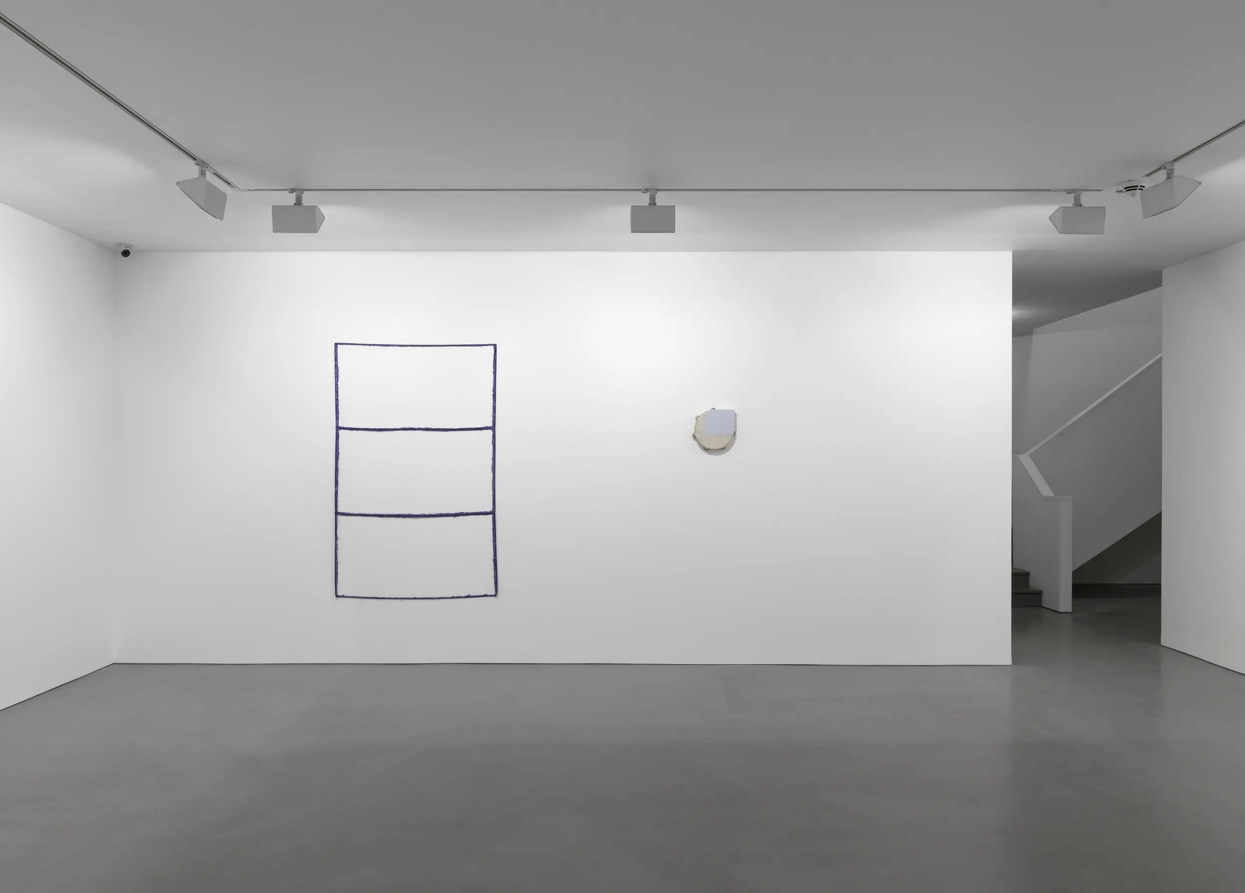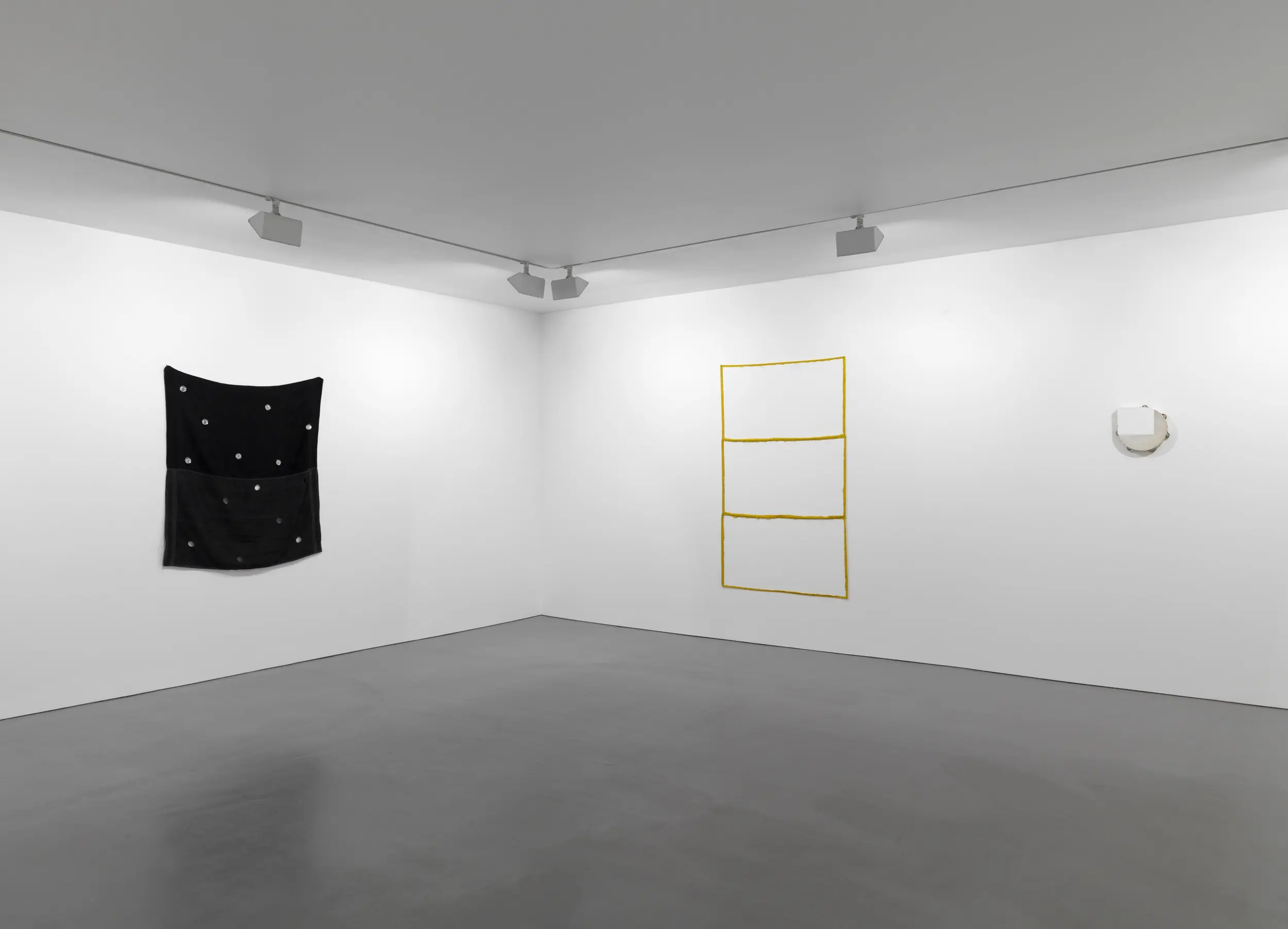 This exhibition at Modern Art presents a group of wall-based works derived from towels and tambourines. Towels, Lee’s foremost raw material, are worked by hand, dyed, painted, cut and reconstructed. His towel works exist in variant sets of forms: loosely referred to by the artist as ‘solids’, ‘negatives’ and other similarly literal descriptions. These pieces all in some way propose and delineate an atmosphere of pictorial space. His tambourines are painted on and reshaped with small built extensions. Lee’s uses of textures and flat even planes of colour recall the visual identity of modern formal abstraction, but only in the sense that that association is already-there in the world. They come to be more by way of an exercise in allusion and tactile experience than as the illustration of style or concept. Muted and displaced, Lee re-forms and re-establishes these materials as aesthetic devices that express the possibility of extruding narrative and decoding meaning.