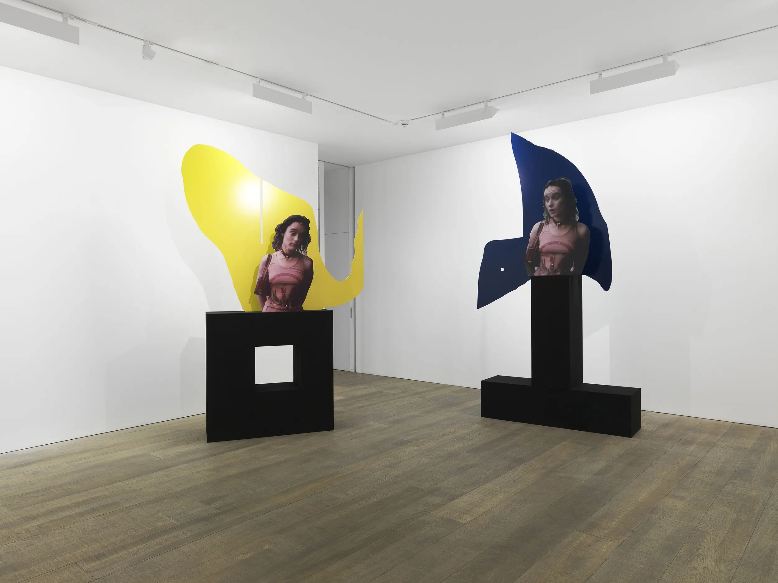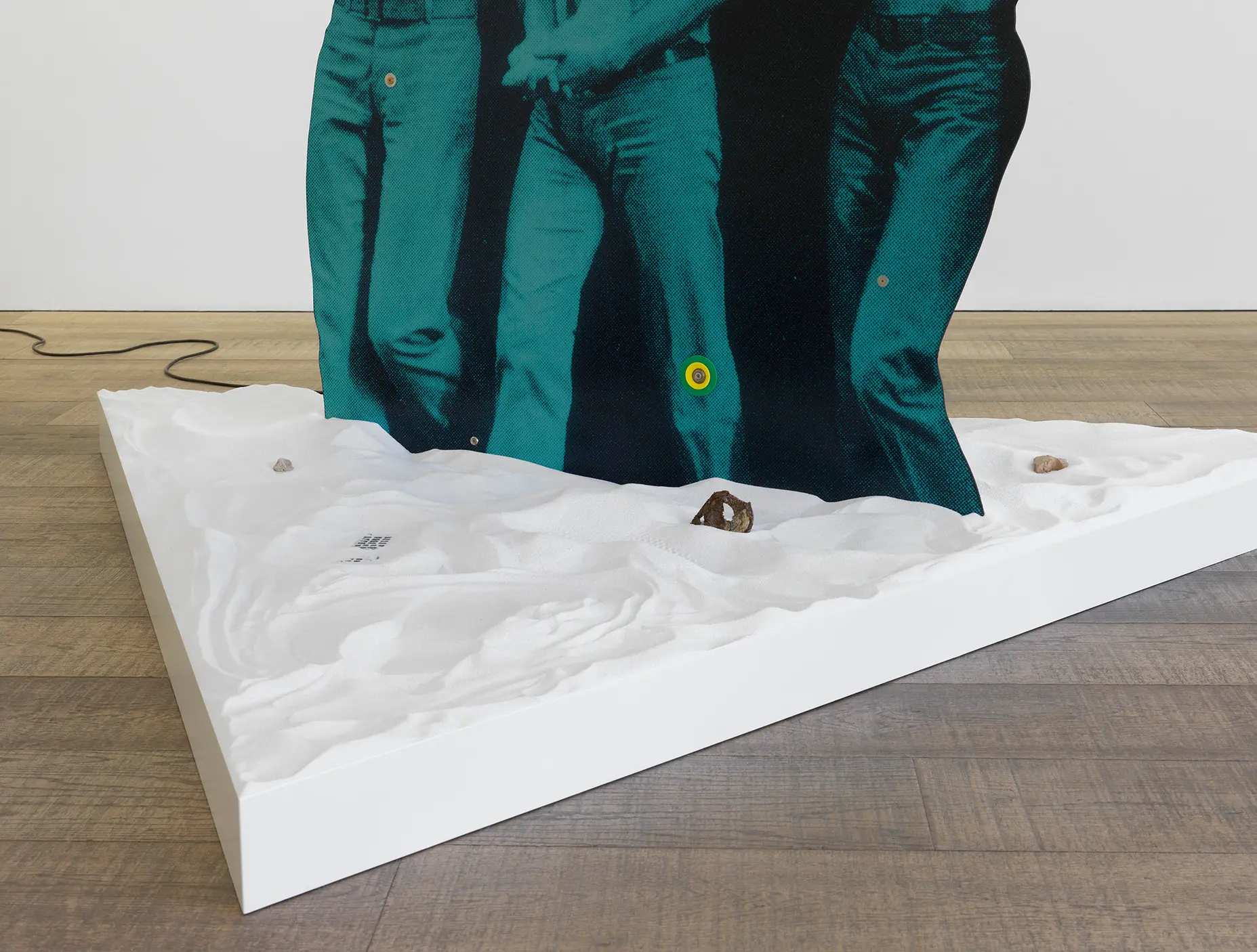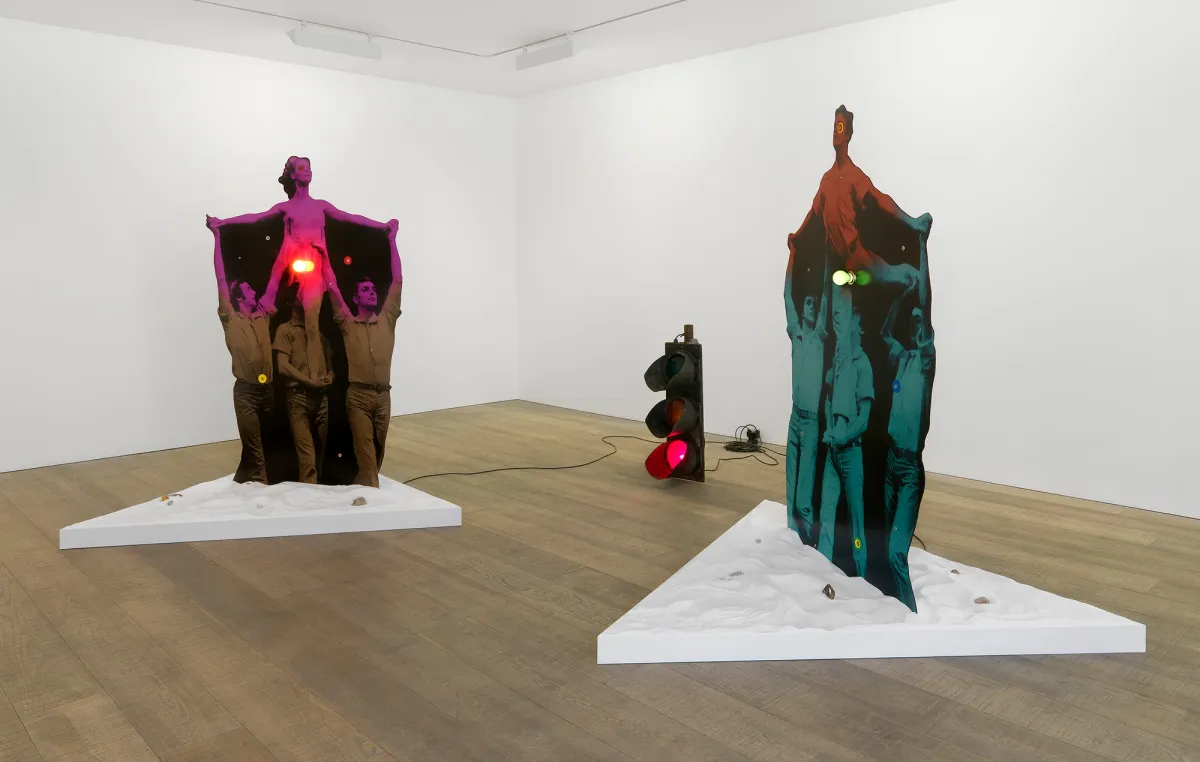 Lothar Hempel’s large new sculpture Verkehr (the German for ‘traffic’, and also a euphemism for sex) recaptures a double image of modern dancers as large photographic cut-outs, infused with spectral colour, depicted in a staged moment of euphoria and triumph. Hempel presents them frontally, propped-up on two separate plinths and triangles of unnaturally white sand, with an old traffic light nearby. There is a theatrical association, yet no one is exactly on stage. Hempel collapses the set, script and cast of a fantastic dance into sculpture. These sculptures are structured from two dimensional images in three dimensional space, and in this sense they almost undermine their themselves, revealing themselves as facades.