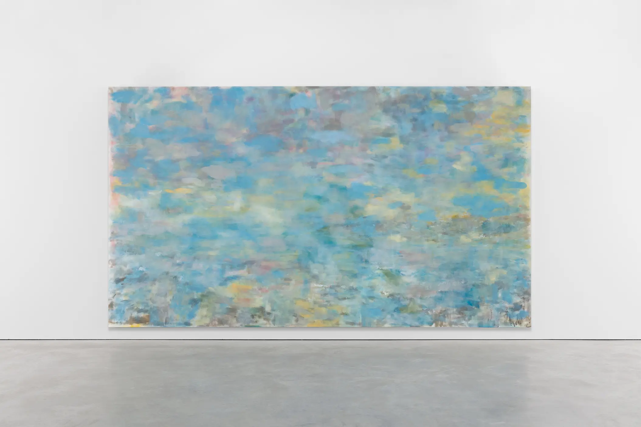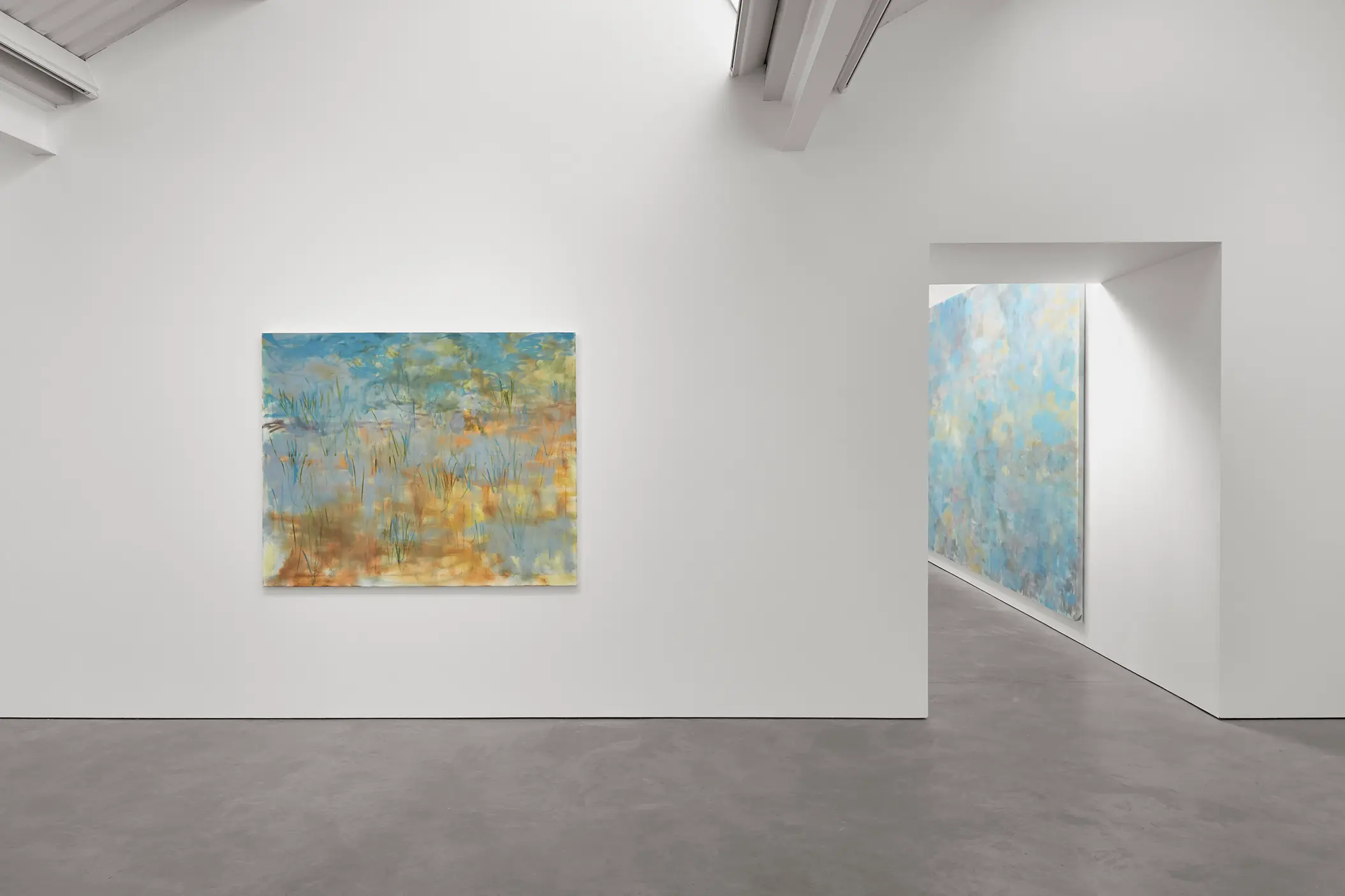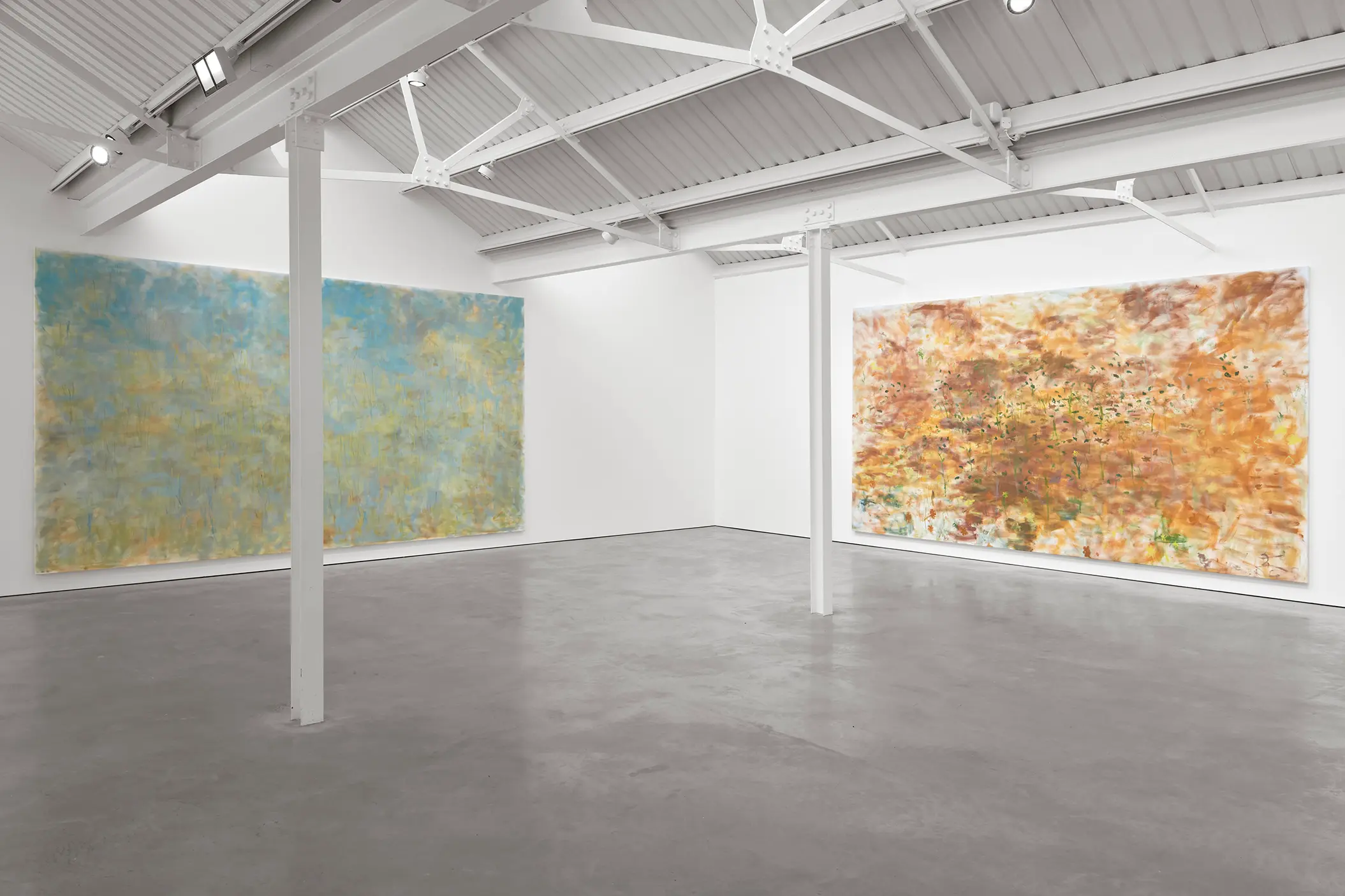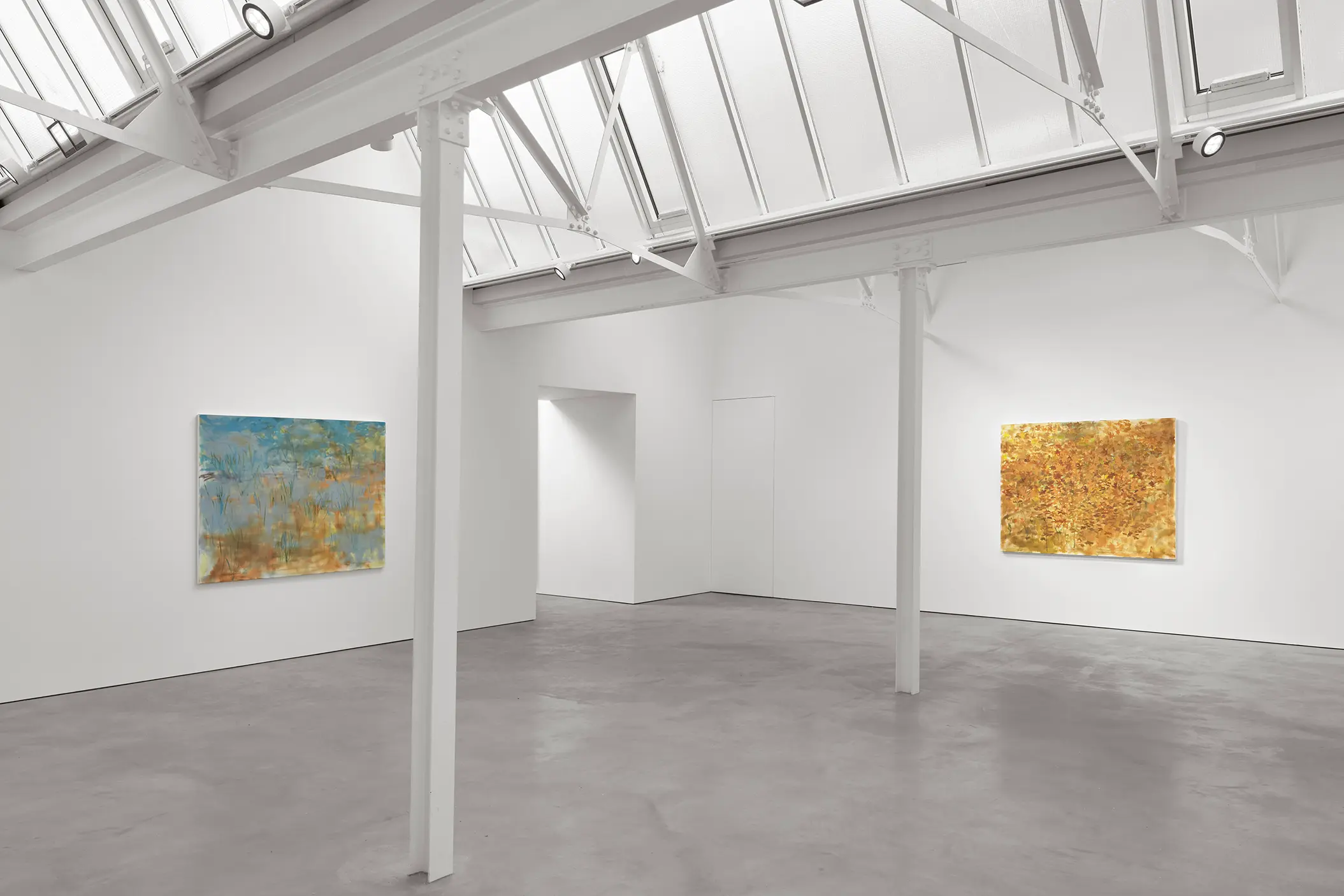 Shimizu’s new body of work for Modern Art is made with a particular attention given to the passing of time. Each landscape is painted from memory, showing the process of his mind’s recording and preserving of visual information from the past, processed in the present, with a view to their evolving future existences; much like the slow work of mulching leaves and sowing of seeds in a garden. Painted during winter, the spring wildflowers in two of Shimizu’s new works are conjured from his recollection, just as the atmospheres of autumn in the leaf mulch works are revivified experiences of his day-to-day, hands-on engagement with his surroundings. But underlying this interest in representation there is, too, a connection to the abstraction of colour field painting. Some landscapes - such as those picturing the river, palisades, and sky - begin with three bands of colour, which are then complicated with seemingly incongruous brushwork and figurative content layered atop, while in others brilliant hues of ochre or sky blues form the backdrop to the detail that is portrayed over their surface.