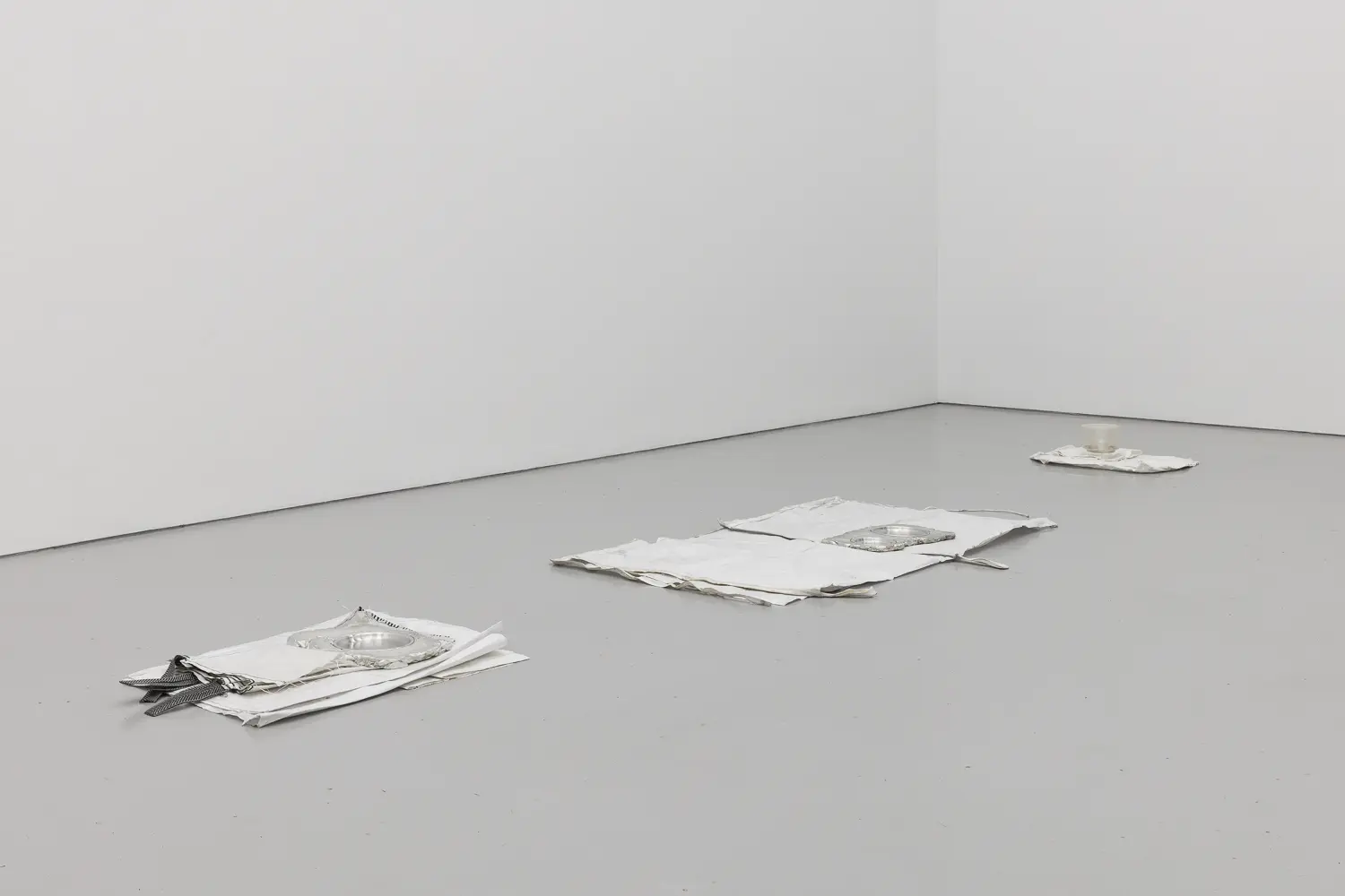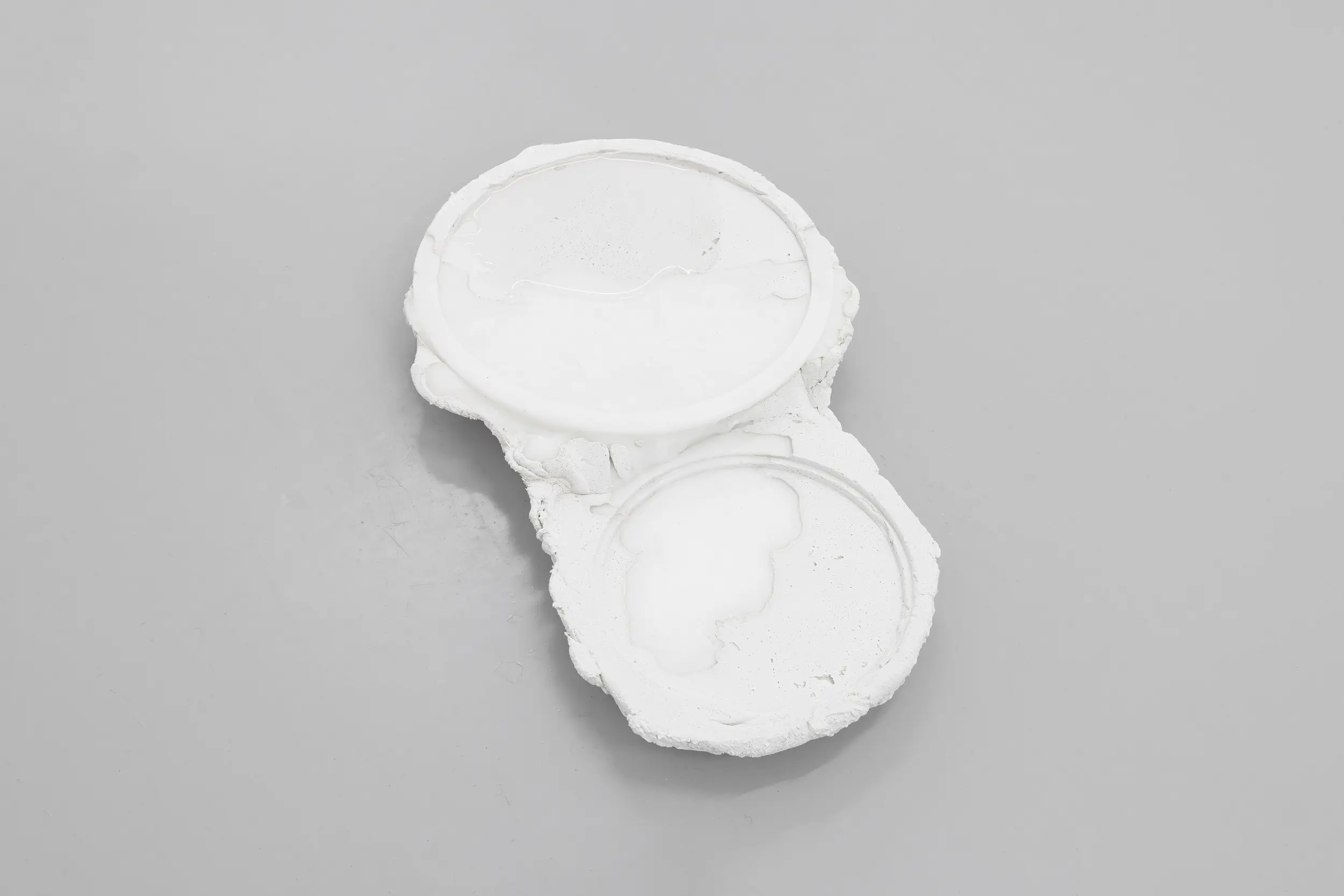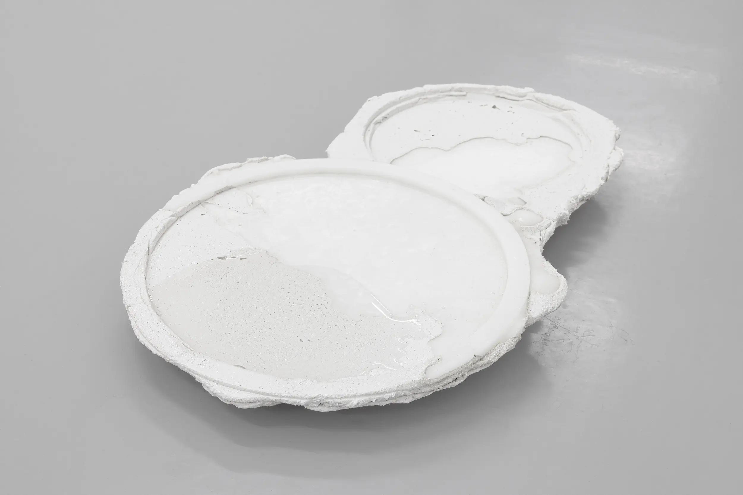 What else might these sculptures hold out to you? A hand, almost. Pale luminance contours a pair of shallow, deliquescent trays cast in white wax and stationed low on the wall. Since one is brim-full of rainwater, the resultant stillness summons a circular inspection of some fresh quarry within you, a hankering that doesn’t yet understand the shape of its yearning: To drink? To wash? To quench? To immerse? The water lays like a crush. Yes, always with circumscribed water: the prospect of satiety. You find similar senses within a whorled ground comprising repeat wax castings of gold panning vessels. Fatiguing and imprinting the positive and negative space of the containers, here process has stressed the tolerances of casting itself. Your attention renews and reinscribes its carefully writ rings, they draw you in, as if your very thoughts might begin to sift a glistened epiphany. Its roving radiality occasions a votive attendance from you as you orbit it. Arriving like a skipping stone with its dispersive physics, you take its hollows in.
