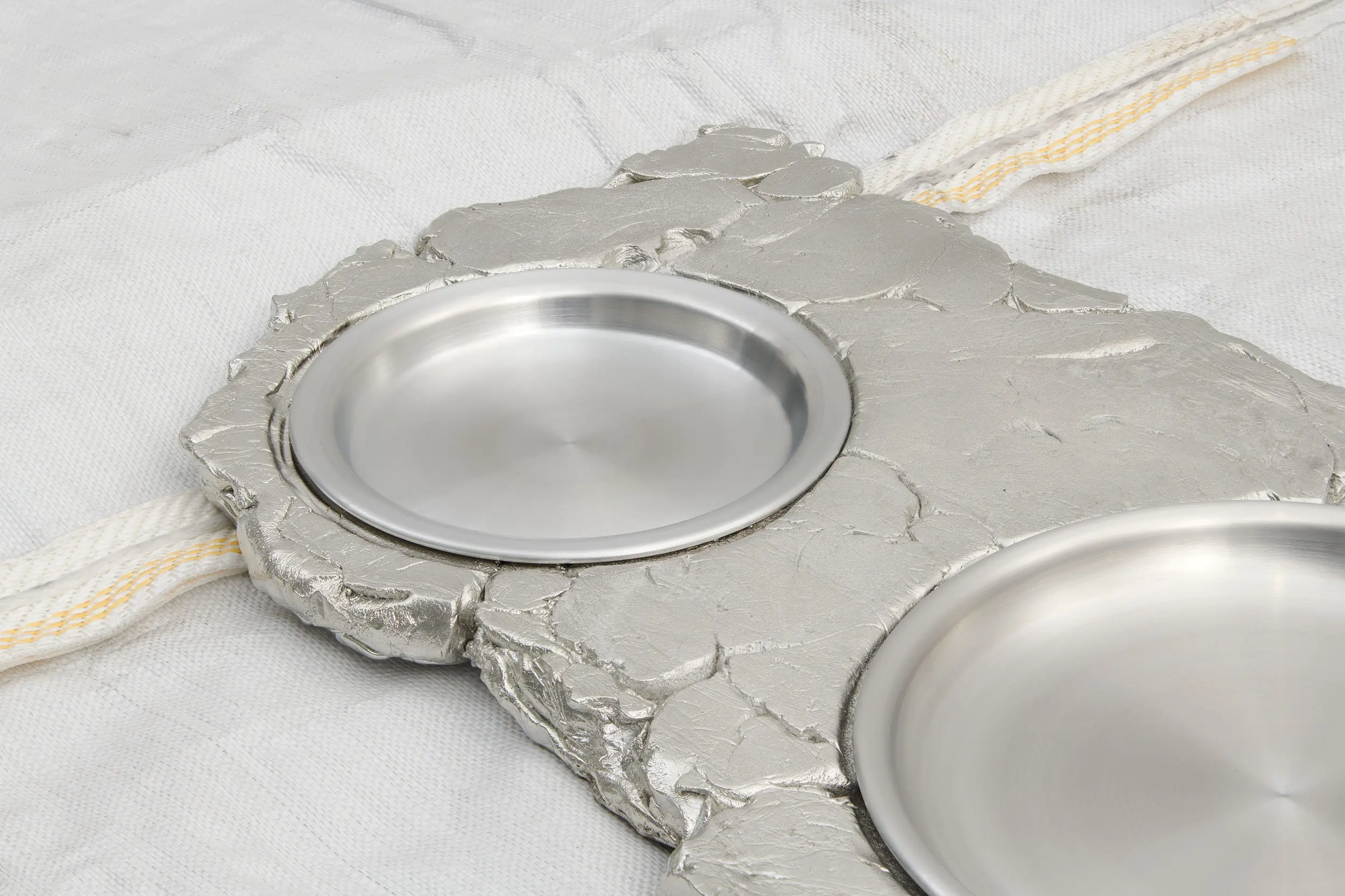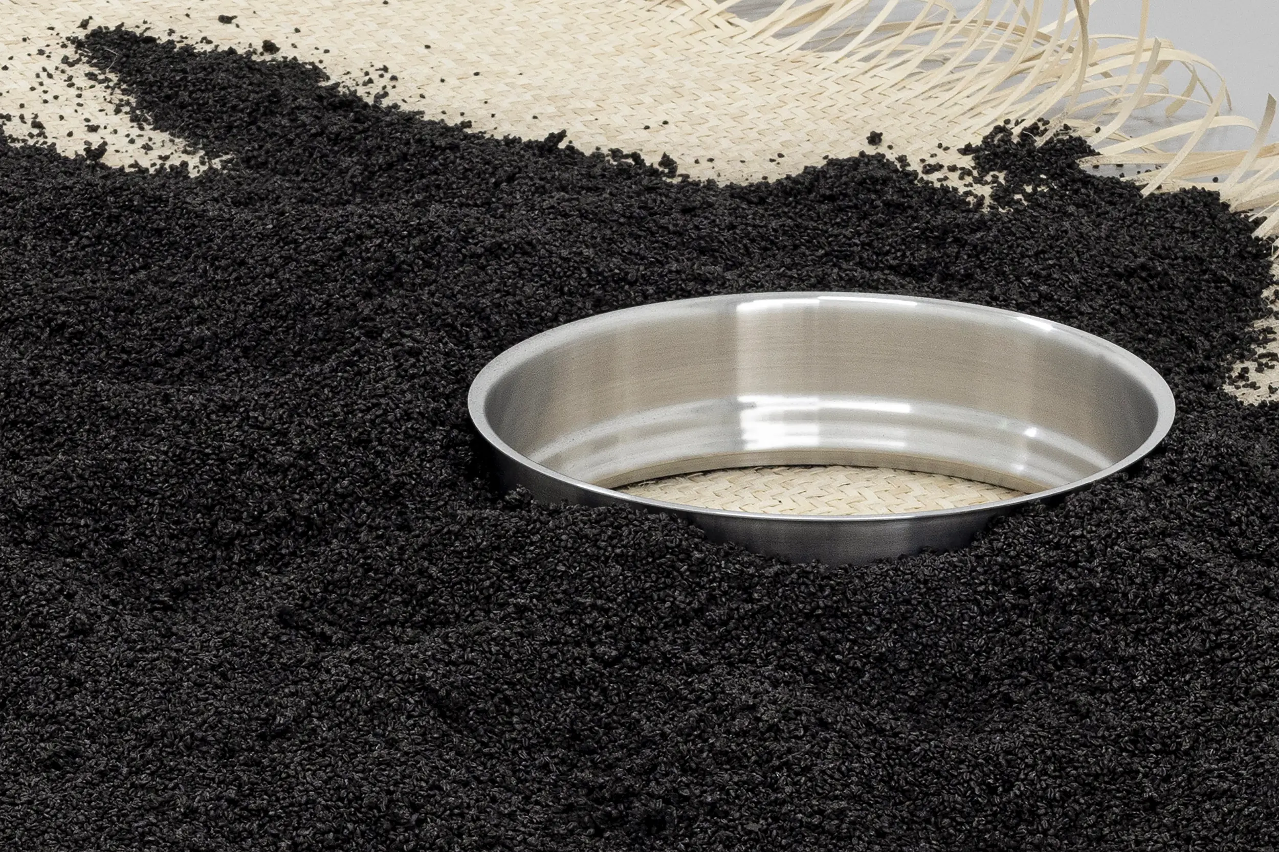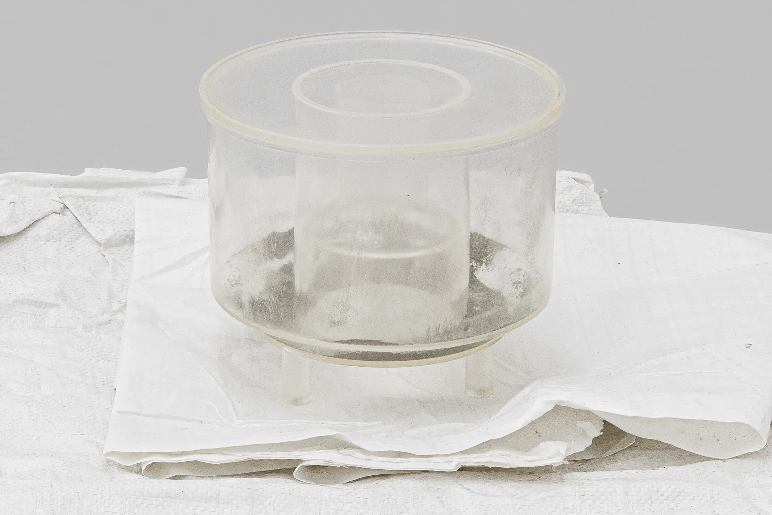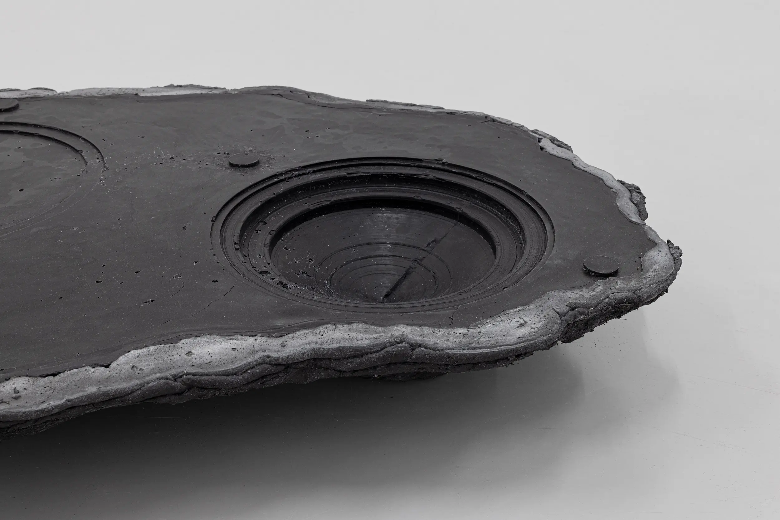 What else might these sculptures hold out to you? A hand, almost. Pale luminance contours a pair of shallow, deliquescent trays cast in white wax and stationed low on the wall. Since one is brim-full of rainwater, the resultant stillness summons a circular inspection of some fresh quarry within you, a hankering that doesn’t yet understand the shape of its yearning: To drink? To wash? To quench? To immerse? The water lays like a crush. Yes, always with circumscribed water: the prospect of satiety. You find similar senses within a whorled ground comprising repeat wax castings of gold panning vessels. Fatiguing and imprinting the positive and negative space of the containers, here process has stressed the tolerances of casting itself. Your attention renews and reinscribes its carefully writ rings, they draw you in, as if your very thoughts might begin to sift a glistened epiphany. Its roving radiality occasions a votive attendance from you as you orbit it. Arriving like a skipping stone with its dispersive physics, you take its hollows in.