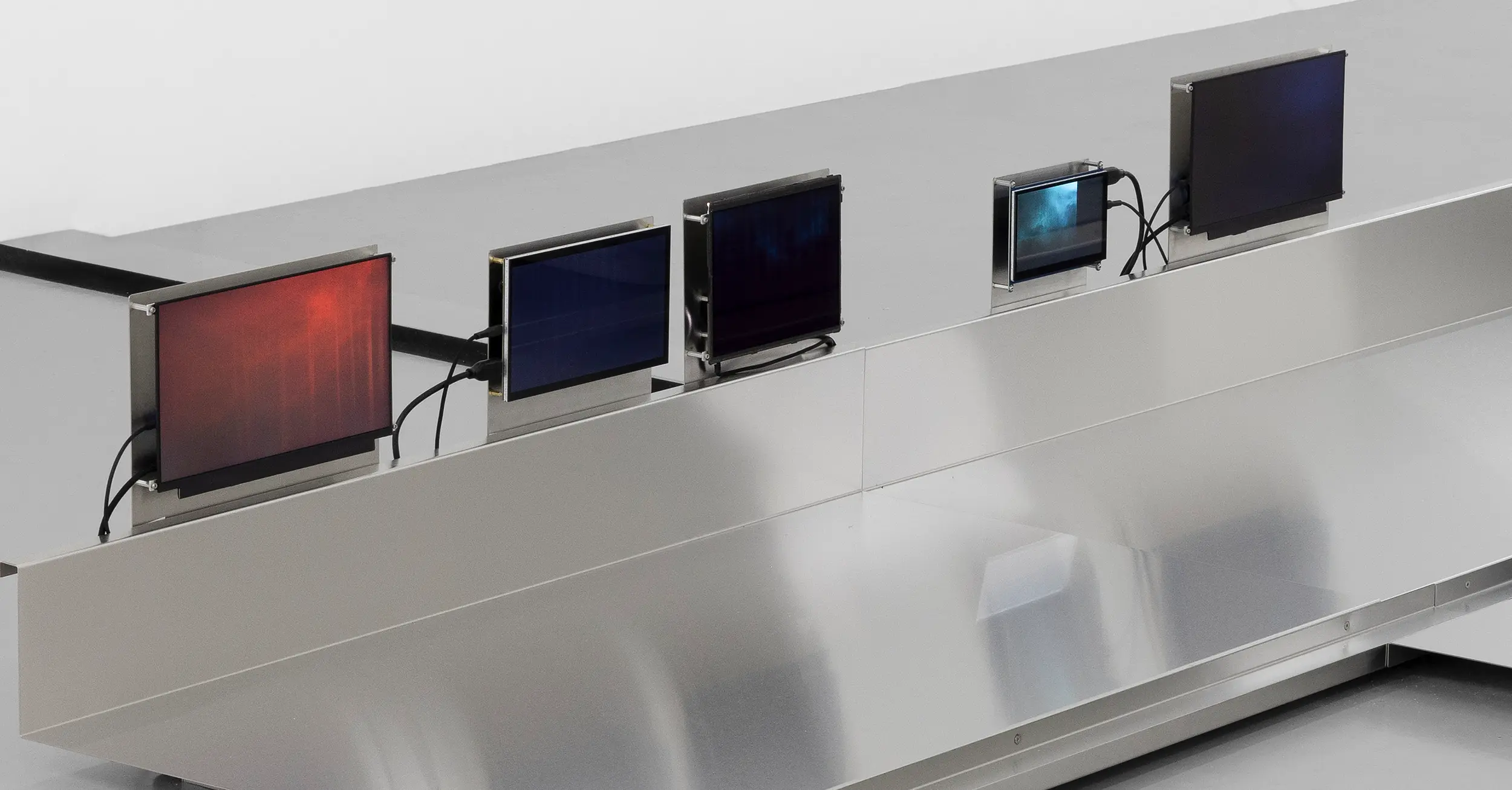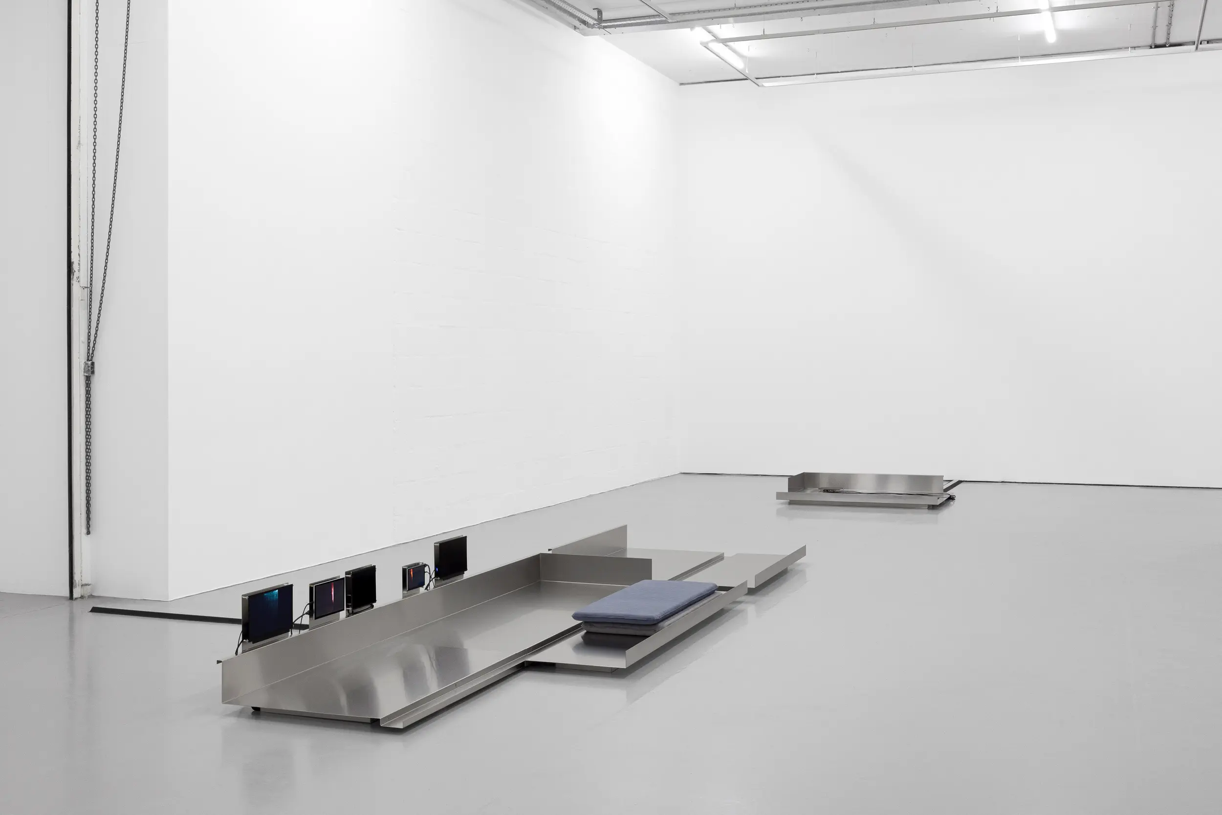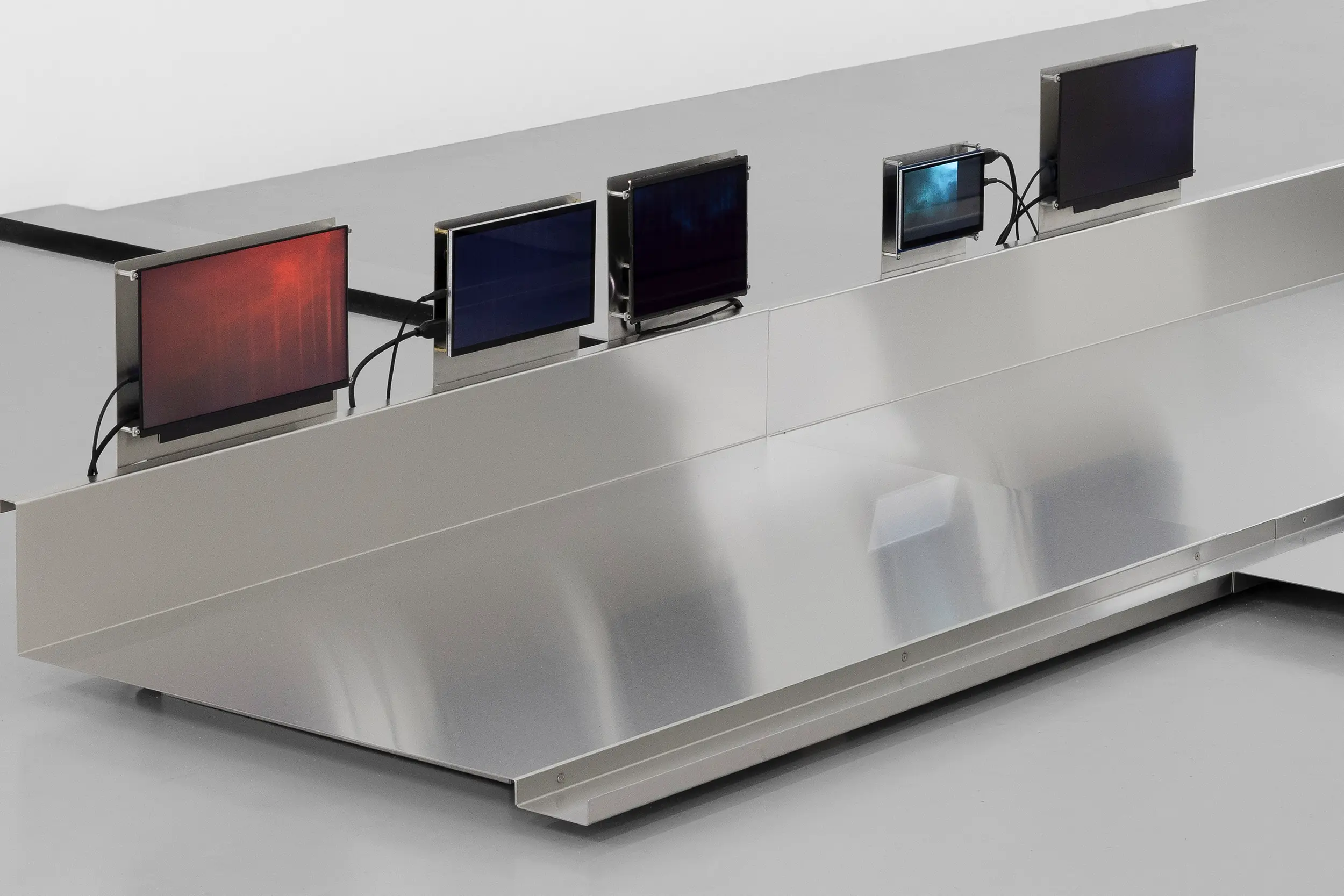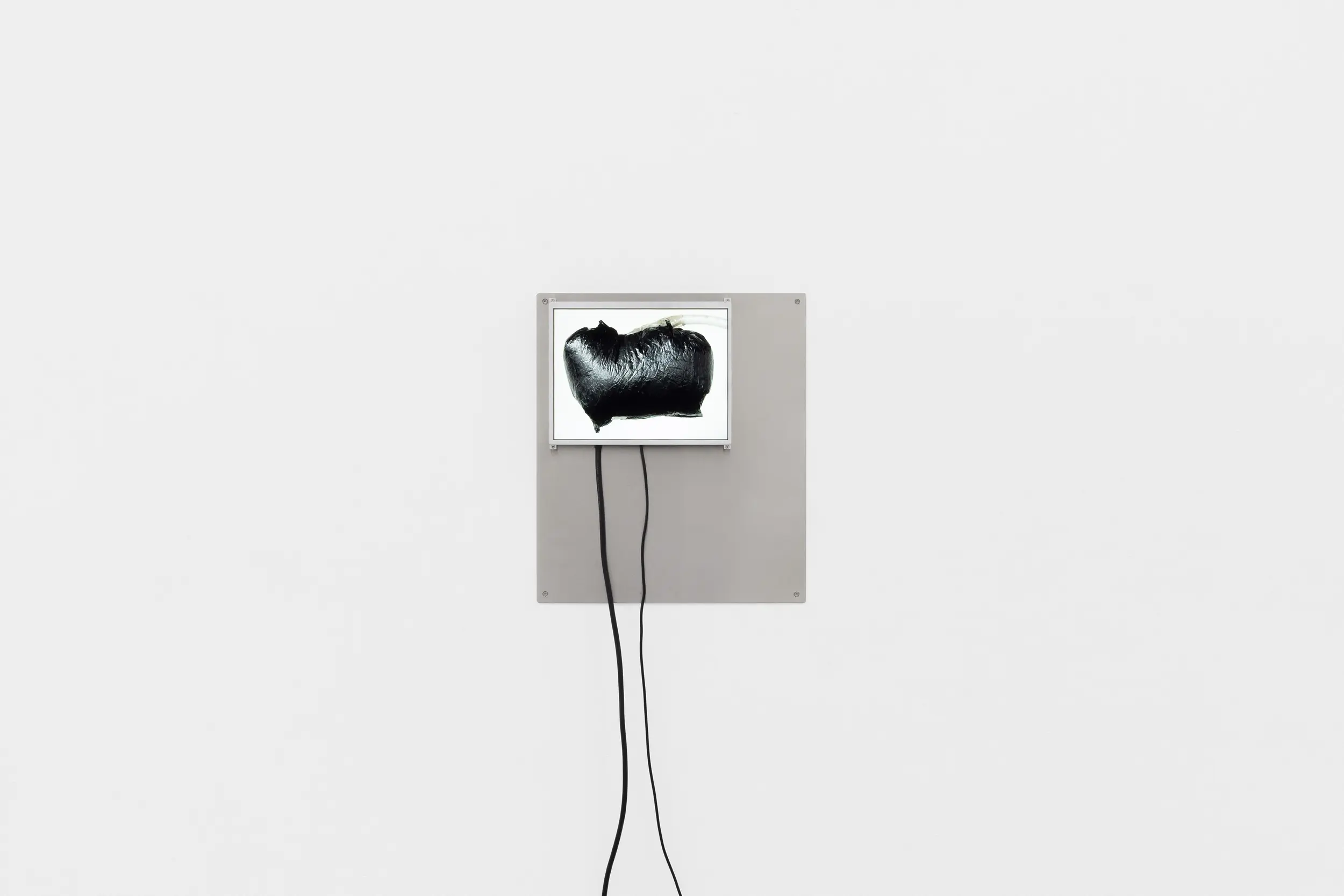 You think of the sculptures as offerings because the liquid rhythms of their material states are so often syncopated by recesses and receptacles. Yet even the remotest dimensions are somehow regularised. You consider that modularity of folded stainless-steel, with screens inset, as a tracking of interspersing temporalities. Reintroducing footage from a past work, here the materiality of time purls in the inherent transiency of its content. Segmented linearity is projecting recorded material of billowing vapours, its speeds behaving less for viewing than for functioning as its bracketed area defines its time. Delicately exposed cables tenderly relay the electrical energy. Those warm, slender tethers are coordinating footage of dissolvable and dissipative pyrotechnic smokes, flowing out, asynchronized, as blinking and moving images. Trailing the air, smokes rebegin from a picked-out spark. [...]