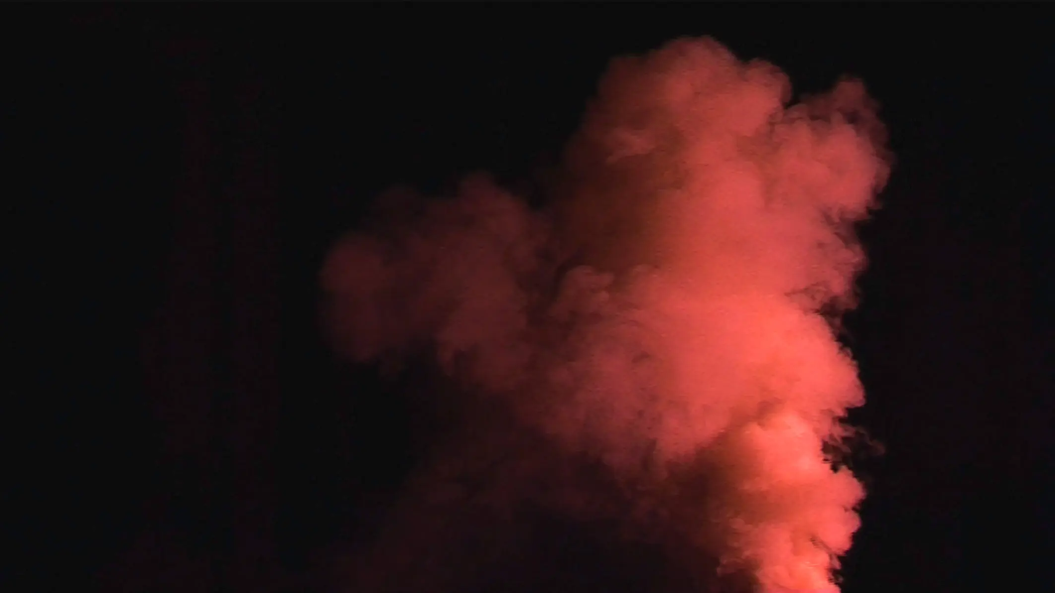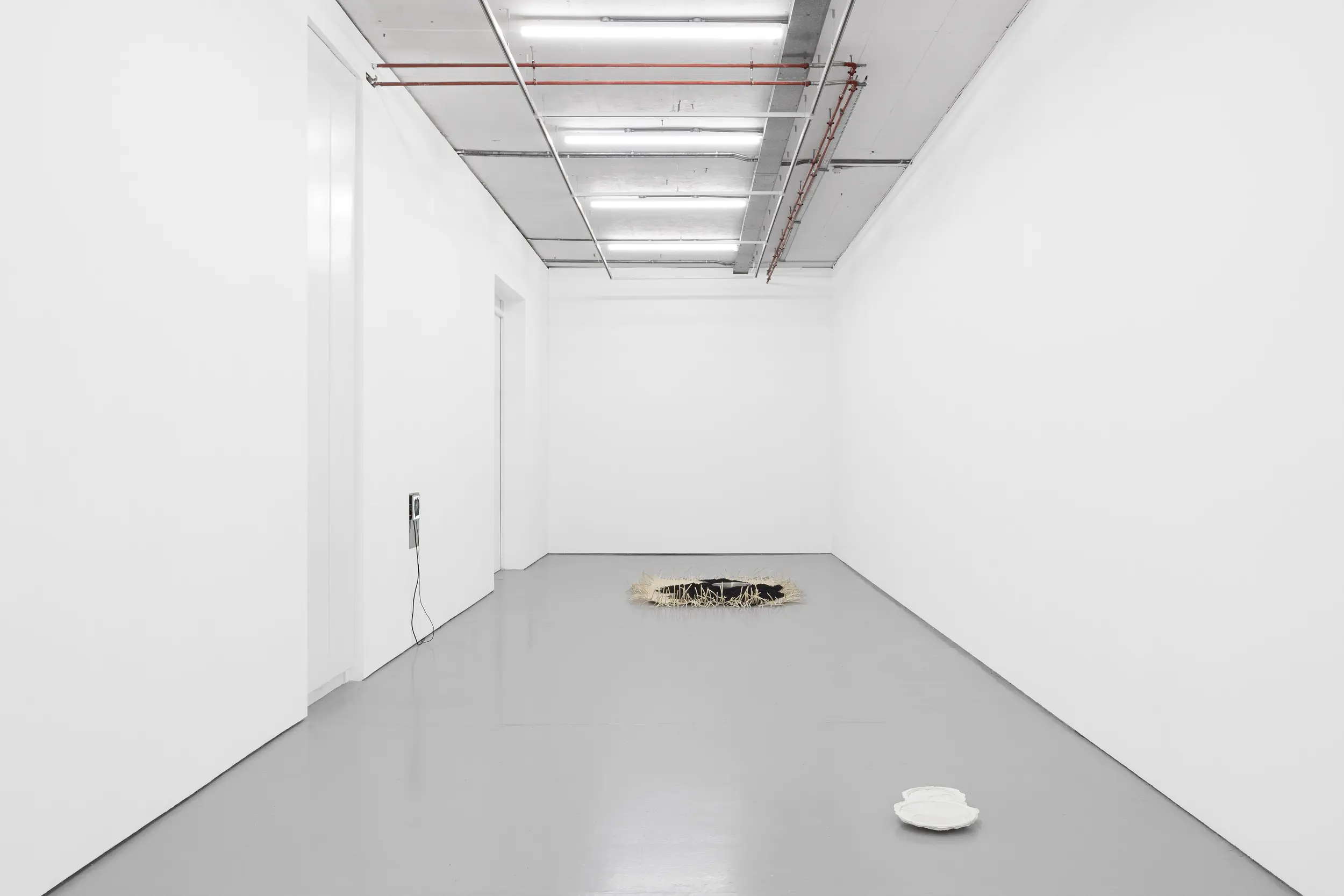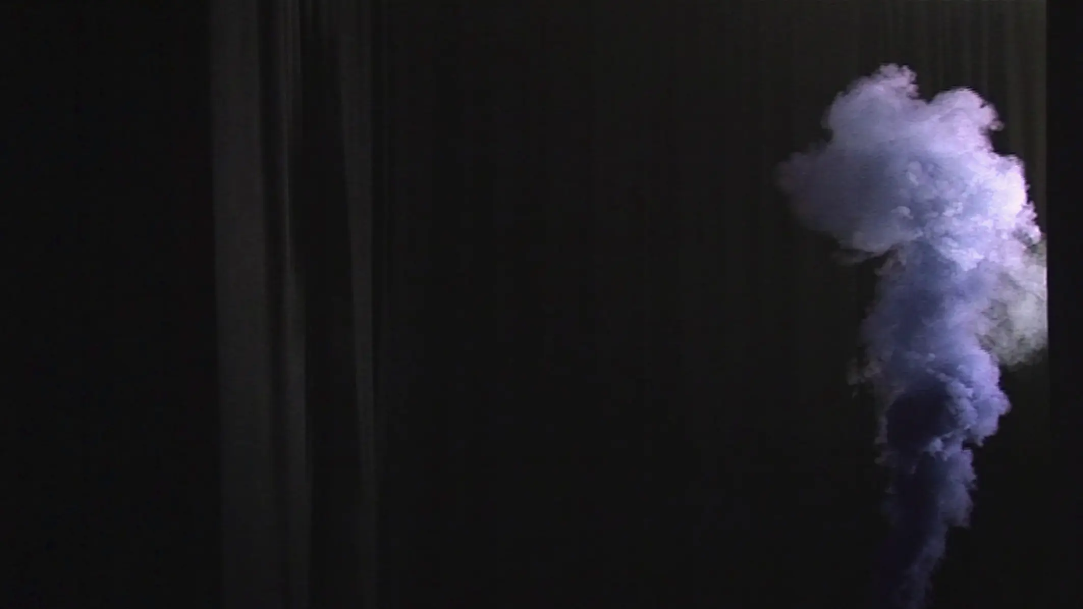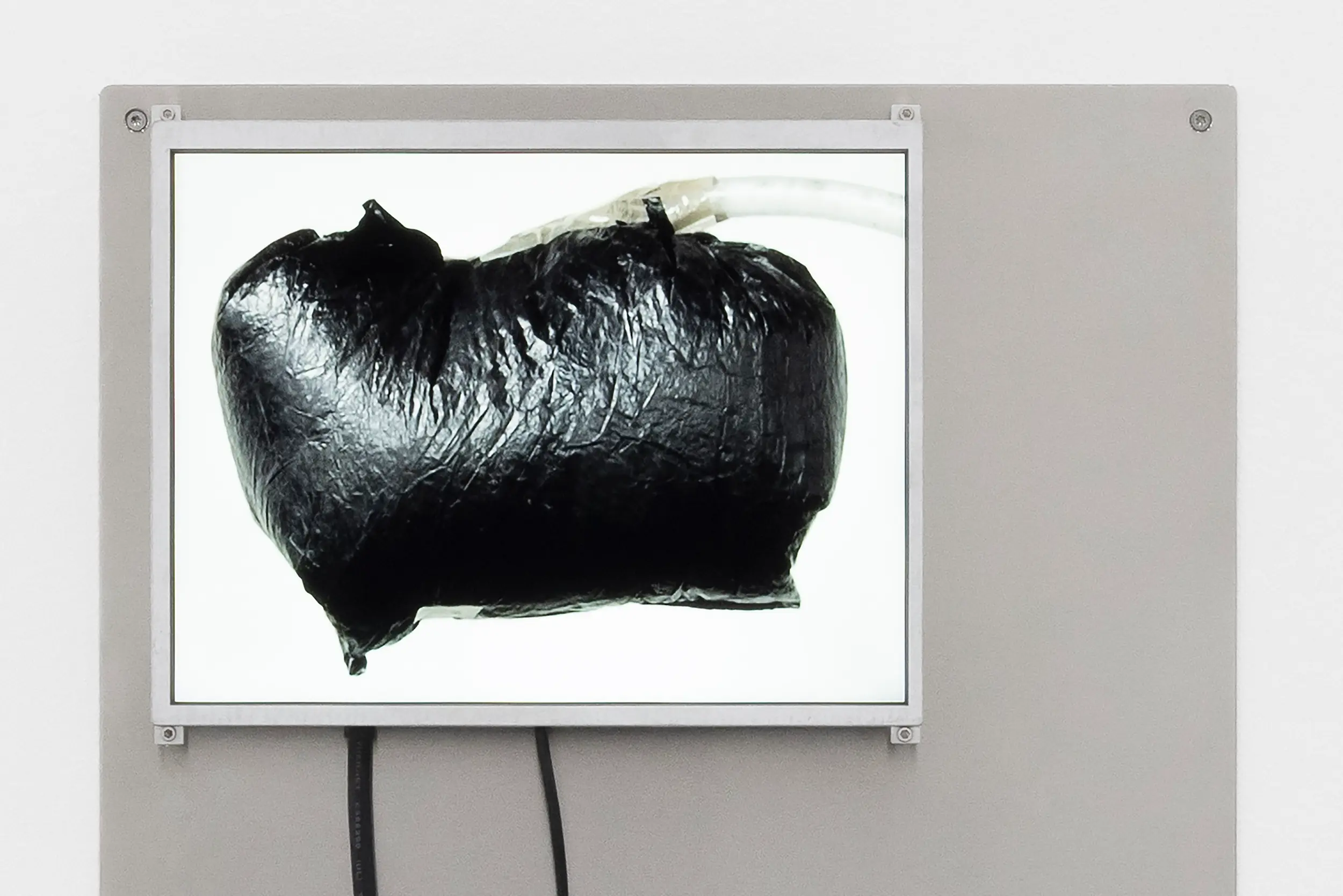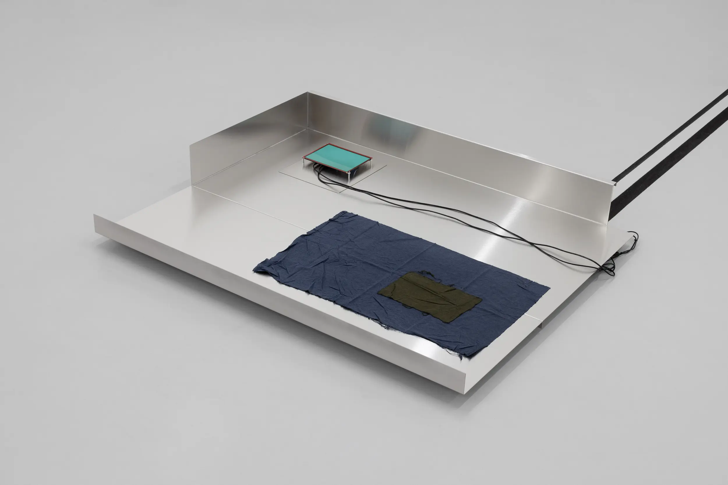 You think of the sculptures as offerings because the liquid rhythms of their material states are so often syncopated by recesses and receptacles. Yet even the remotest dimensions are somehow regularised. You consider that modularity of folded stainless-steel, with screens inset, as a tracking of interspersing temporalities. Reintroducing footage from a past work, here the materiality of time purls in the inherent transiency of its content. Segmented linearity is projecting recorded material of billowing vapours, its speeds behaving less for viewing than for functioning as its bracketed area defines its time. Delicately exposed cables tenderly relay the electrical energy. Those warm, slender tethers are coordinating footage of dissolvable and dissipative pyrotechnic smokes, flowing out, asynchronized, as blinking and moving images. Trailing the air, smokes rebegin from a picked-out spark. [...]