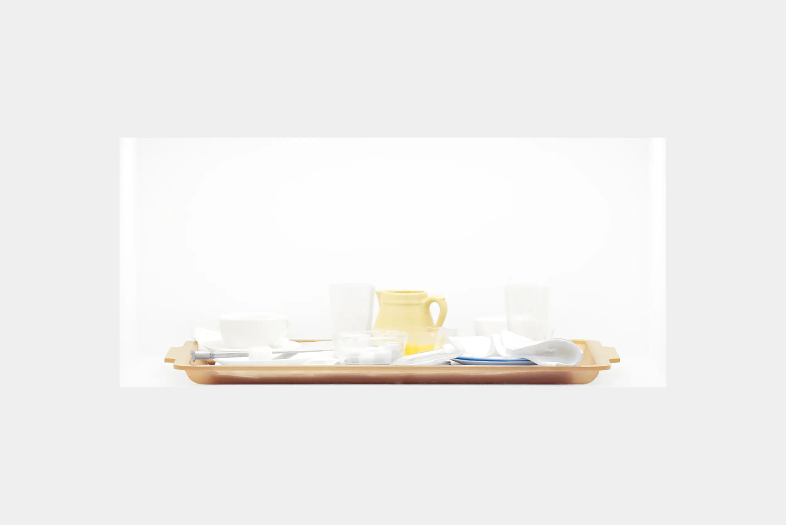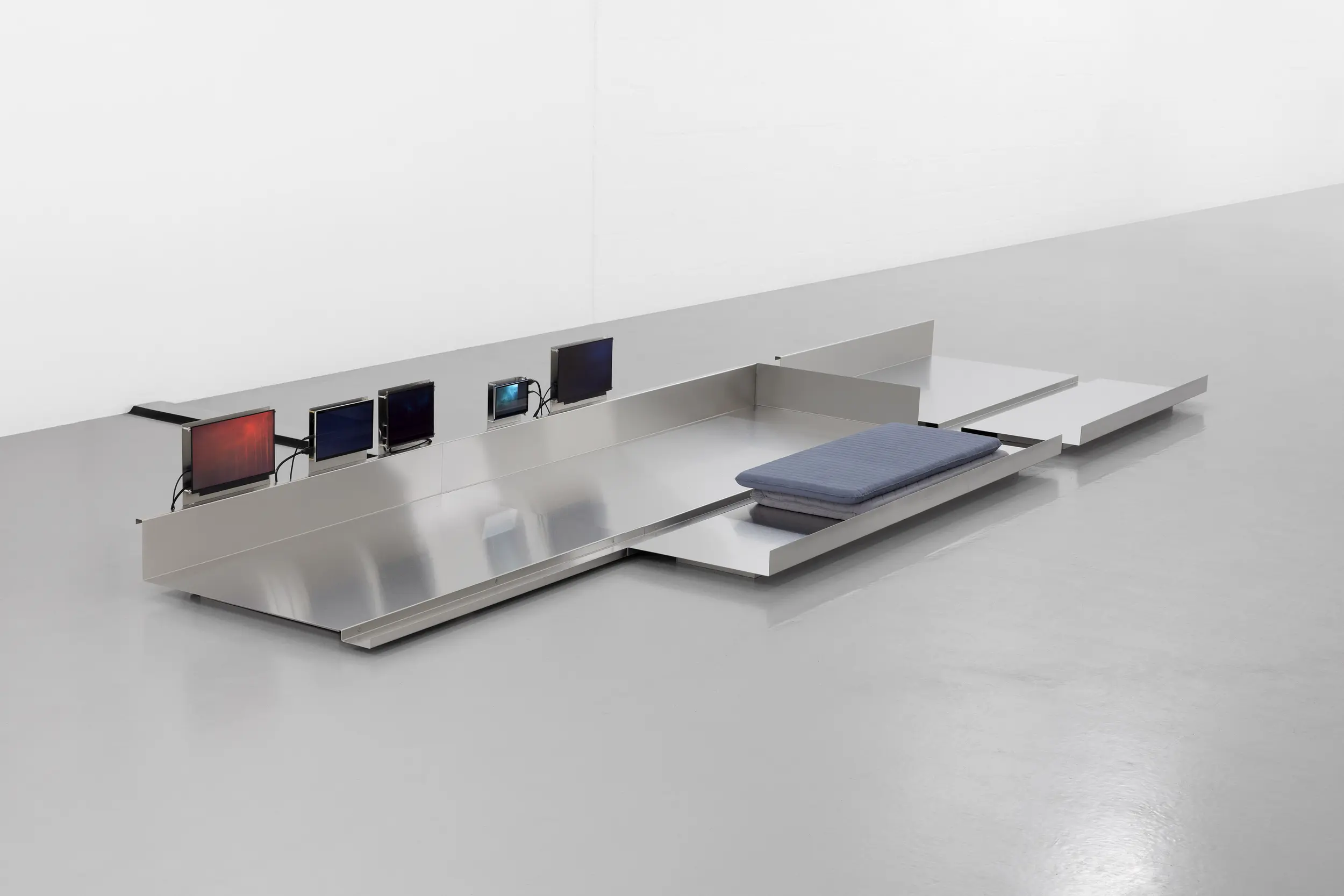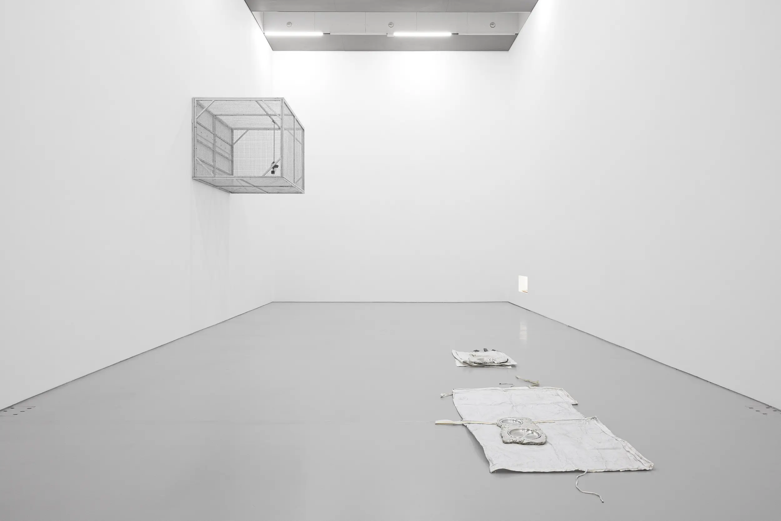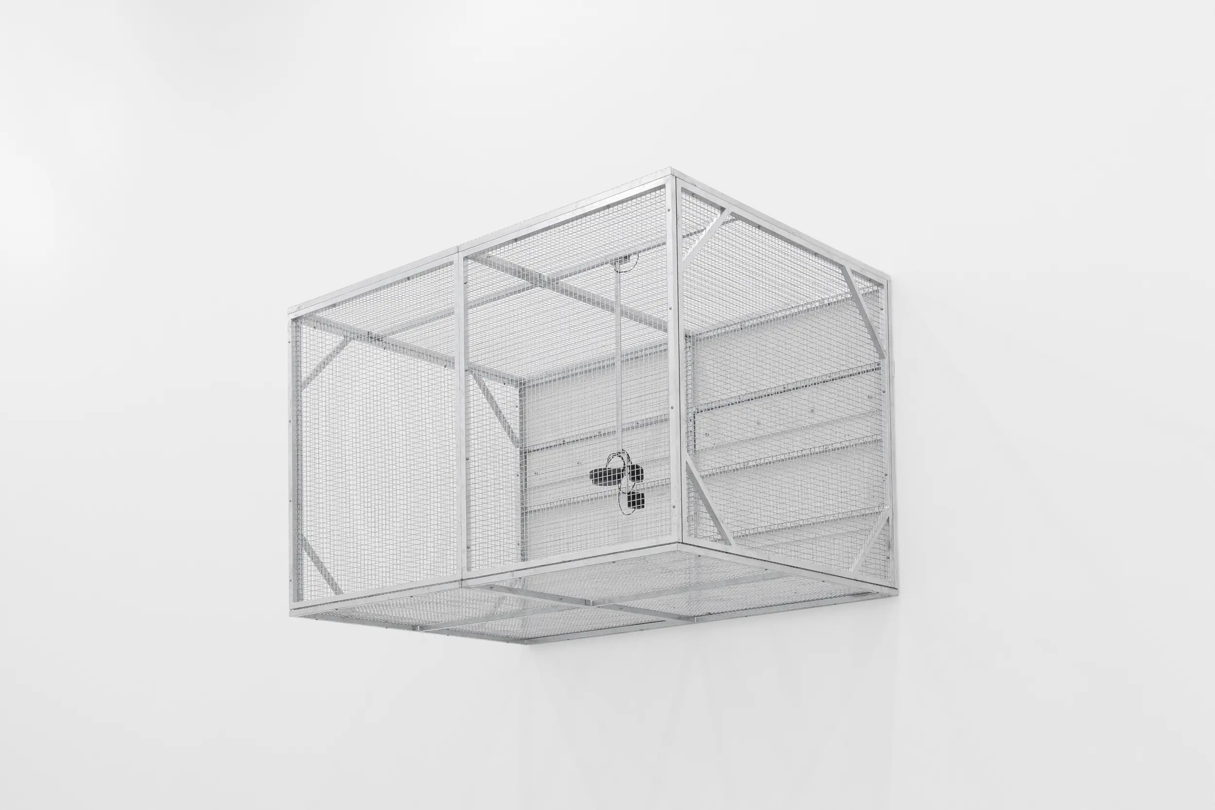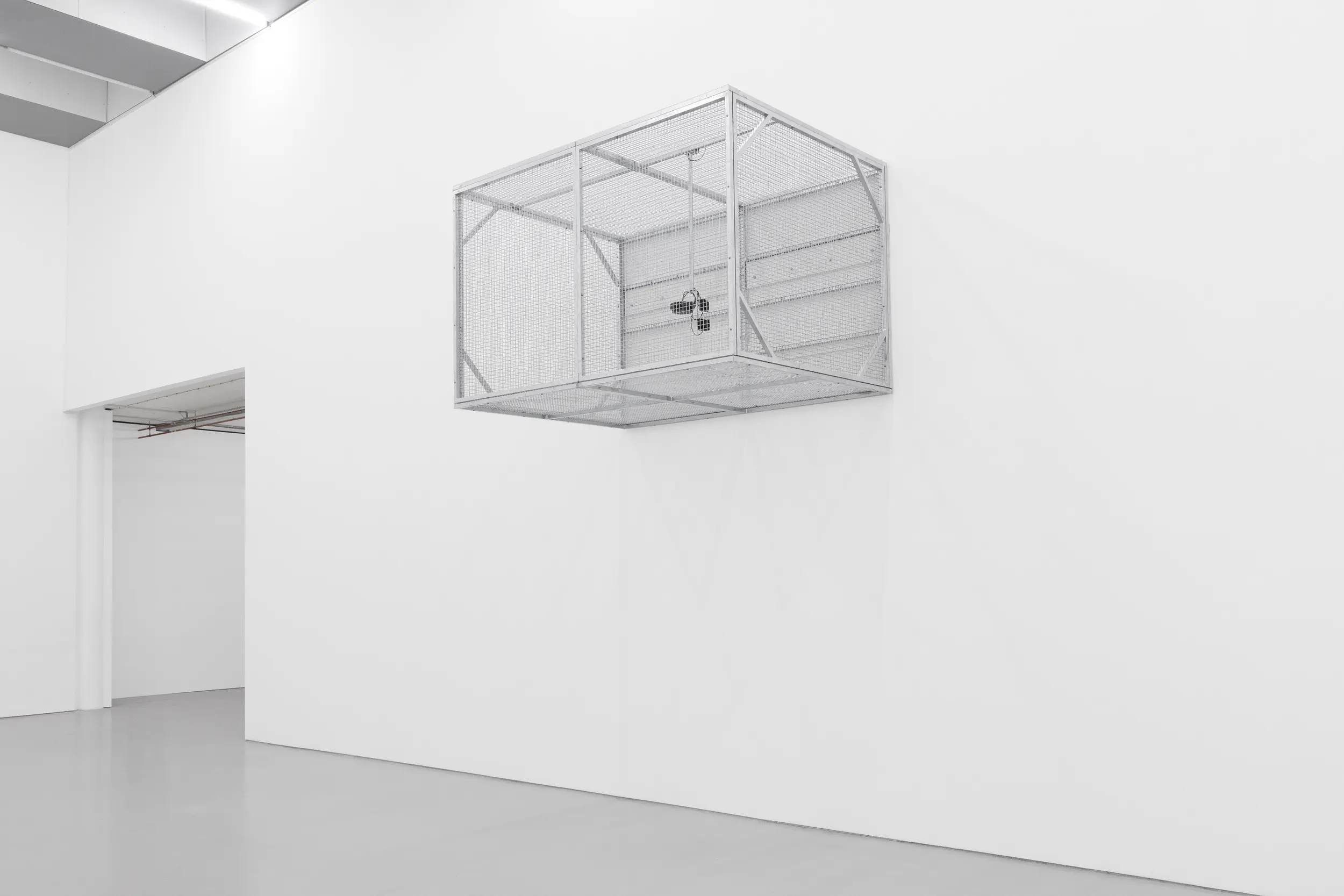 At Spike Island, Lai focuses on objects that denote containment: trays, dishes and receptacles that typically carry food or water, as well as larger vessels like cages that might hold bodies. A cage-like enclosure is installed in the central gallery. Suspended high off the ground, its galvanised metal form is loosely inspired by urban infrastructure, such structures that hold monitoring and signalling equipment. A spectral sonic element pulses through the air, a machinic rhythm that echoes Spike Island’s industrial past.