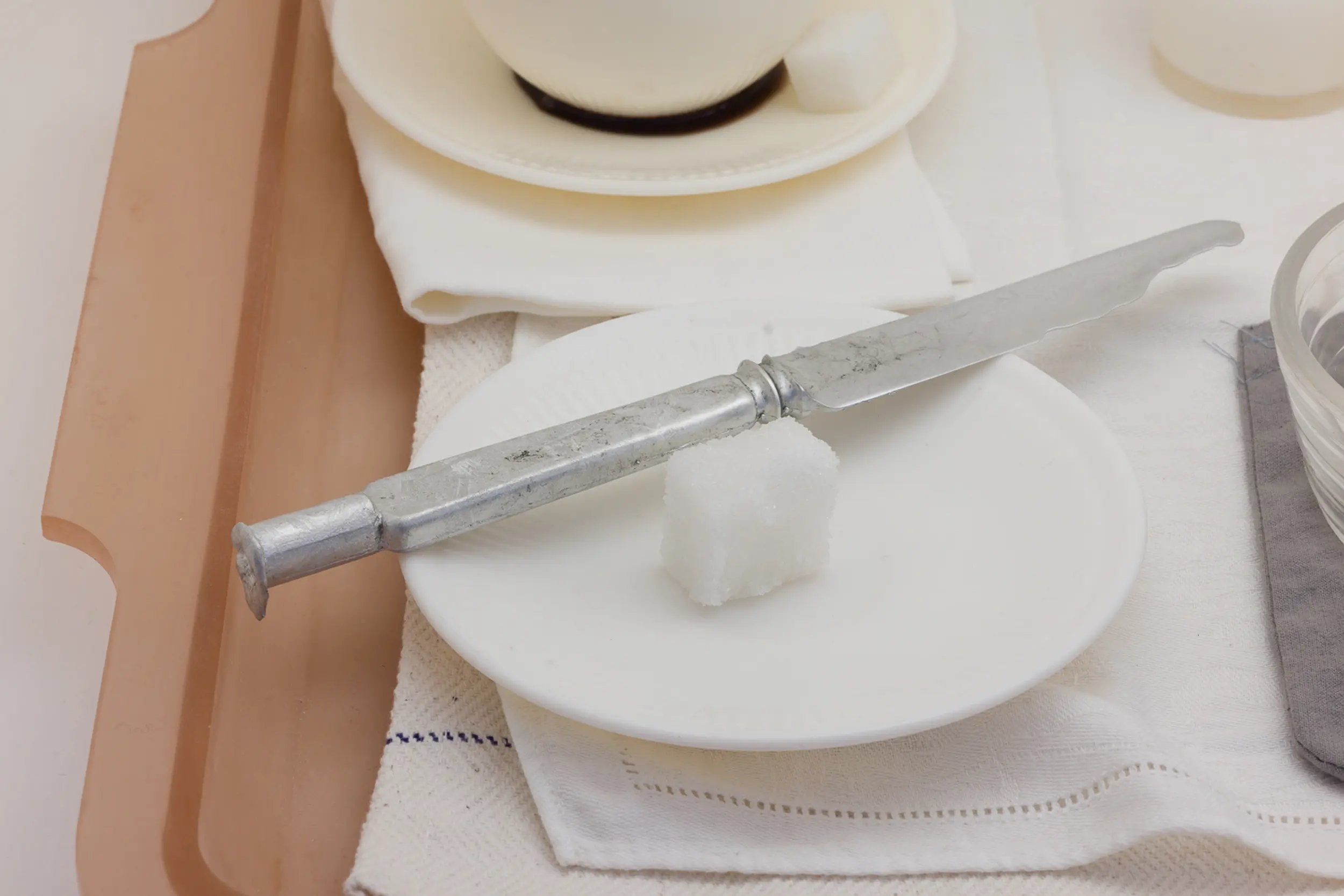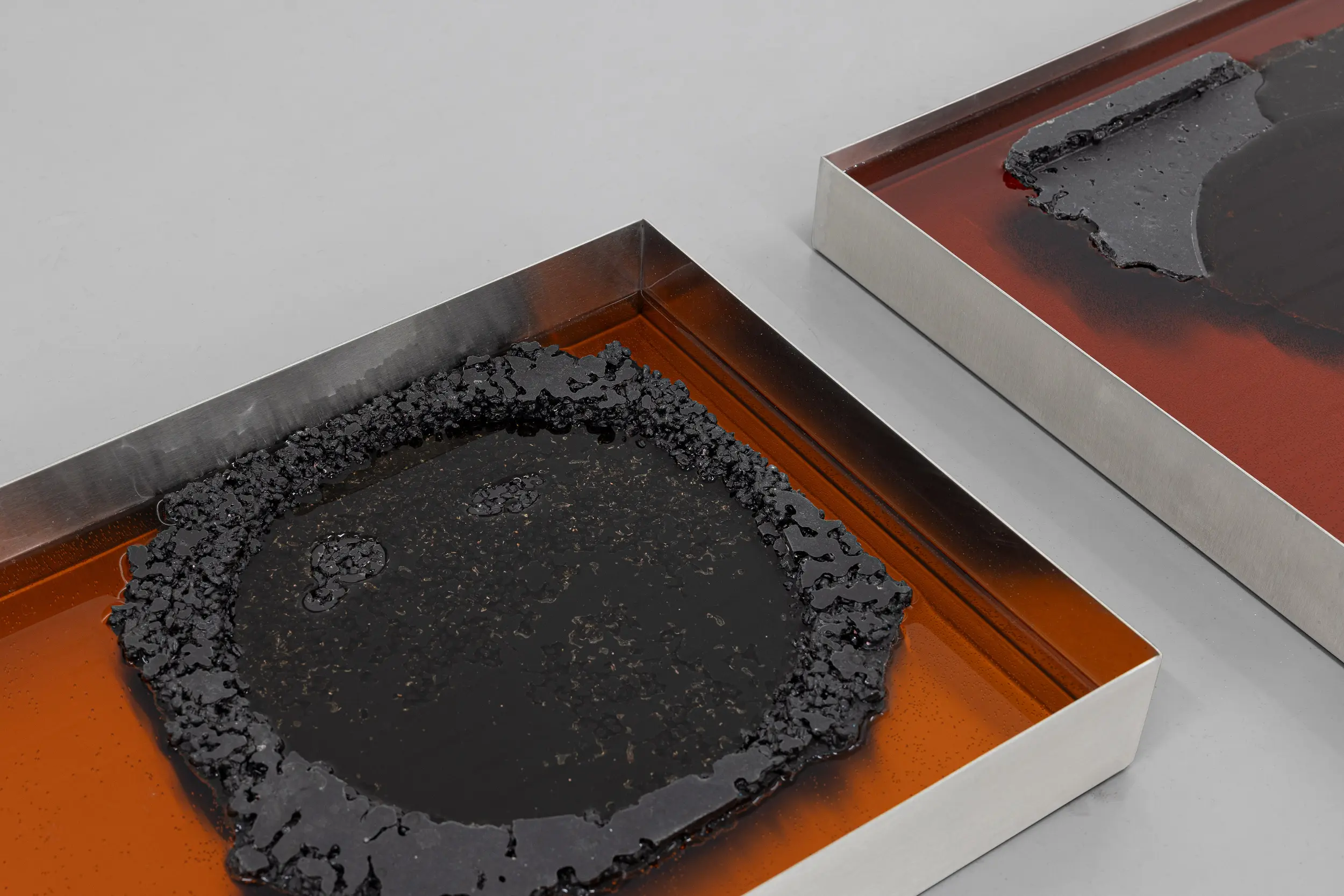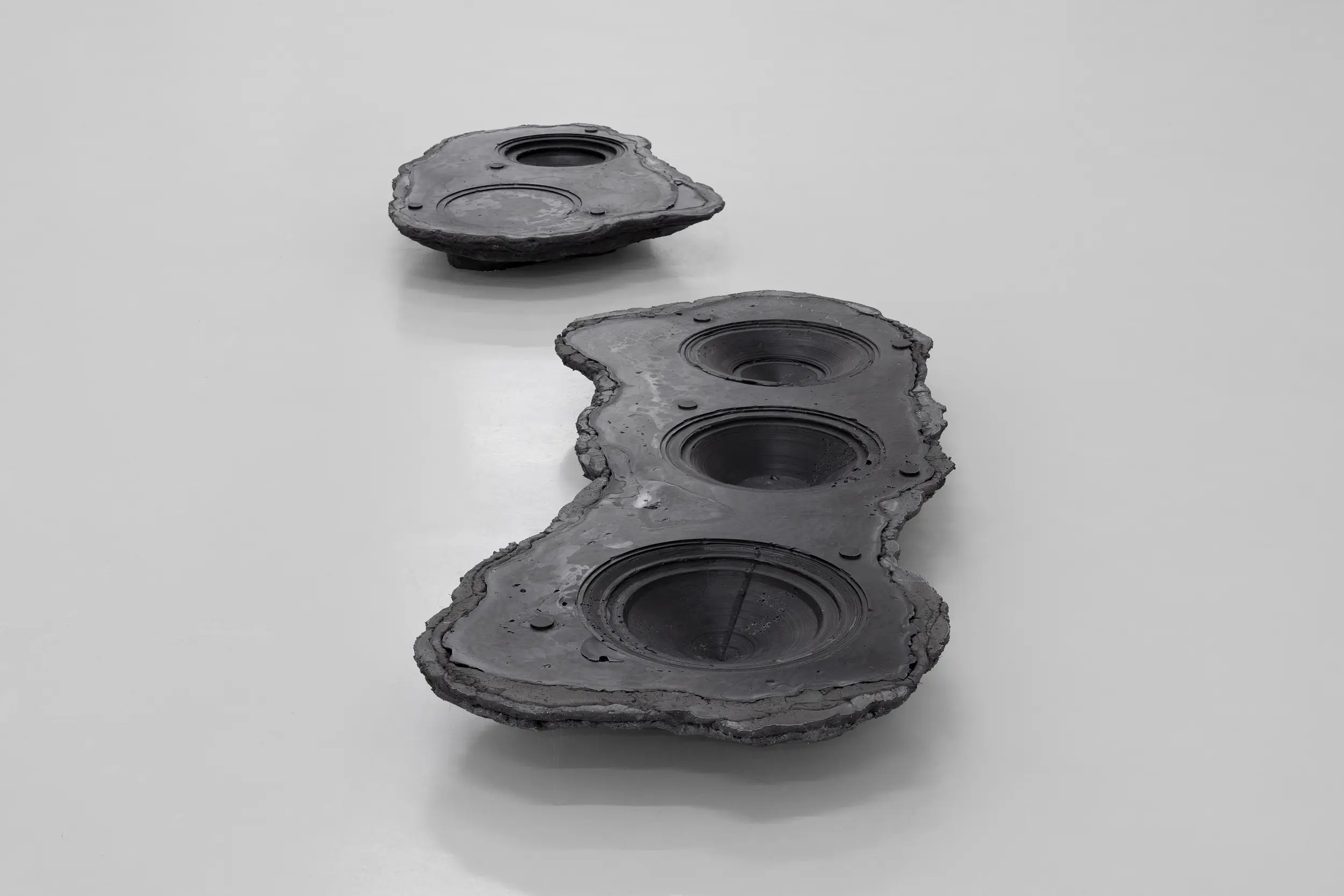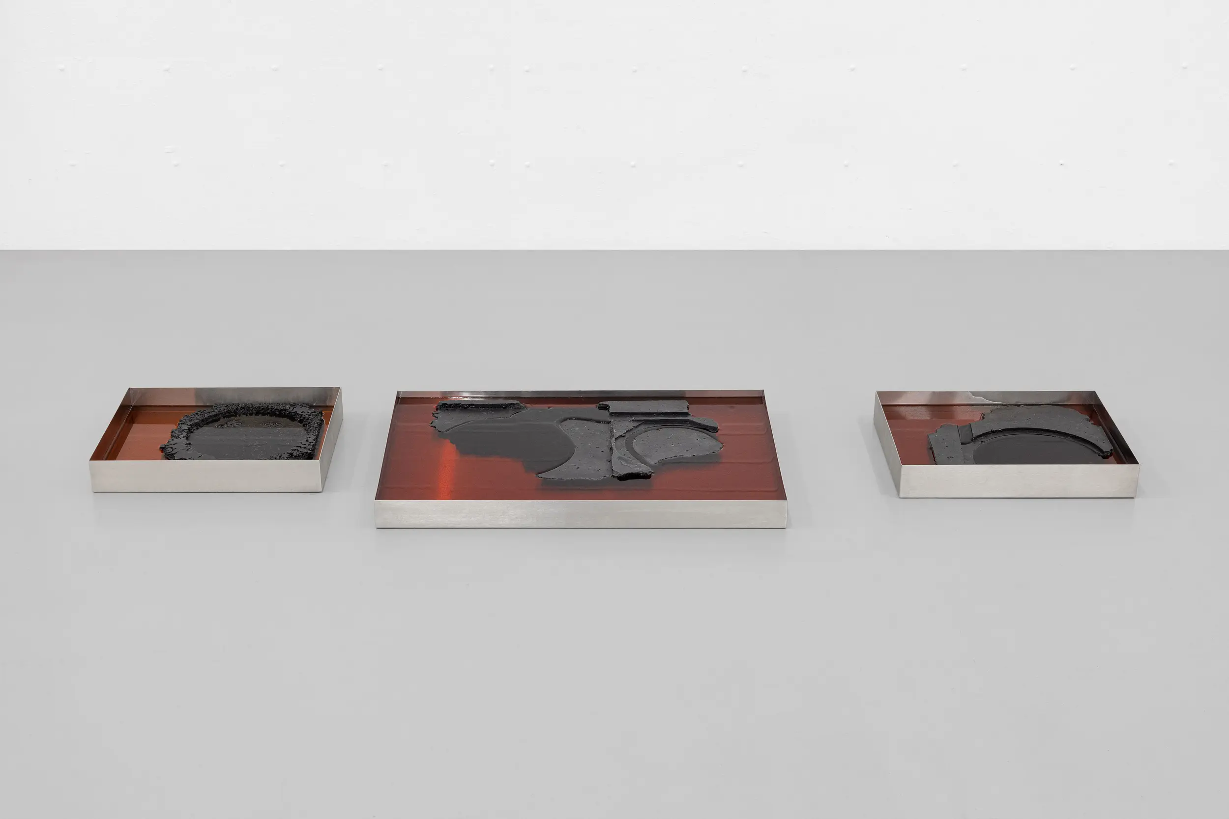 The sculptures feel anonymous and transient, located in a zone where time and space feel out of joint. Within this interplay of forms, notions of the proximal and the remote, the sacred and the profane, and of surplus, excess and destruction are quietly held in tension. Made using varied materials such as wax, stainless steel, concrete, resin and burnt wheat, each sculpture represents the crystallisation of many attentive processes, often involving multiple castings. The intricacy of their construction belies the simplicity of their final form.