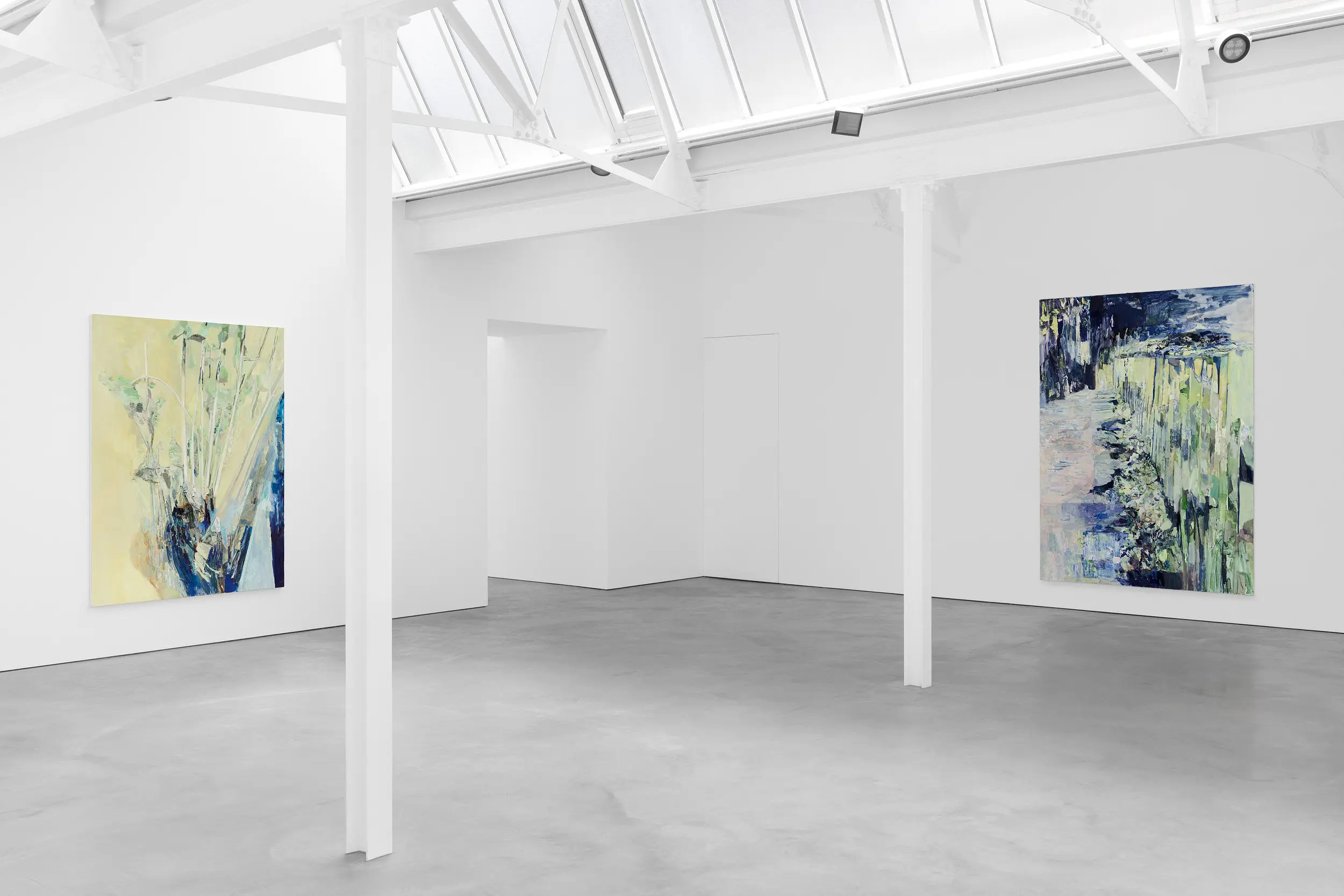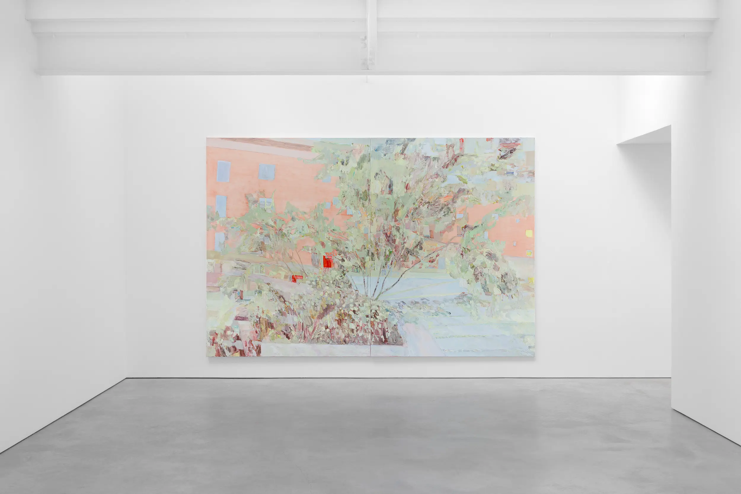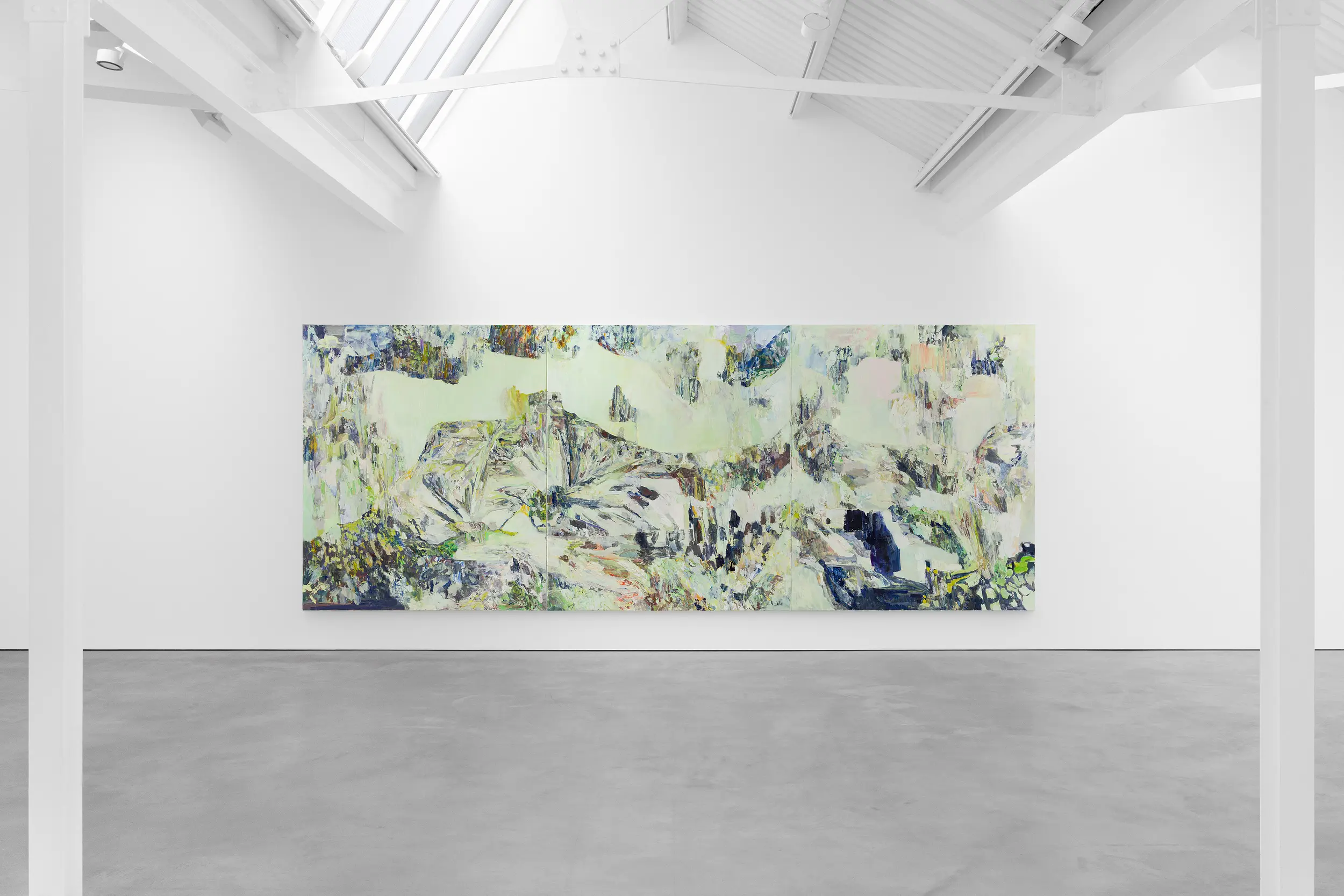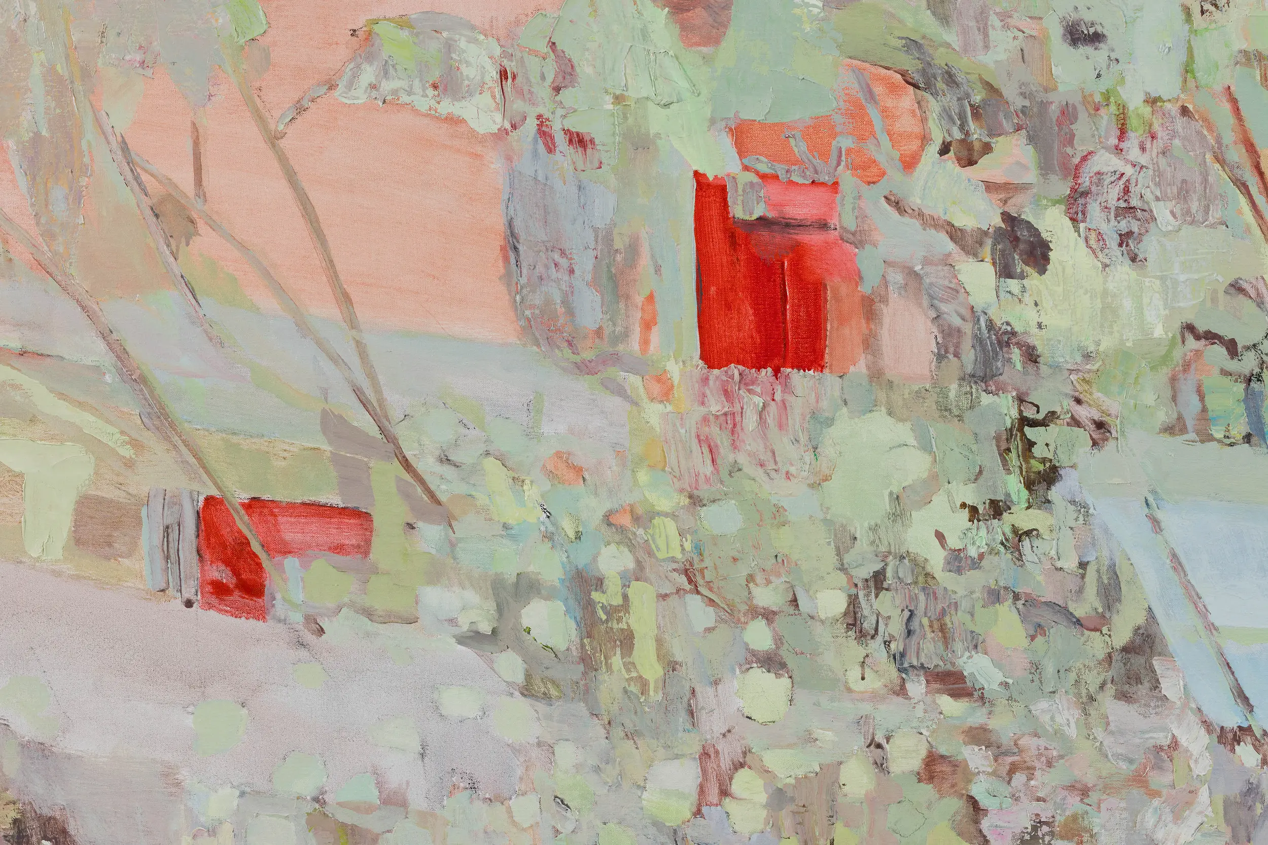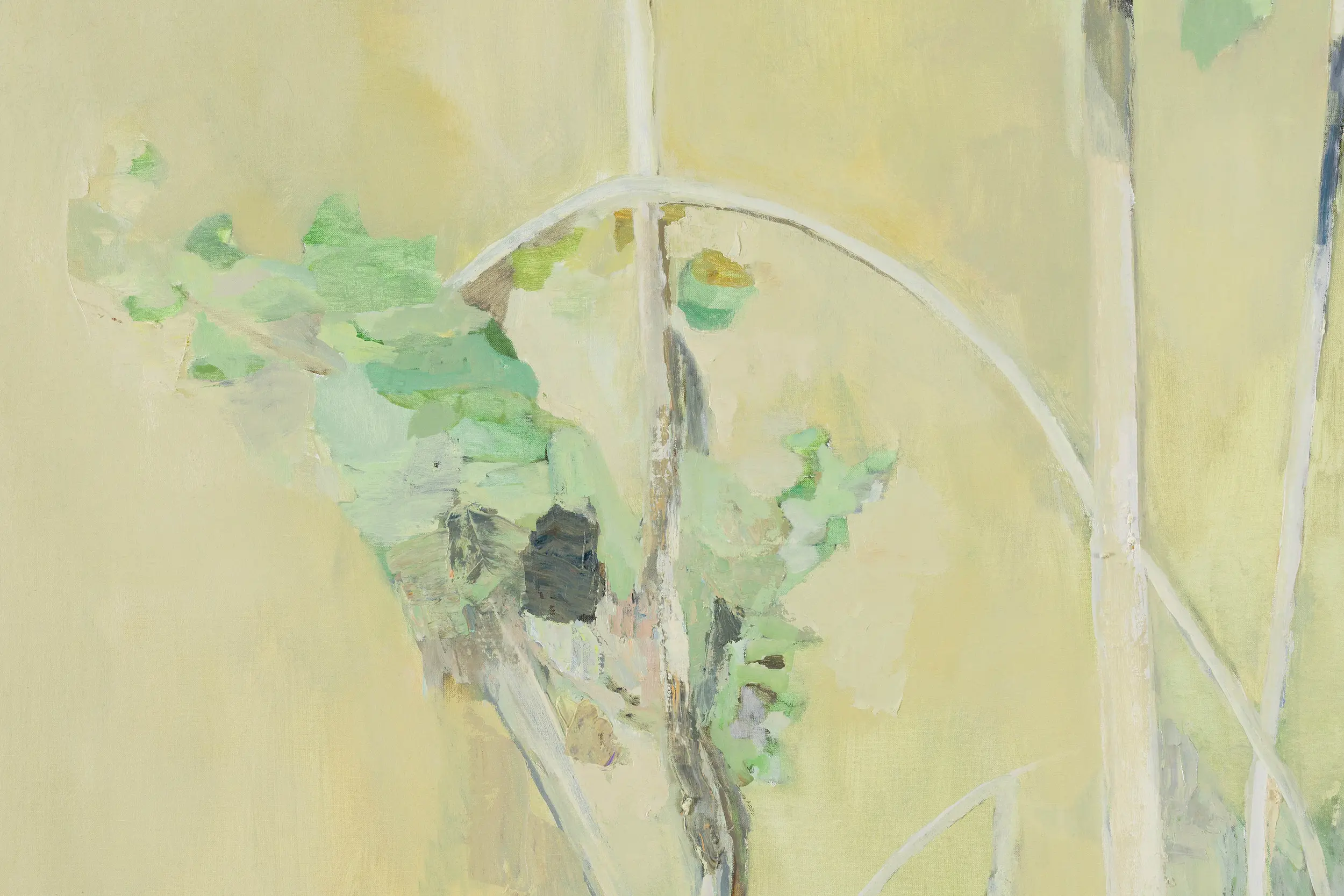 A glimmering restlessness is created in Sous-bois, drawn from the crossover between two sources of light – the bulbs of street lamps and the dying daylight at dusk – and the particular shades of green that they generate as they fall on the foliage of a plant, weaving through the bands of a mint-painted fence. Meaning ‘under the trees’ or ‘undergrowth’, Sous-bois is a title that was given to paintings by Cezanne and Van Gogh and has come to refer to a sub-genre of Impressionist painting made in-situ within woodland interiors. Depicting scenes encapsulated within nature, these ‘landscapes’ became vertical, close and intimate. In Francesca’s Sous-bois, vegetative growth and death spill through the slats of a partition fence and accumulate in a dense wreath-like channel on the ground. Despite the earthward aspect, this painting is filled with sky, reflected in the surfaces of thing looked down upon, so that the tangled leaves and flowers become mirrors or lights or holes.
