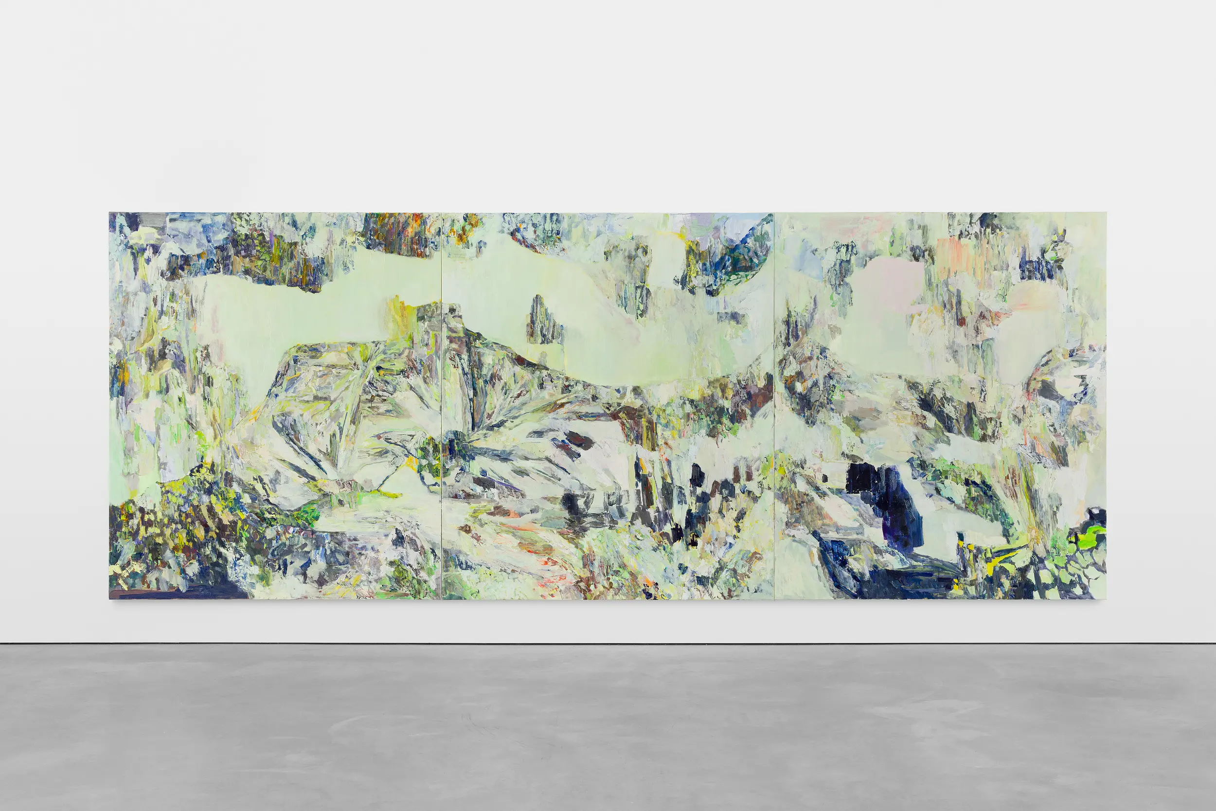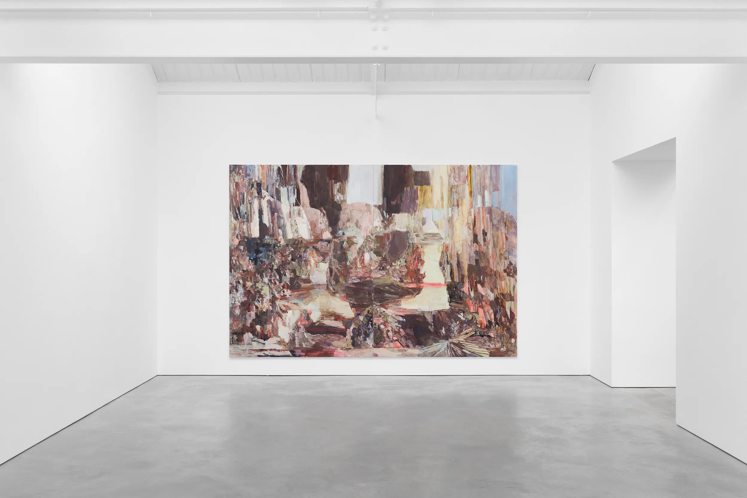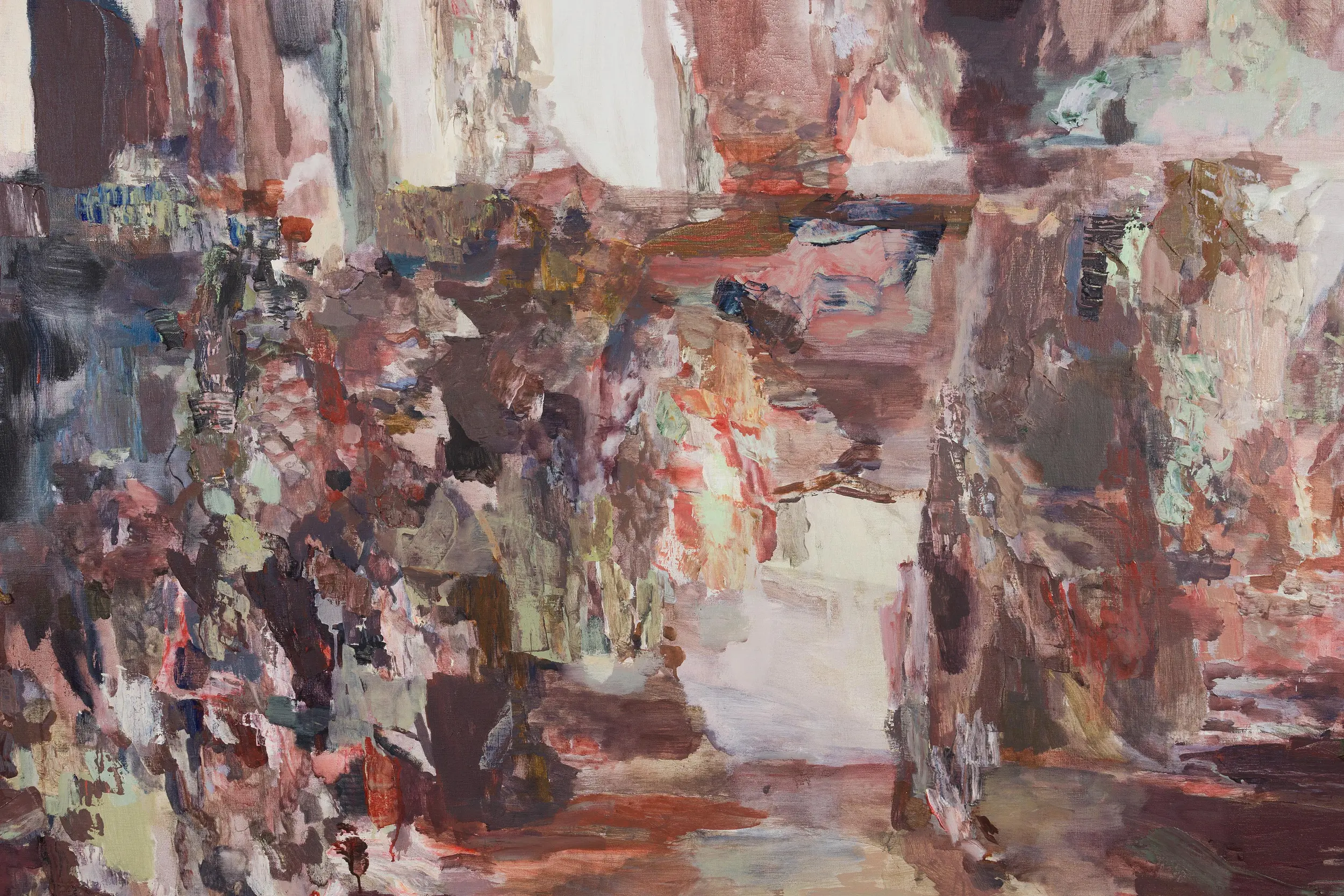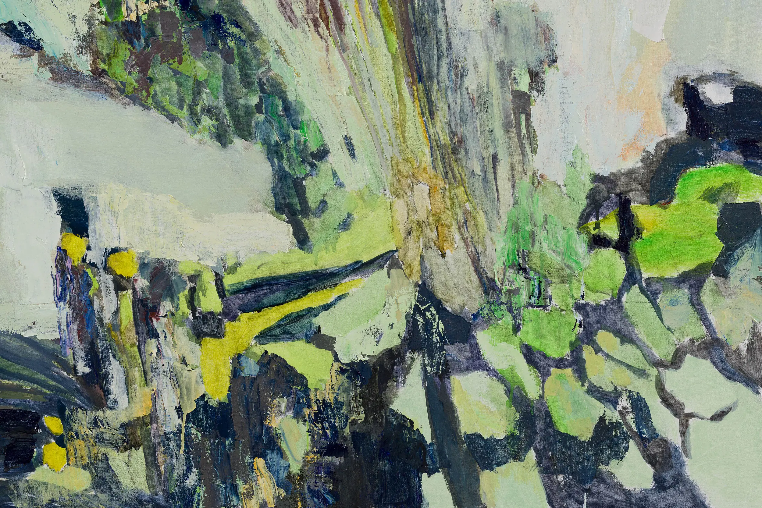 Part of Francesca’s process is creating a balance of context and detail – of giving what is needed compositionally for something to operate or ignite. Afterall, to unsettle, something first needs to be settled. Paint becomes a live matter that she uses to lay down her image and find within in it an activating essence for self-destabilisation. A problem quality, a latent energy, ready to turn or move, through which the painting can emerge as something new. Her compositions begin as momentary frames that slip over time as the image operates in and through the painting. As she works, Francesca oscillates away from and back to her original visual catalyst; moving between a focused search for a substitute for this dynamic quality in paint, and allowing it the freedom to move and generate. Echoing elemental processes of reconfiguration, the paintings open up the possibilities of her subjects through abstraction. By taking them to pieces and piecing them together she finds new chains of connection, new patterns of becoming, so that the final paintings reveal a collaged temporality, containing traces of and pathways to previous and potential states.