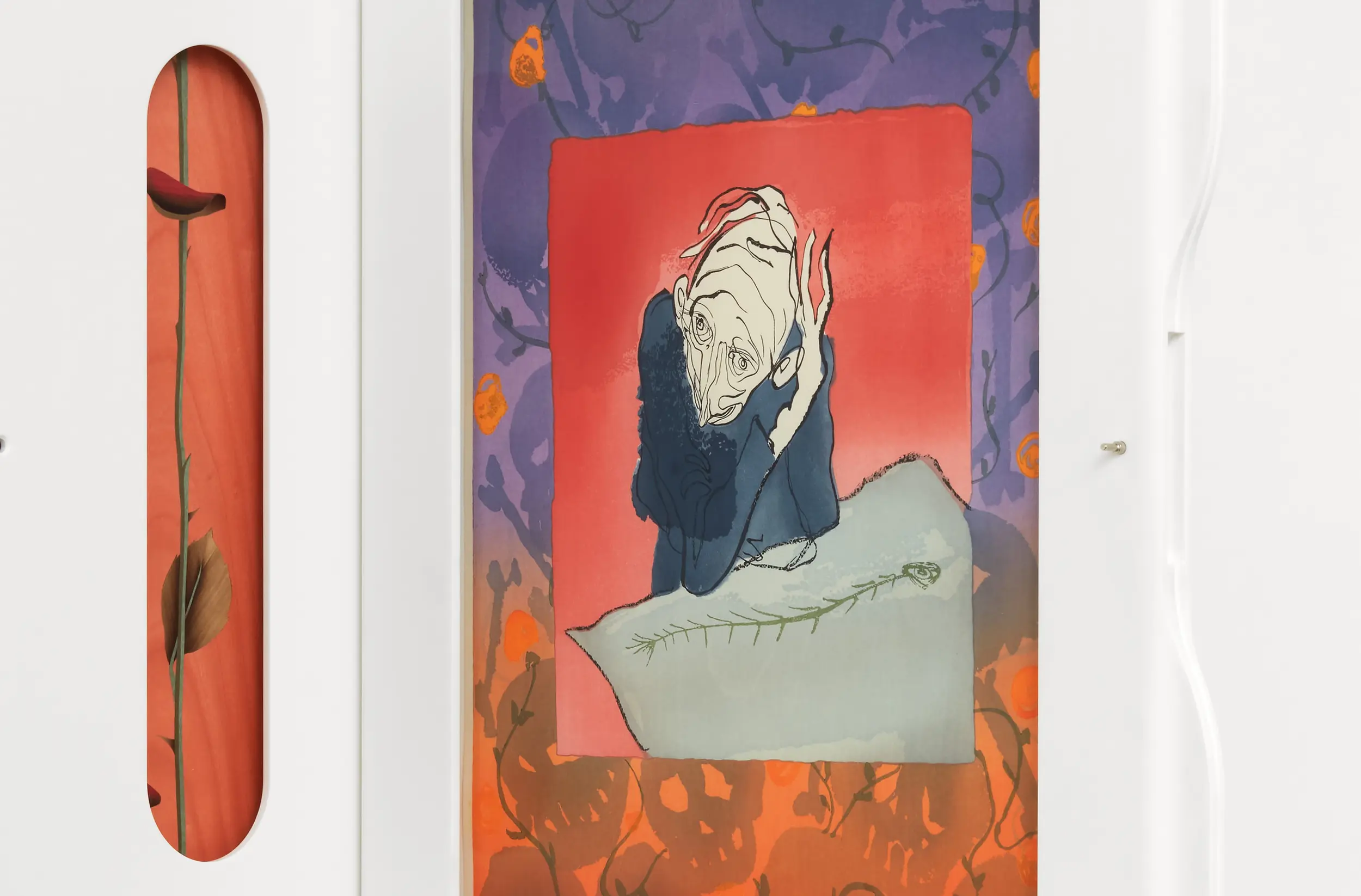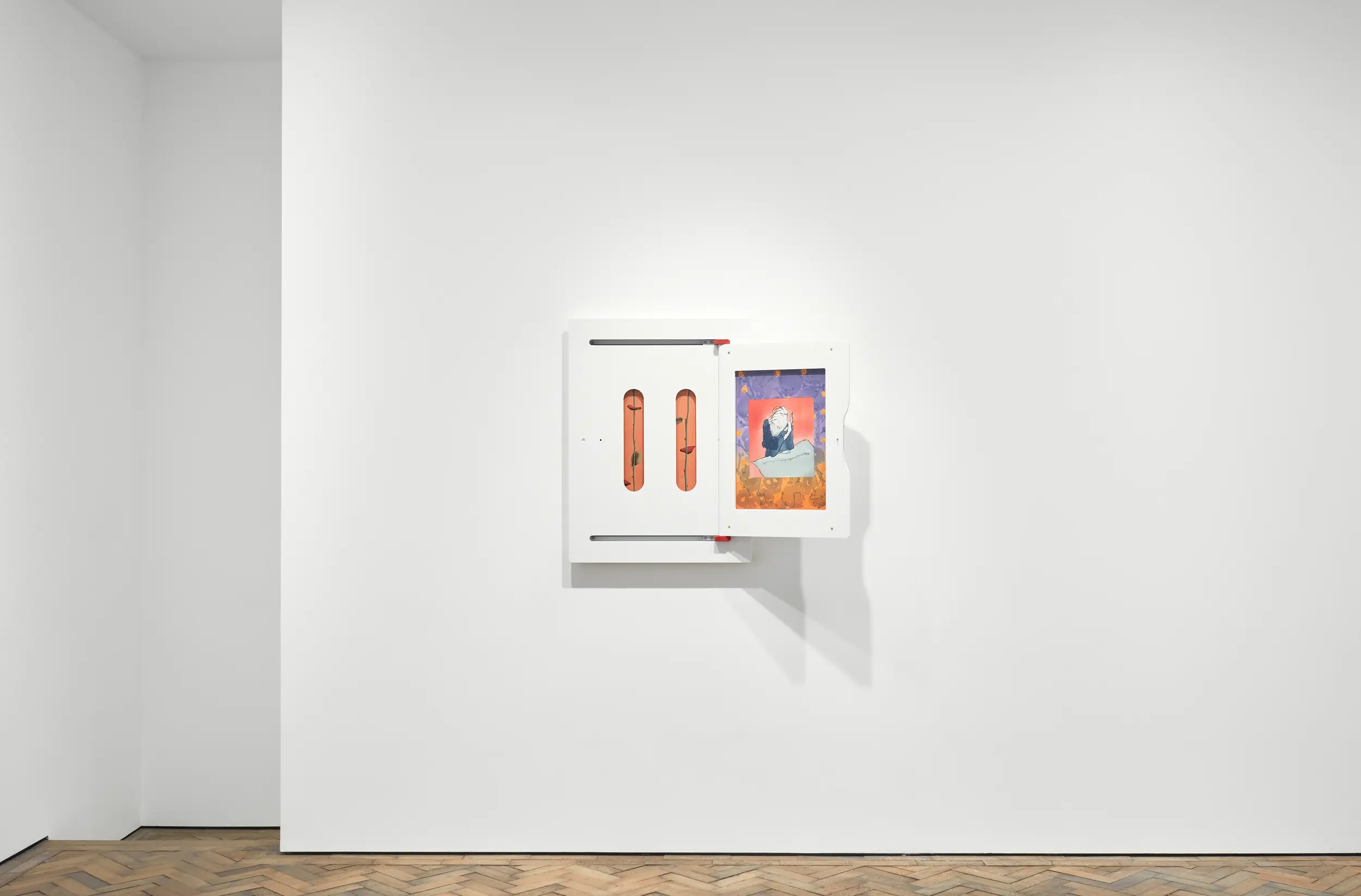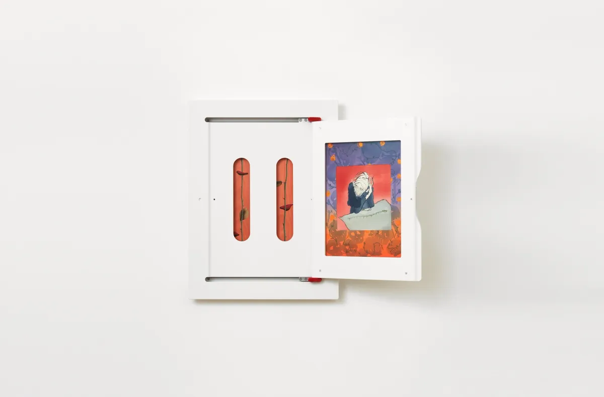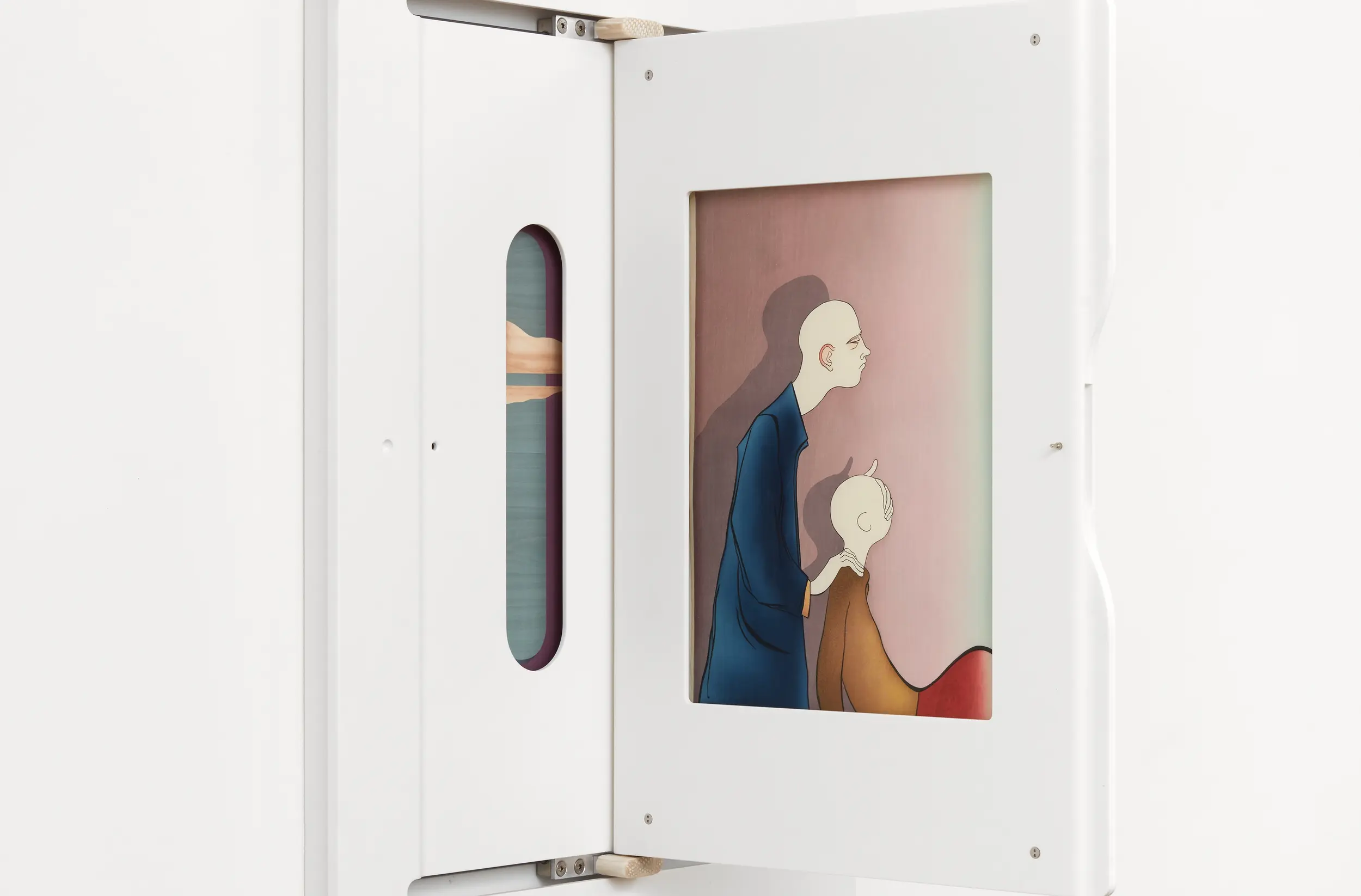 While visiting Japan between 2018 and 2019, Kantarovsky developed an edition of traditional Ukiyo-e woodblock prints together with the Adachi Hanga Institute of Printmaking in Tokyo. Here, Kantarovsky’s prints are housed individually in frames fabricated out of Corian by Camille Blatrix. The frames are embedded with handcrafted wood marquetry pieces, each decorative element responding to the prints they encase. Reminiscent of bivalve shells, the frames are designed with revolving exterior faces, offering optional protection or exposure throughout the course of the exhibition.
