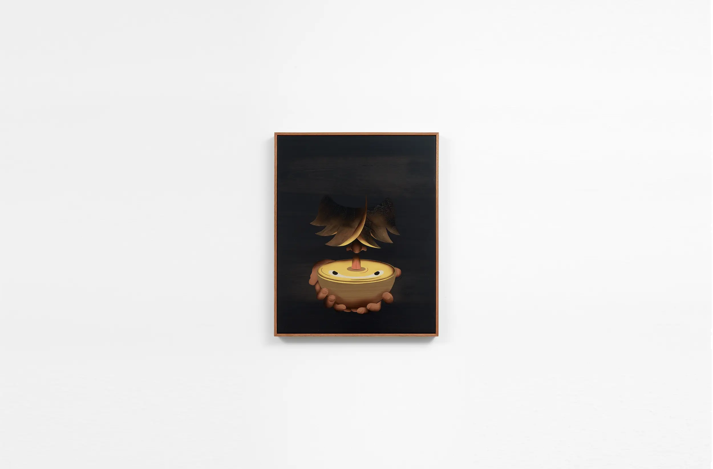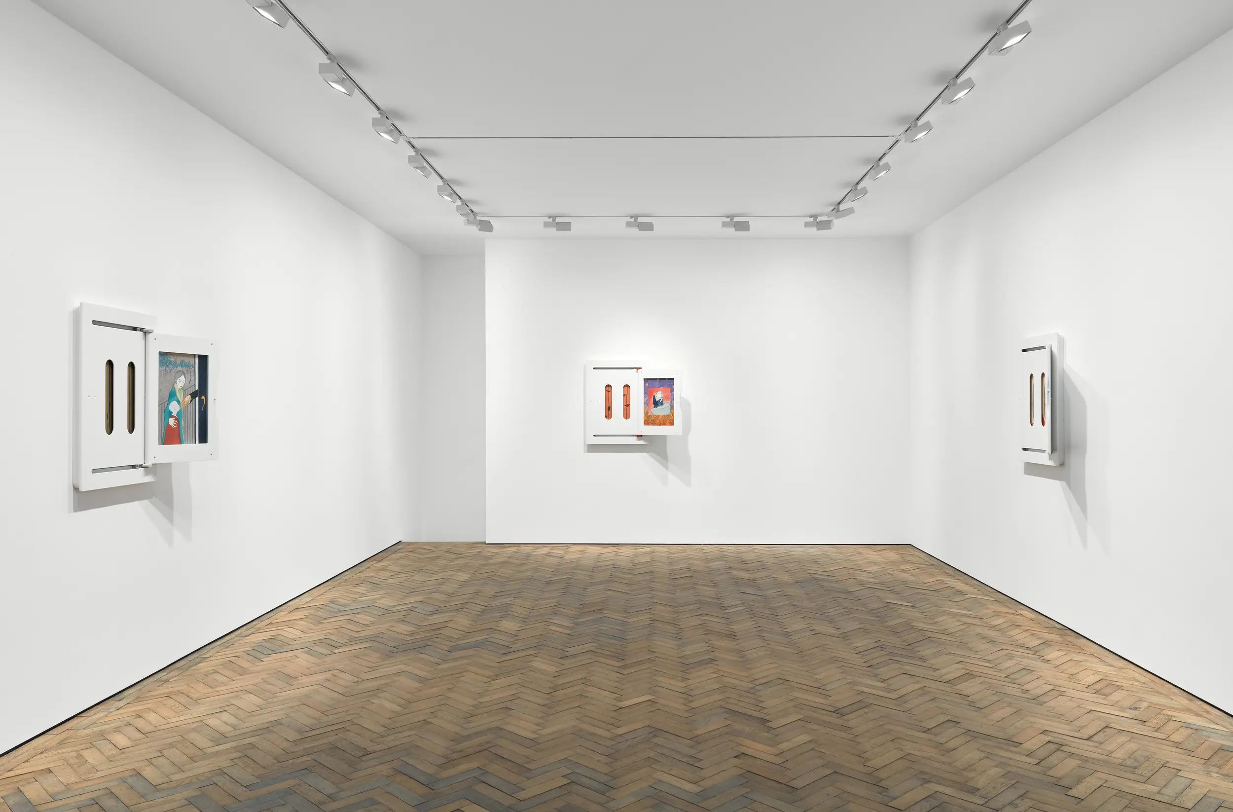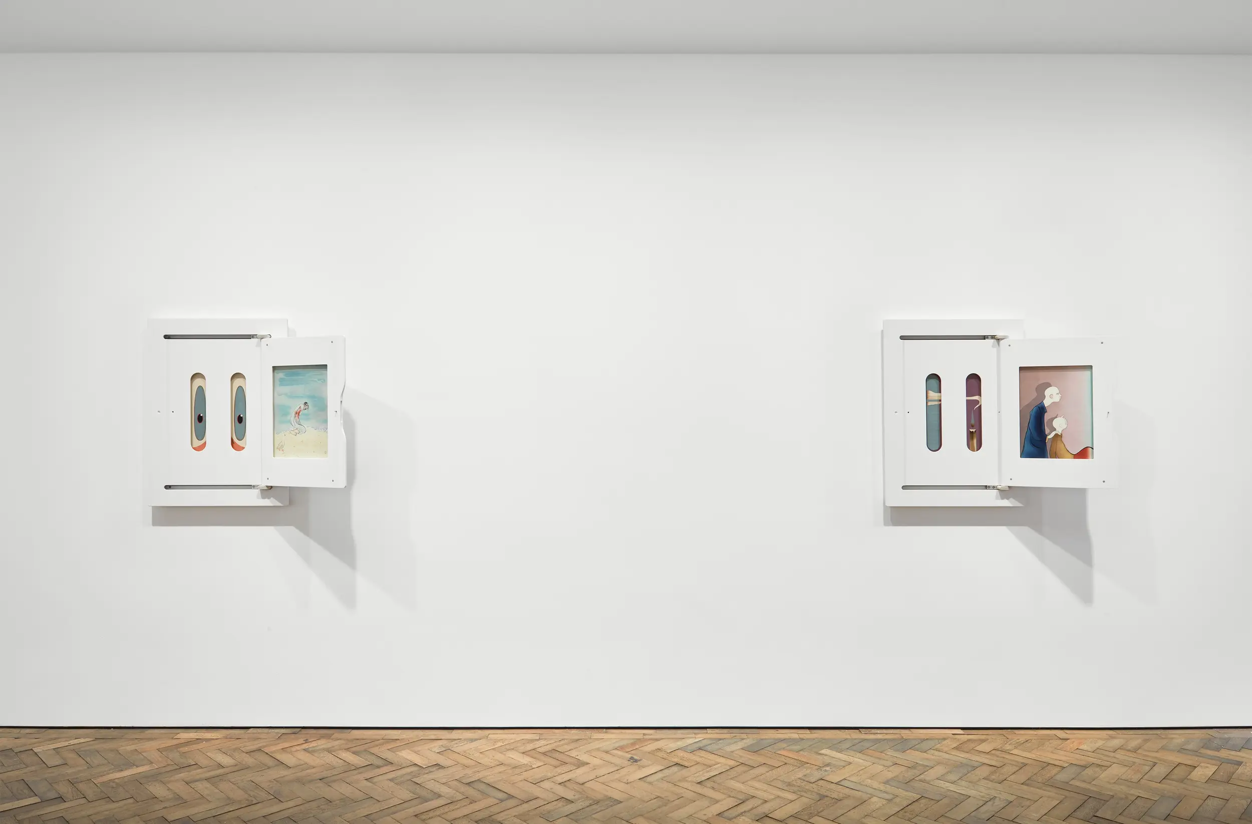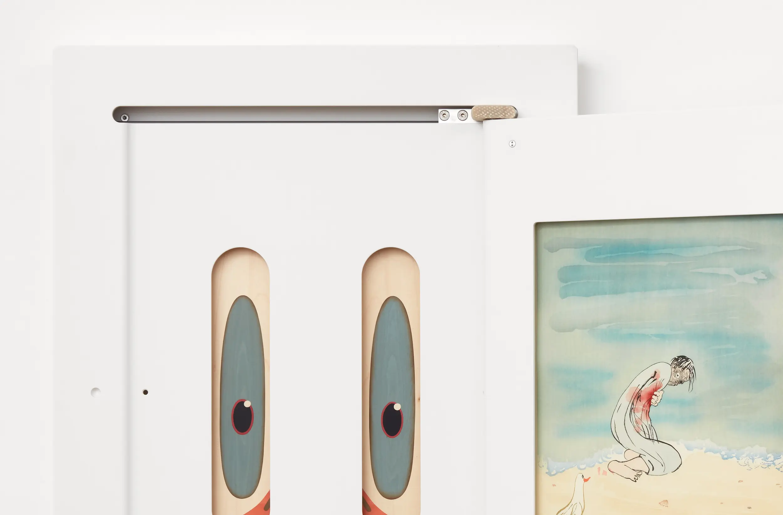While visiting Japan between 2018 and 2019, Kantarovsky developed an edition of traditional Ukiyo-e woodblock prints together with the Adachi Hanga Institute of Printmaking in Tokyo. Here, Kantarovsky’s prints are housed individually in frames fabricated out of Corian by Camille Blatrix. The frames are embedded with handcrafted wood marquetry pieces, each decorative element responding to the prints they encase. Reminiscent of bivalve shells, the frames are designed with revolving exterior faces, offering optional protection or exposure throughout the course of the exhibition.