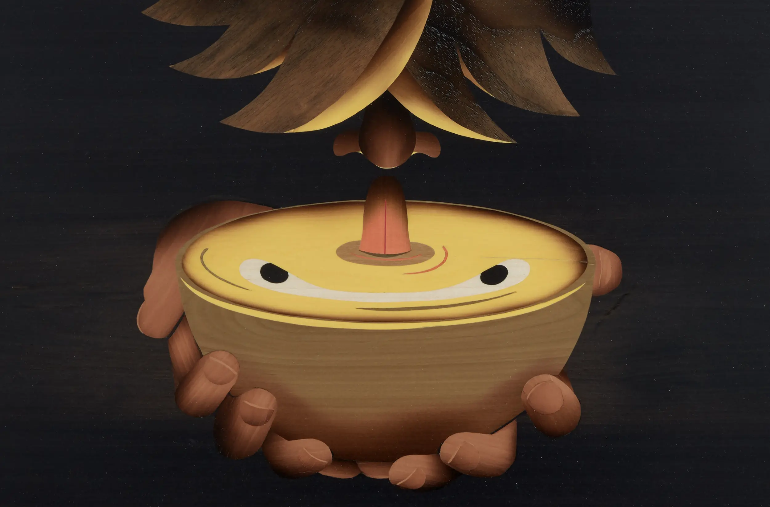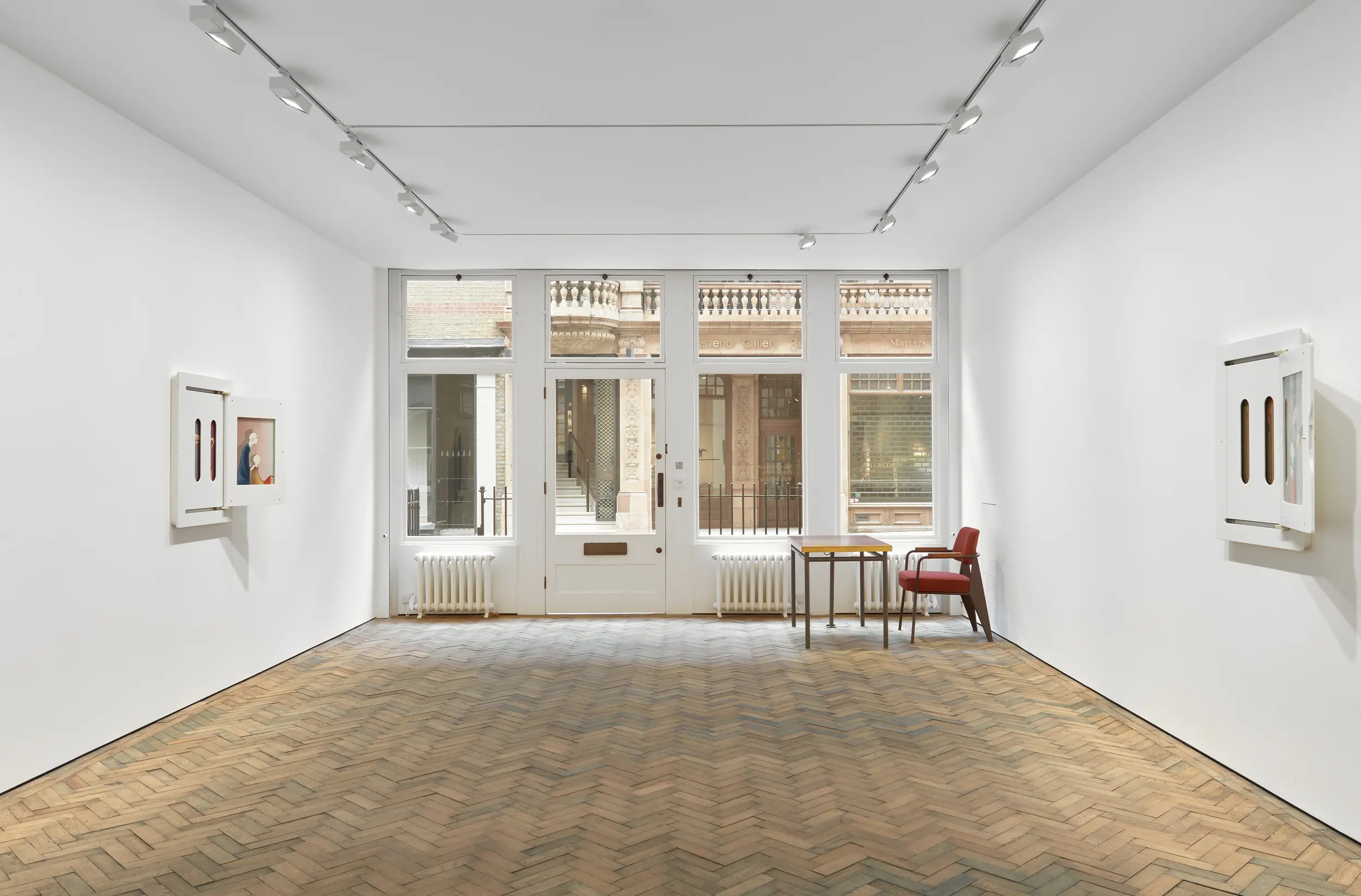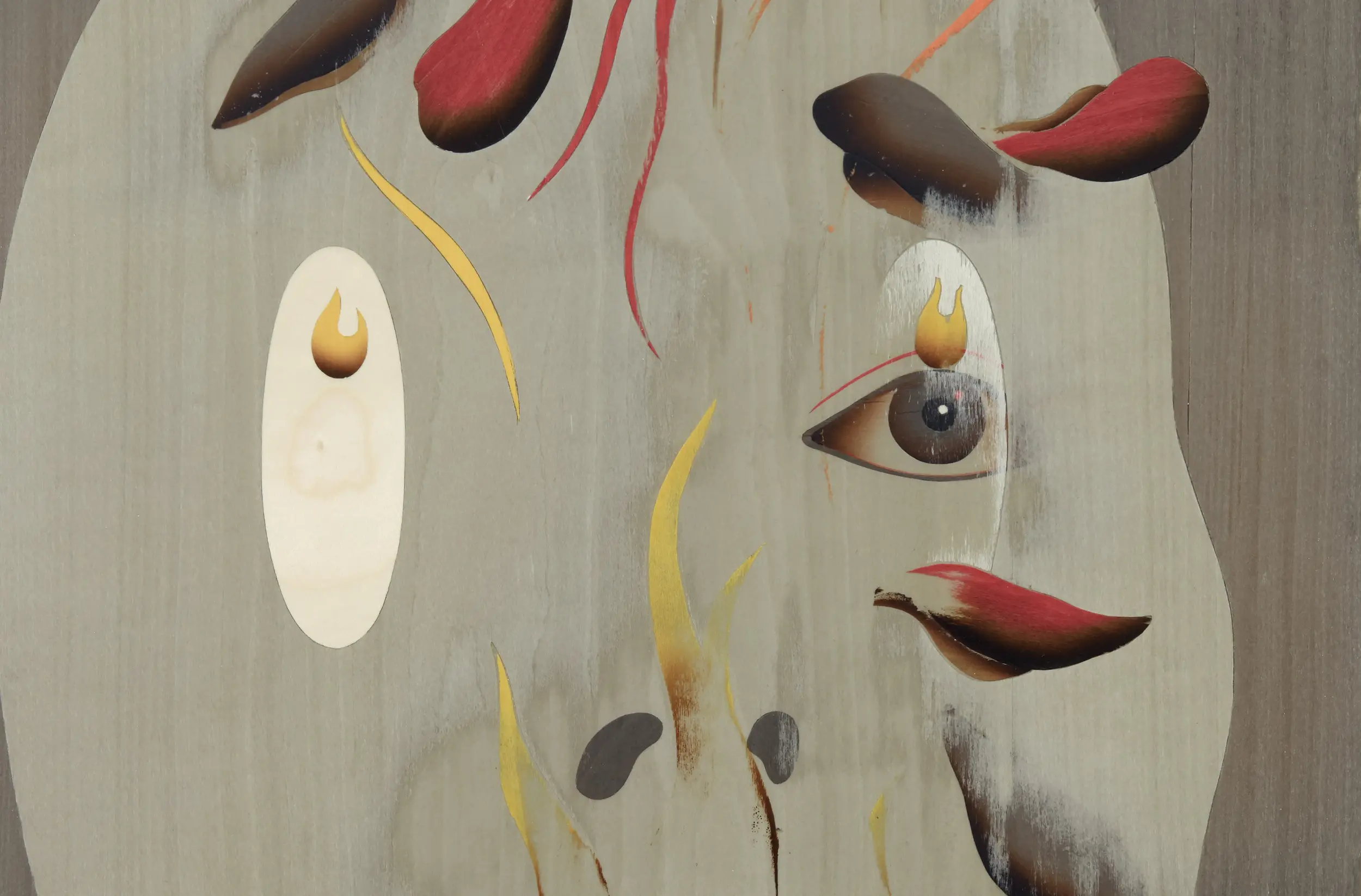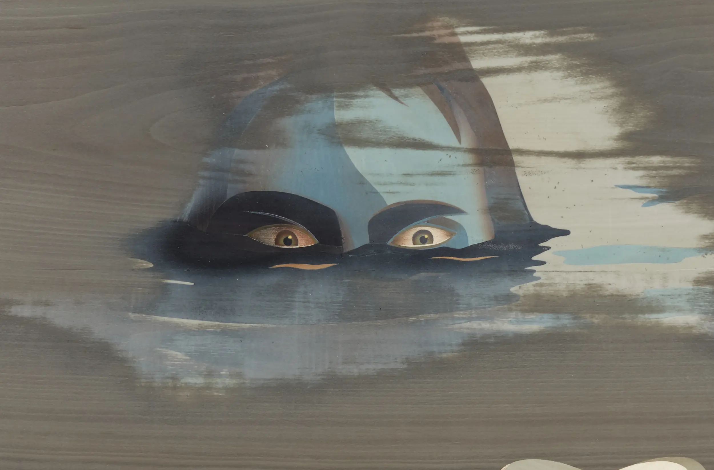 While visiting Japan between 2018 and 2019, Kantarovsky developed an edition of traditional Ukiyo-e woodblock prints together with the Adachi Hanga Institute of Printmaking in Tokyo. Here, Kantarovsky’s prints are housed individually in frames fabricated out of Corian by Camille Blatrix. The frames are embedded with handcrafted wood marquetry pieces, each decorative element responding to the prints they encase. Reminiscent of bivalve shells, the frames are designed with revolving exterior faces, offering optional protection or exposure throughout the course of the exhibition.