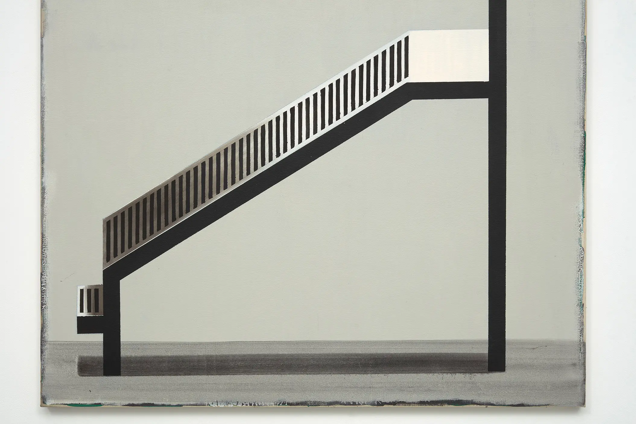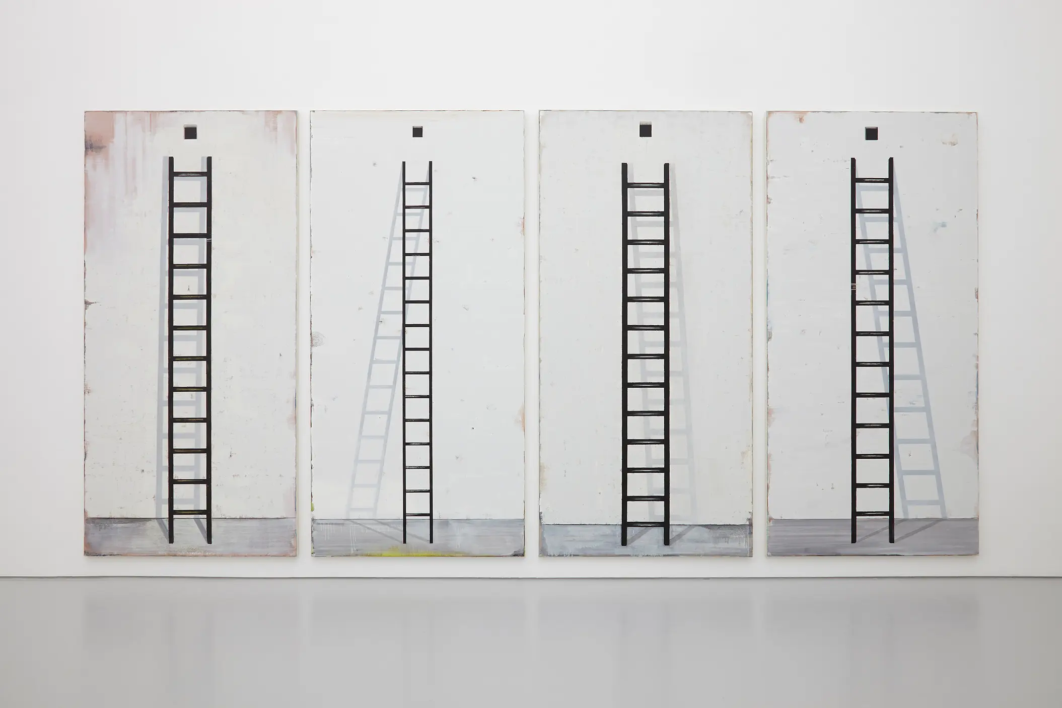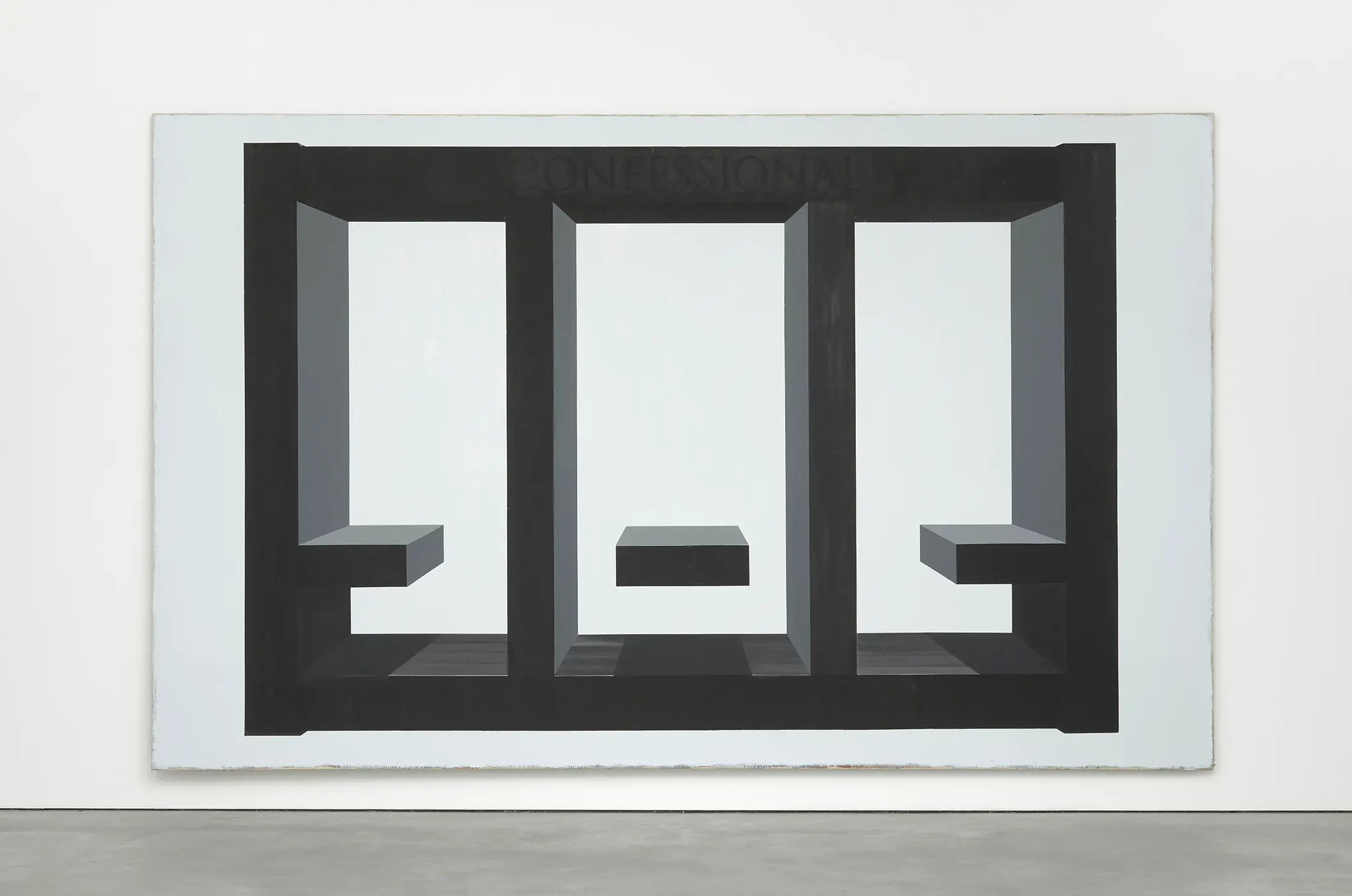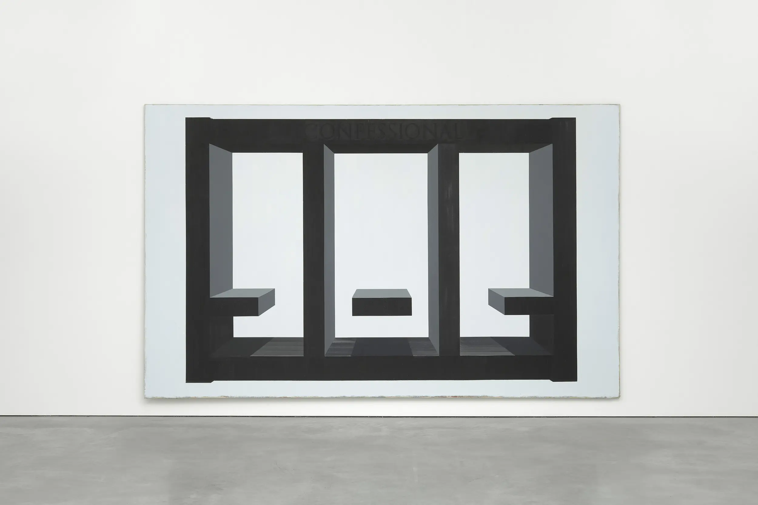 Peignant presque quotidiennement depuis plus de six décennies, Michael Simpson est réputé pour ses toiles grand format qui reprennent un nombre limité de motifs. Influencé par la peinture vénitienne du XVe siècle et les débuts de la peinture flamande, le vocabulaire visuel de Simpson renvoie sans cesse à sa croyance en « l'infamie de l'histoire religieuse », selon ses propres termes. En abordant de manière incisive la foi, l’existentialisme et l’autorité, ces figures — bancs, échelles, chaires et autres dispositifs liturgiques ou quotidiens — forment le socle précis de ses compositions. Ces structures, minutieusement détaillées, se transforment en formes presque abstraites : des bancs semblent flotter dans un espace dépouillé ; des échelles s’élèvent sans destination. Les peintures de l’artiste se distinguent par une grande sobriété et une austérité assumée, tout en déployant une profondeur spatiale saisissante, bien que leurs sujets soient rendus sur une surface plane. Malgré leur austérité et leur simplicité, chacune de ses toiles contient une réflexion profonde sur une histoire particulière. Dans la série, Leper Squint par exemple, ce qui pourrait à première vue apparaître comme une référence récurrente au carré noir de Kasimir Malevitch est en réalité une représentation poignante d'un hagioscope, ou d’un oculus, un petit trou façonné dans les murs extérieurs des églises médiévales pour permettre aux lépreux de voir et d'entendre les sacrements sans contaminer l'assemblée. Autre exemple : les bancs peints par Michael Simpson, commencés en 1989, sont un hommage au philosophe italien de la Renaissance Giordano Bruno, brûlé vif en 1600 pour hérésie.