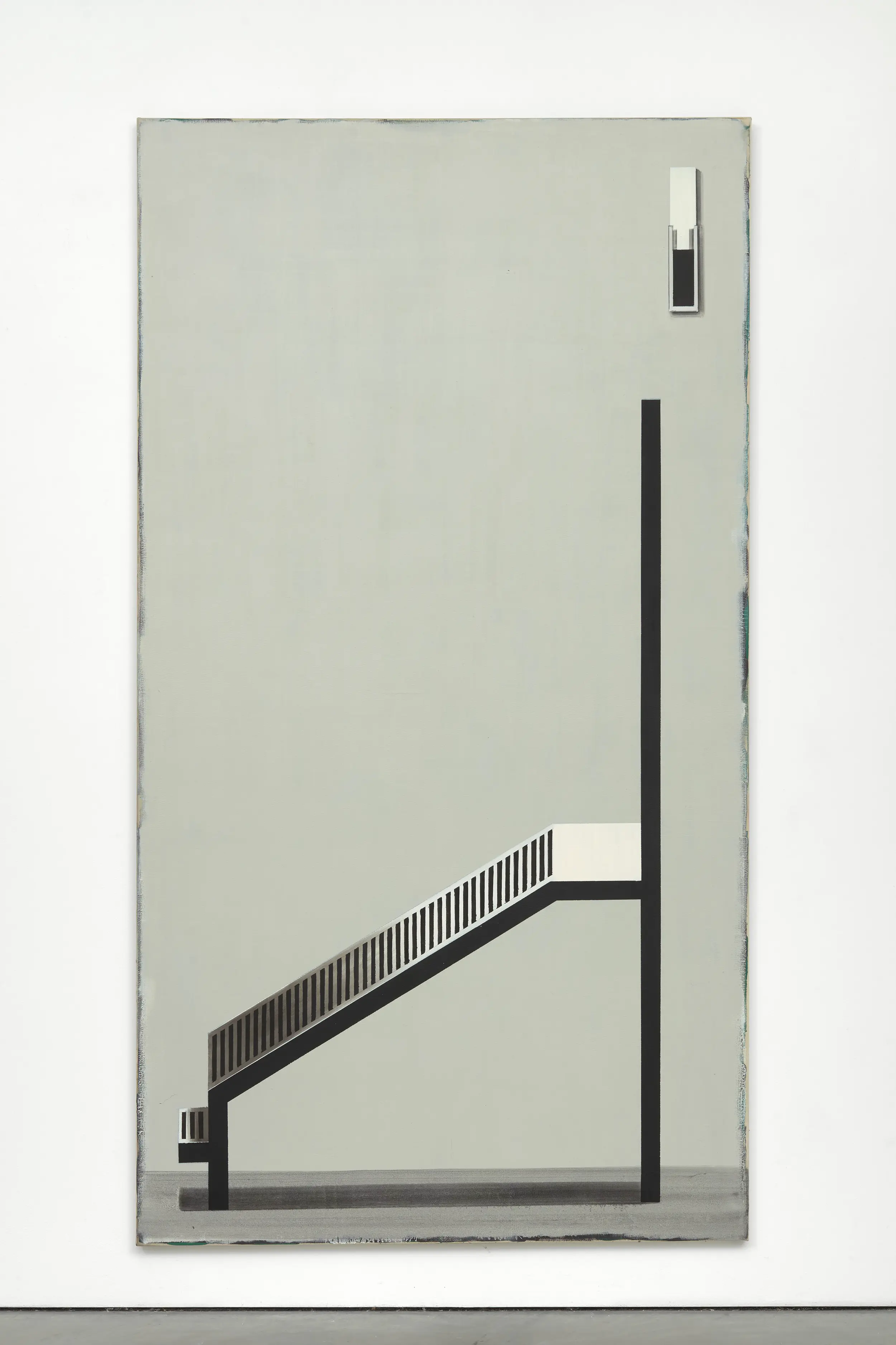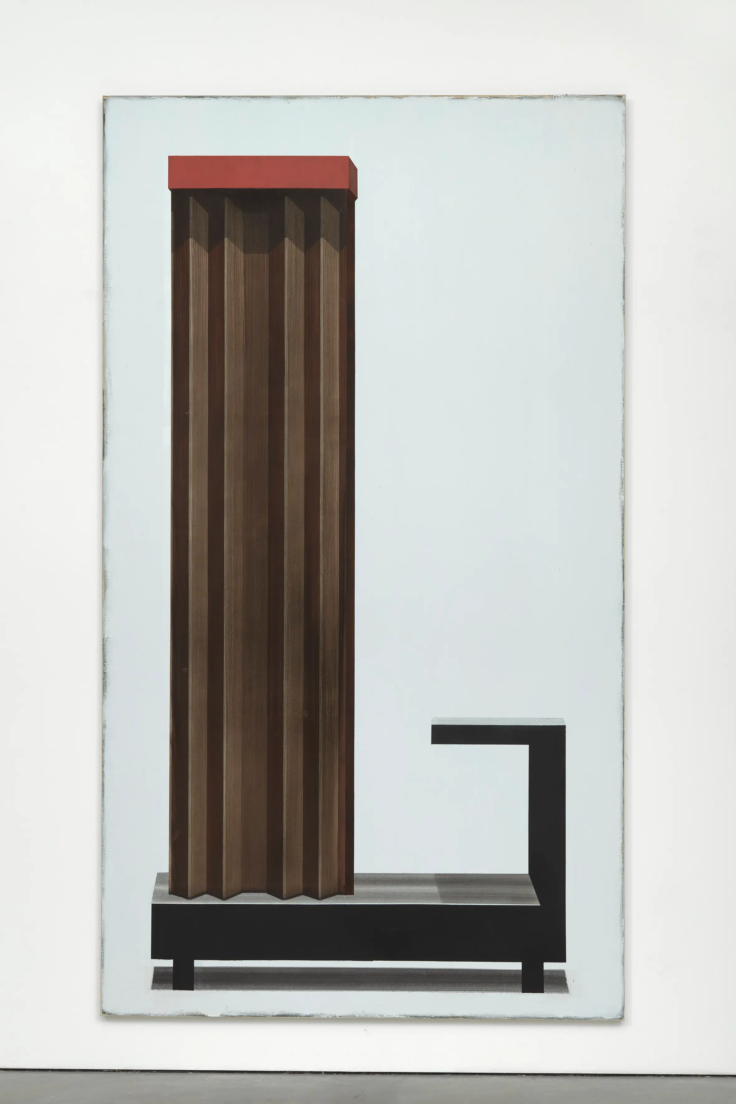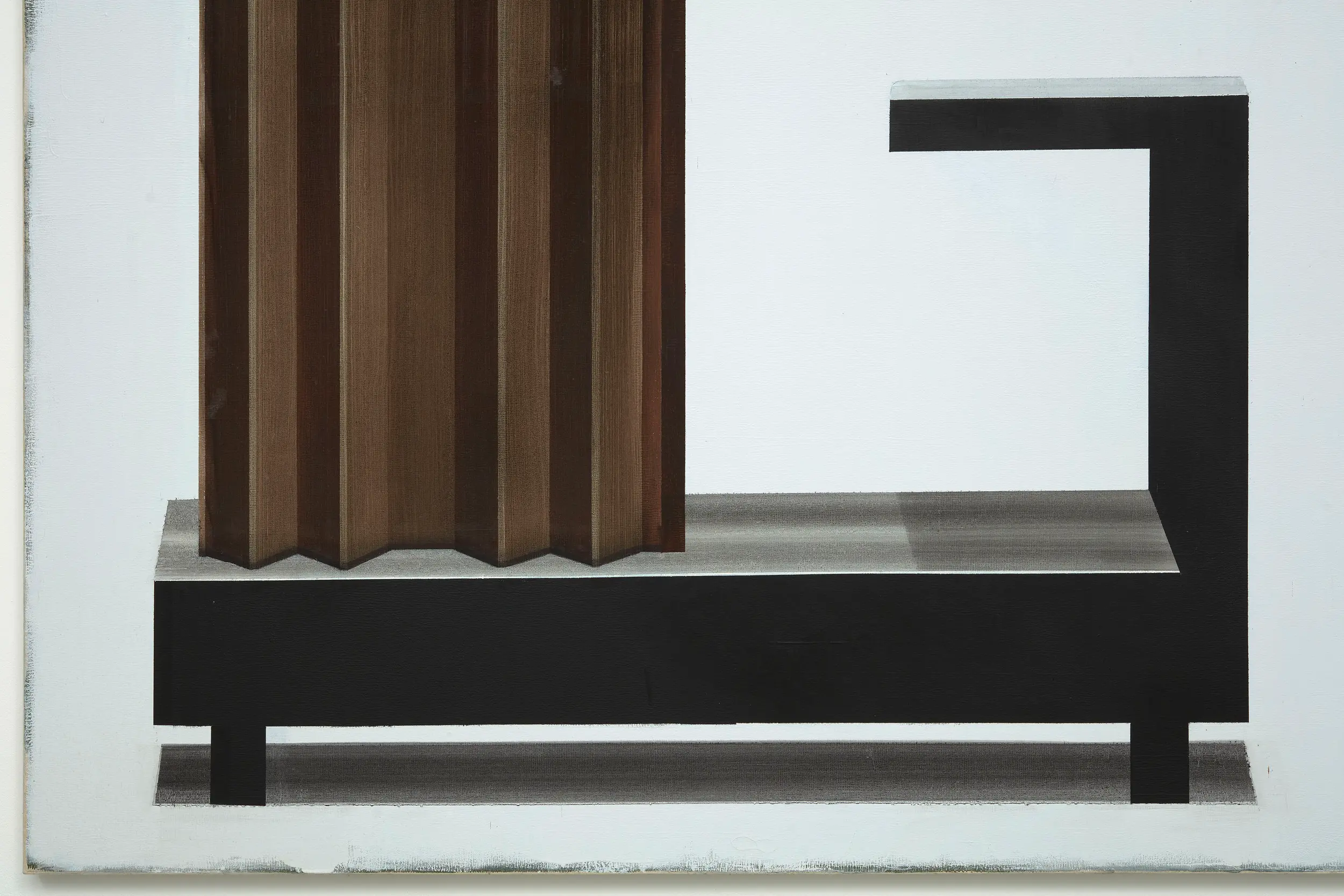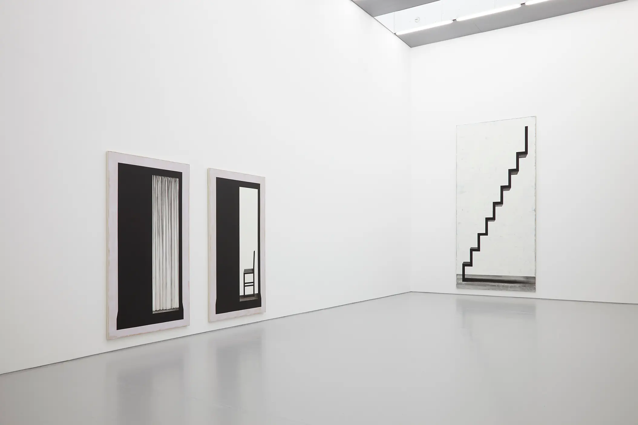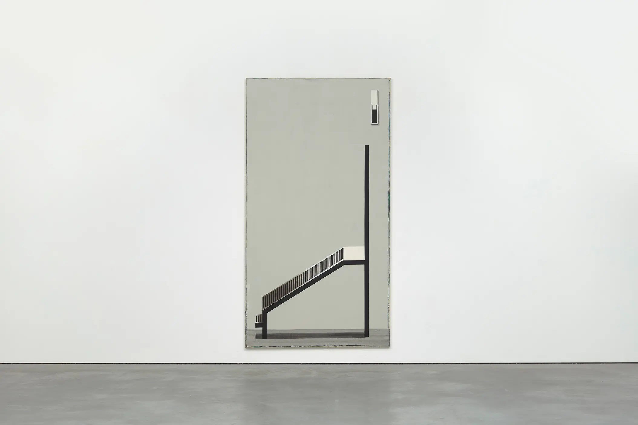 Peignant presque quotidiennement depuis plus de six décennies, Michael Simpson est réputé pour ses toiles grand format qui reprennent un nombre limité de motifs. Influencé par la peinture vénitienne du XVe siècle et les débuts de la peinture flamande, le vocabulaire visuel de Simpson renvoie sans cesse à sa croyance en « l'infamie de l'histoire religieuse », selon ses propres termes. En abordant de manière incisive la foi, l’existentialisme et l’autorité, ces figures — bancs, échelles, chaires et autres dispositifs liturgiques ou quotidiens — forment le socle précis de ses compositions. Ces structures, minutieusement détaillées, se transforment en formes presque abstraites : des bancs semblent flotter dans un espace dépouillé ; des échelles s’élèvent sans destination. Les peintures de l’artiste se distinguent par une grande sobriété et une austérité assumée, tout en déployant une profondeur spatiale saisissante, bien que leurs sujets soient rendus sur une surface plane. Malgré leur austérité et leur simplicité, chacune de ses toiles contient une réflexion profonde sur une histoire particulière. Dans la série, Leper Squint par exemple, ce qui pourrait à première vue apparaître comme une référence récurrente au carré noir de Kasimir Malevitch est en réalité une représentation poignante d'un hagioscope, ou d’un oculus, un petit trou façonné dans les murs extérieurs des églises médiévales pour permettre aux lépreux de voir et d'entendre les sacrements sans contaminer l'assemblée. Autre exemple : les bancs peints par Michael Simpson, commencés en 1989, sont un hommage au philosophe italien de la Renaissance Giordano Bruno, brûlé vif en 1600 pour hérésie.