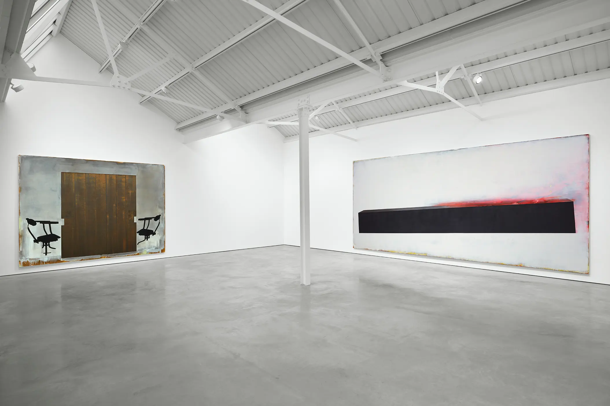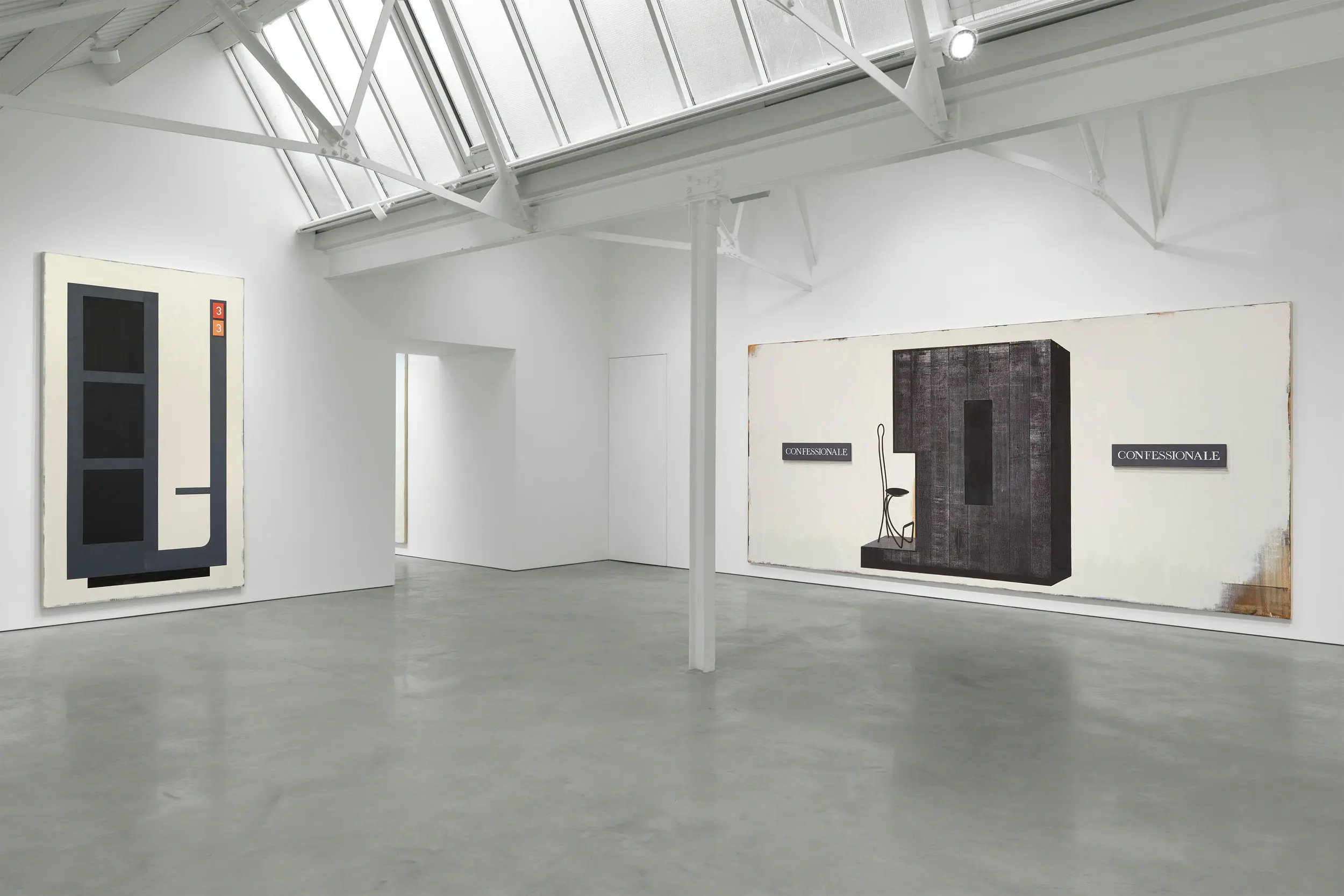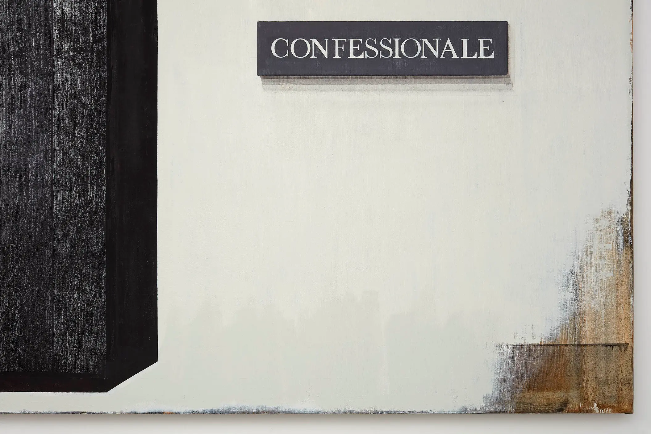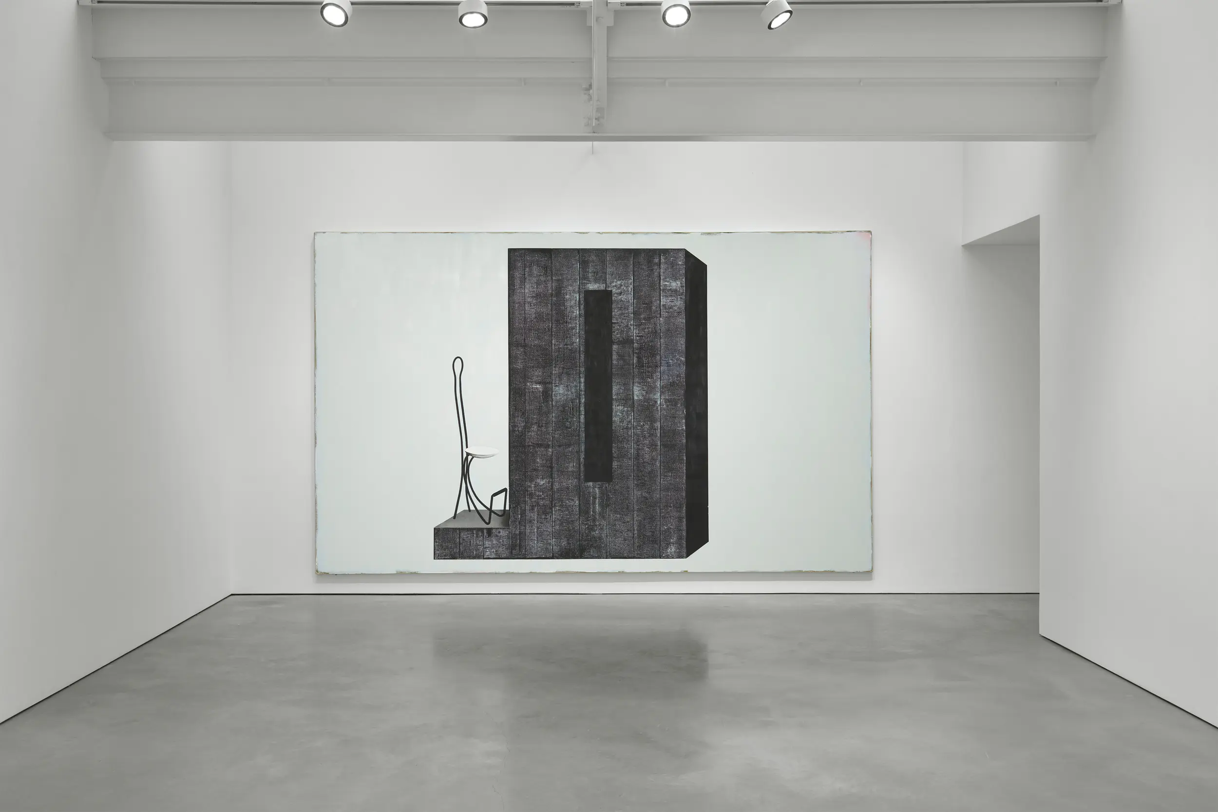 Peignant presque quotidiennement depuis plus de six décennies, Michael Simpson est réputé pour ses toiles grand format qui reprennent un nombre limité de motifs. Influencé par la peinture vénitienne du XVe siècle et les débuts de la peinture flamande, le vocabulaire visuel de Simpson renvoie sans cesse à sa croyance en « l'infamie de l'histoire religieuse », selon ses propres termes. En abordant de manière incisive la foi, l’existentialisme et l’autorité, ces figures — bancs, échelles, chaires et autres dispositifs liturgiques ou quotidiens — forment le socle précis de ses compositions. Ces structures, minutieusement détaillées, se transforment en formes presque abstraites : des bancs semblent flotter dans un espace dépouillé ; des échelles s’élèvent sans destination. Les peintures de l’artiste se distinguent par une grande sobriété et une austérité assumée, tout en déployant une profondeur spatiale saisissante, bien que leurs sujets soient rendus sur une surface plane. Malgré leur austérité et leur simplicité, chacune de ses toiles contient une réflexion profonde sur une histoire particulière. Dans la série, Leper Squint par exemple, ce qui pourrait à première vue apparaître comme une référence récurrente au carré noir de Kasimir Malevitch est en réalité une représentation poignante d'un hagioscope, ou d’un oculus, un petit trou façonné dans les murs extérieurs des églises médiévales pour permettre aux lépreux de voir et d'entendre les sacrements sans contaminer l'assemblée. Autre exemple : les bancs peints par Michael Simpson, commencés en 1989, sont un hommage au philosophe italien de la Renaissance Giordano Bruno, brûlé vif en 1600 pour hérésie.
