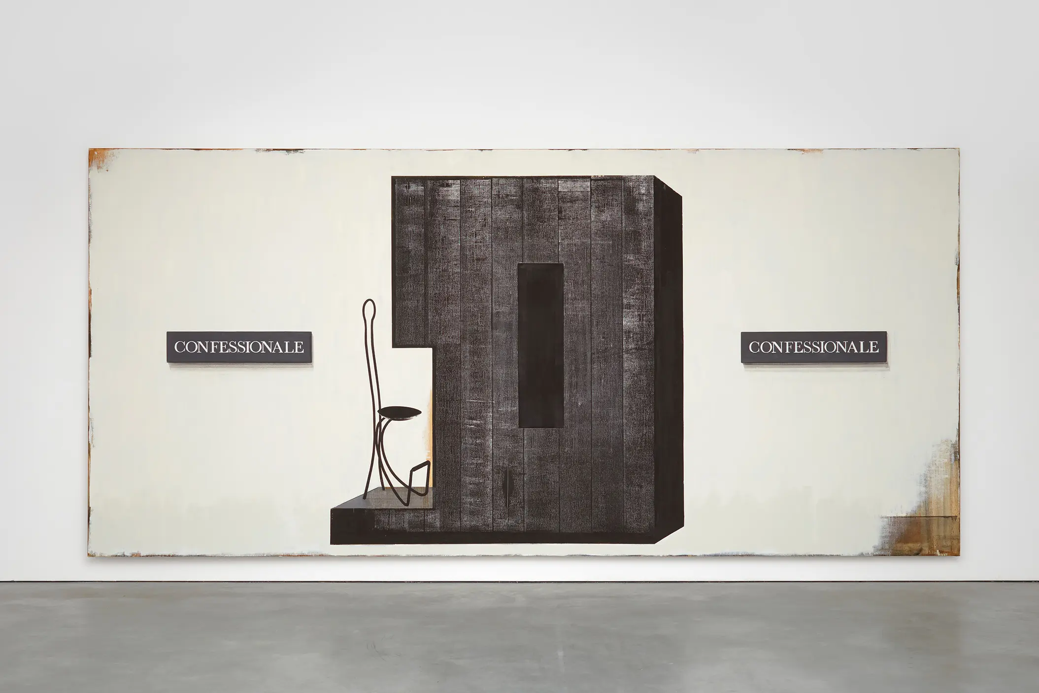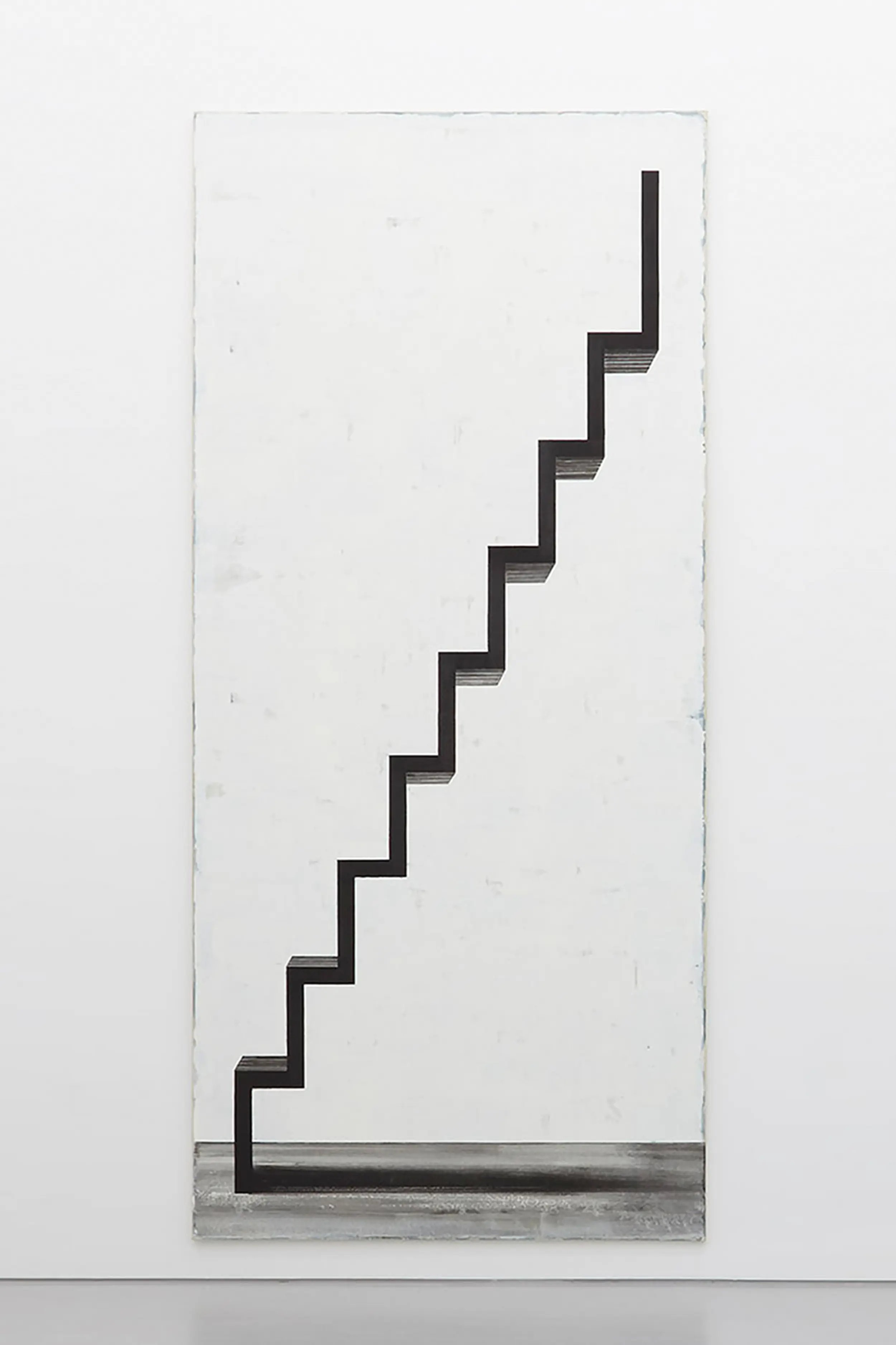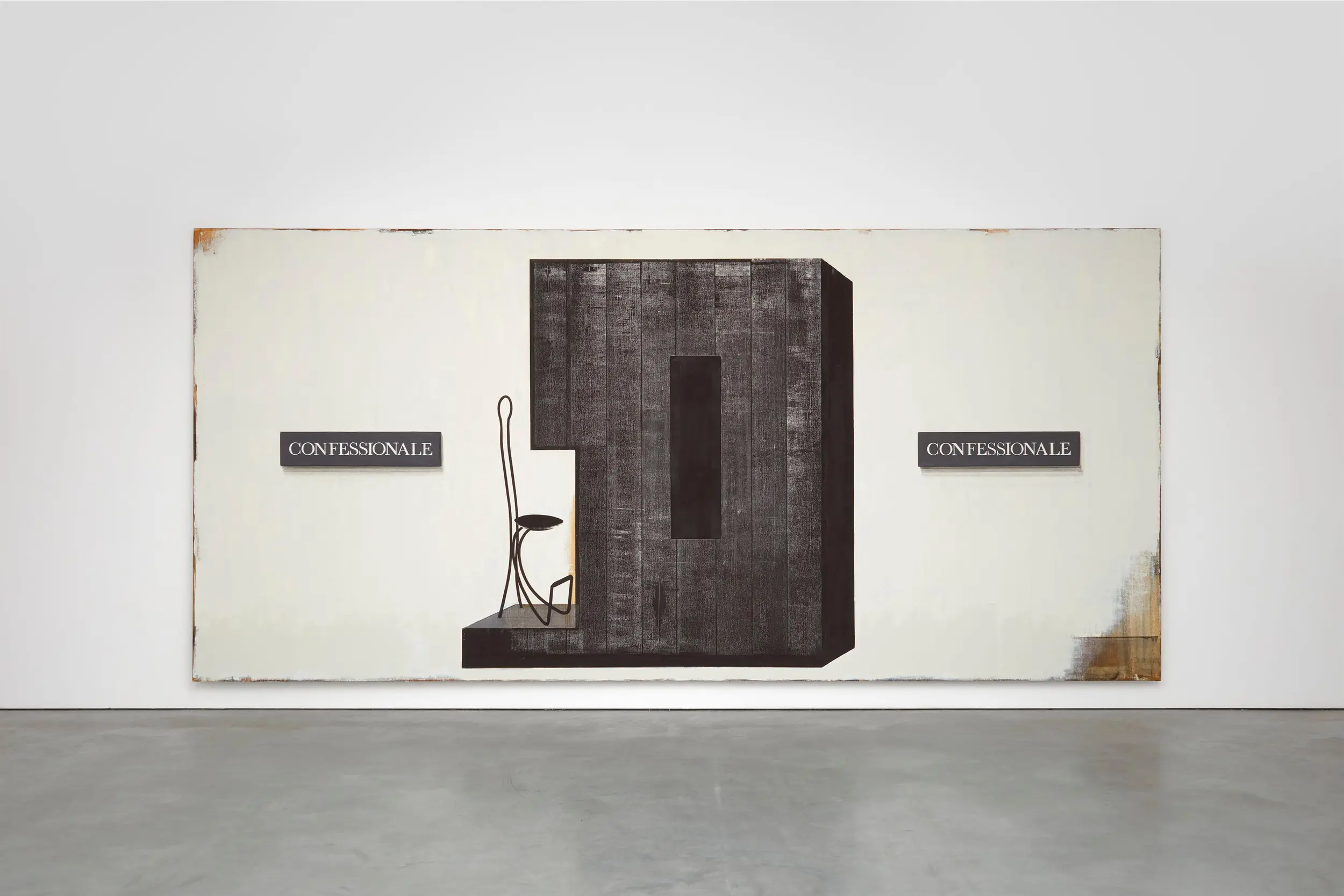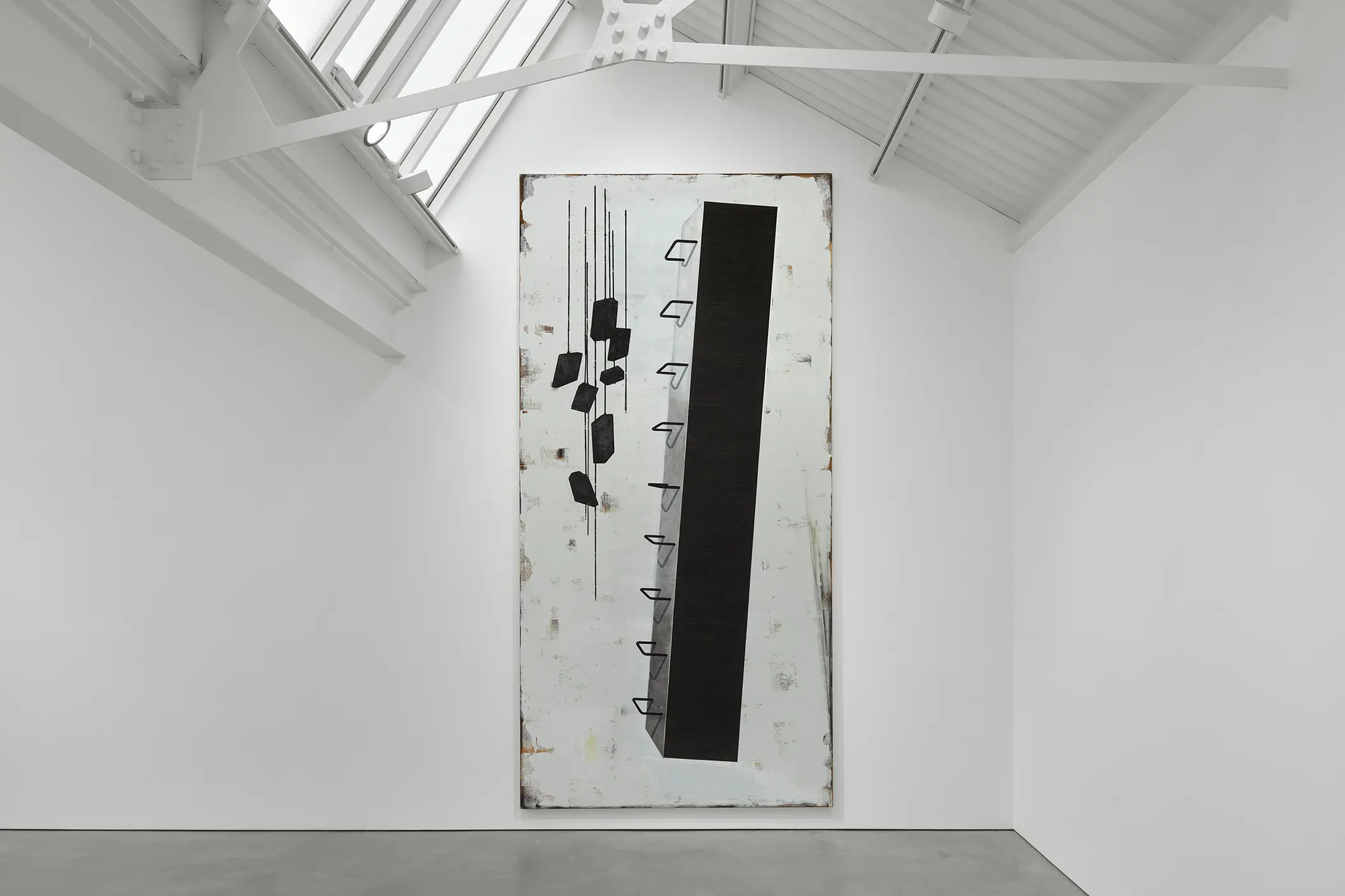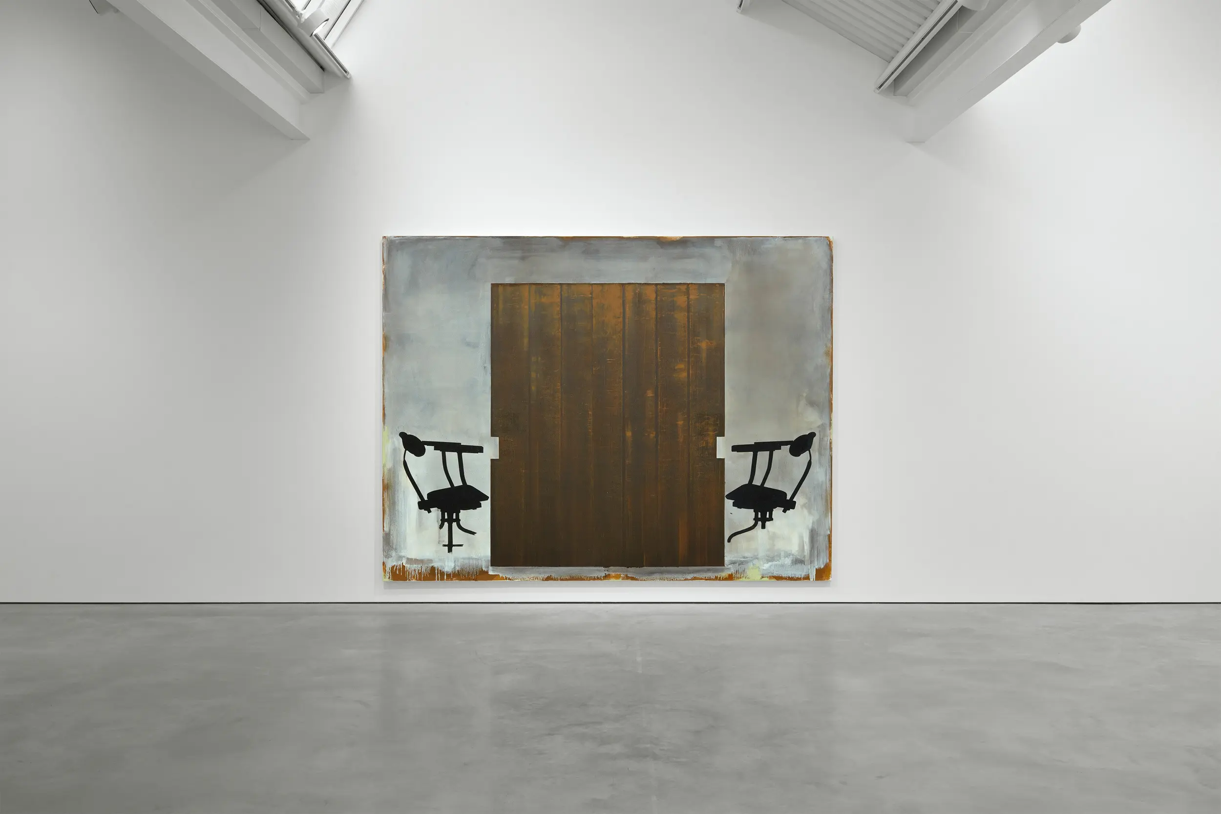 Peignant presque quotidiennement depuis plus de six décennies, Michael Simpson est réputé pour ses toiles grand format qui reprennent un nombre limité de motifs. Influencé par la peinture vénitienne du XVe siècle et les débuts de la peinture flamande, le vocabulaire visuel de Simpson renvoie sans cesse à sa croyance en « l'infamie de l'histoire religieuse », selon ses propres termes. En abordant de manière incisive la foi, l’existentialisme et l’autorité, ces figures — bancs, échelles, chaires et autres dispositifs liturgiques ou quotidiens — forment le socle précis de ses compositions. Ces structures, minutieusement détaillées, se transforment en formes presque abstraites : des bancs semblent flotter dans un espace dépouillé ; des échelles s’élèvent sans destination. Les peintures de l’artiste se distinguent par une grande sobriété et une austérité assumée, tout en déployant une profondeur spatiale saisissante, bien que leurs sujets soient rendus sur une surface plane. Malgré leur austérité et leur simplicité, chacune de ses toiles contient une réflexion profonde sur une histoire particulière. Dans la série, Leper Squint par exemple, ce qui pourrait à première vue apparaître comme une référence récurrente au carré noir de Kasimir Malevitch est en réalité une représentation poignante d'un hagioscope, ou d’un oculus, un petit trou façonné dans les murs extérieurs des églises médiévales pour permettre aux lépreux de voir et d'entendre les sacrements sans contaminer l'assemblée. Autre exemple : les bancs peints par Michael Simpson, commencés en 1989, sont un hommage au philosophe italien de la Renaissance Giordano Bruno, brûlé vif en 1600 pour hérésie.