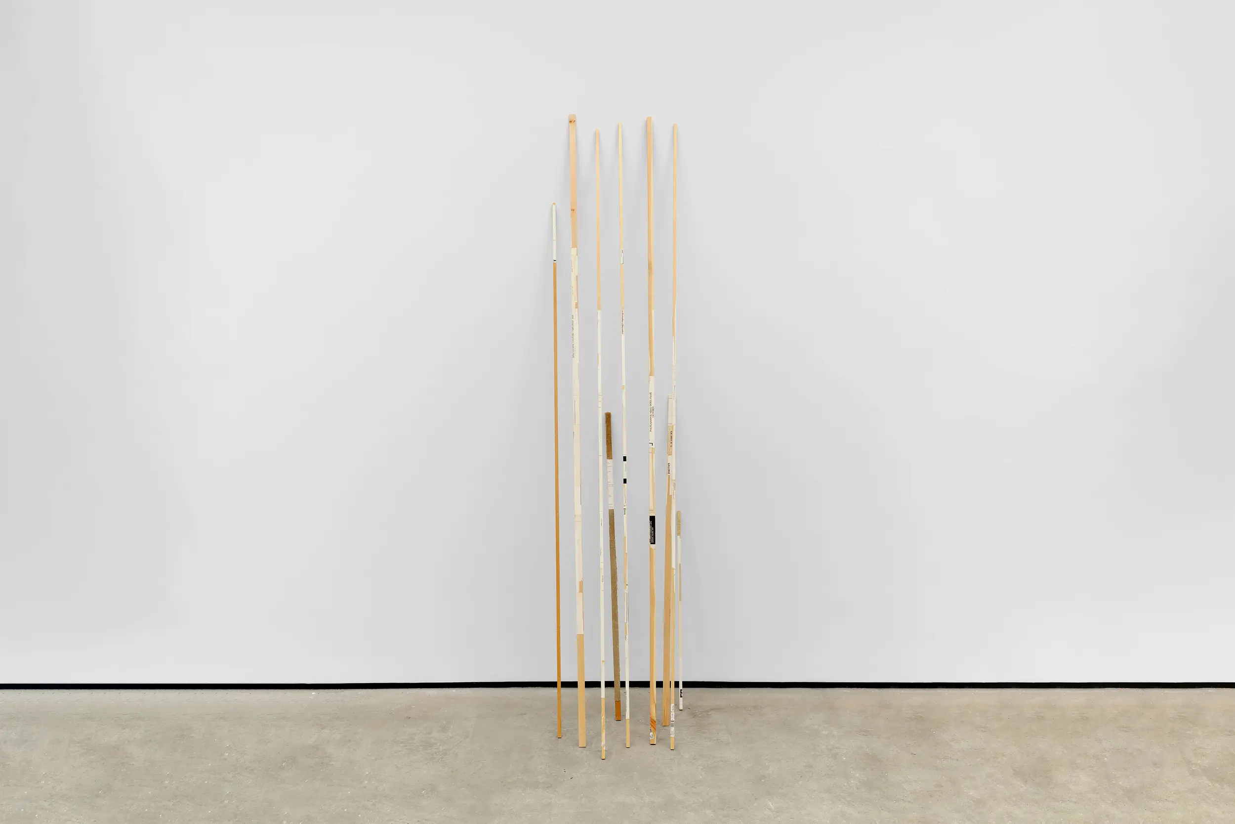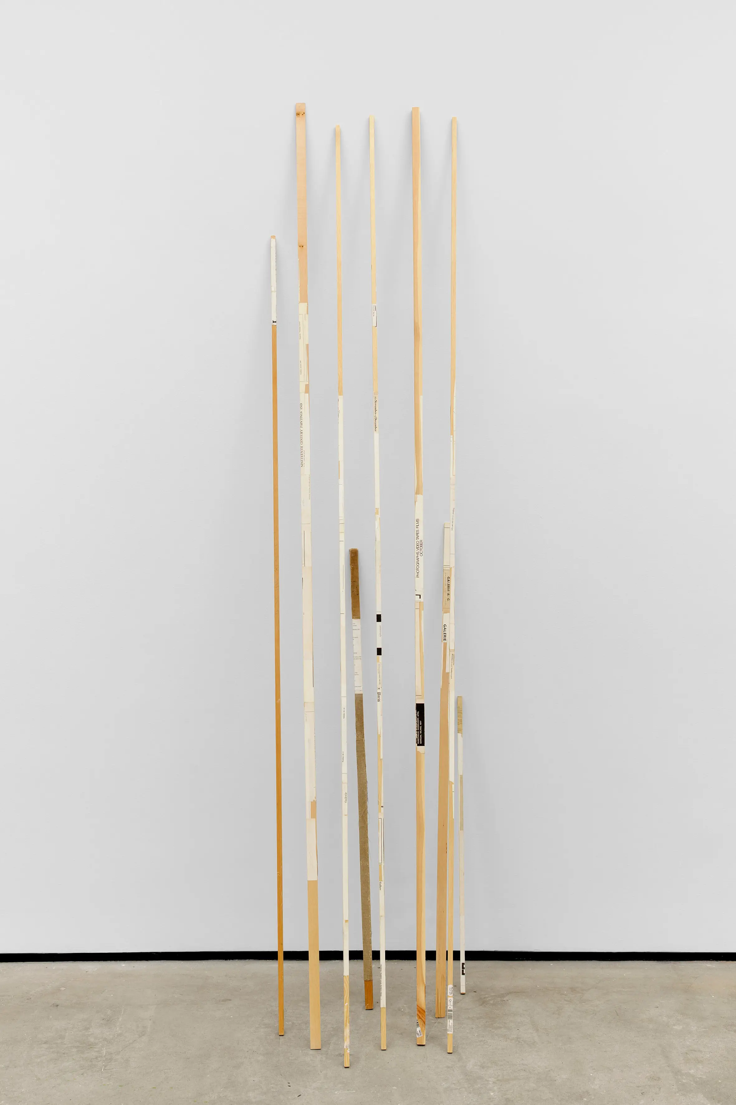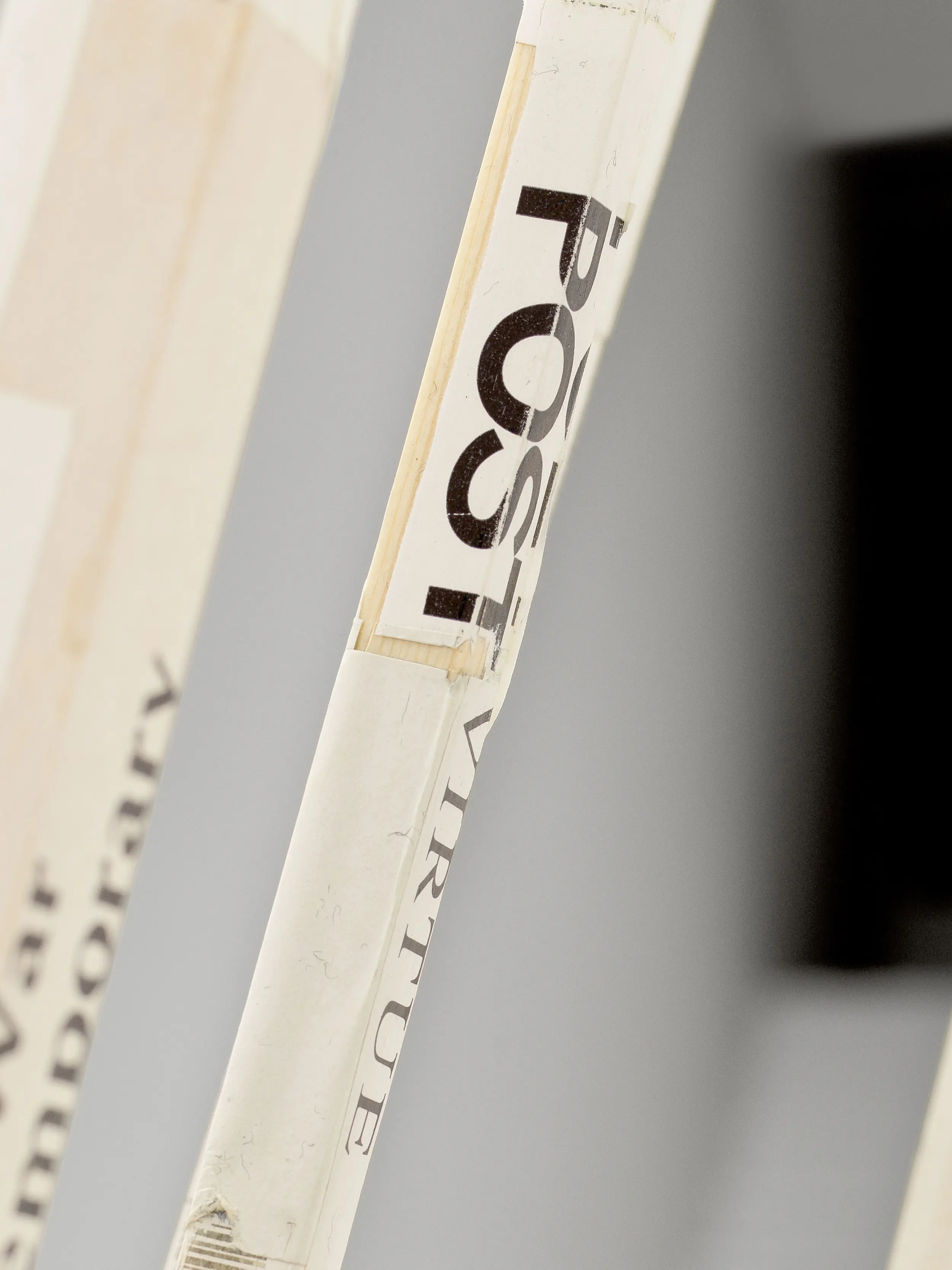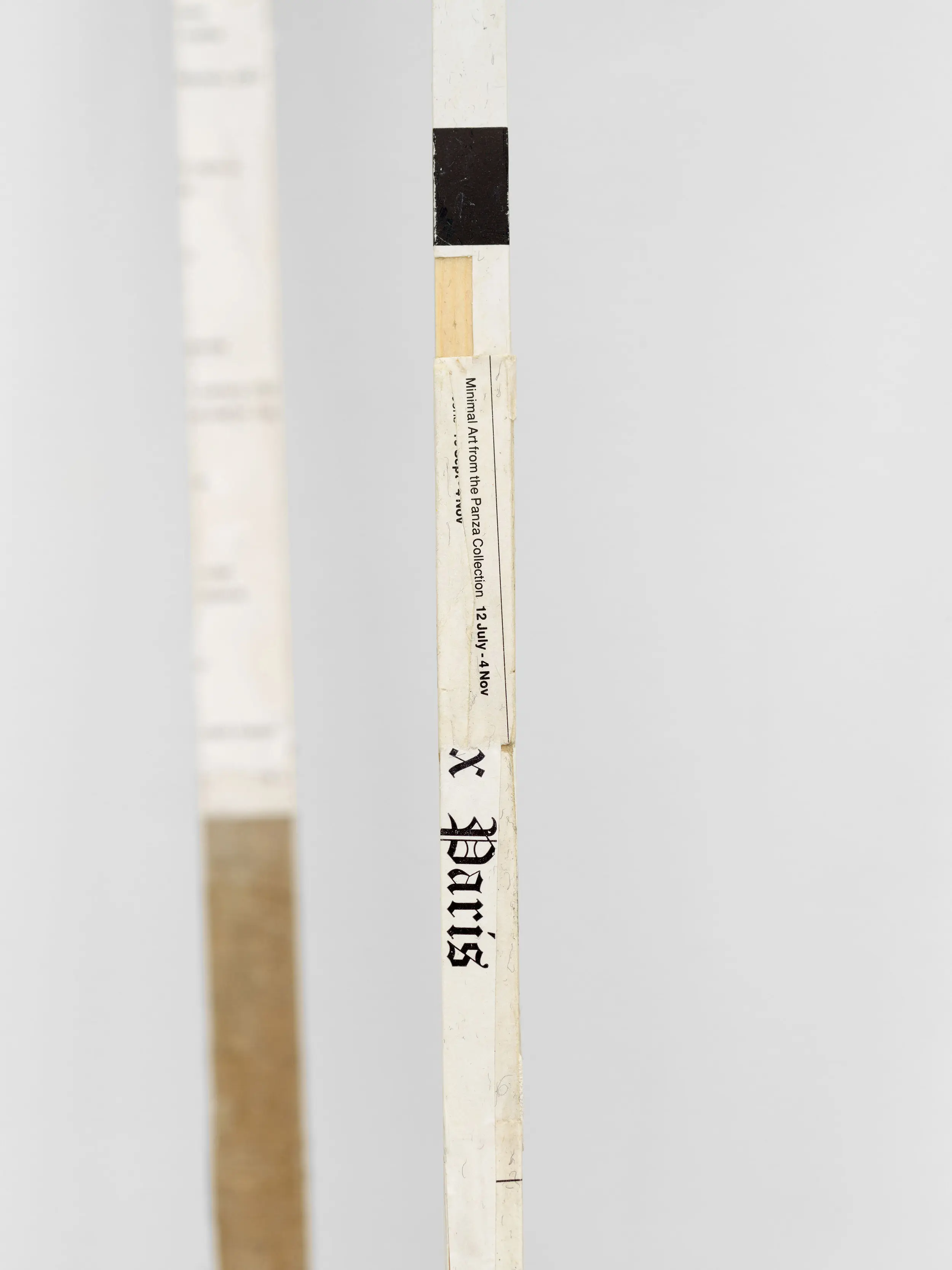 printed matter, tape, and linen on wood, 234.95 × 48.26 × 66.04 cm, 92 1/2 × 19 × 26 in