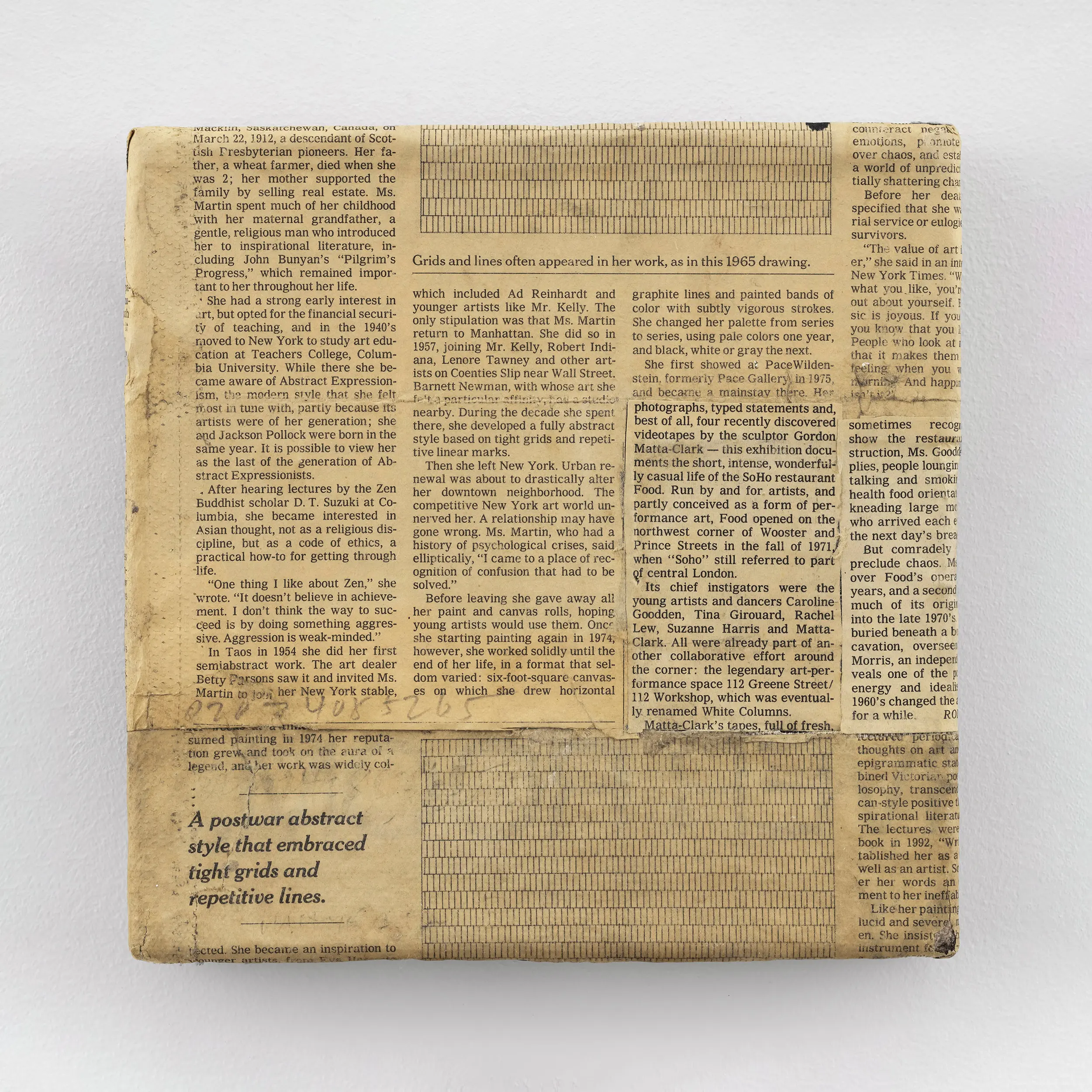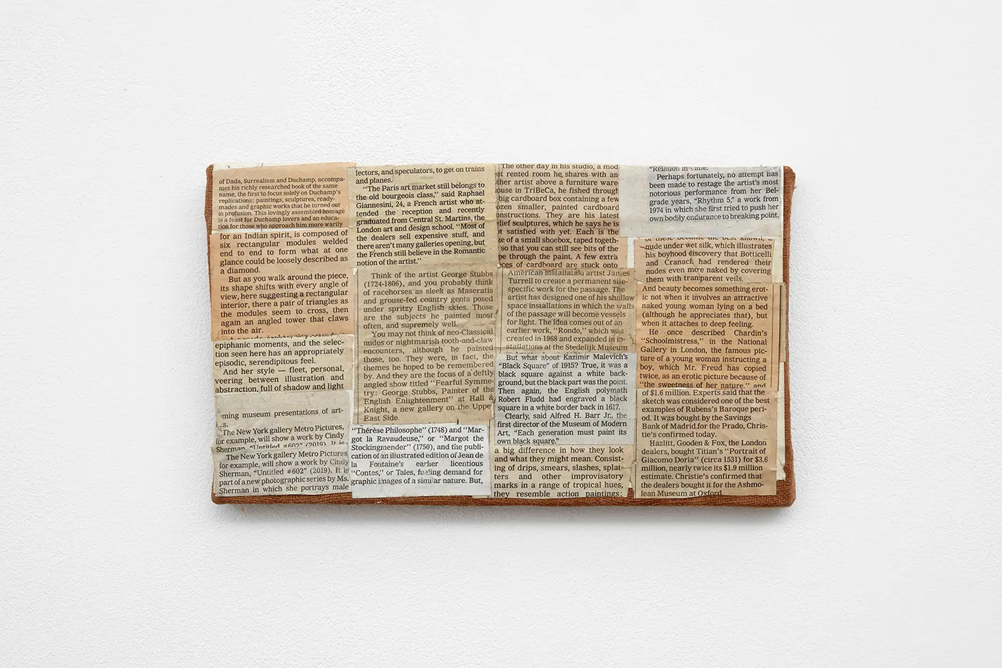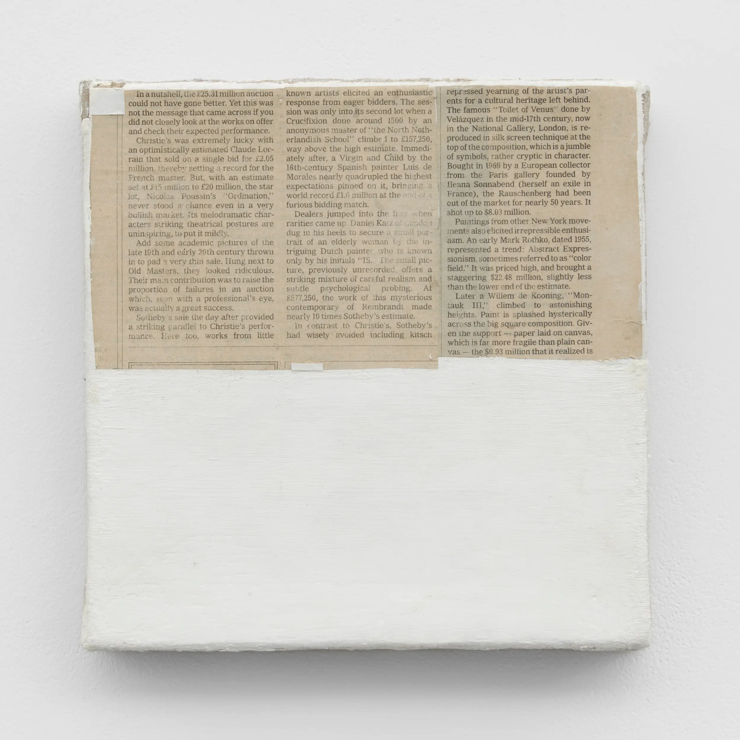 newspaper, tape, oil paint on linen, 20.3 x 20.3 cm, 8 x 8 in