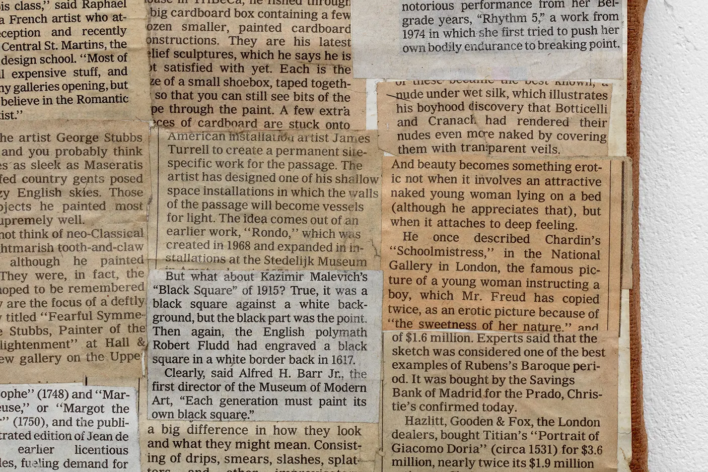 newspaper over painted stretched canvas, 20.96 x 20.96 cm, 8 1/4 x 8 1/4 in