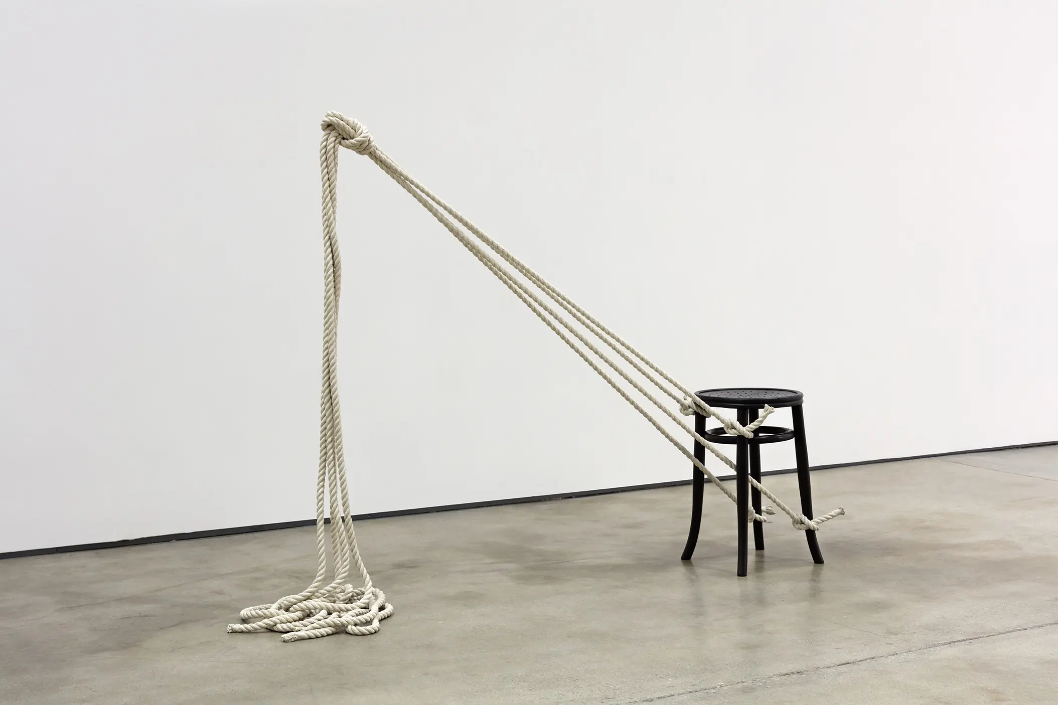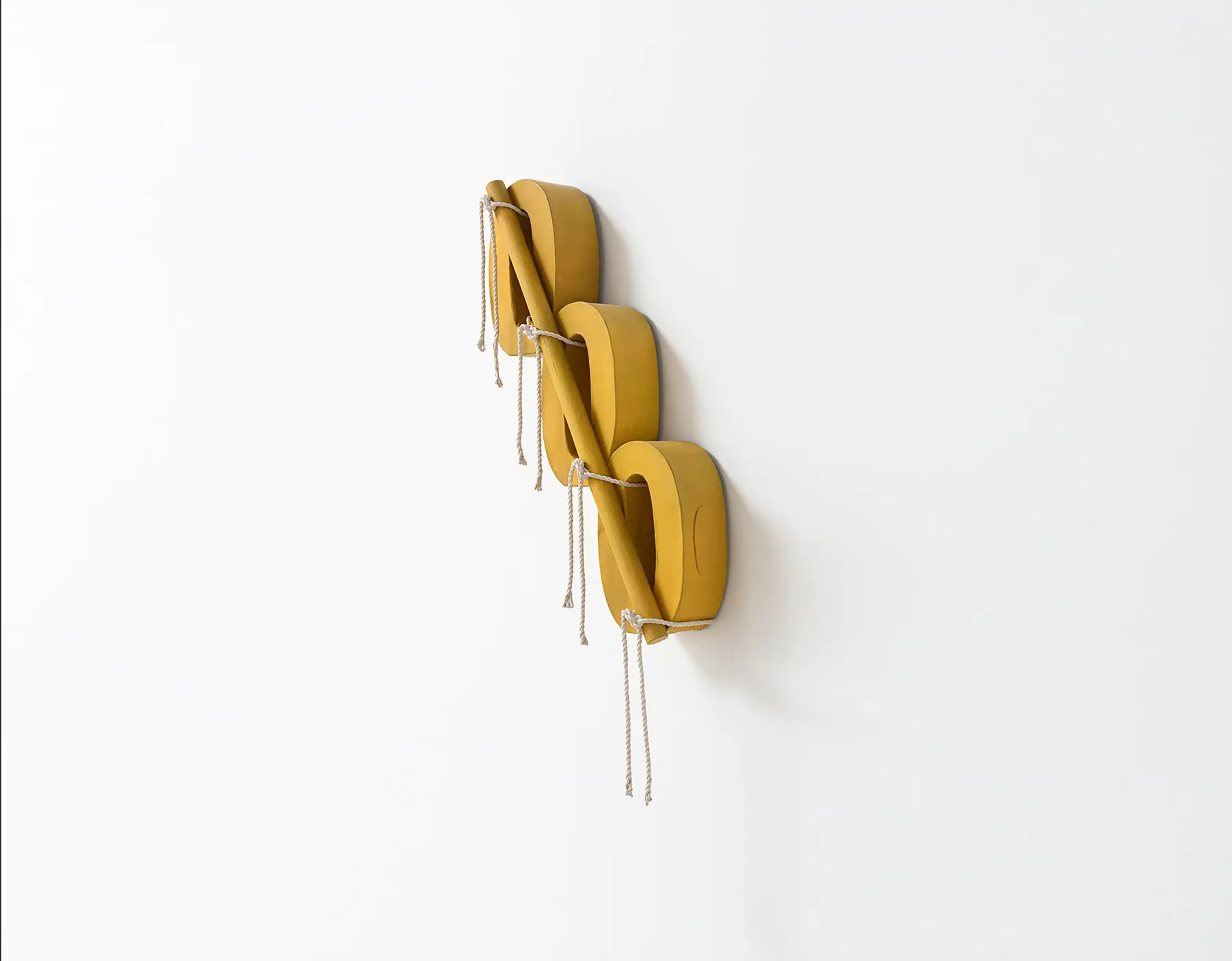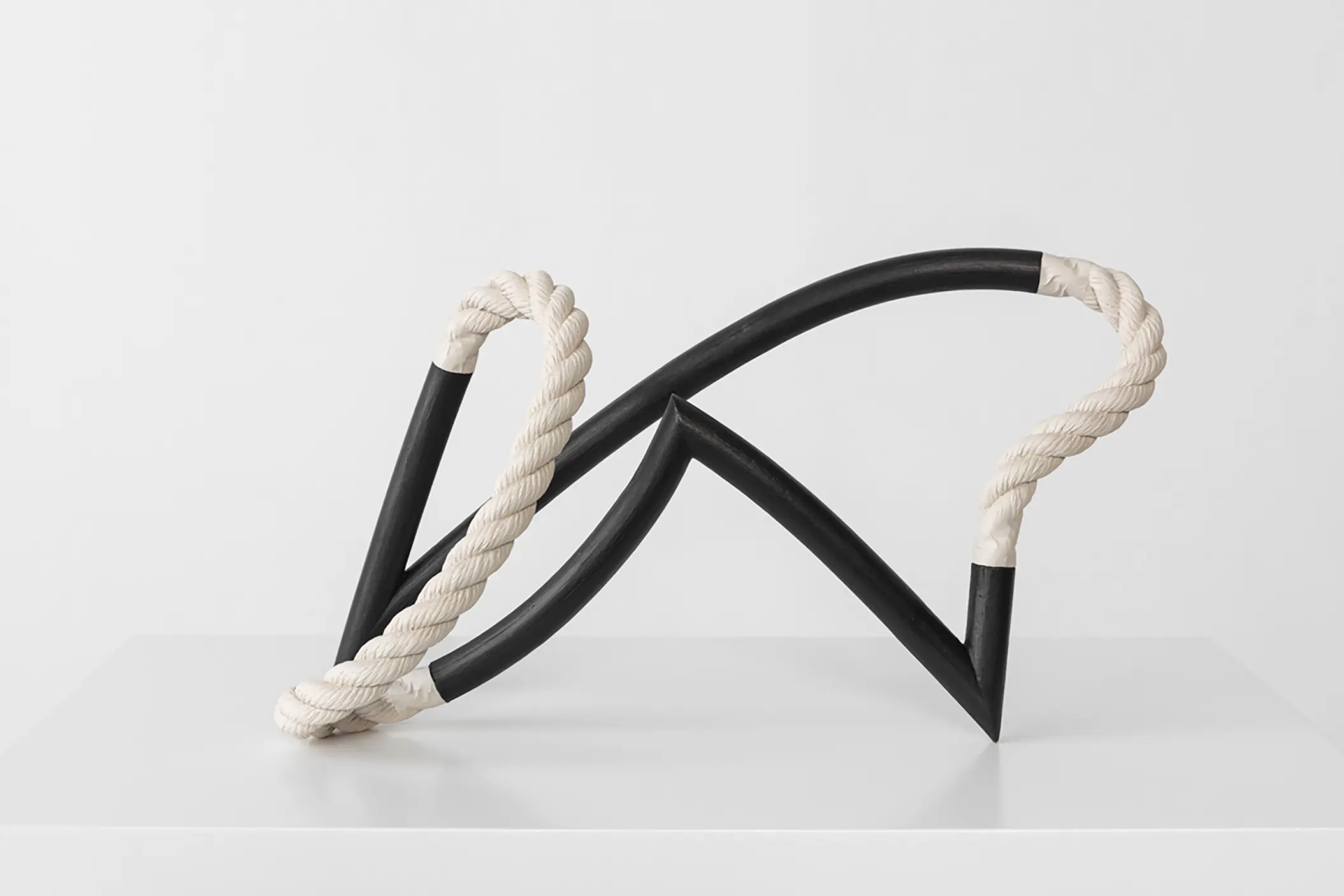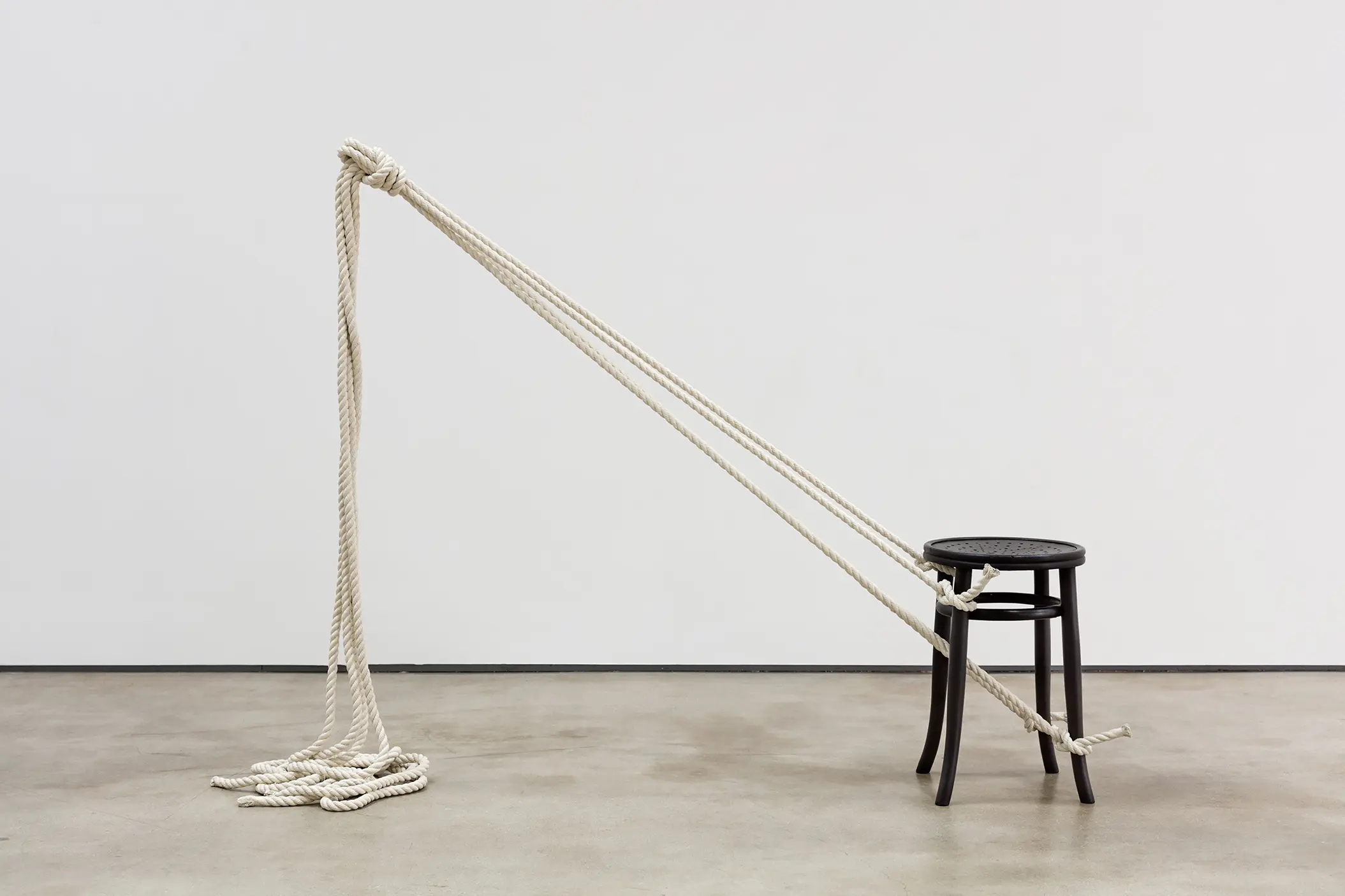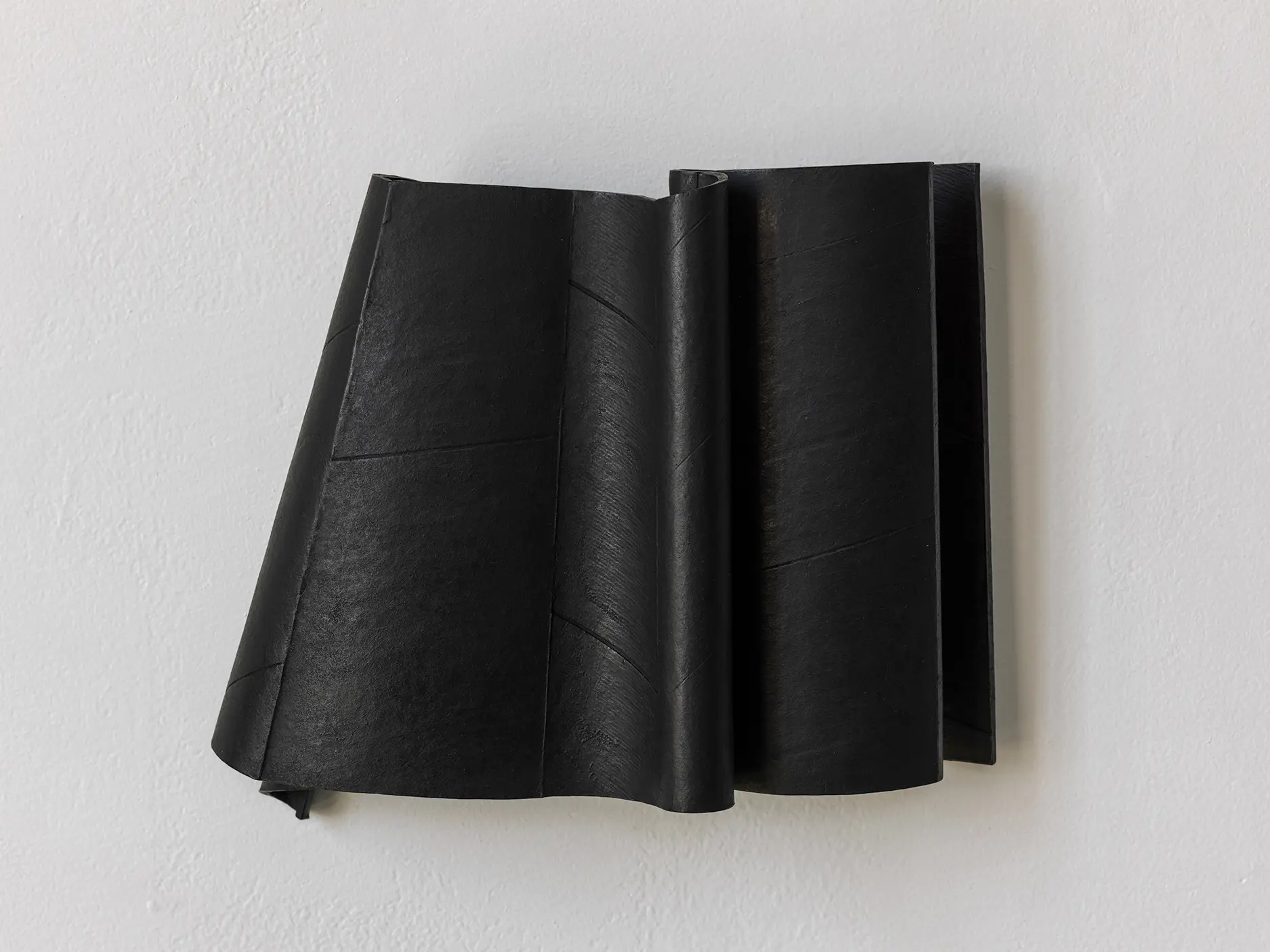Depuis plus de vingt ans, les œuvres en bronze de Ricky Swallow explorent le processus de conversion par lequel un objet – ou une combinaison de matériaux – devient sculpture. Il part de matériaux ordinaires, domestiques – corde, bois, ruban de masquage, carton perforé –, qu’il assemble ensuite à travers des formes qui mettent en valeur les particularités et les imperfections propres à leur matérialité. Ces configurations d’objets et de textures sont ensuite reproduites avec minutie à travers des procédés analogiques : d’abord coulées en bronze, elles sont ensuite patinées ou peintes à l’huile, poursuivant leur transformation dans l’atelier. La participation directe de Swallow à ces étapes est essentielle pour maintenir un lien avec la forme finale et en conserver la maîtrise. L’apparente retenue des sculptures contraste avec leur grande complexité, tant sur le plan matériel que technique, par exemple : les fils d’une corde reproduits en métal ou les plis d’un carton qui persistent après la fonte. En ce sens, le travail de Swallow intègre de subtiles références à la peinture – en particulier à la tradition du still life néerlandais –, visibles à la fois dans la dimension figurative de son œuvre et dans ses fondements conceptuels. Mais ces références ne sont jamais littérales : l’effet de trompe-l’œil, présent dès ses premières œuvres, n’est jamais une fin en soi mais une méthode – un piège de l’attention, une stratégie pour ralentir la perception et prolonger l’expérience. Ce qui prime en définitive, c’est la dimension tactile et la présence physique des éléments sculptés où la matière semble avoir son propre comportement et son humeur, à la fois sensible et incarnée.