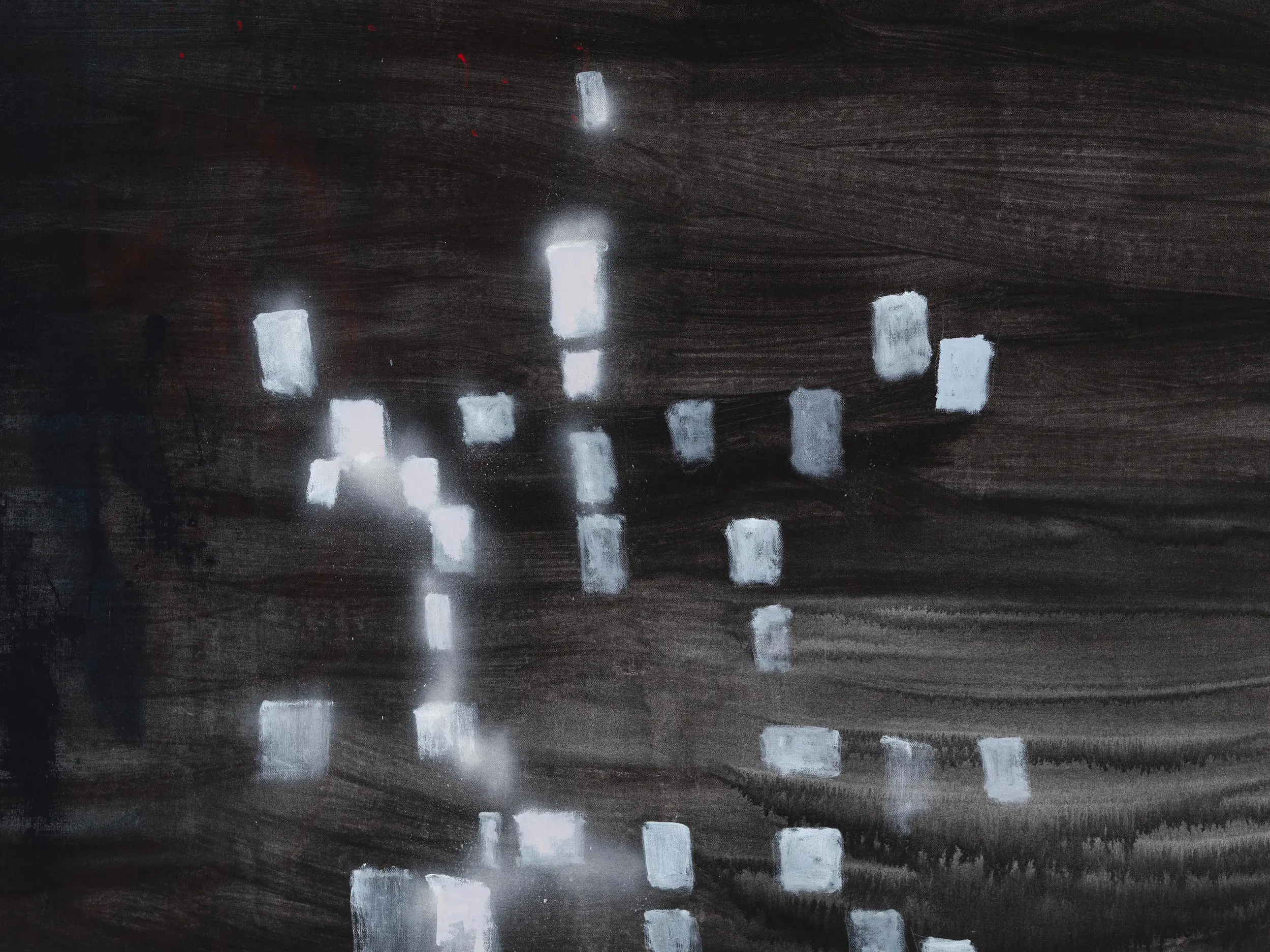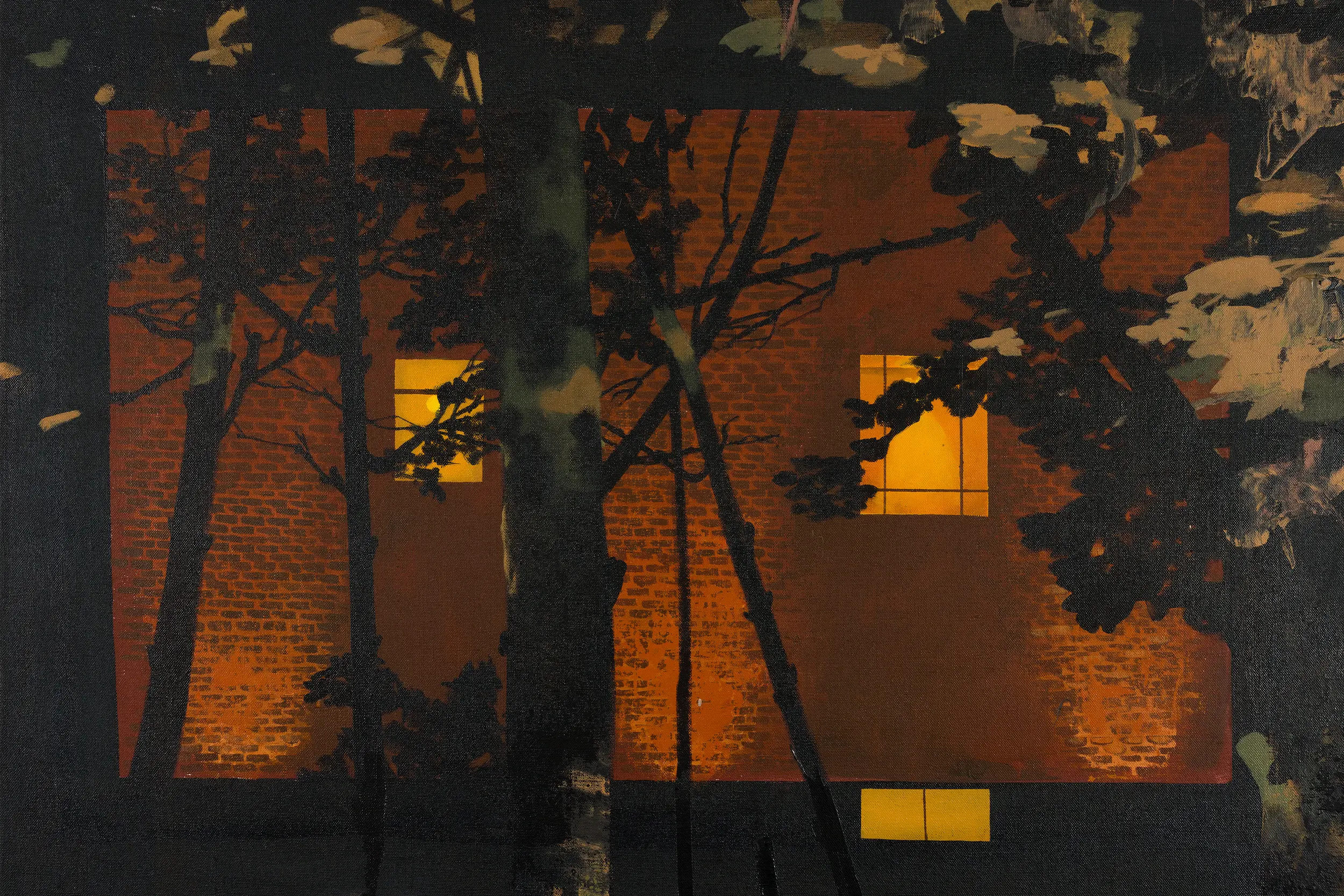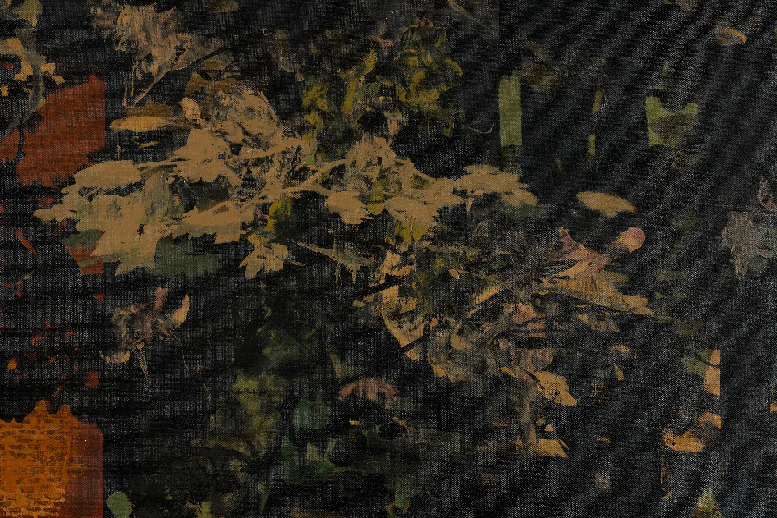 Dans l’ensemble de son œuvre, Mohammed Sami explore avec constance le lien entre la peinture contemporaine et la mémoire épisodique. Il s’intéresse particulièrement à ce qu’il nomme le sentiment de « thereness » : cette impression d’être soudainement et involontairement projeté – souvent par une sensation – dans un lieu de l’esprit qui n’est pas « ici », mais ailleurs. Cette expérience est au cœur de sa démarche, profondément liée à son propre vécu migratoire et à la manière dont celui-ci continue d’imprégner sa subjectivité. En perfectionnant son usage de différentes techniques — composition, cadrage, couleur, texture, titres — Sami vise à élargir la capacité de la peinture contemporaine à évoquer des atmosphères spécifiques, sans jamais les imposer ni les expliciter. Dans chaque toile, un conflit sous-jacent se fait sentir, renforcé par le choix de l’artiste de ne jamais y inclure de personnages, laissant à chaque œuvre son identité propre. Quant à ses compositions, volontairement dissonantes, elles viennent perturber les perspectives naturelles et ne laissent entrevoir que des fragments de scène, induisant un état d’esprit fragmenté et instable. Les points de vue paraissent tantôt trop rapprochés – ne révélant que des détails sans profondeur –, tantôt obscurcis par l’ombre – de larges zones de la toile étant noircies –, provoquant une sensation troublante d’entre-deux. Couleur, texture, lumière et obscurité occupent un rôle central dans sa construction minutieuse des ambiances. Son geste pictural incorpore parfois des matériaux ordinaires – sable, peinture en spray – mêlés à la peinture, complexifiant encore son vocabulaire visuel. C’est dans l’entrelacement de ces éléments que s’ouvre la réflexion sur la manière dont sensations et atmosphères se cristallisent en mémoire.