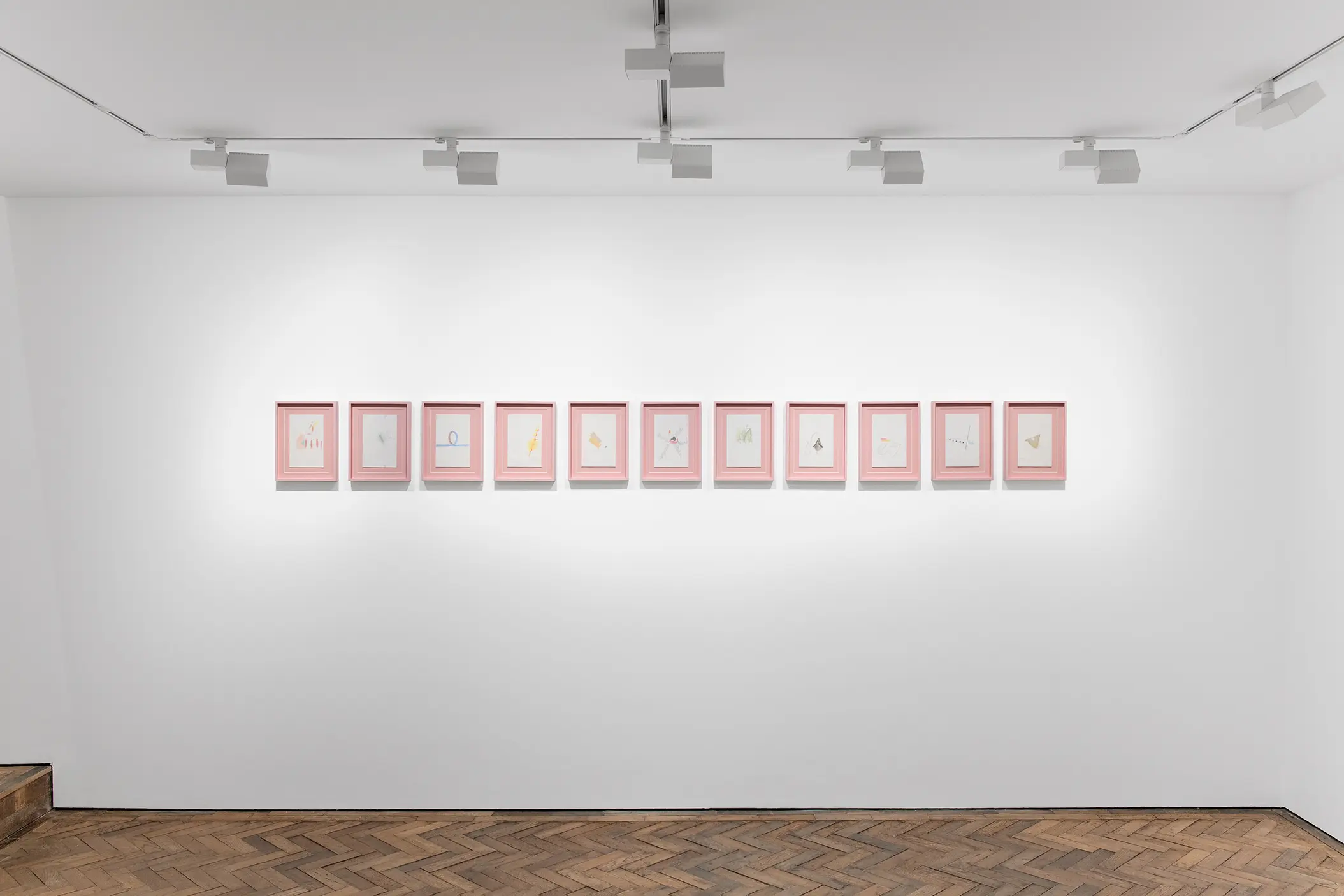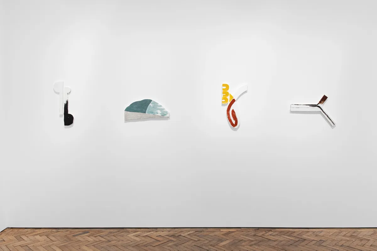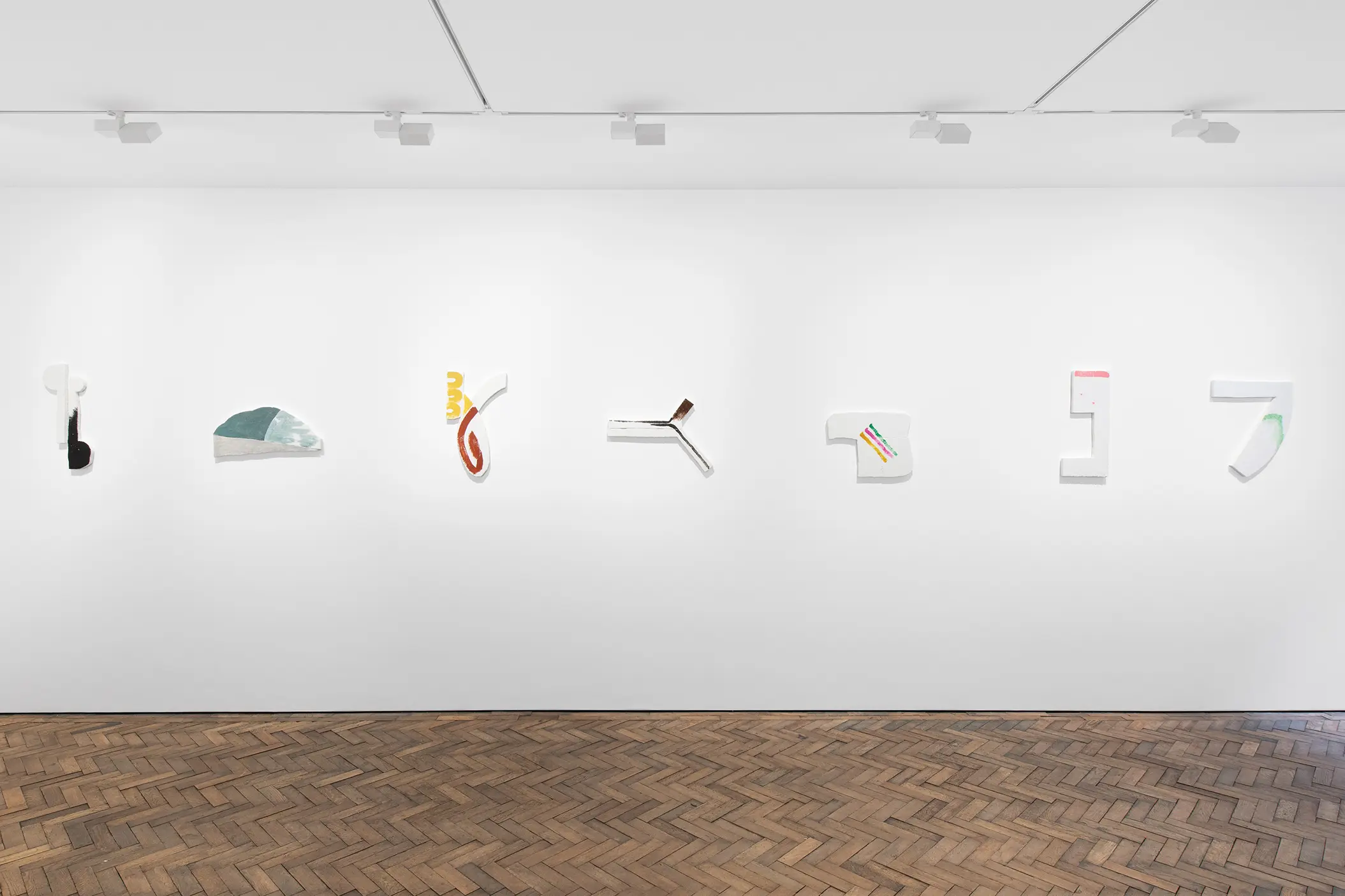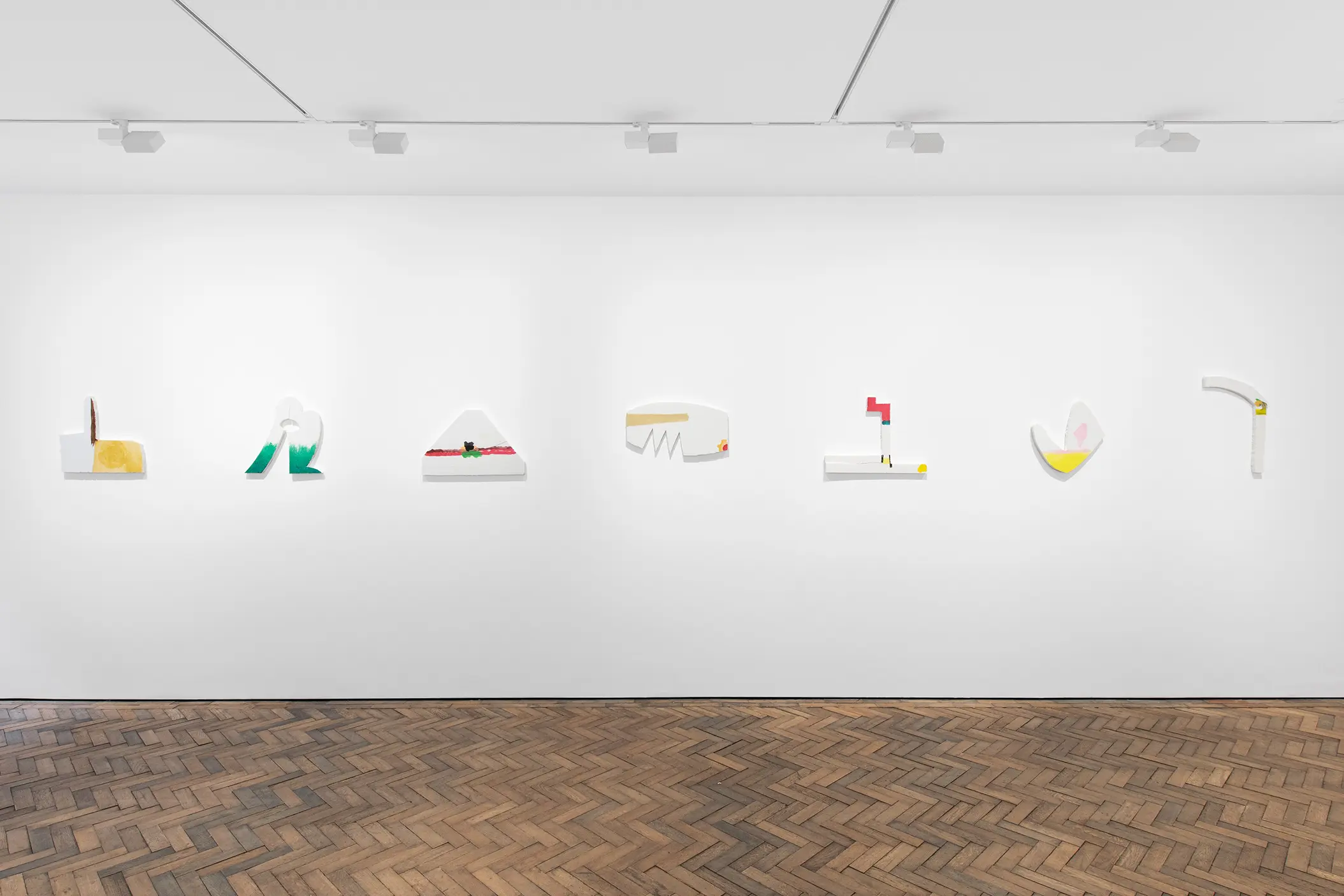 Following the presentation of Tuttle’s historical installation, Village V, Modern Art’s second exhibition at its Bury Street gallery contains a group of new wall-based works made by Tuttle in his New Mexico studio over the past year. Each beginning as a word drawing on a piece of 18 x 24 inch paper, these drawings are then translated into sculptural and painterly forms. Some remain almost entirely as abstract while others edge closer to glyphs-like forms, invoking the graphics of symbols, letters or images. Made from polystyrene foam board and painted with a light and lyrical brush, these works are then hung directly over the original word drawings, leaving their antecedent linguistic or graphic content concealed. Like much of Tuttle’s oeuvre, 18 x 24 originates from a strict methodological process that is enlivened through Tuttle’s intuition and lightness of touch; the unconscious impulses permitted entry into a finely tuned system. Tuttle describes these works, and the methodology behind them, as continuing a larger project of examining the nexus between verbal and visual worlds. Grouped together, with their idiosyncratic shapes and playful colours - reminiscent of Tuttle’s early works – 18 x 24 creates a space of reverie, where the pleasure of abstract colour, texture and shape interact with the symbolic order of language. As such, hung in a single line across the walls of the space, these new works invite a kind of close, linear looking from left to right (or right to left), while moving around the gallery, as though to evoke the eye’s movements across the lines of a page.