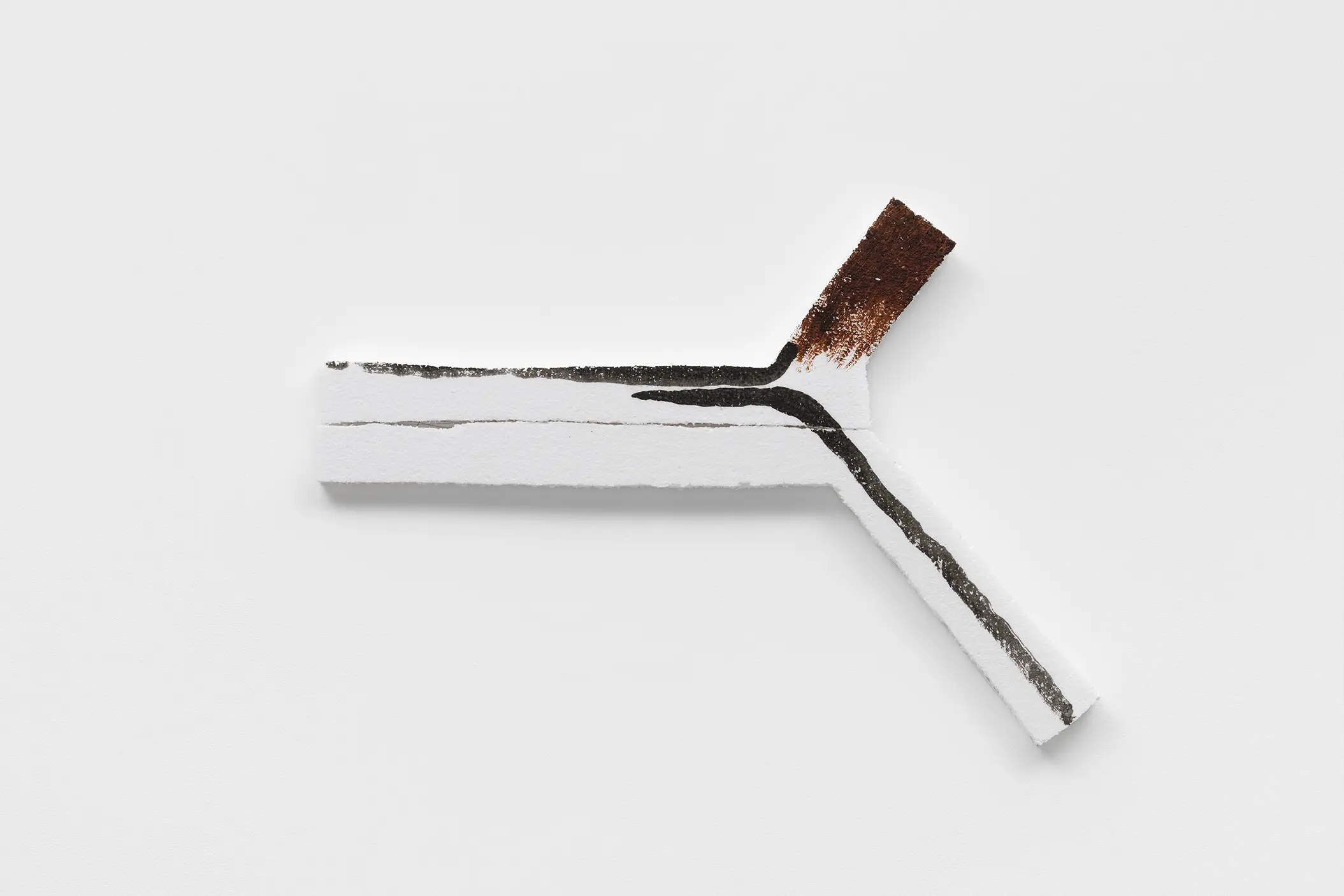 Each beginning as a word drawing on a piece of 18 x 24 inch paper, these drawings are then translated into sculptural and painterly forms. Some remain almost entirely as abstract while others edge closer to glyphs-like forms, invoking the graphics of symbols, letters or images. Made from polystyrene foam board and painted with a light and lyrical brush, these works are then hung directly over the original word drawings, leaving their antecedent linguistic or graphic content concealed. Like much of Tuttle’s oeuvre, 18 x 24 originates from a strict methodological process that is enlivened through Tuttle’s intuition and lightness of touch; the unconscious impulses permitted entry into a finely tuned system.