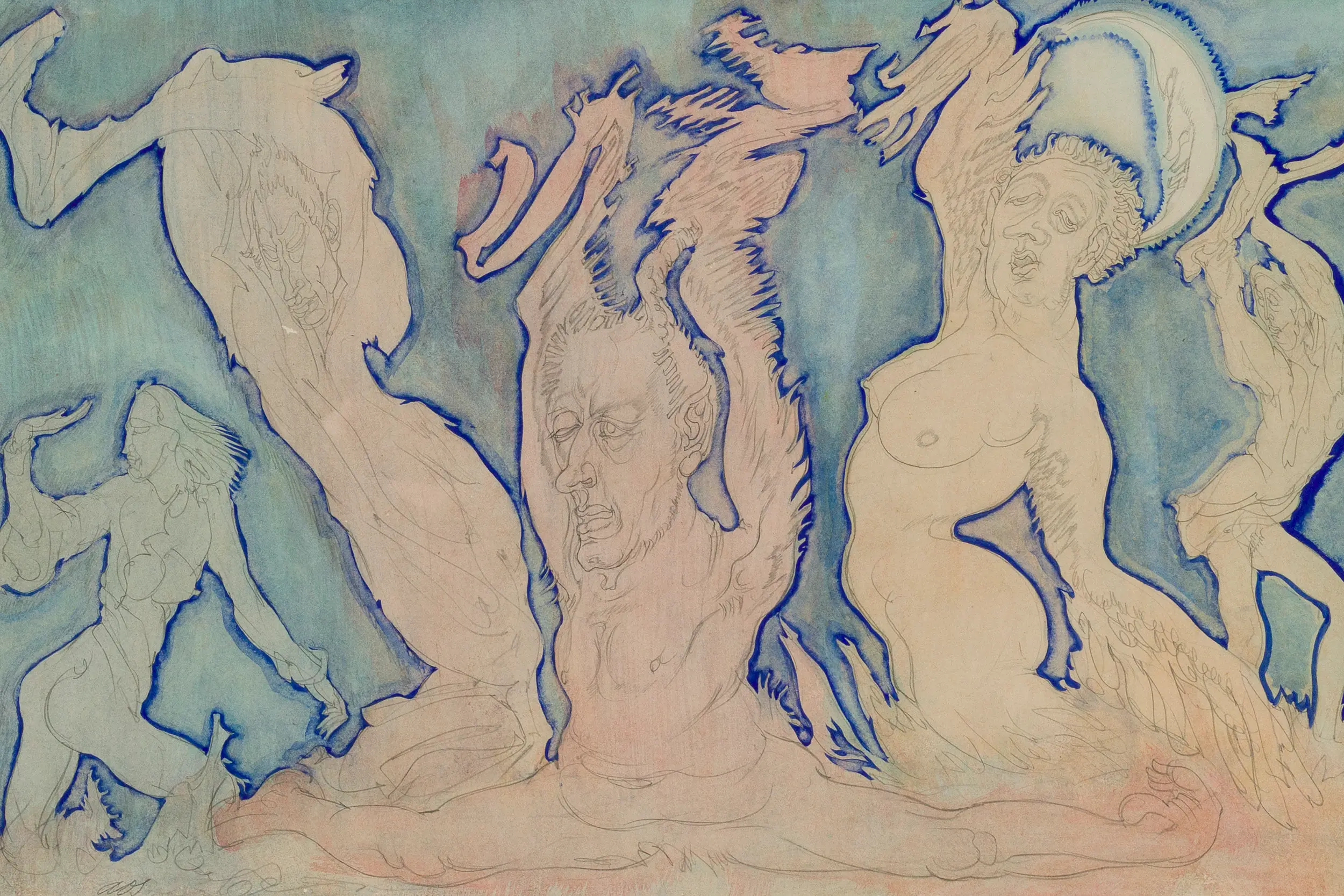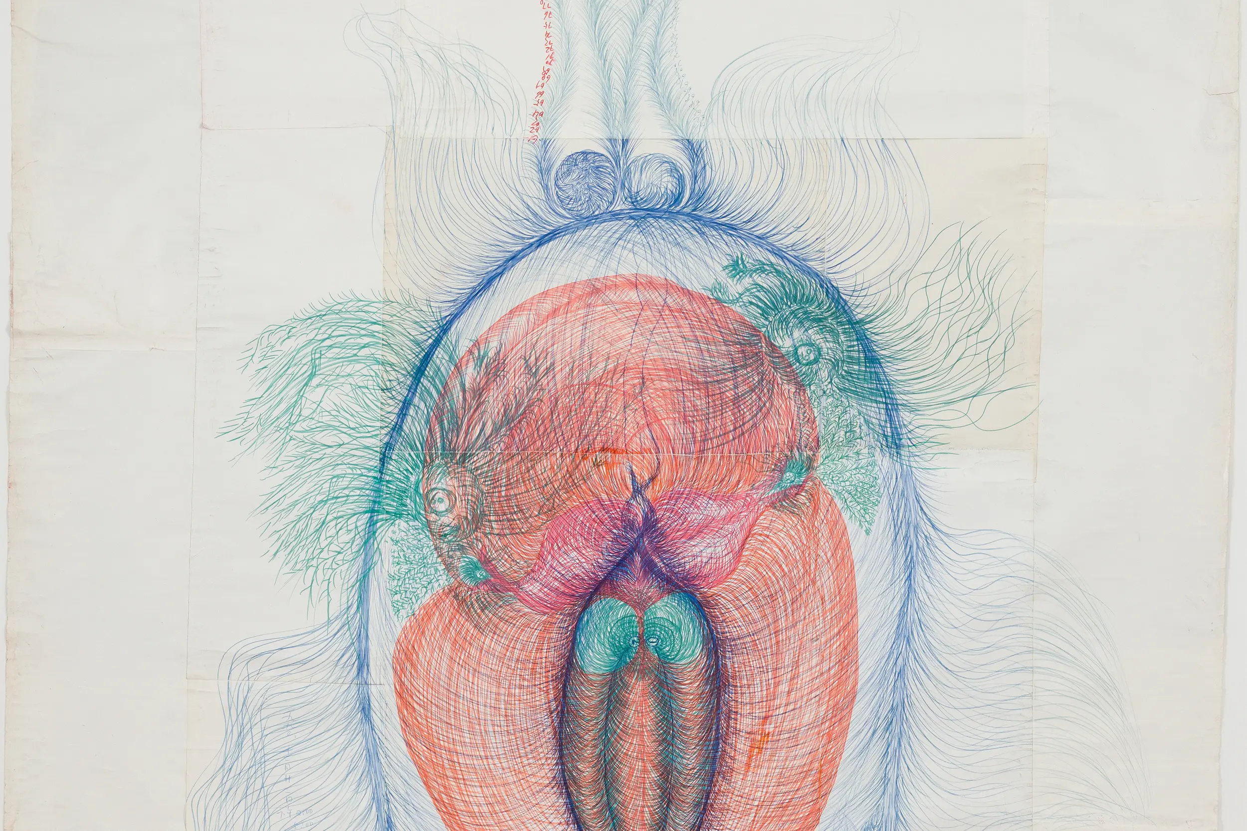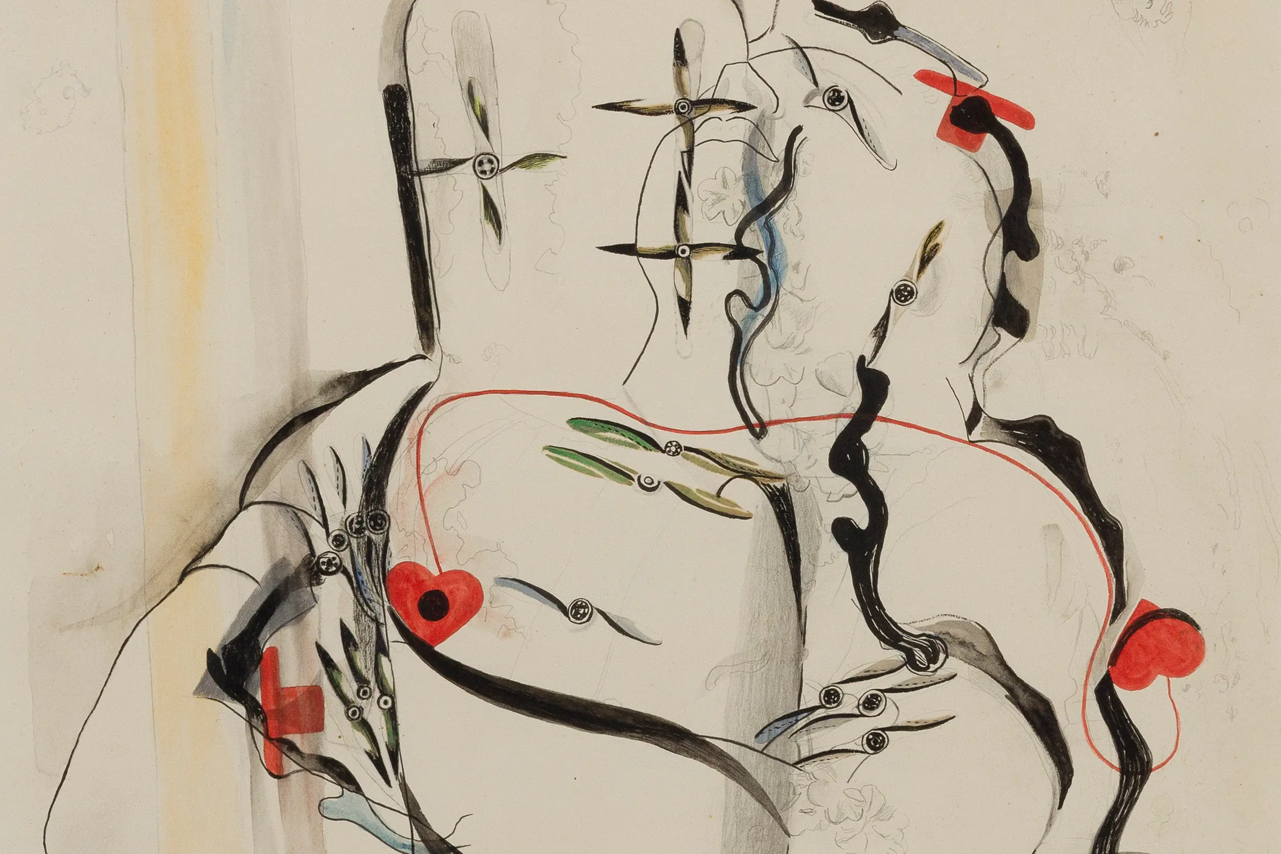 Dans Infinite Loop (1941) d’Eileen Agar (1899-1991), les contours indistincts de deux figures s’entrelacent dans une étreinte complexe, représentant possiblement Agar elle-même avec son mari Joseph Bard, ou bien célébrant sa liaison avec l’artiste Paul Nash. Alimentés par des épisodes de paranoïa et d’hallucinations liées à un traumatisme, les dessins complexes d’Unica Zürn (1916-1970) réalisés dans les années 1950 représentent des formes inconnues et insondables, à la fois mi-humaines, mi-animales, qui dépassent le cadre du fantasme uniquement pathologique.