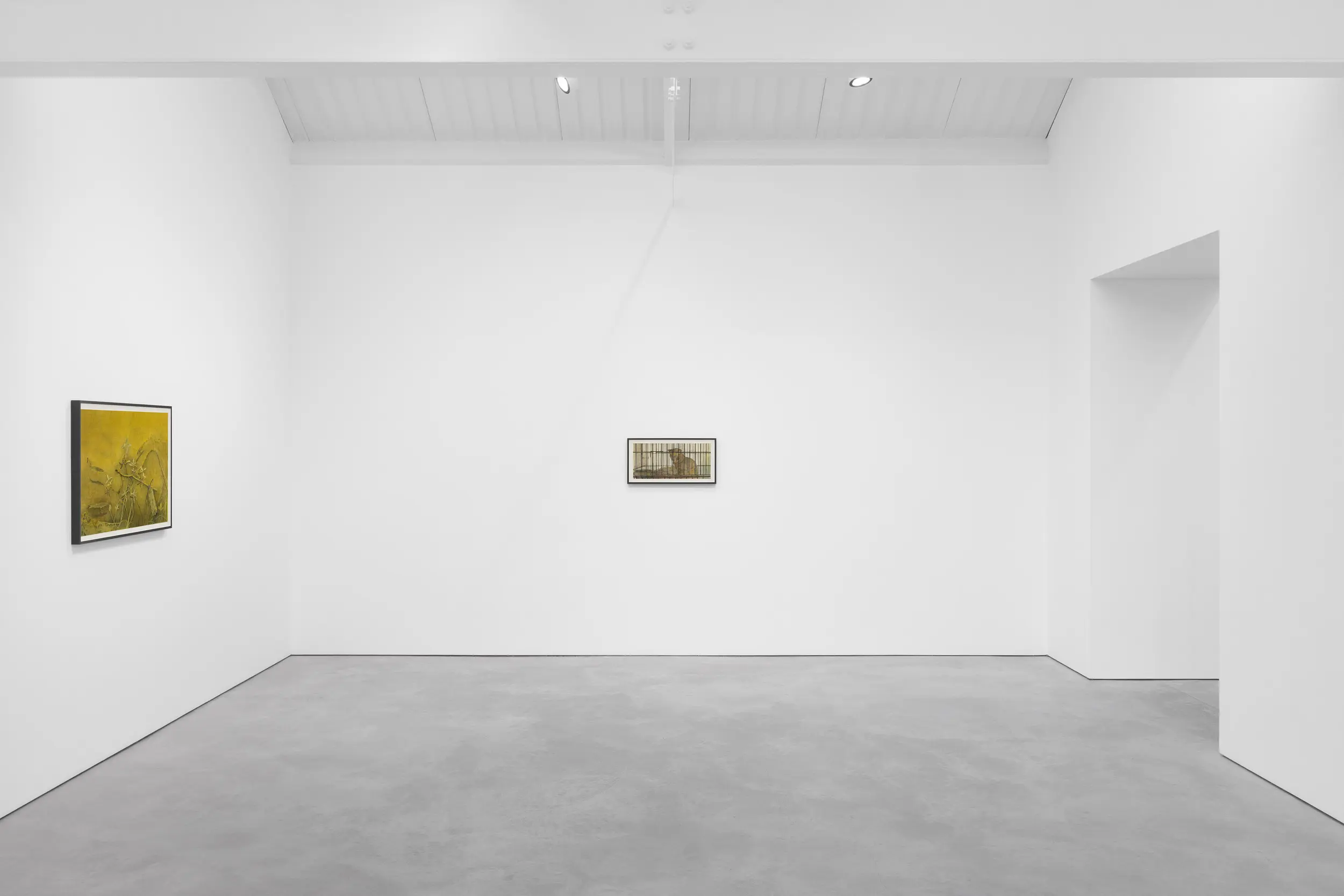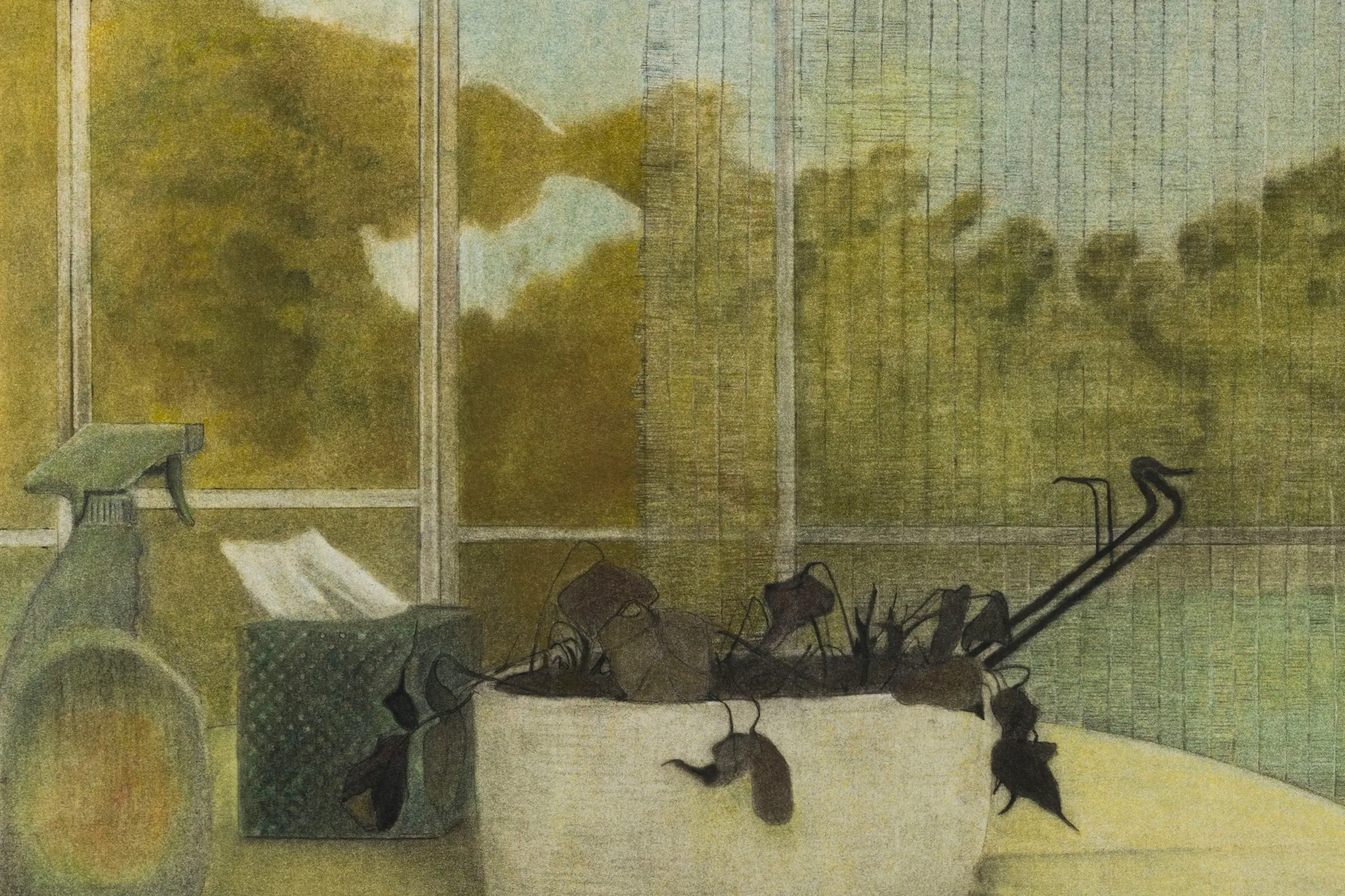 Des scènes d’intérieurs et des natures mortes offrent un aperçu de la vie quotidienne dans cette région en transformation. Dans Grandmother’s Table (2025), flacons de médicaments et assiettes en papier composent un autel improvisé dans le vide. Une fenêtre d’angle projette sa lumière sur ce monde d’ombre et enveloppe les objets d’une atmosphère chaleureuse. En parallèle, les animaux apparaissent dans un état d’entre-deux : des chats de refuge se reposent dans leurs cages immobiles, à la fois sensibles et résignés.Dans son ensemble, les œuvres de l’exposition construisent une réalité interconnectée, à la fois étrange et vide, façonnées par les difficultés, les mythes et les conspirations. Sous l’effet de la chaleur, le paysage engendre une atmosphère paranoïaque où tout ce qui semble solide de dissout dans l’air. Si ce monde suspendu échappe au langage, les dessins parviennent néanmoins à en restituer une forme de vérité. La rédemption peut sembler illusoire dans un contexte de crise, mais la succession de scènes composées par Christopher Culver propose de laisser subsister la possibilité, subtile et décalé, d’une forme d’empathie.