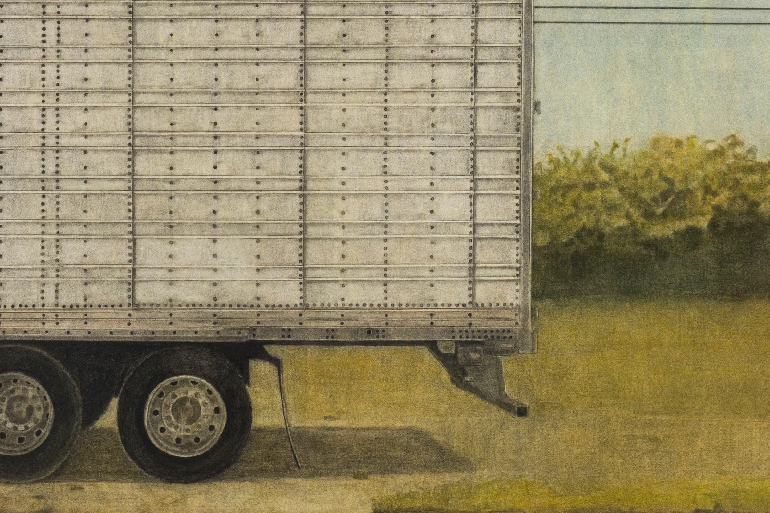 Des poids lourds parsèment le paysage, inexplicablement figés et immobiles – symboles d’une logistique du « juste-à-temps ». Dans The Problem with Worlds (2025), l’un d’eux reste à l’arrêt au bord d’une autoroute, près du Rio Grande, fleuve qui s’épare les États-Unis du Mexique. En marge de ces couloirs commerciaux, la stagnation s’installe et l’immobilité inquiétante annonce un effondrement à venir : des lignes à haute tension strient le ciel, reliant des géographies jamais vues et les terres brûlés laissent entendre le bourdonnement de l’électricité qui devient assourdissant. Le nord de la Floride constitue le pendant tropical de la région frontalière du Texas, qui se révèle verdoyant et luxuriant bien que la stagnation soit également perceptible dans ce territoire. Le dessin intitulé Inland (2025) laisse apparaître la topographie d’une berge envahie par la végétation autour d’un bassin de rétention d’eau. Des palmiers sabal et des chênes recouverts de mousse espagnole forme un mur de feuillage dense et désordonnée qui obstrue une ligne électrique affaissée qui suggère que la nature a commencé à reprendre possession de cette terre sujette aux ouragans.