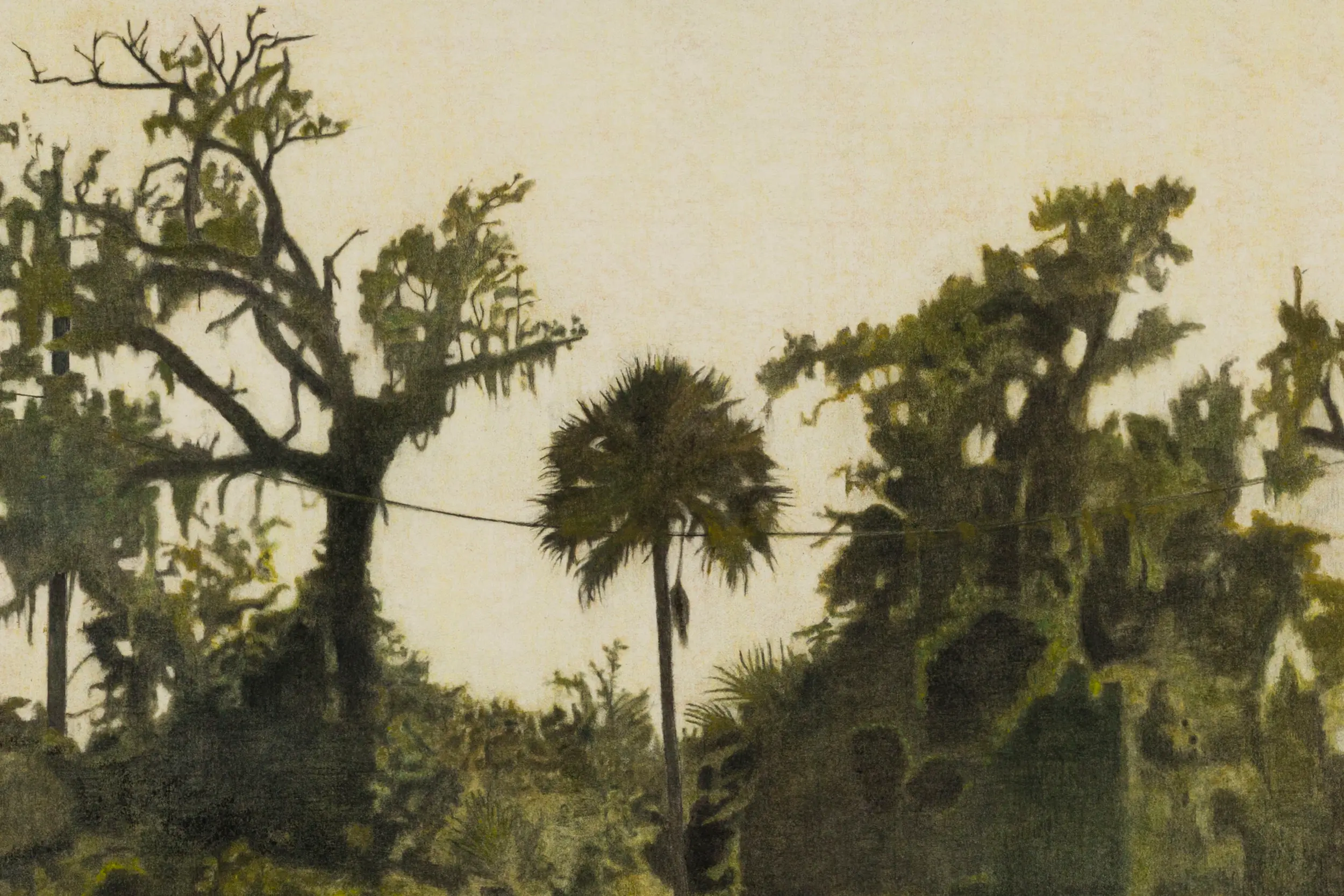 Le nord de la Floride constitue le pendant tropical de la région frontalière du Texas, qui se révèle verdoyant et luxuriant bien que la stagnation soit également perceptible dans ce territoire. Le dessin intitulé Inland (2025) laisse apparaître la topographie d’une berge envahie par la végétation autour d’un bassin de rétention d’eau. Des palmiers sabal et des chênes recouverts de mousse espagnole forment un mur de feuillage dense et désordonné qui obstrue une ligne électrique affaissée qui suggère que la nature a commencé à reprendre possession de cette terre sujette aux ouragans.