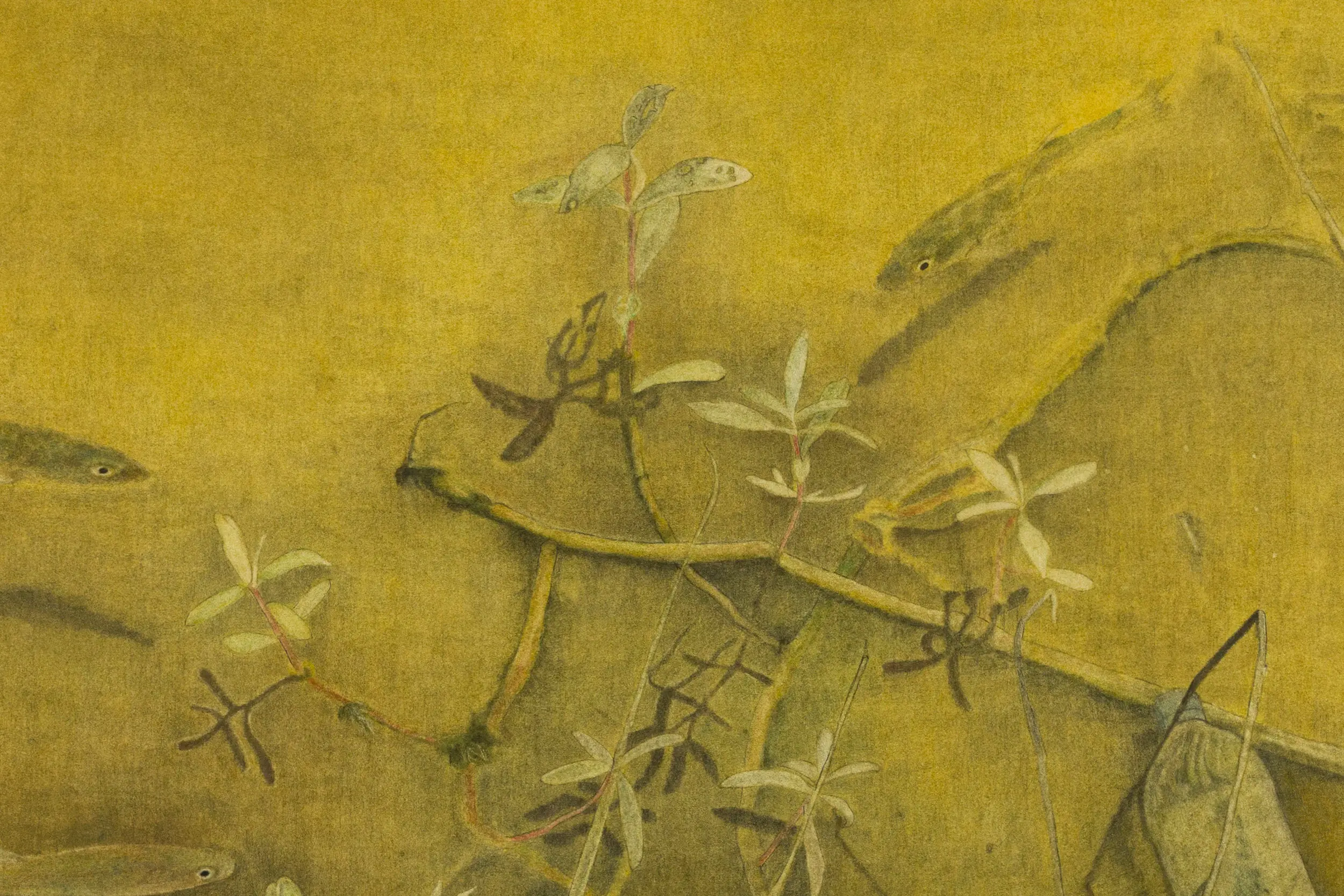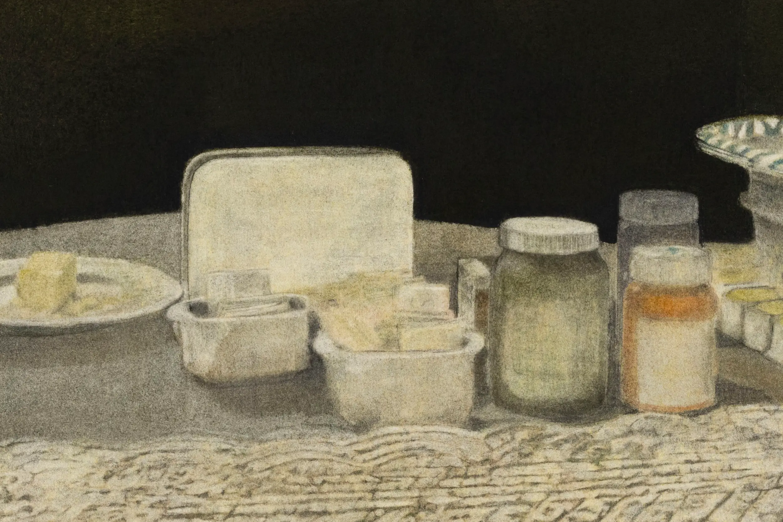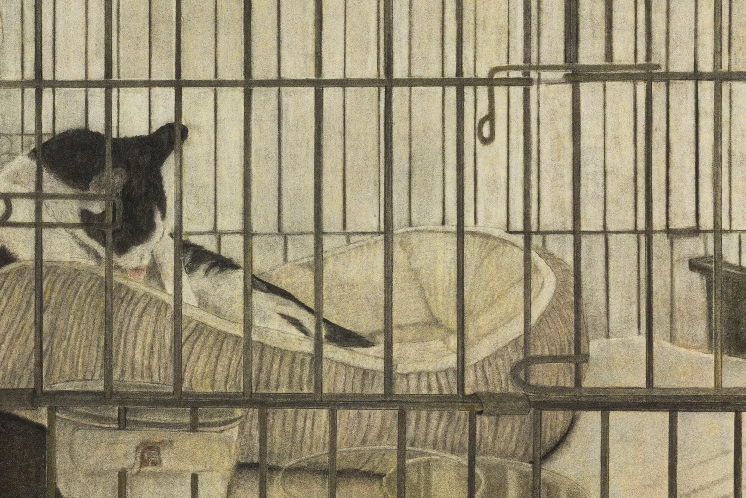 Des scènes d’intérieurs et des natures mortes offrent un aperçu de la vie quotidienne dans cette région en transformation. Dans Grandmother’s Table (2025), flacons de médicaments et assiettes en papier composent un autel improvisé dans le vide. Une fenêtre d’angle projette sa lumière sur ce monde d’ombre et enveloppe les objets d’une atmosphère chaleureuse. En parallèle, les animaux apparaissent dans un état d’entre-deux : des chats de refuge se reposent dans leurs cages immobiles, à la fois sensibles et résignés.