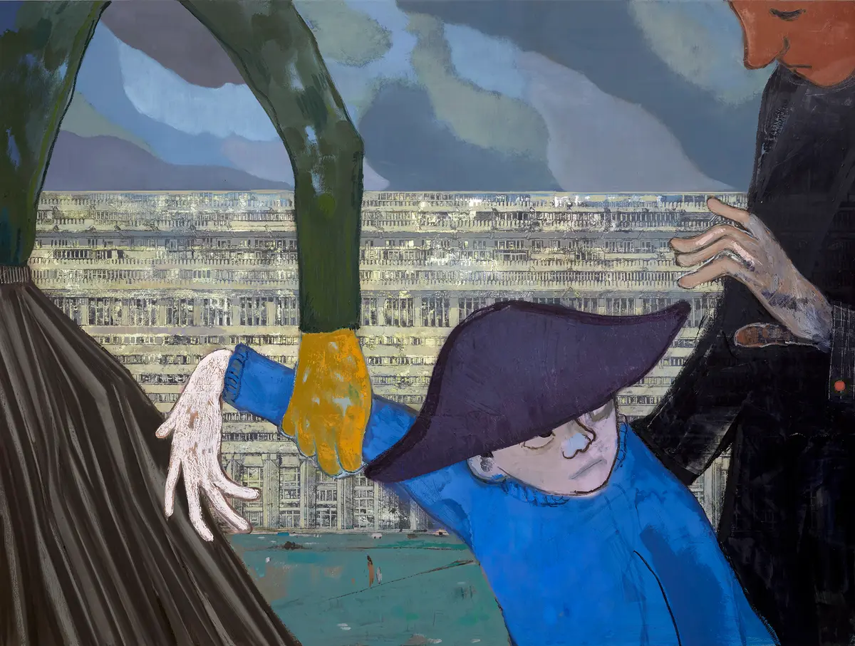 There is an apartment building in Moscow that is a quarter of a mile long, 16 stories high, with shops on its ground floor and an underground train station below. We see it hulking behind a trio of figures in the painting Kompleks. People call this building the House Ship. Its facade is pocked with air conditioning units and satellite dishes. I’d guess that at least 2,000 people live there.