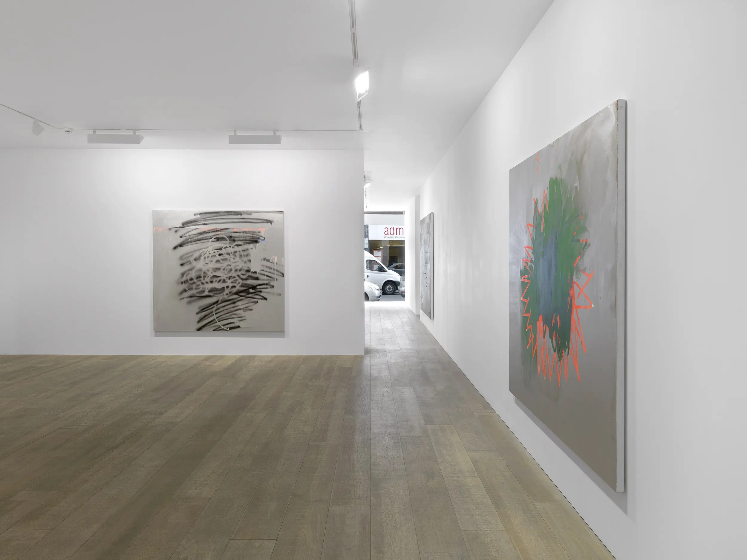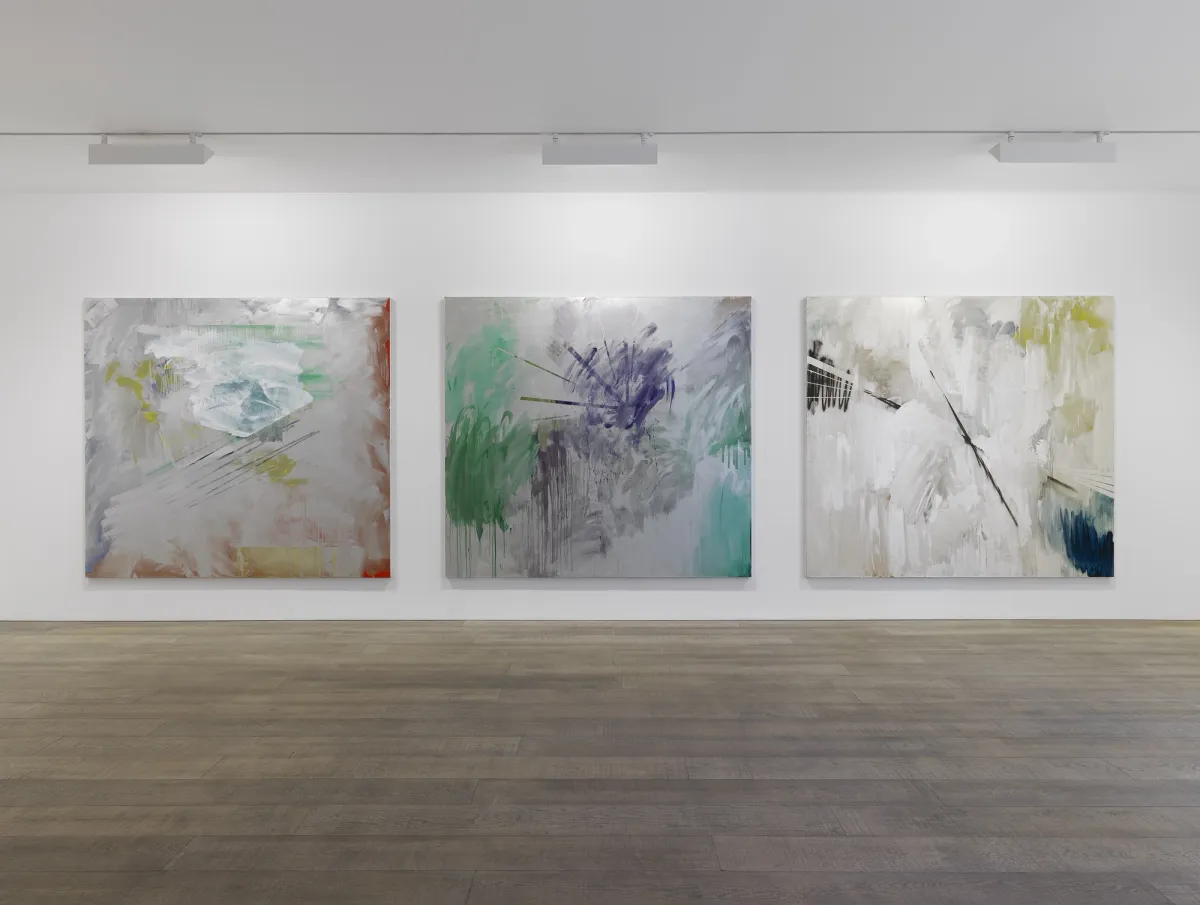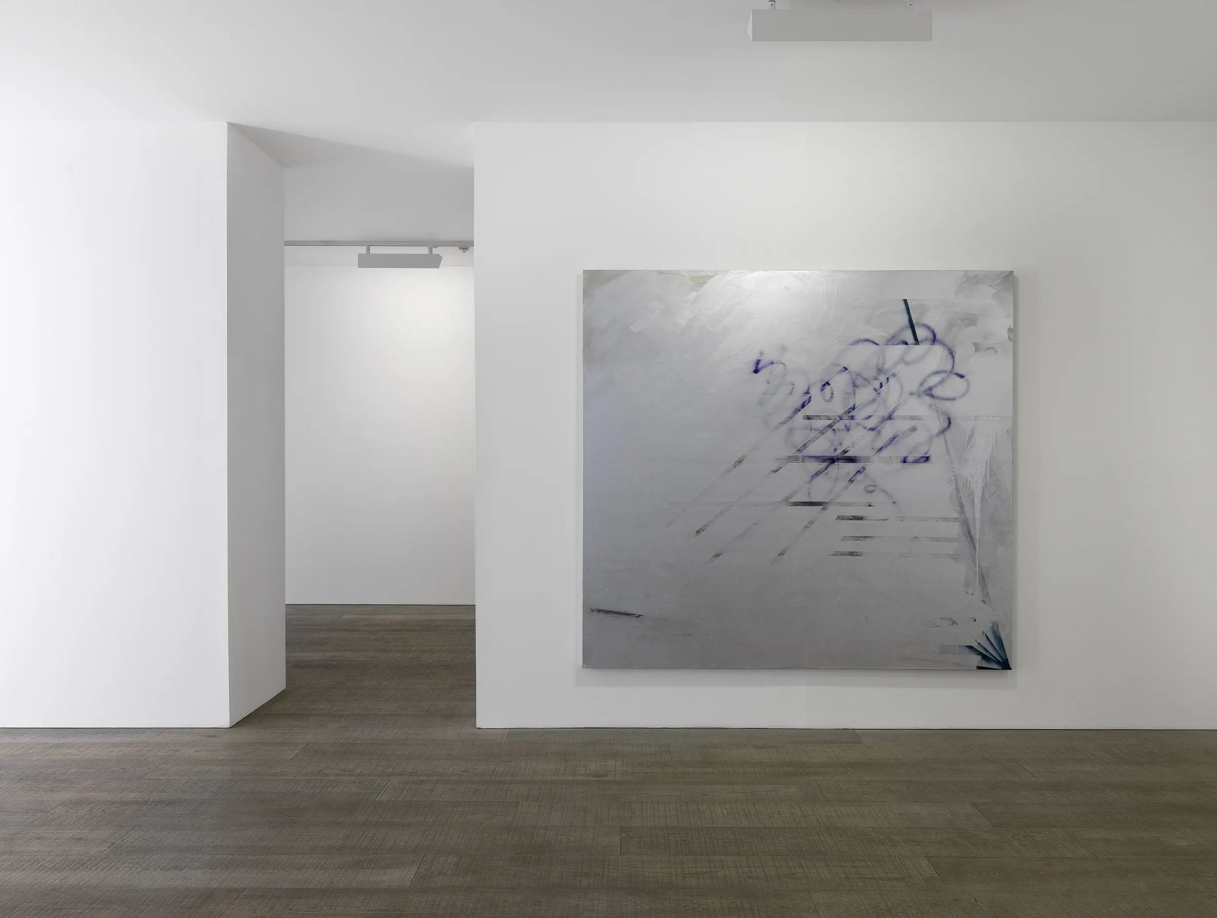 In this current series on view, the paintings open themselves up, offering expansive fields in which Humphries knits antagonistic techniques into singular surfaces. "The paintings seem to switch on and off", Humphries has stated. Light reacts to the swathing metallic silver surfaces of her paintings and reflects back at the viewer, moving across the surface and constantly shifting the balance of light and dark – subtly always altering the appearance, and presenting the conditions for an arresting, yet unstable visual encounter that physically engages human presence.